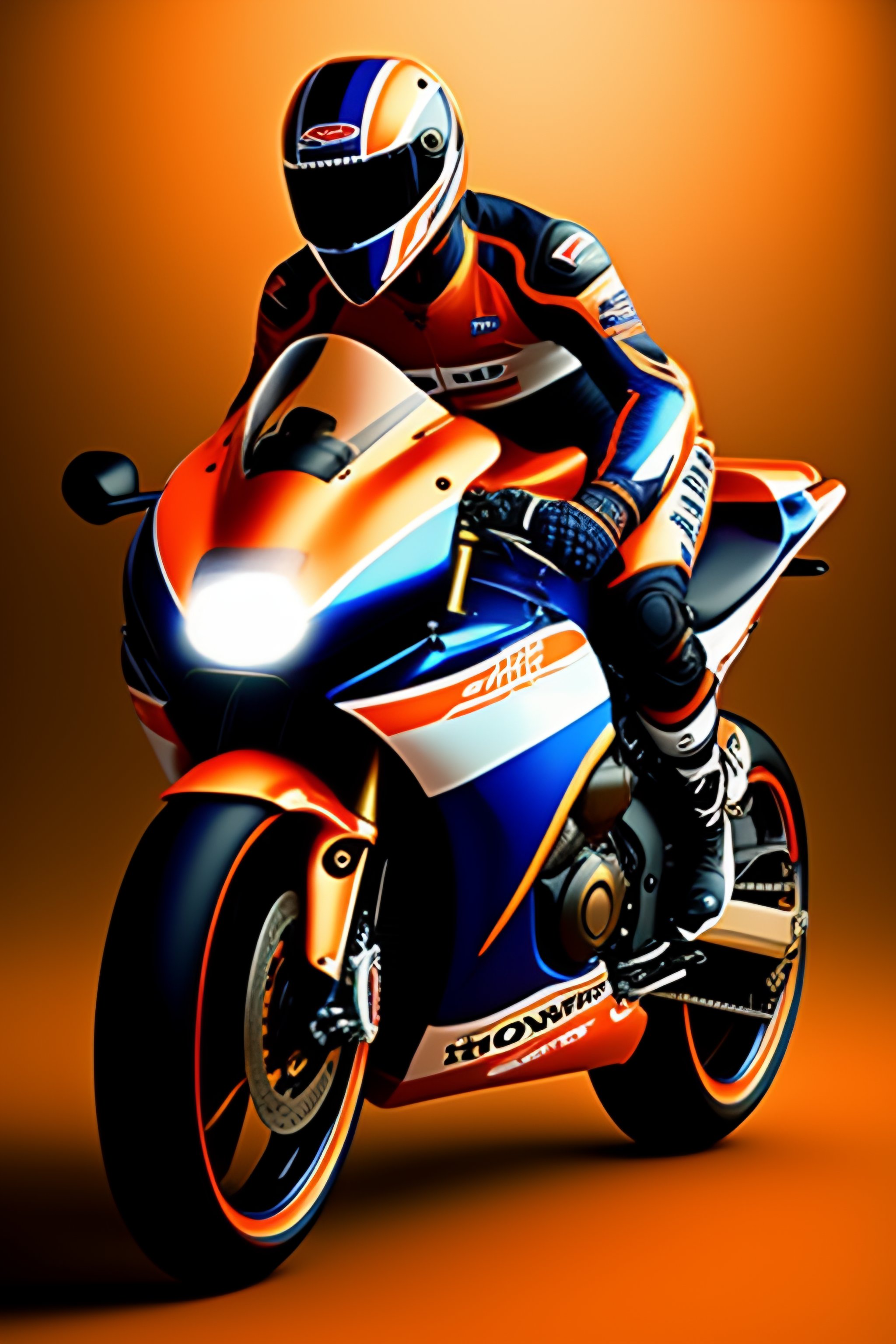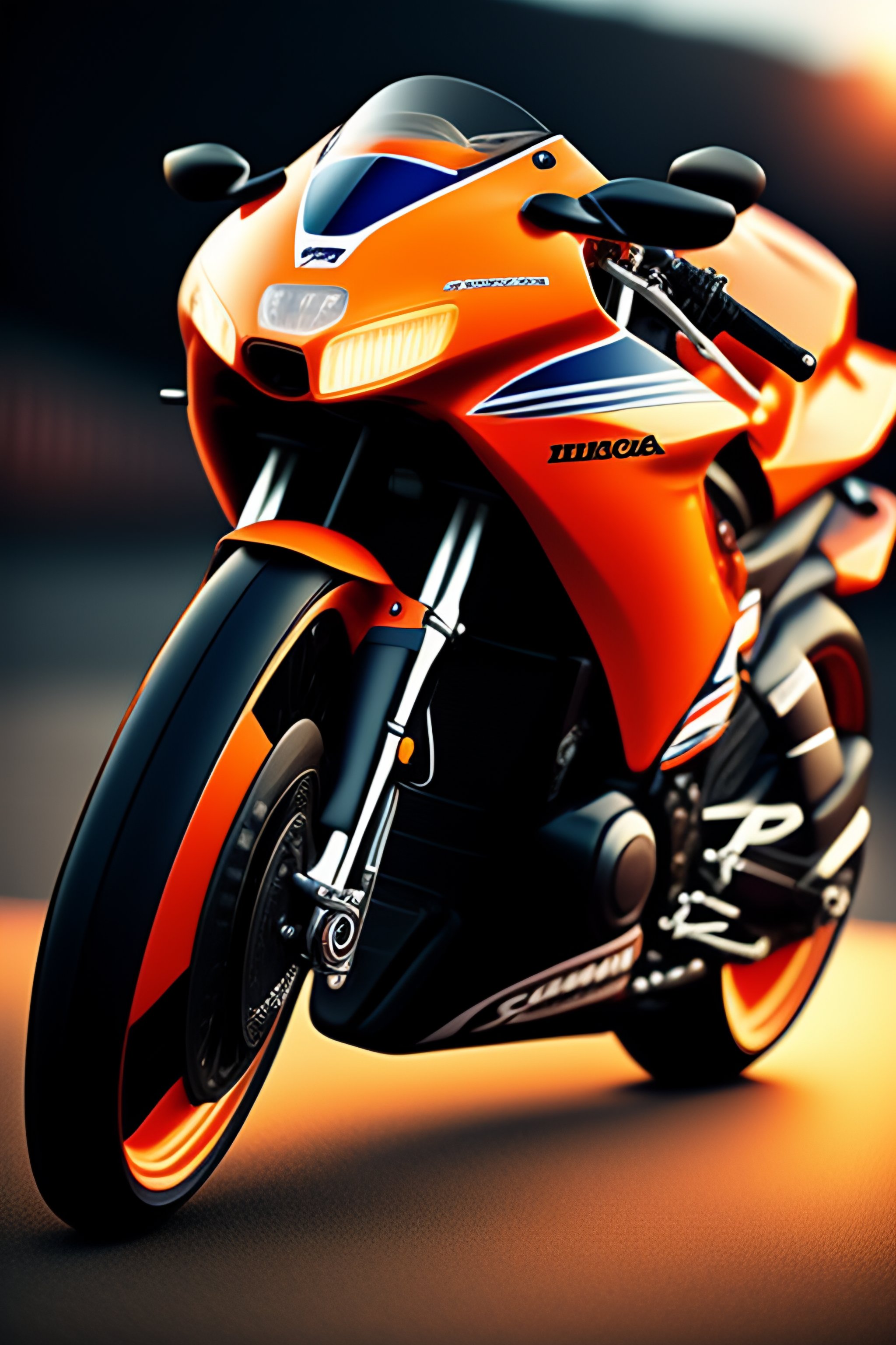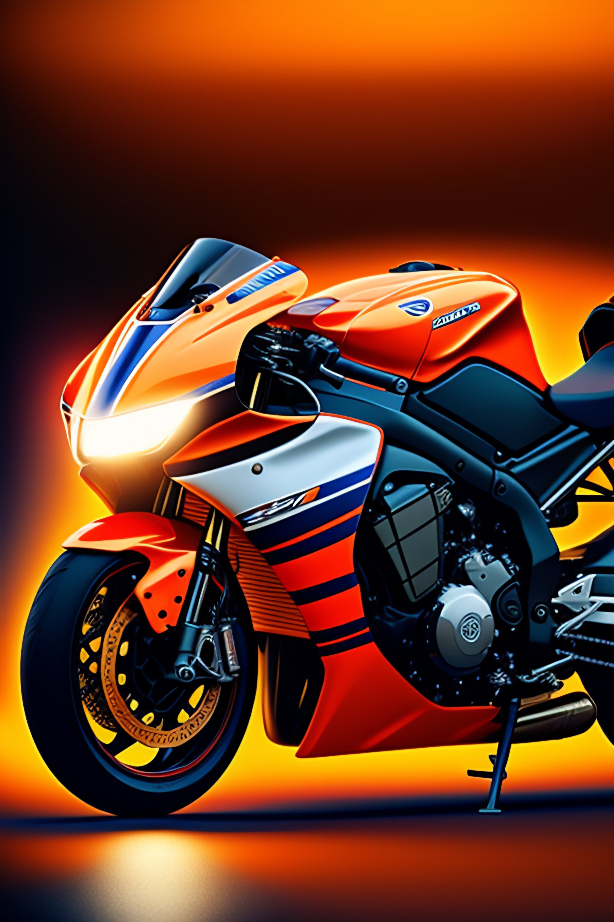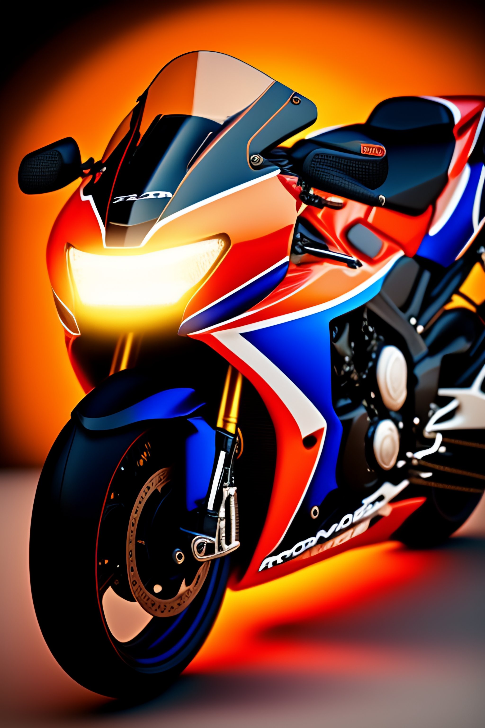 Realistic honda 1000rr bike, low orange lights, realistic theme, dark background, bike in orange and blue shades