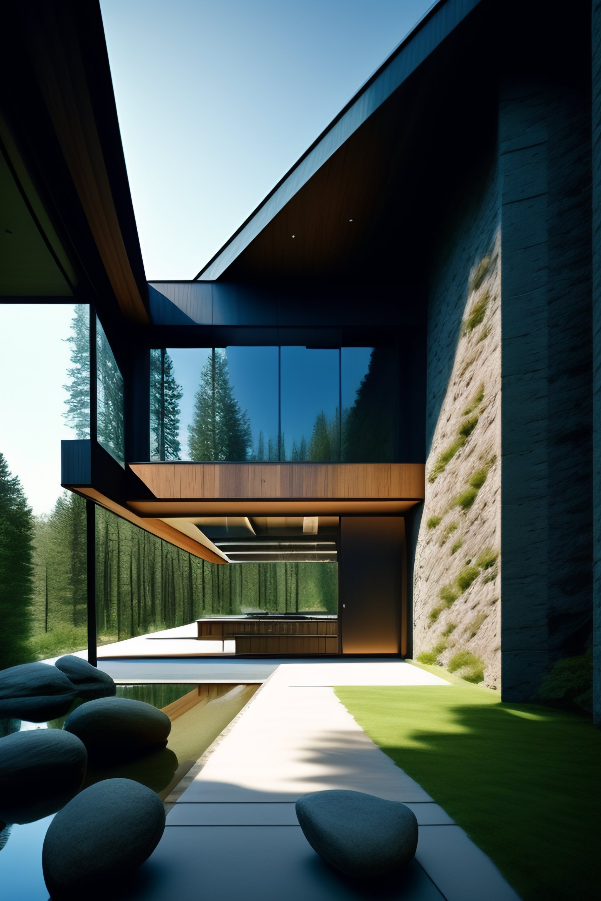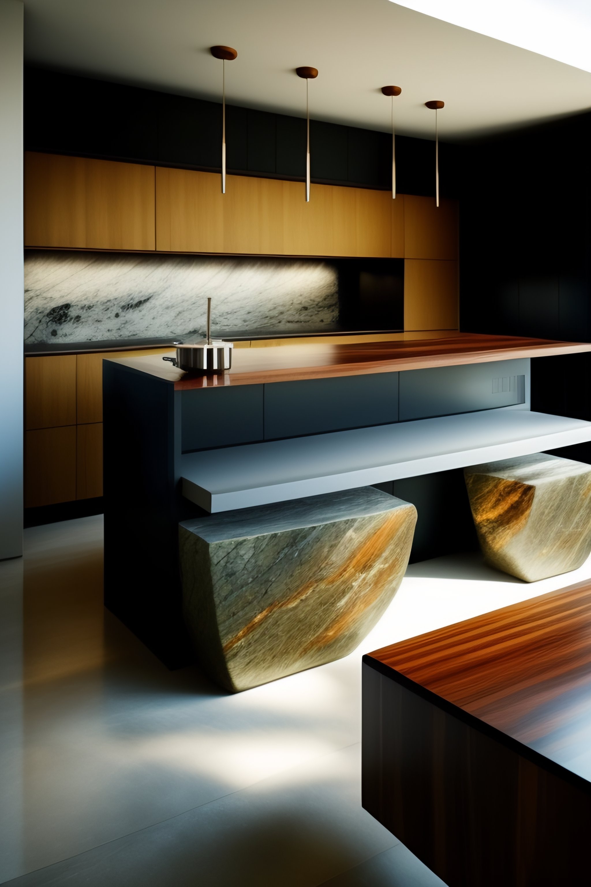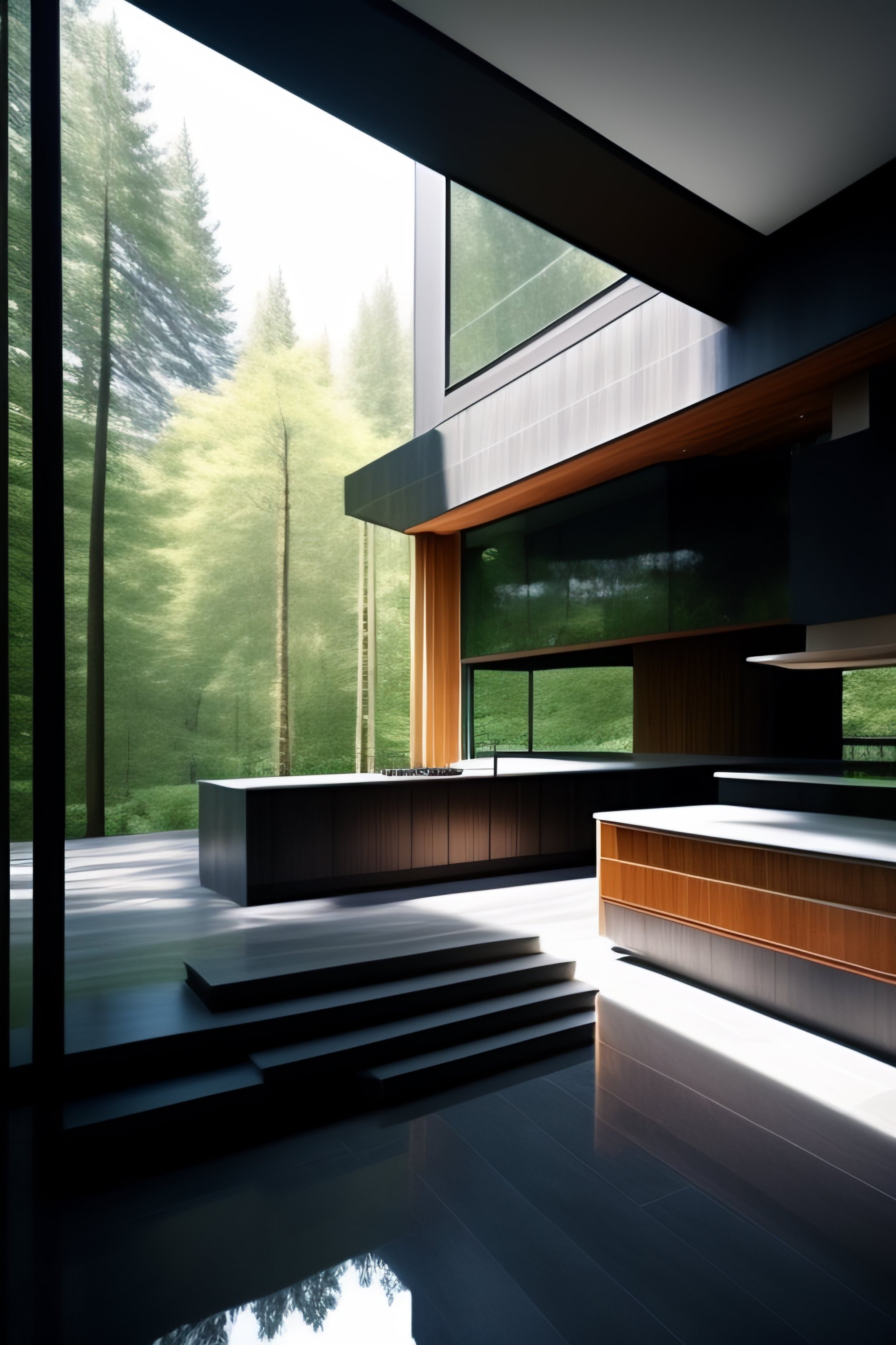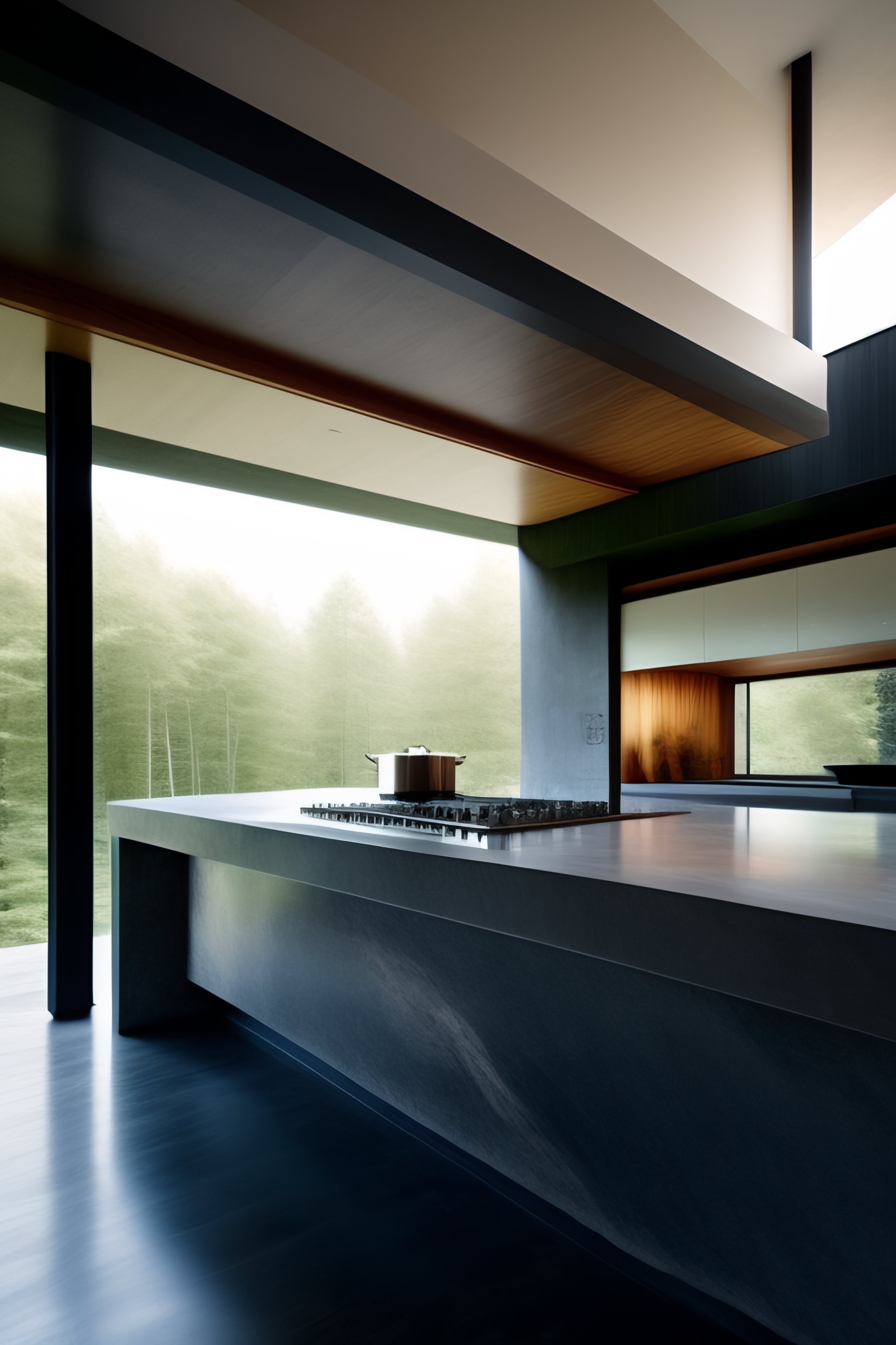 Giant modern kitchen brutalism view of nature stone water large home interior