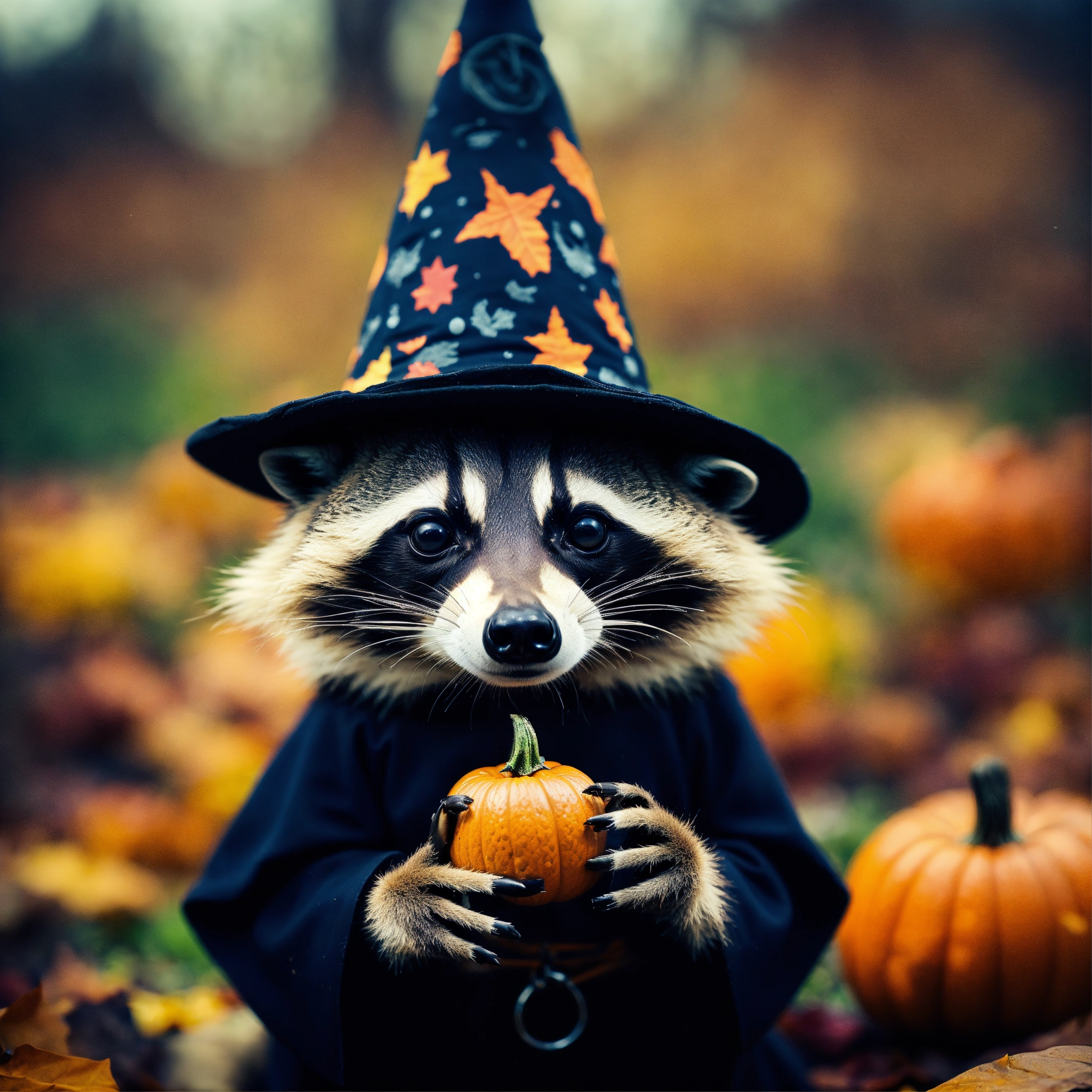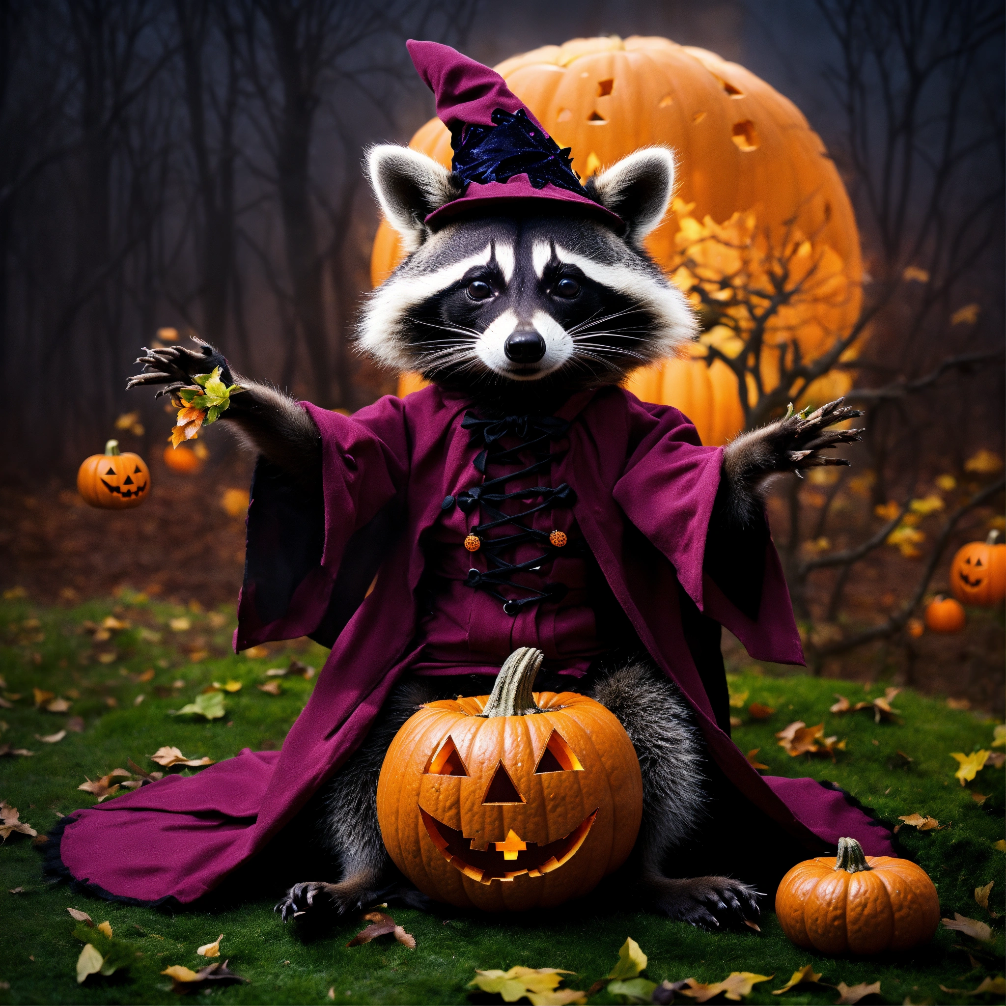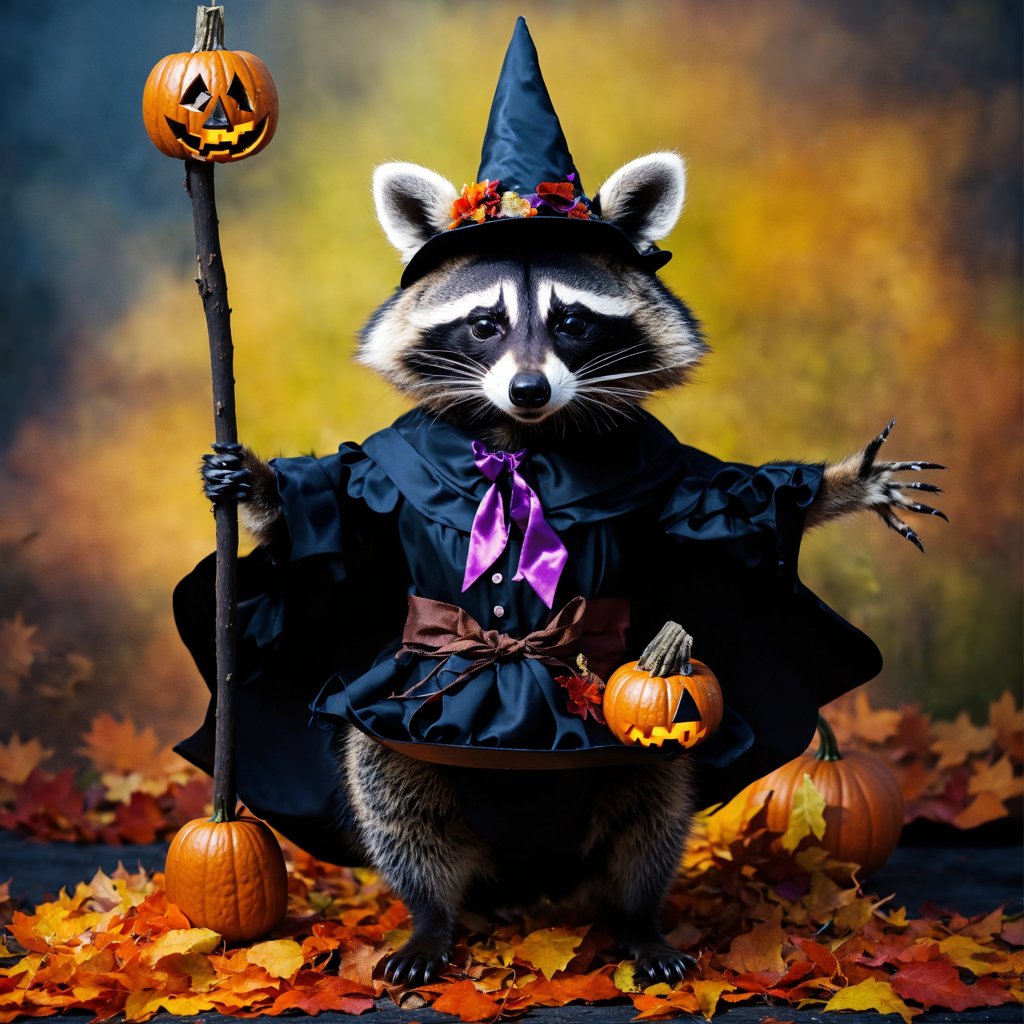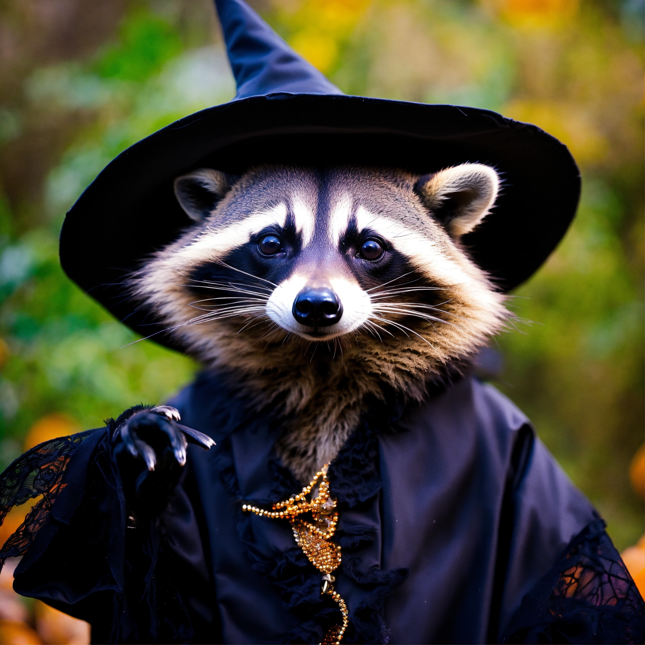 A photograph of a raccoon celebrating halloween in a witch outfit, each hand only has 5 fingers, surreal