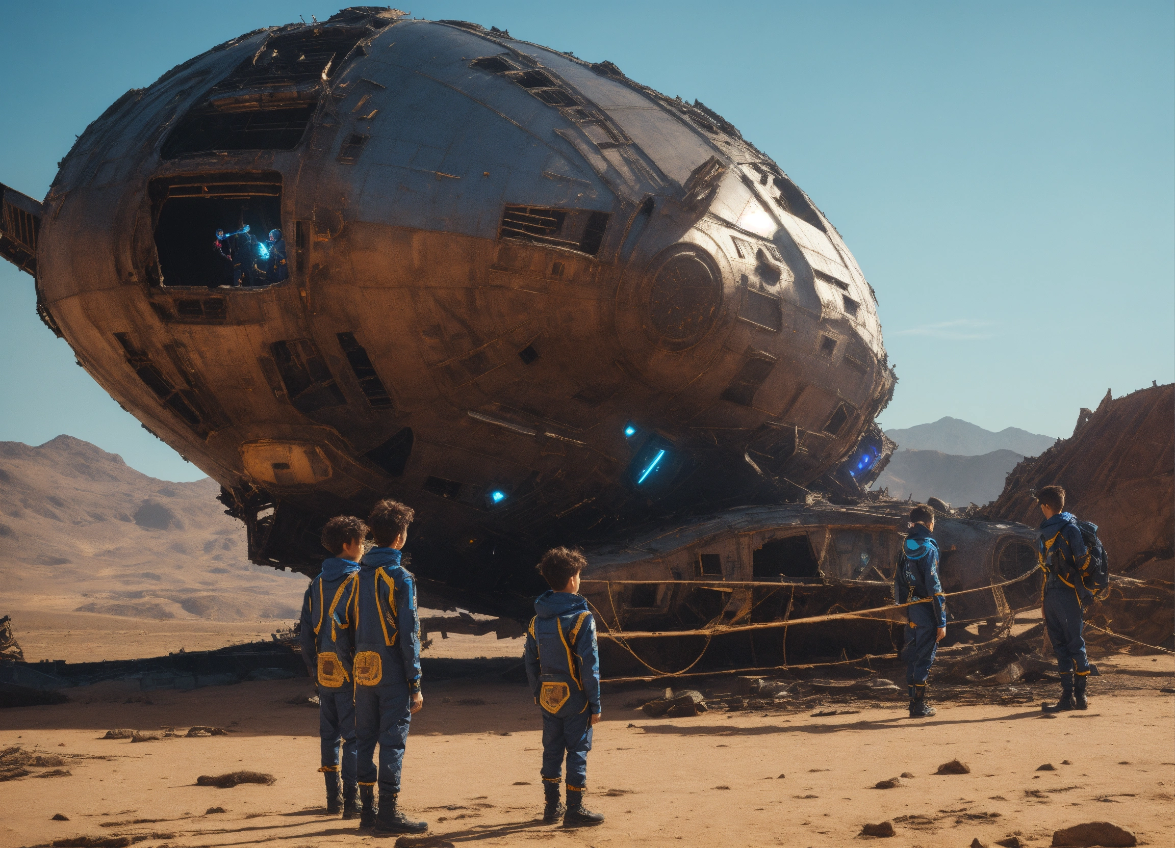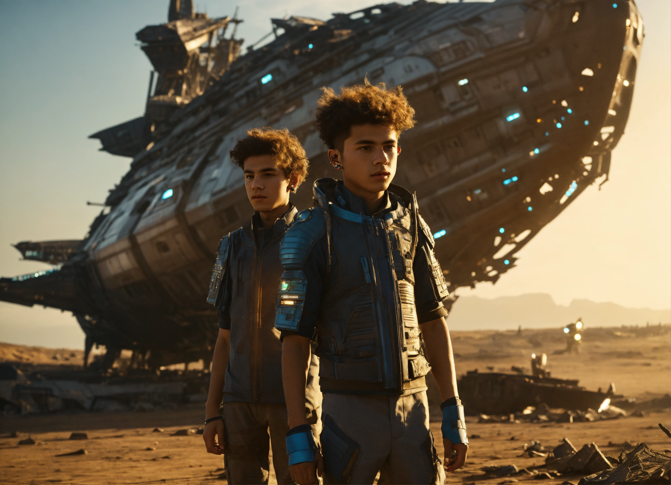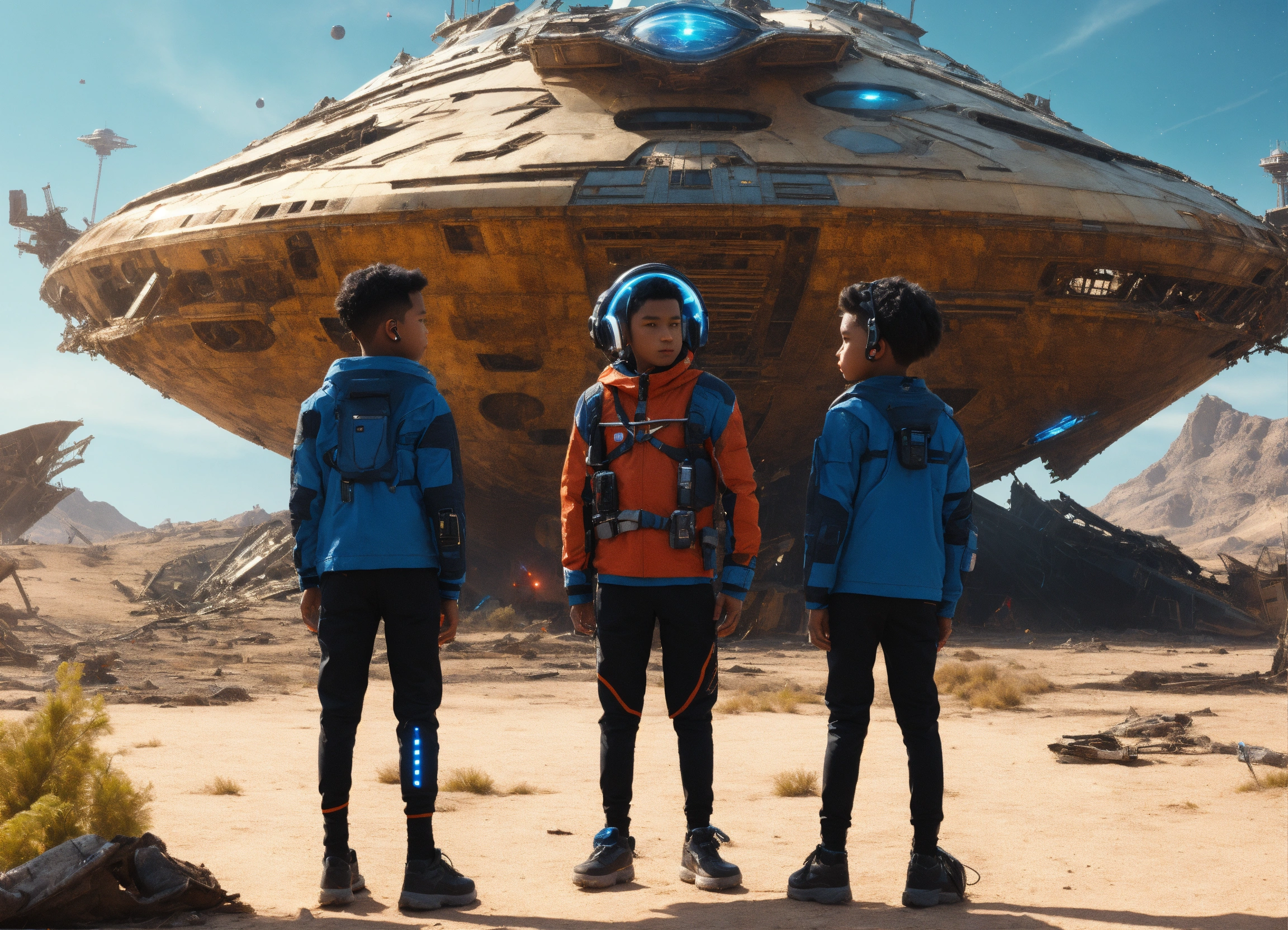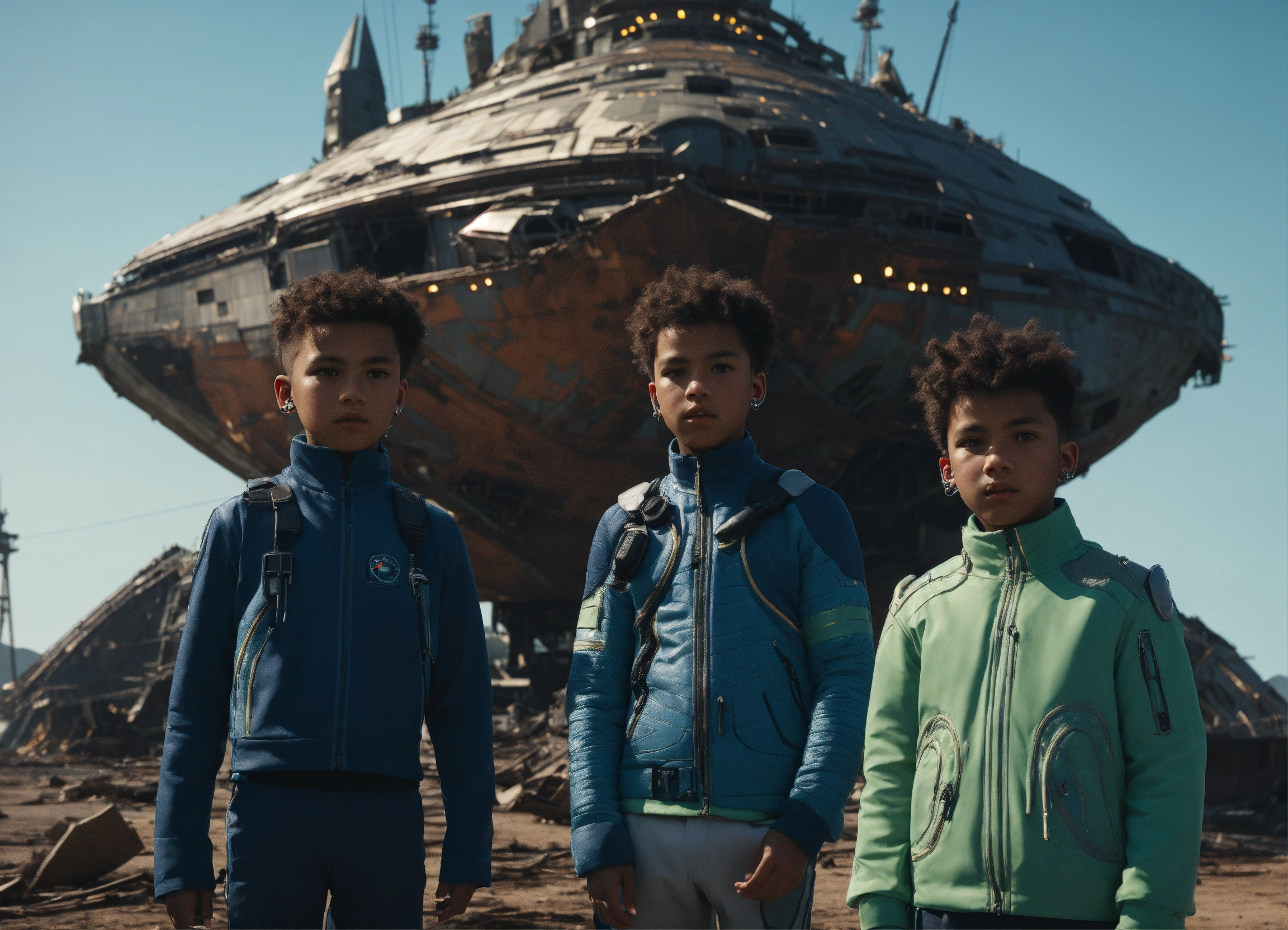 Zoom out of a 3 boys standing outside a wrecked star ship wearing detailed alien ear antennas with futuristic clothing, futuristic, sci-fi, realistic, 8k
