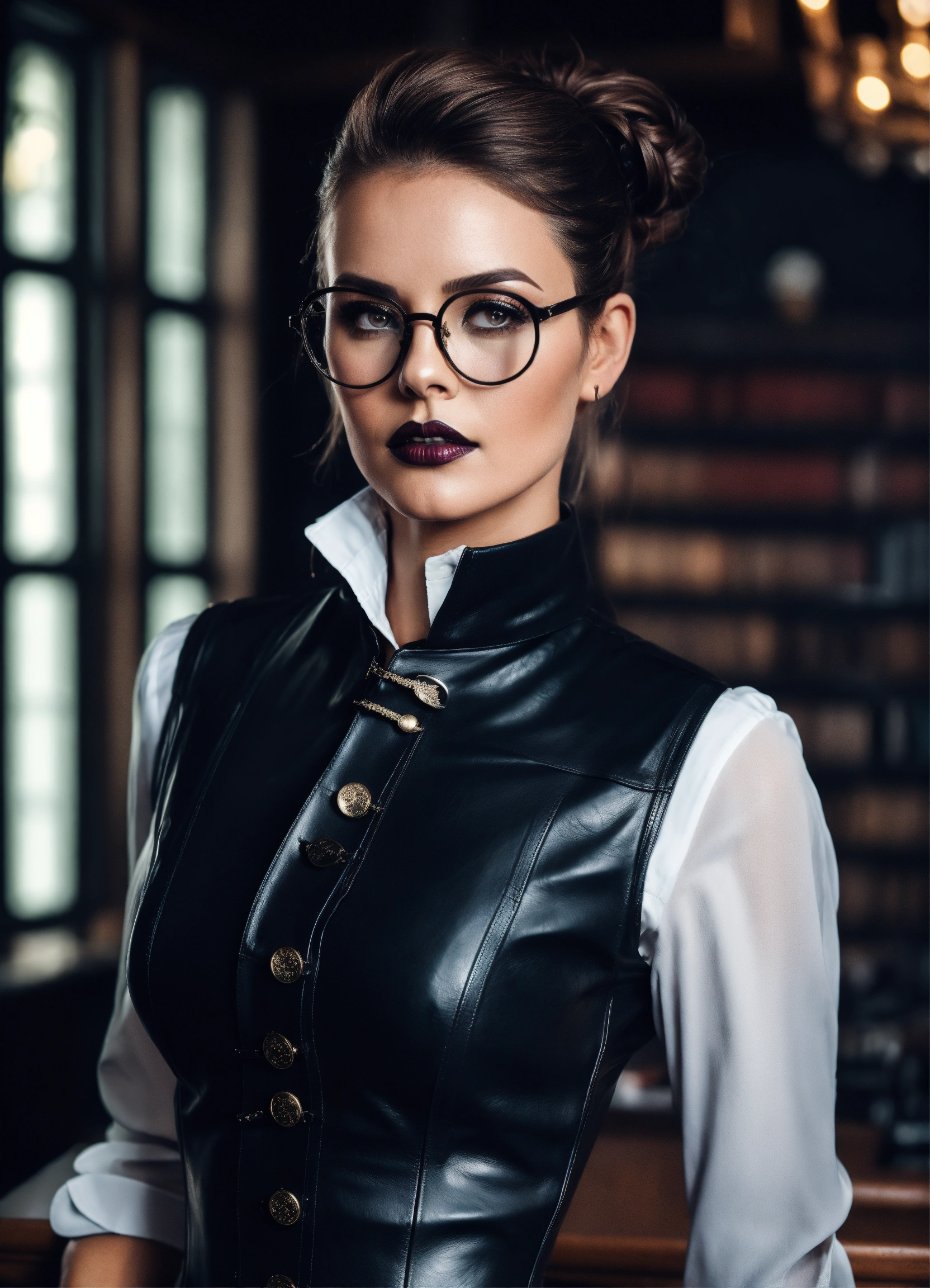 Stunning french seductress woman fashion model, strict pose, brunette hair bun, glasses, strict governess black leather corset dress vest and big buttons, black leather pencil skirt, white office shirt with big closed shirt collar and long puff sleeves, eyeliner makeup, knee high leather boots, dark grey mansion room full of high heel boots background, low contrast