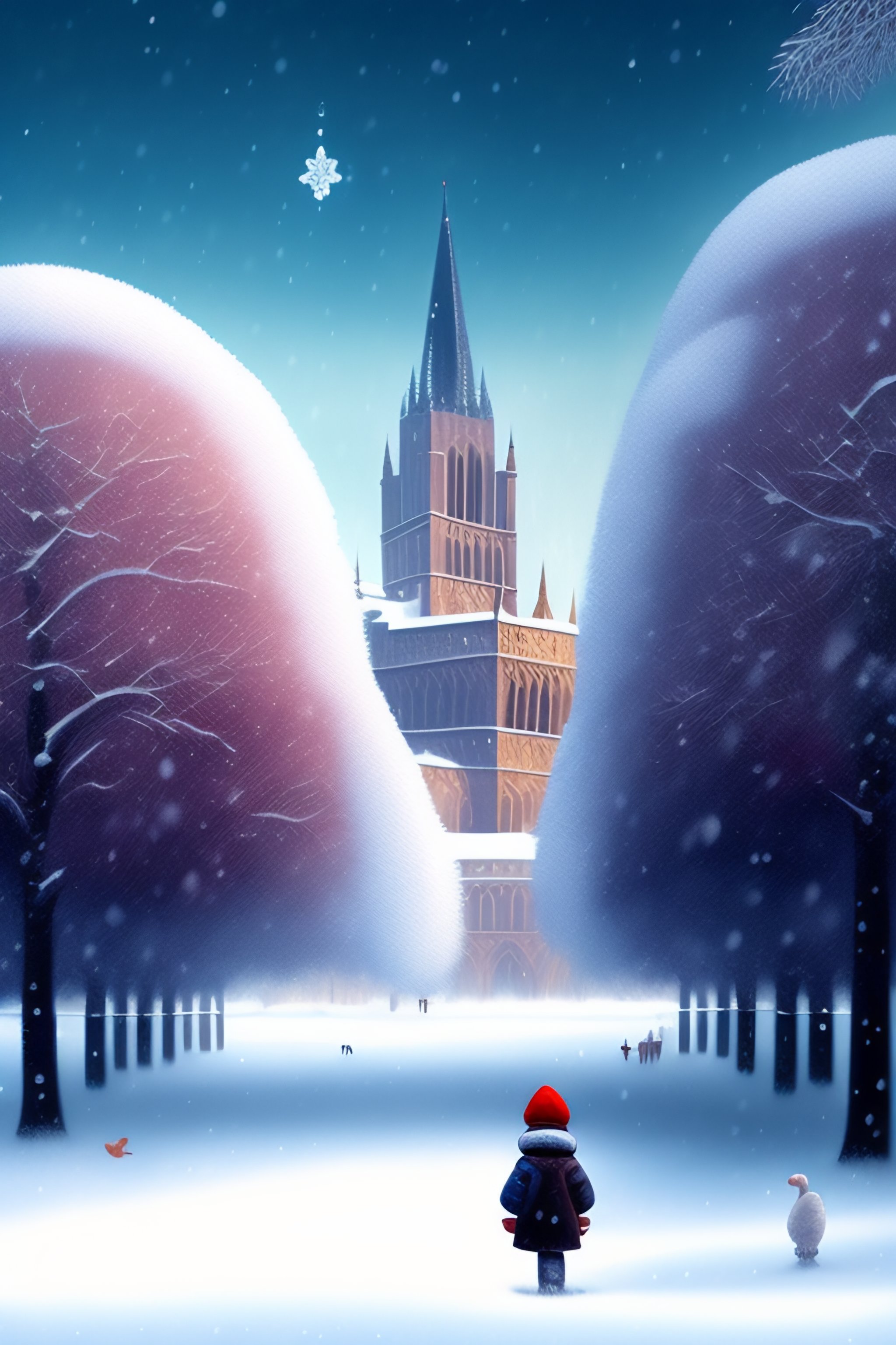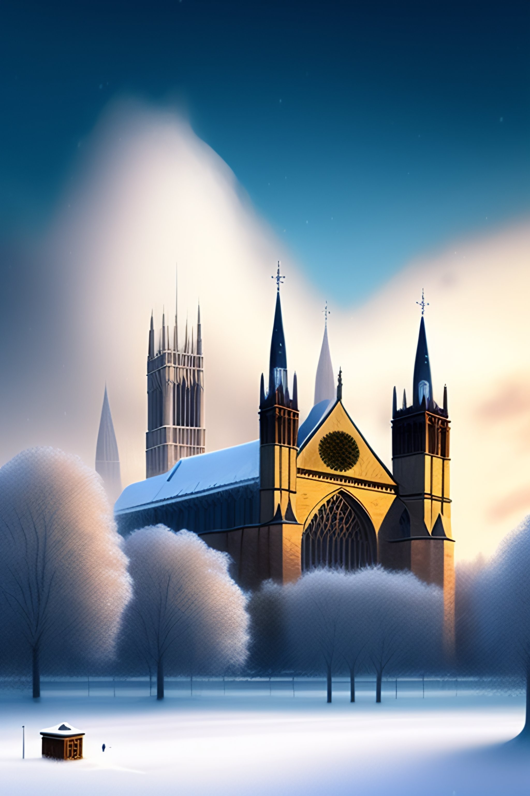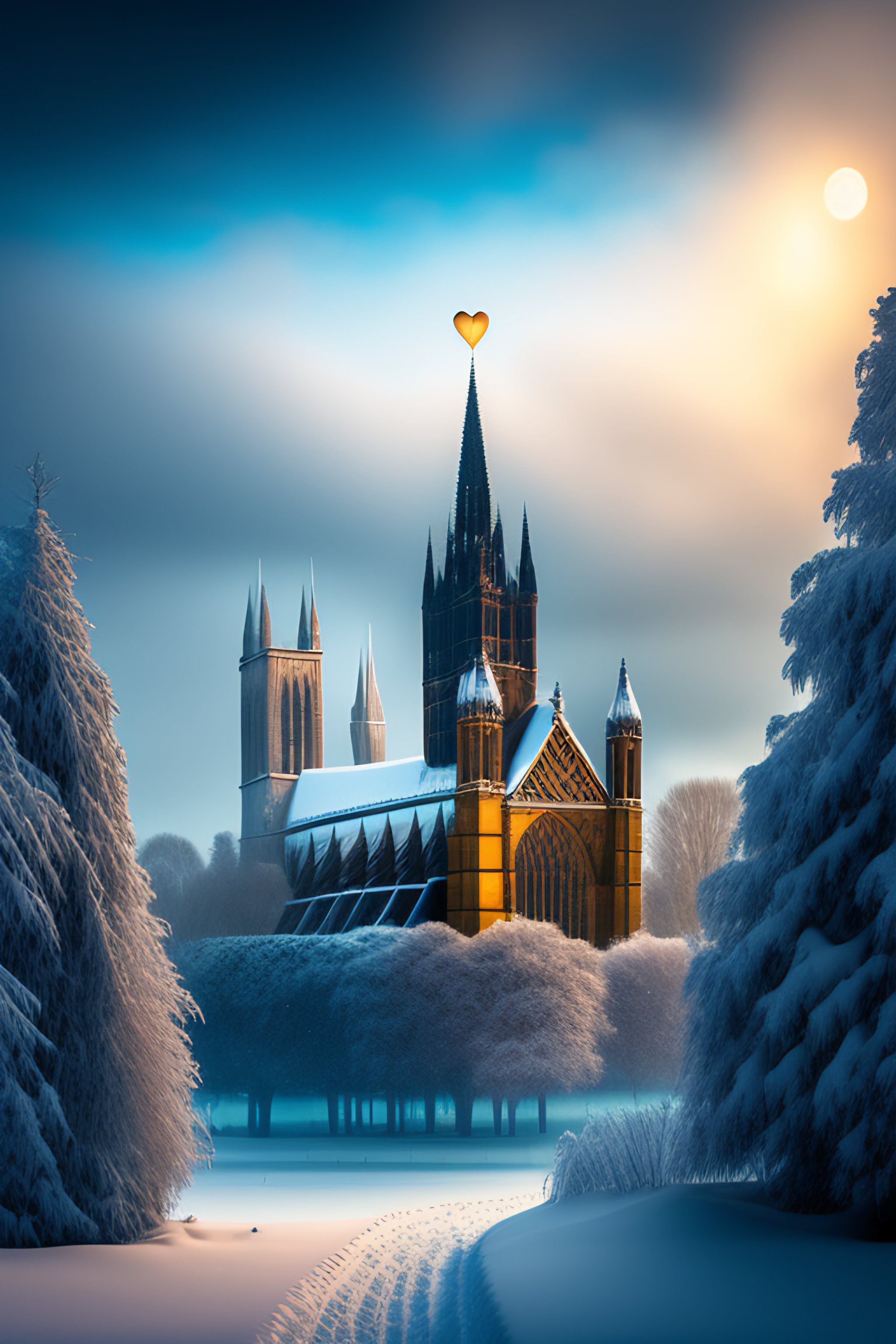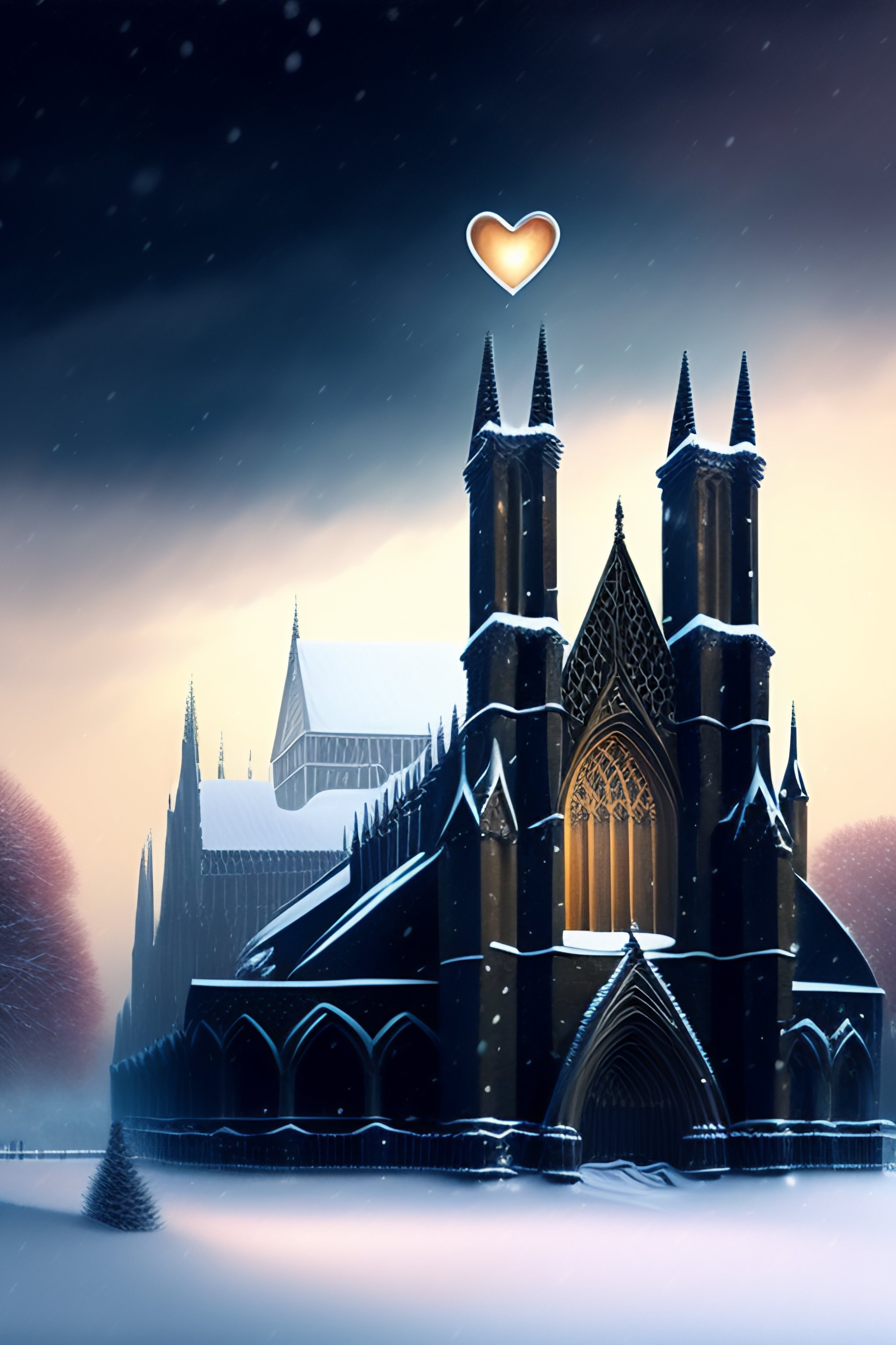 Produce a picture in the style of artist doug hyde showing lincoln cathedral in winter with a love heart in the snow