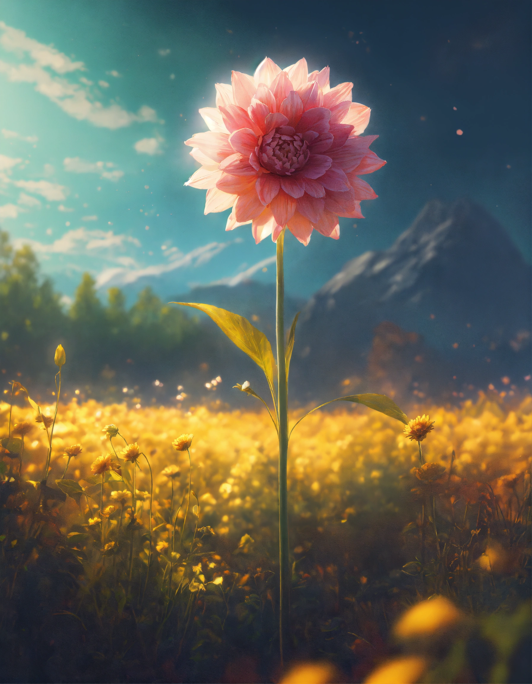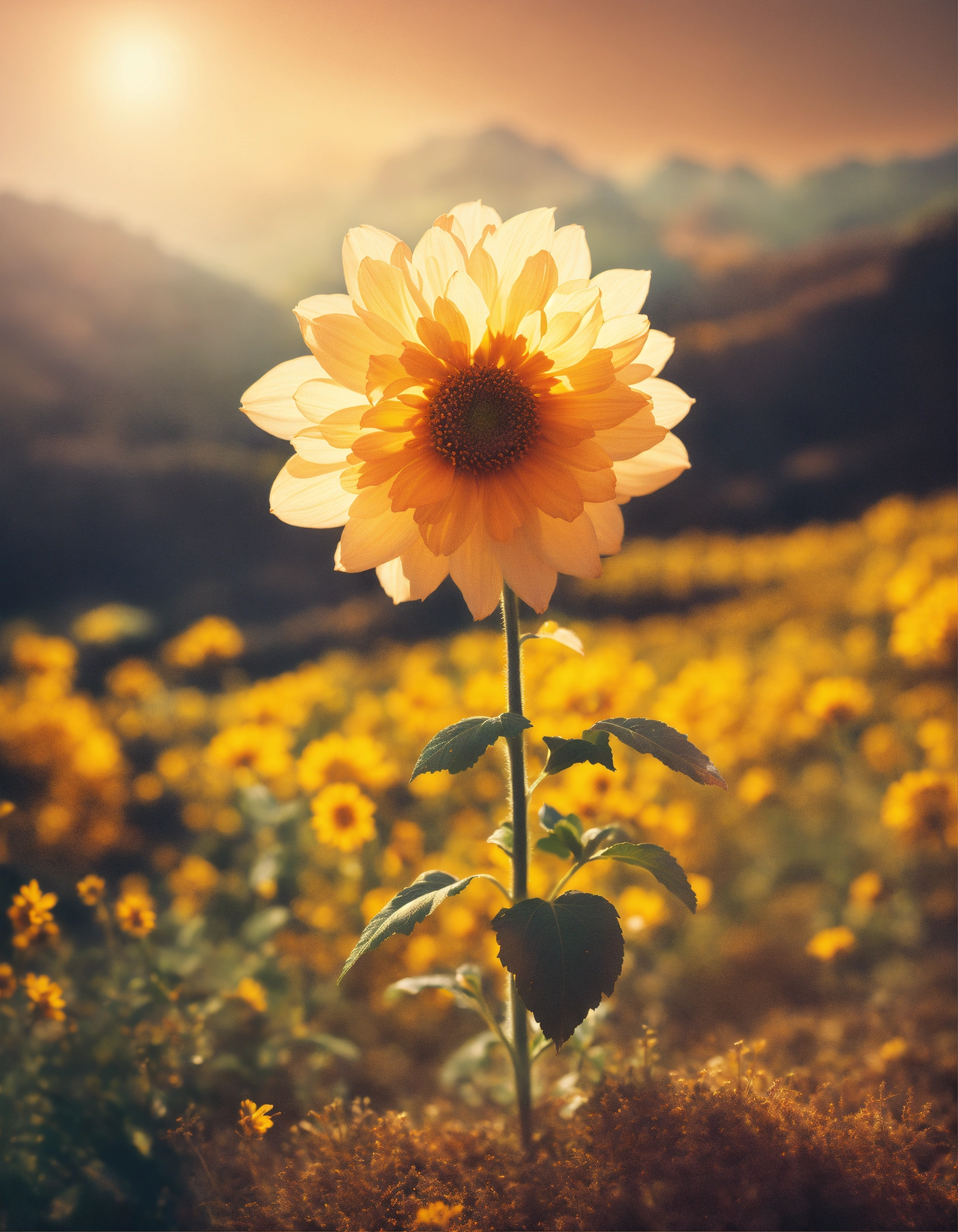 A very tall beautiful unrealistic grown-up flower, alone on the valley, a lot of sun light, analog, camera, detailed composition, --ar 169 --v 5.2 the evolutional process of growing, painted by francis bacon, painted by james gilleard, surrealism, airbrush, ilya kuvshinov, wlop, stanley artgerm, very coherent, bokeh