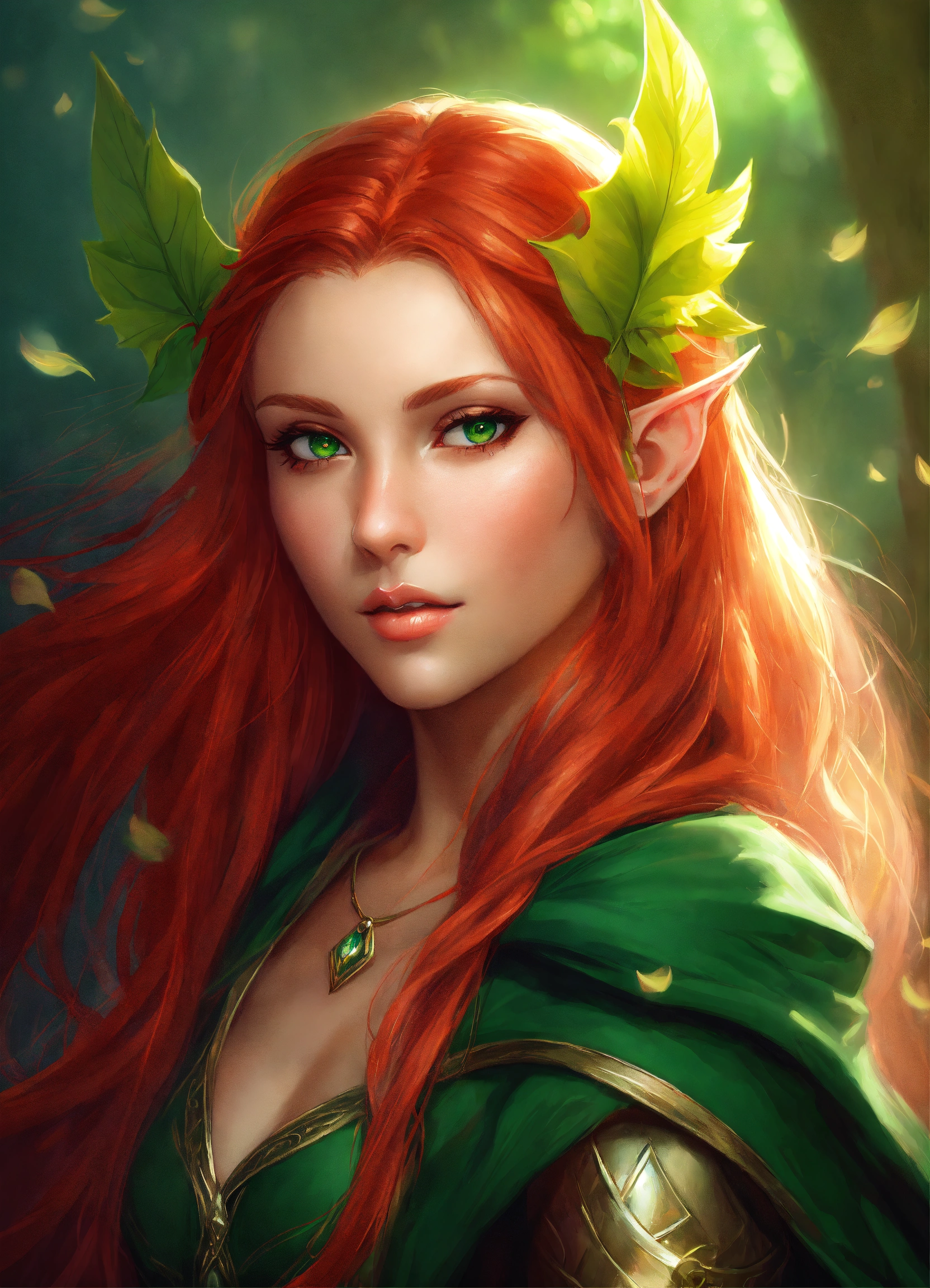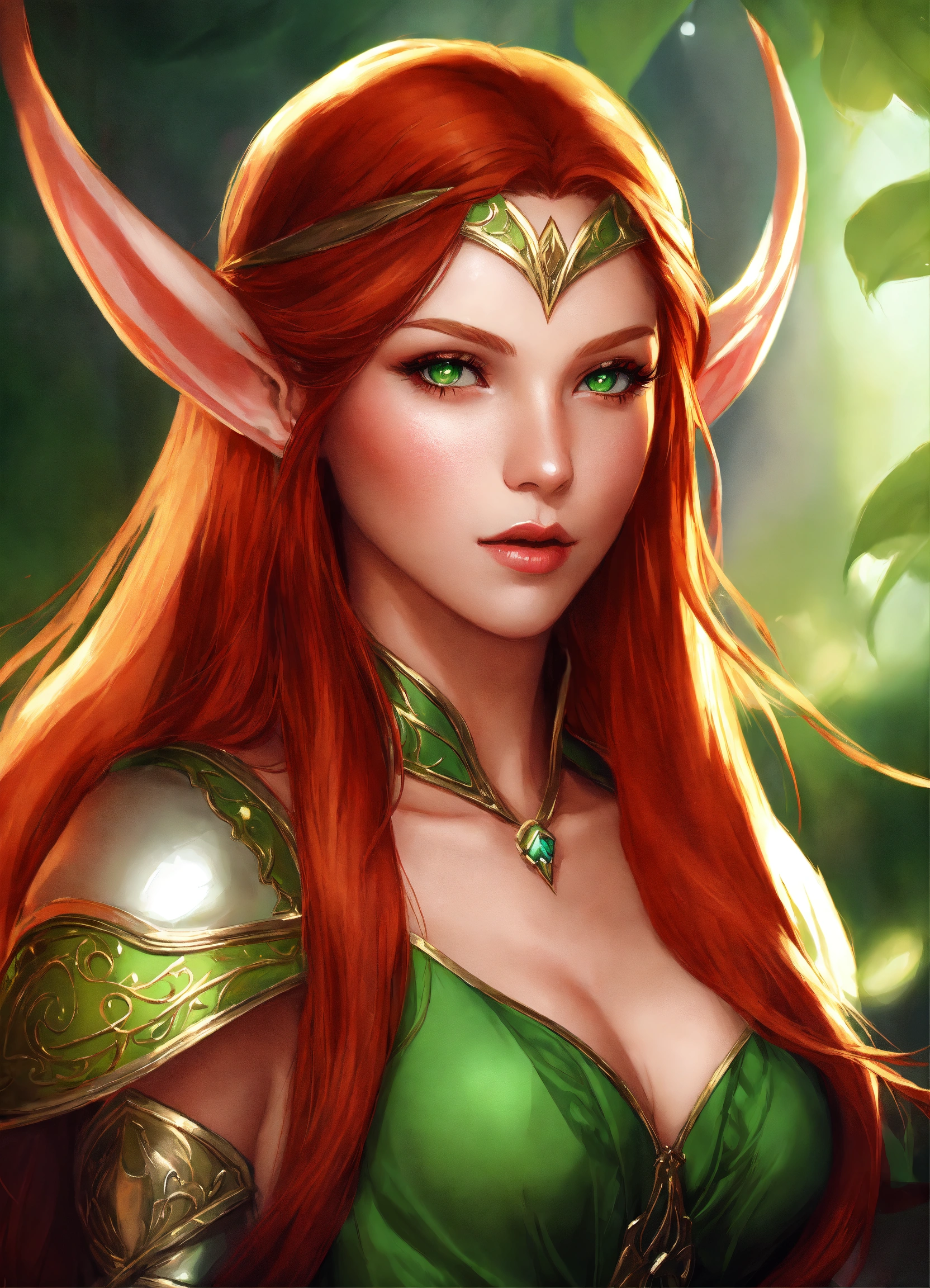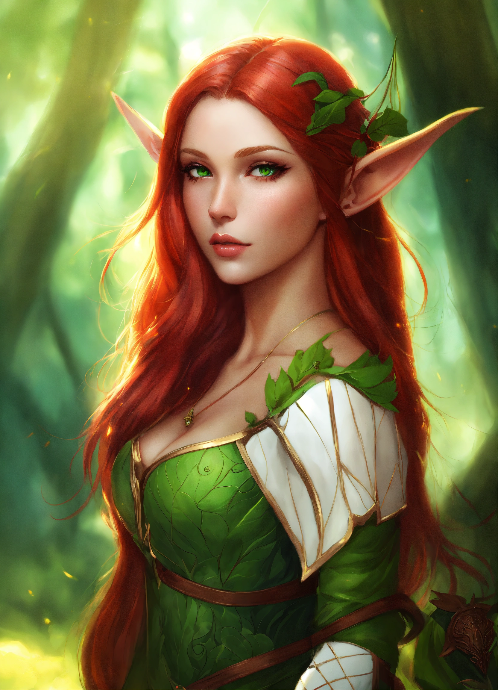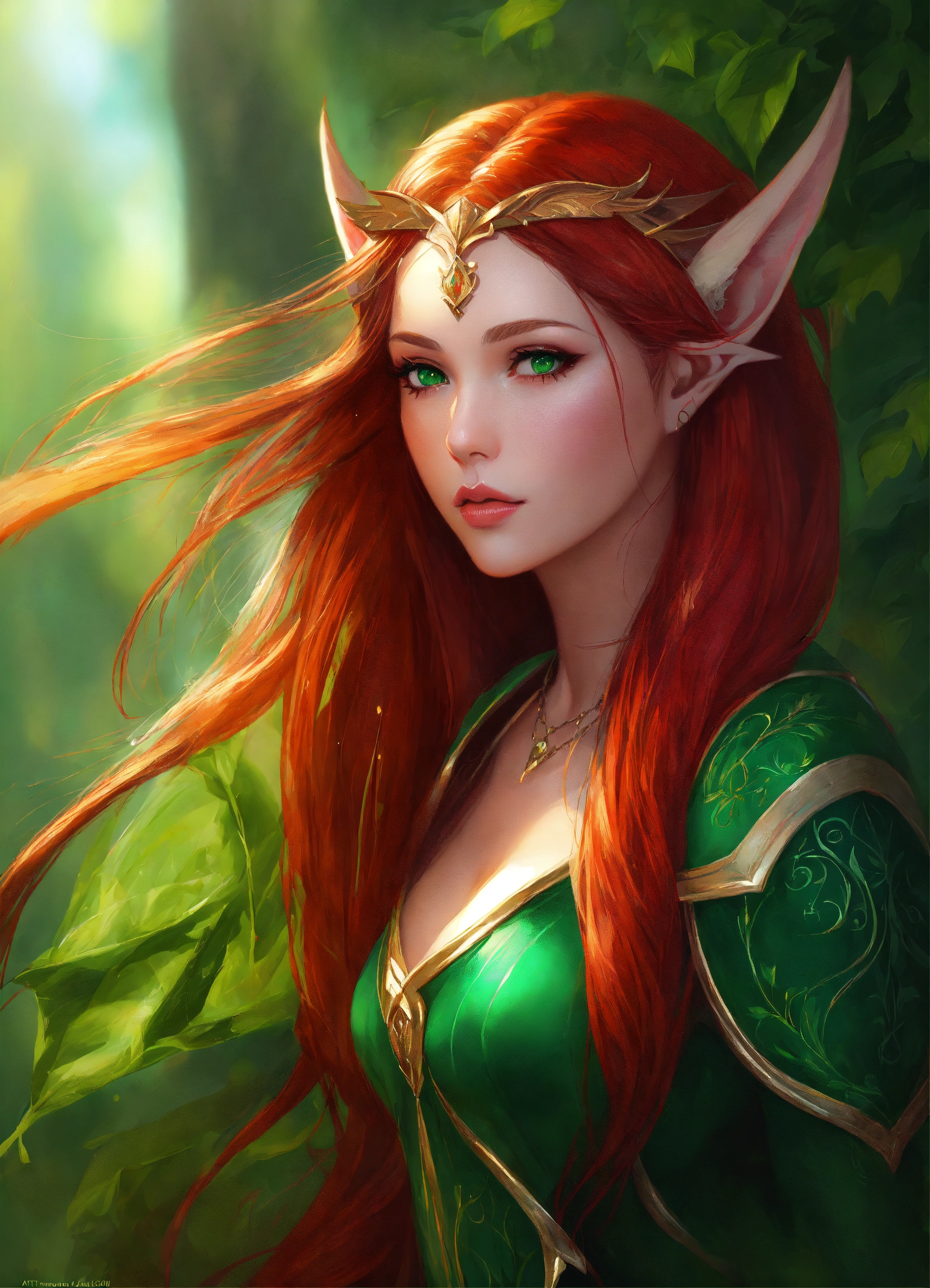 Beautiful elf, digital art, art by artgerm, female, medieval fantasy, long ears, red hair, feminine, green eyes