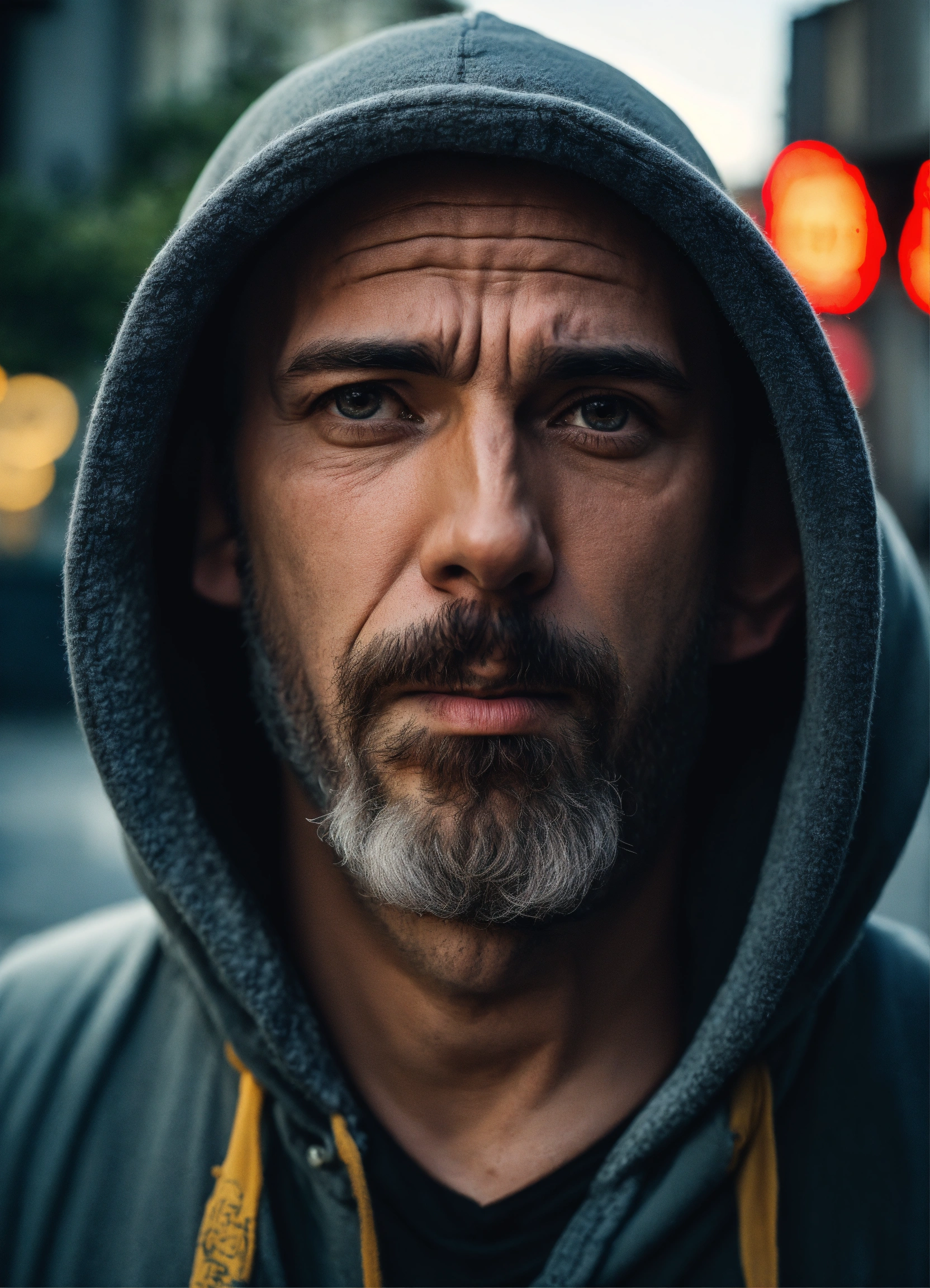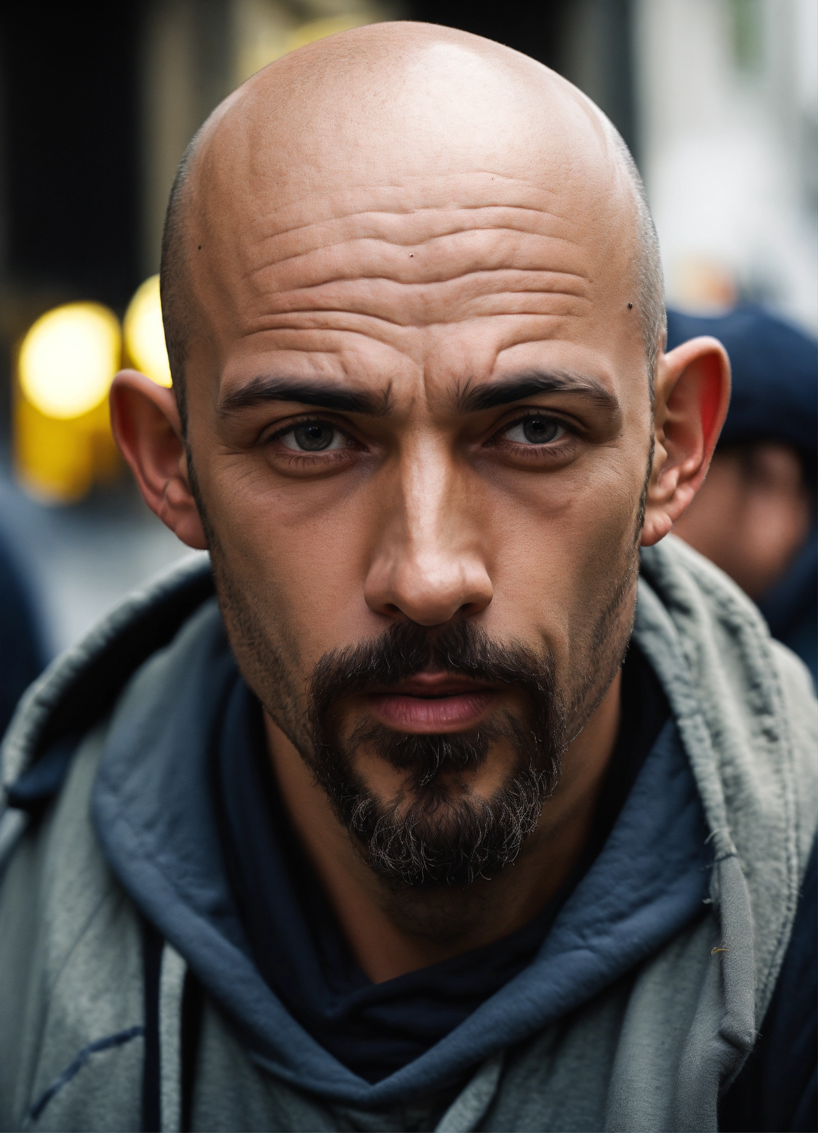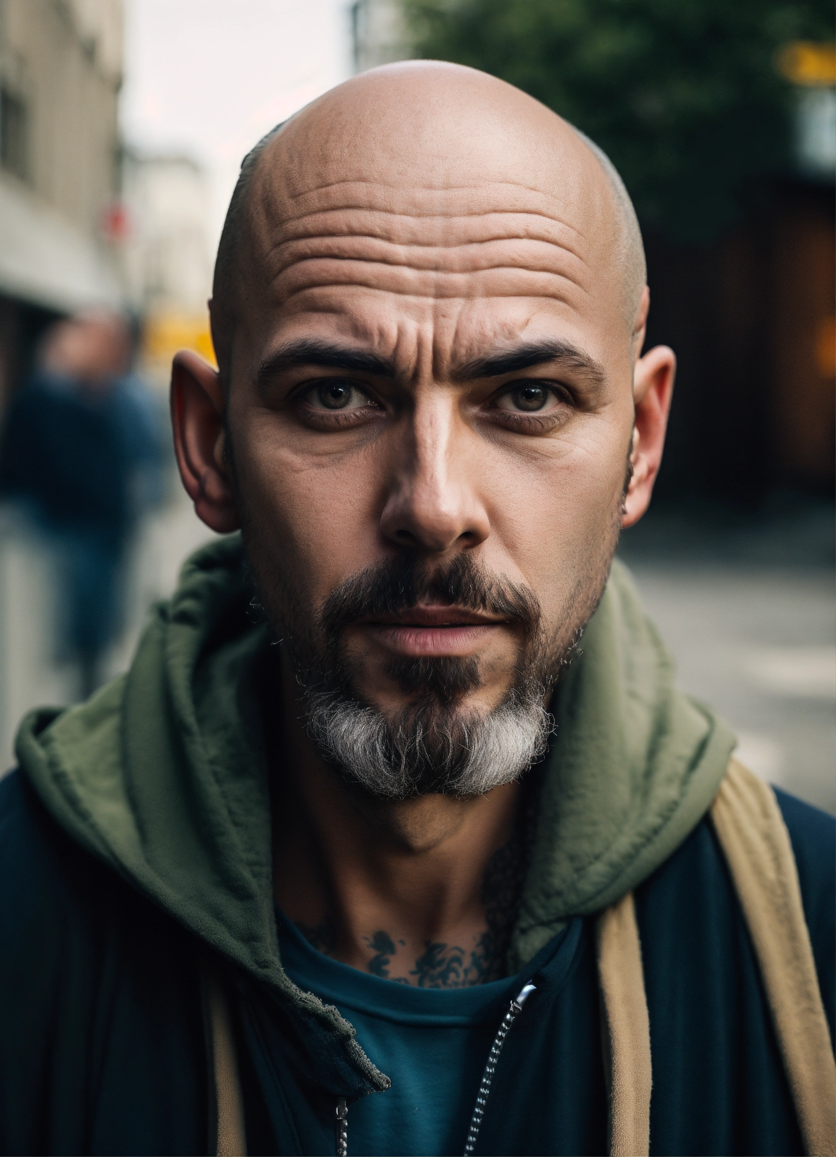 A huge bald strange looking homeless man with a goatee, extended protruding brow forehead, grey eyes, crooked mouth, large ears, wearing a hoodie up over his head, standing in the street