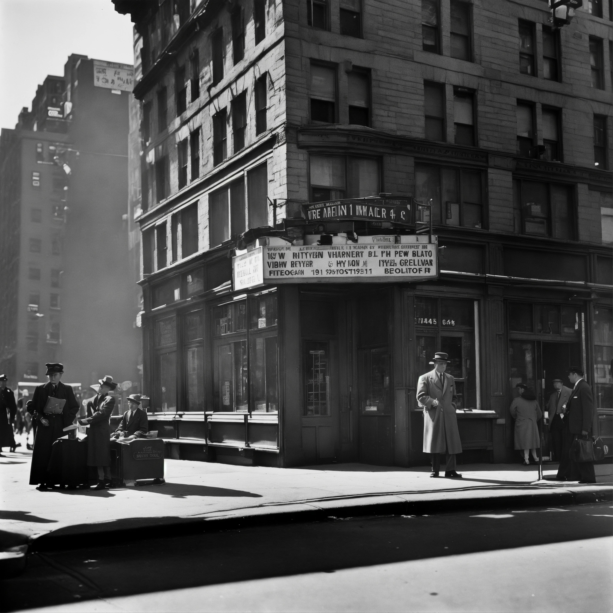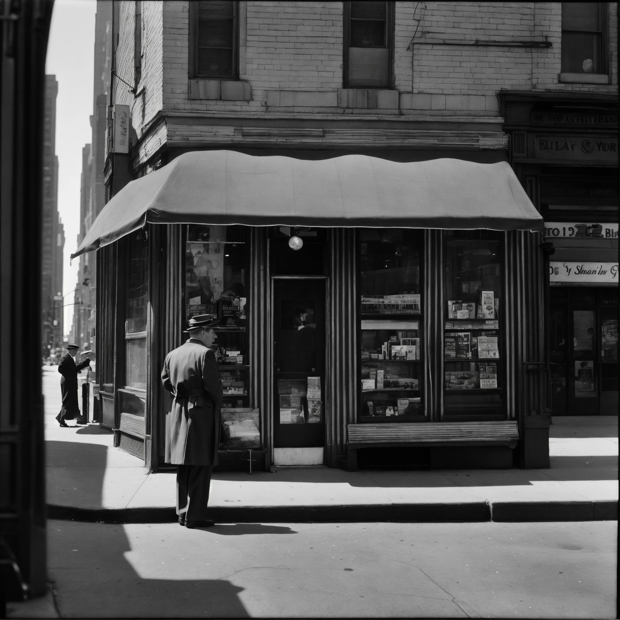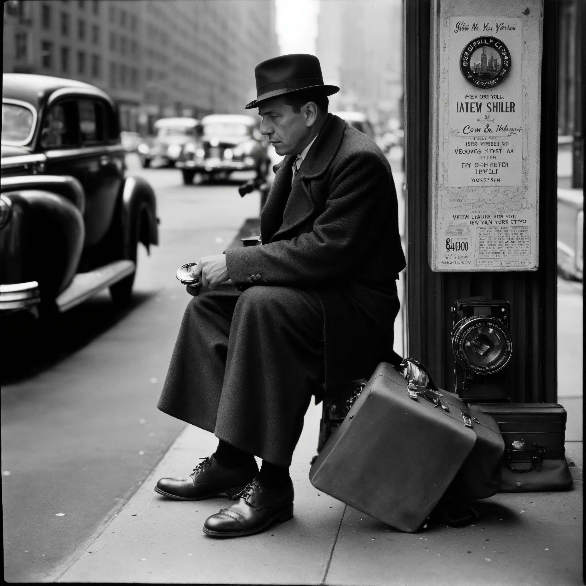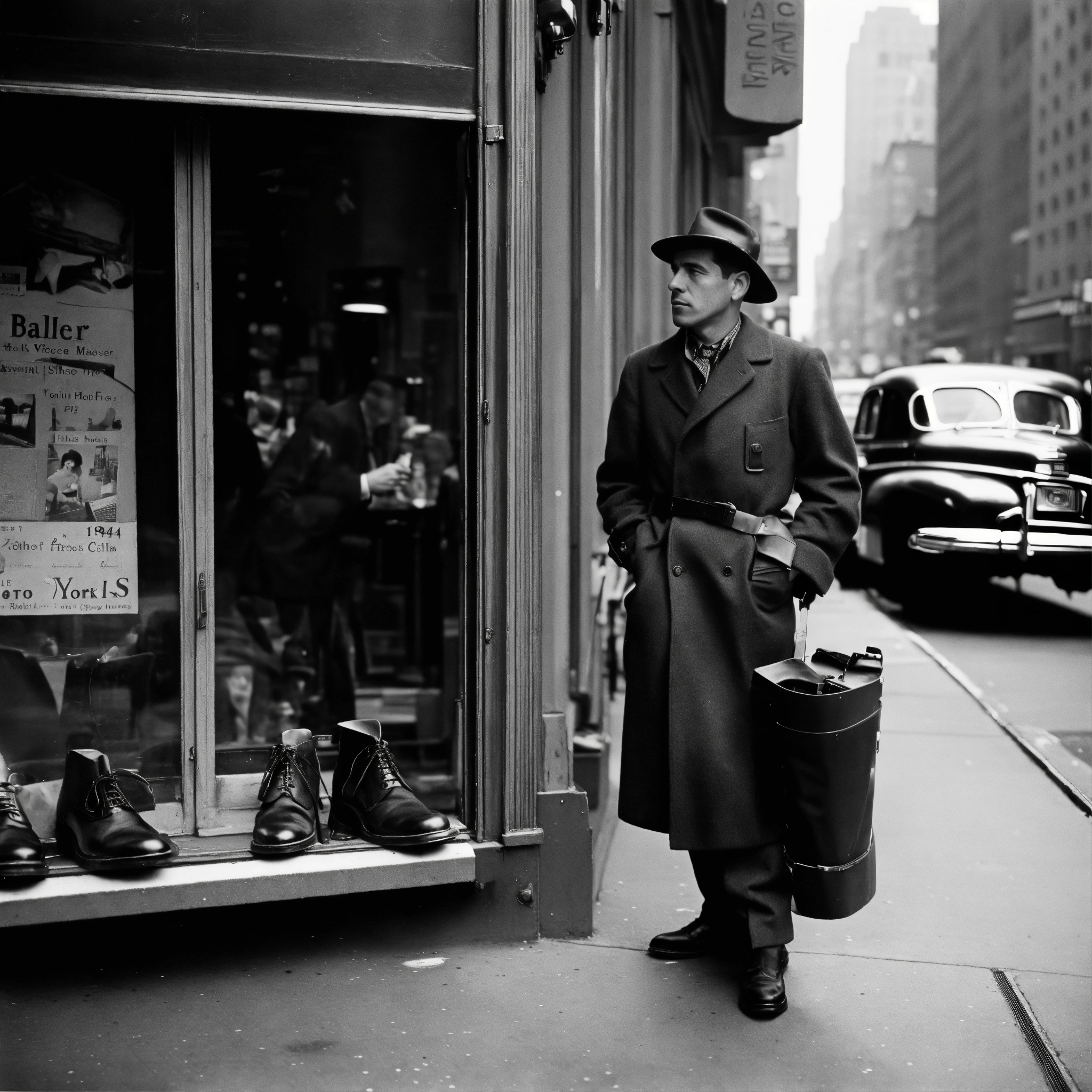 Black and white rolleiflex image of 1940s new york city street in the style of vivian maier, shoeshiner waiting for a customer on a corner
