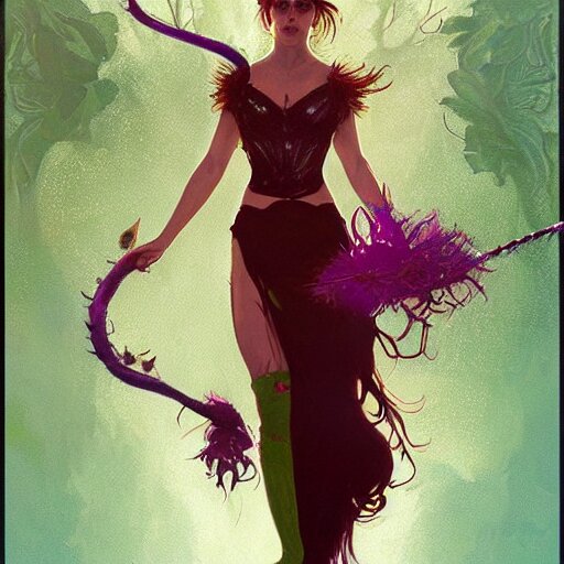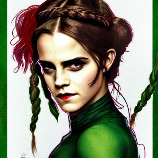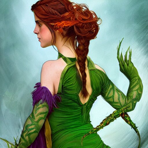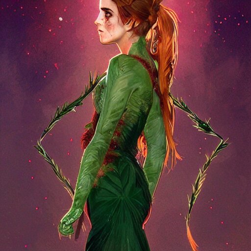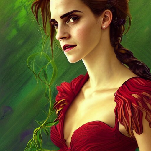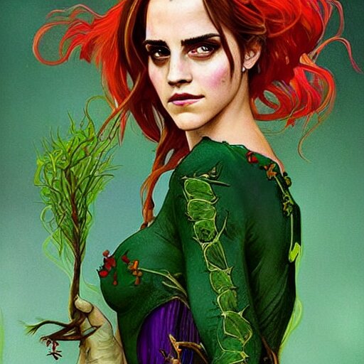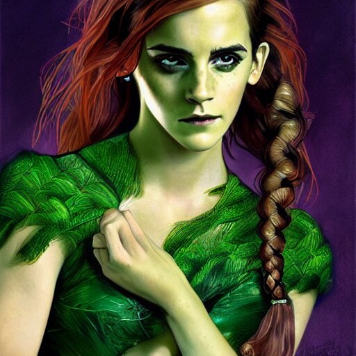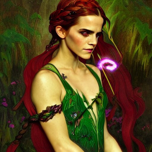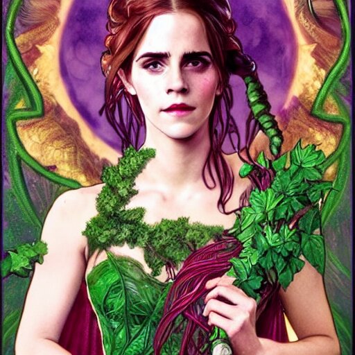 A stunning tarot card of emma watson as poison ivy with hair tied in a braid and wearing a seductive red and green dress, dark eyeliner, purple and green fire, intricate, elegant, highly detailed, digital painting, artstation, concept art, sharp focus, illustration, art by greg rutkowski and alphonse mucha