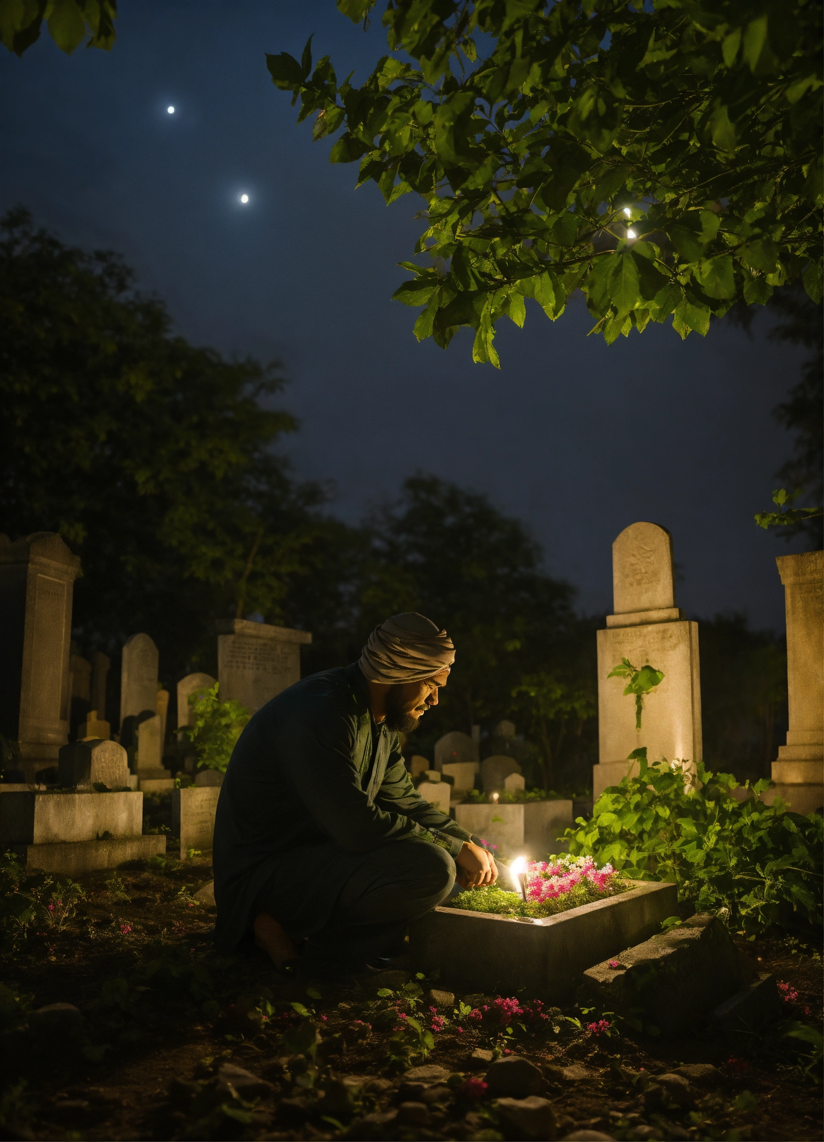A nostalgic muslim hulk personality brother visit graveyard of his sister late at night surrounded by jasminum sambac
