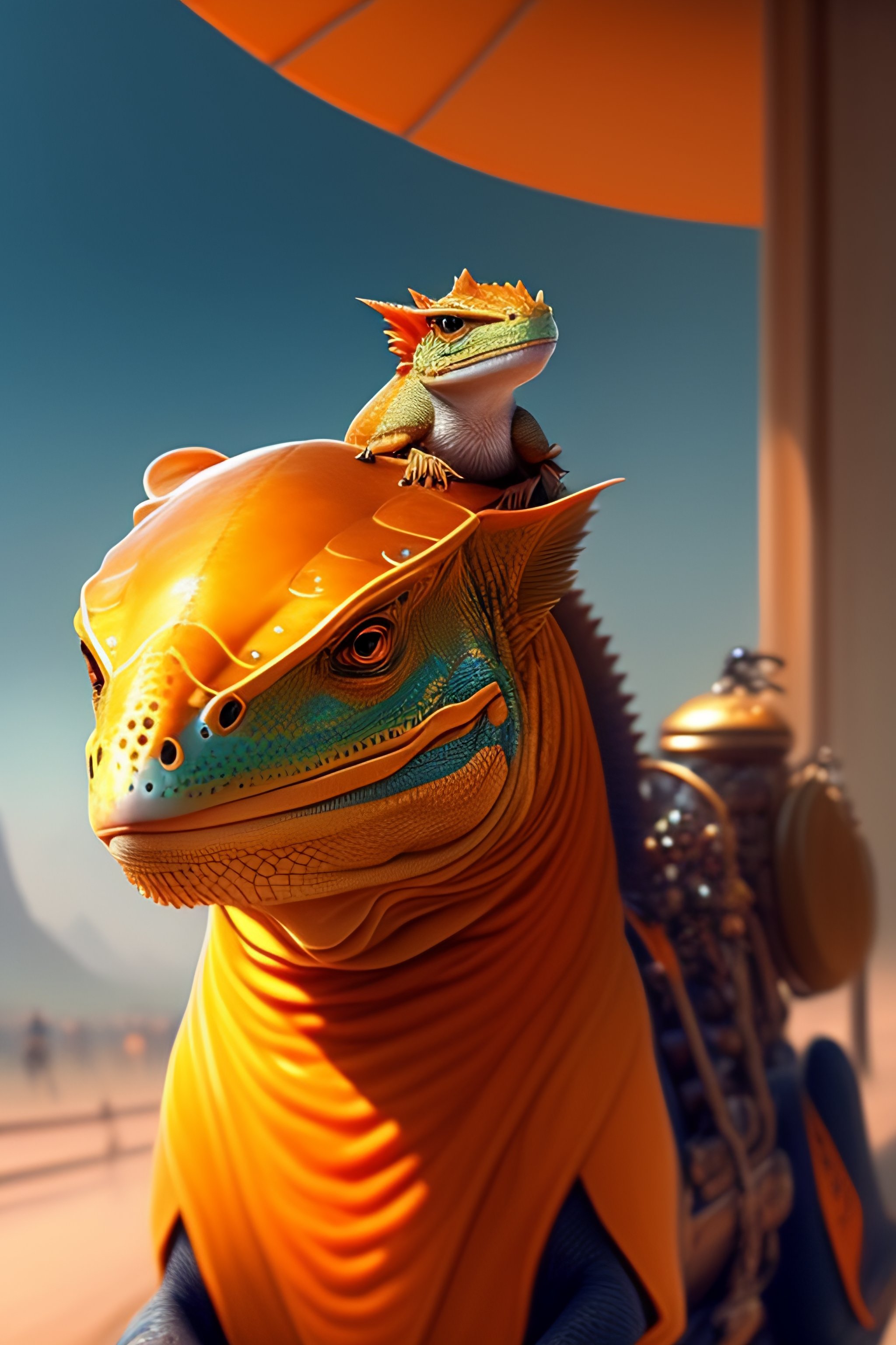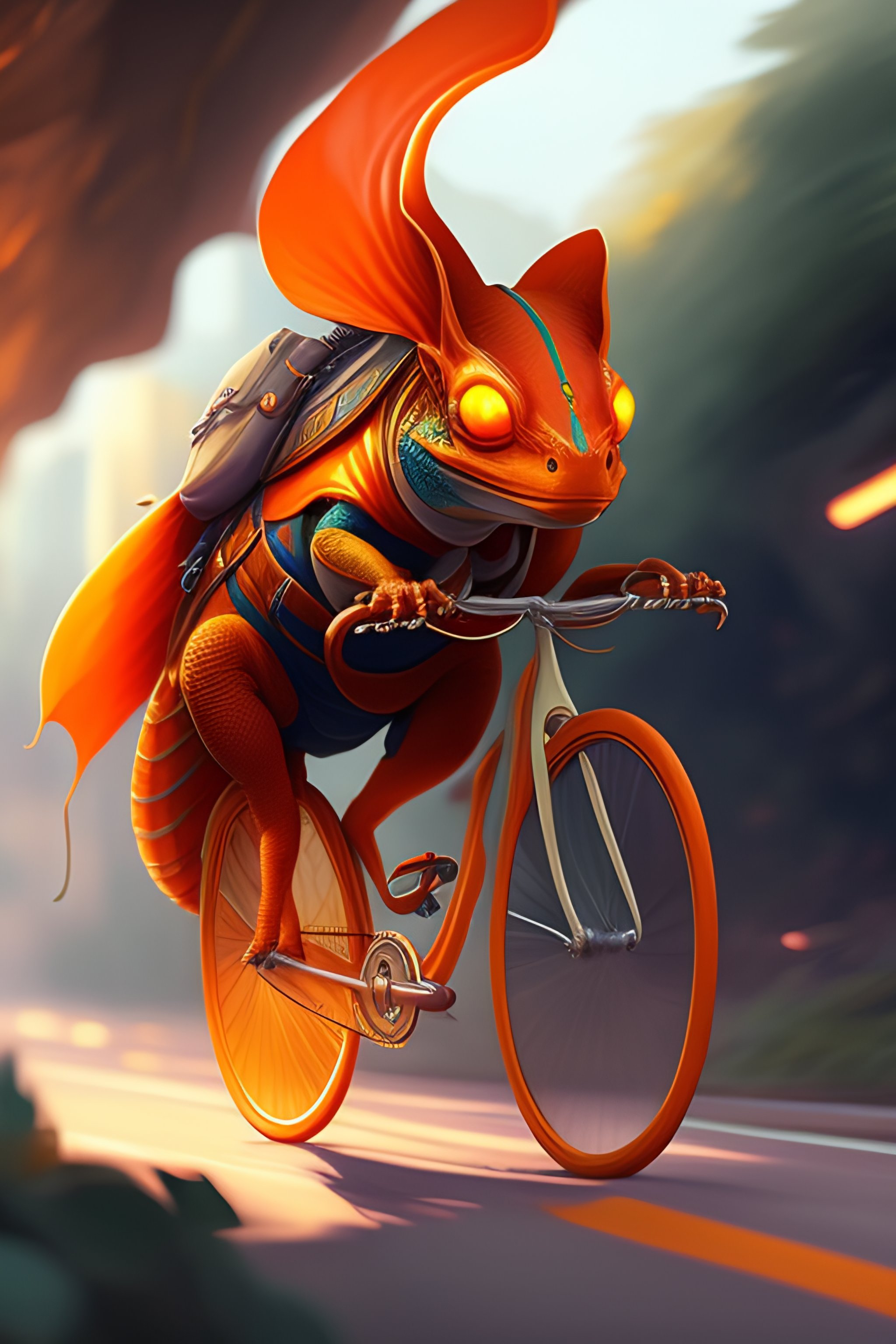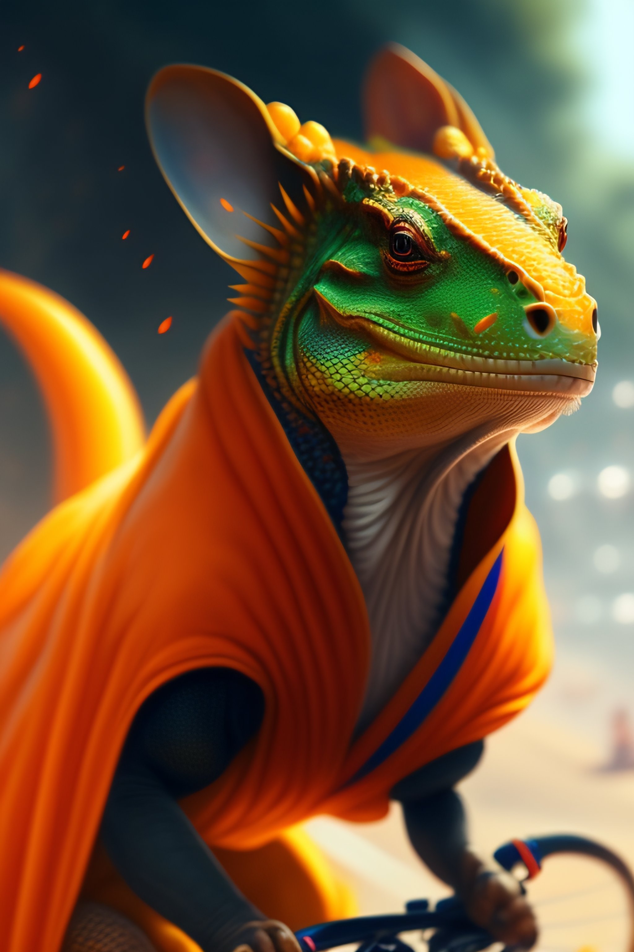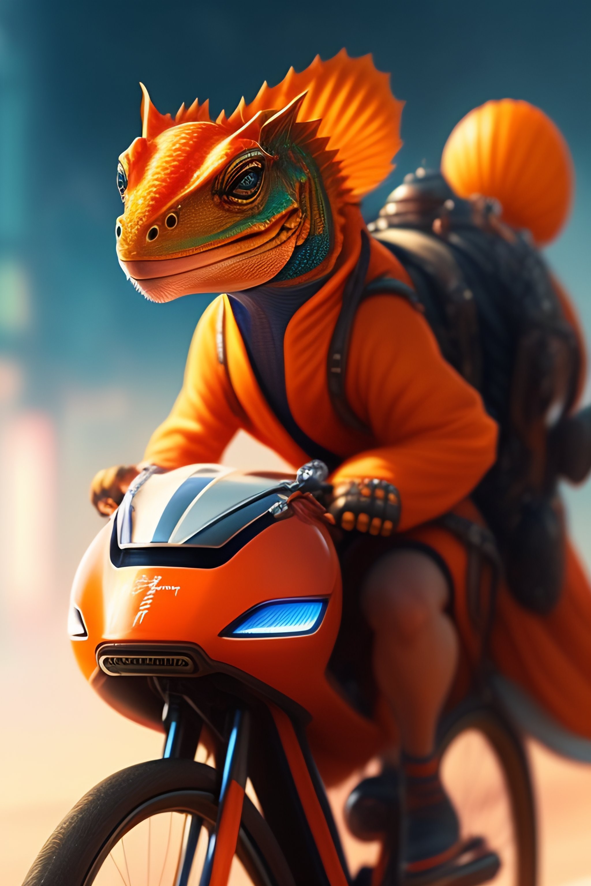 A buhdist lizard cycling with a helmet bicycle wearing an orange robe, budha, by greg rutkowski makoto shinkai kyoto animation key art feminine mid shot