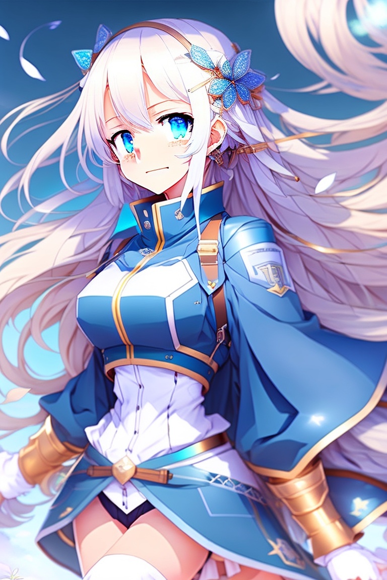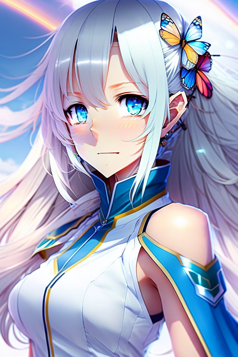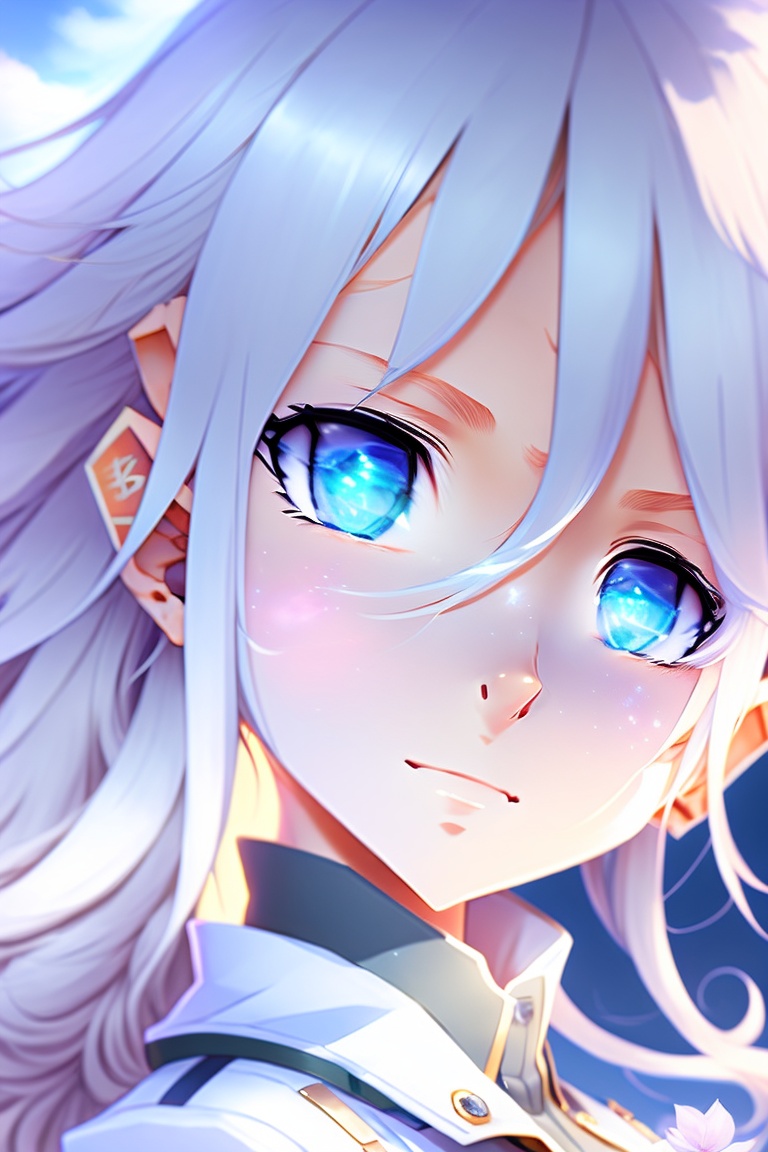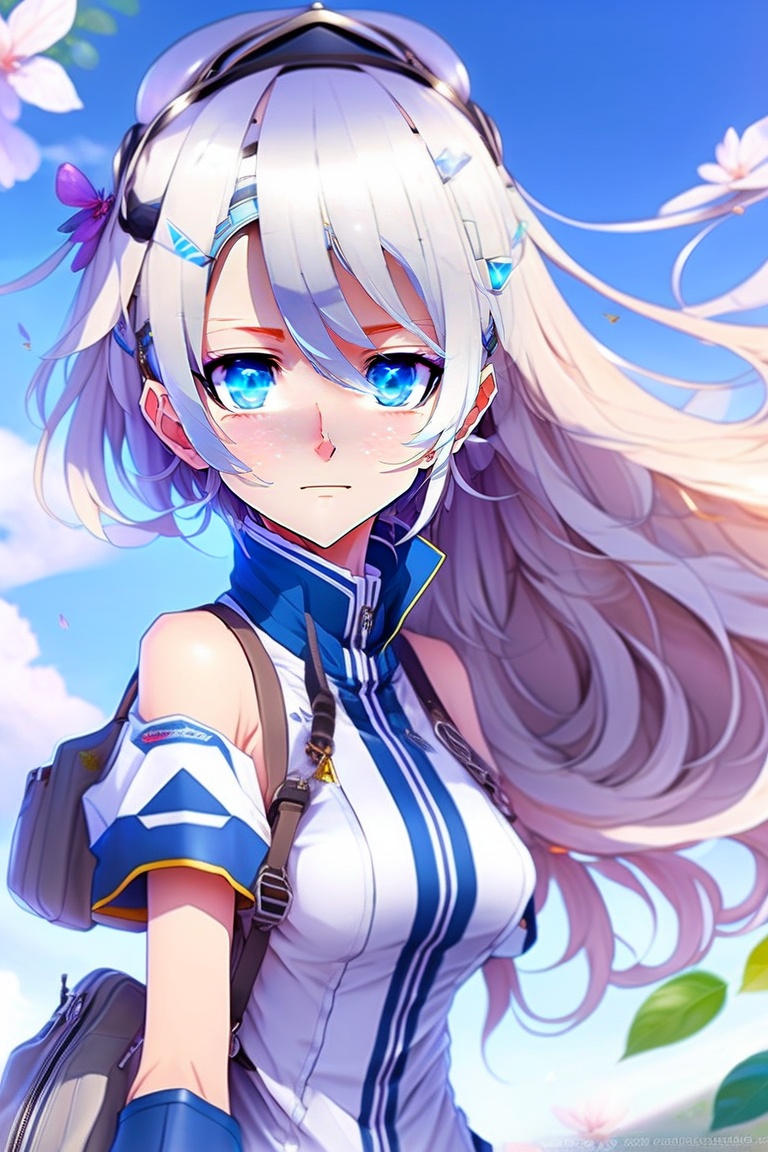 A super cute anime girl with white hair and blue eyes, fantastic, an anime drawing, dynamic pose, high-speed, web3, fair-skinned, beautiful-eyes