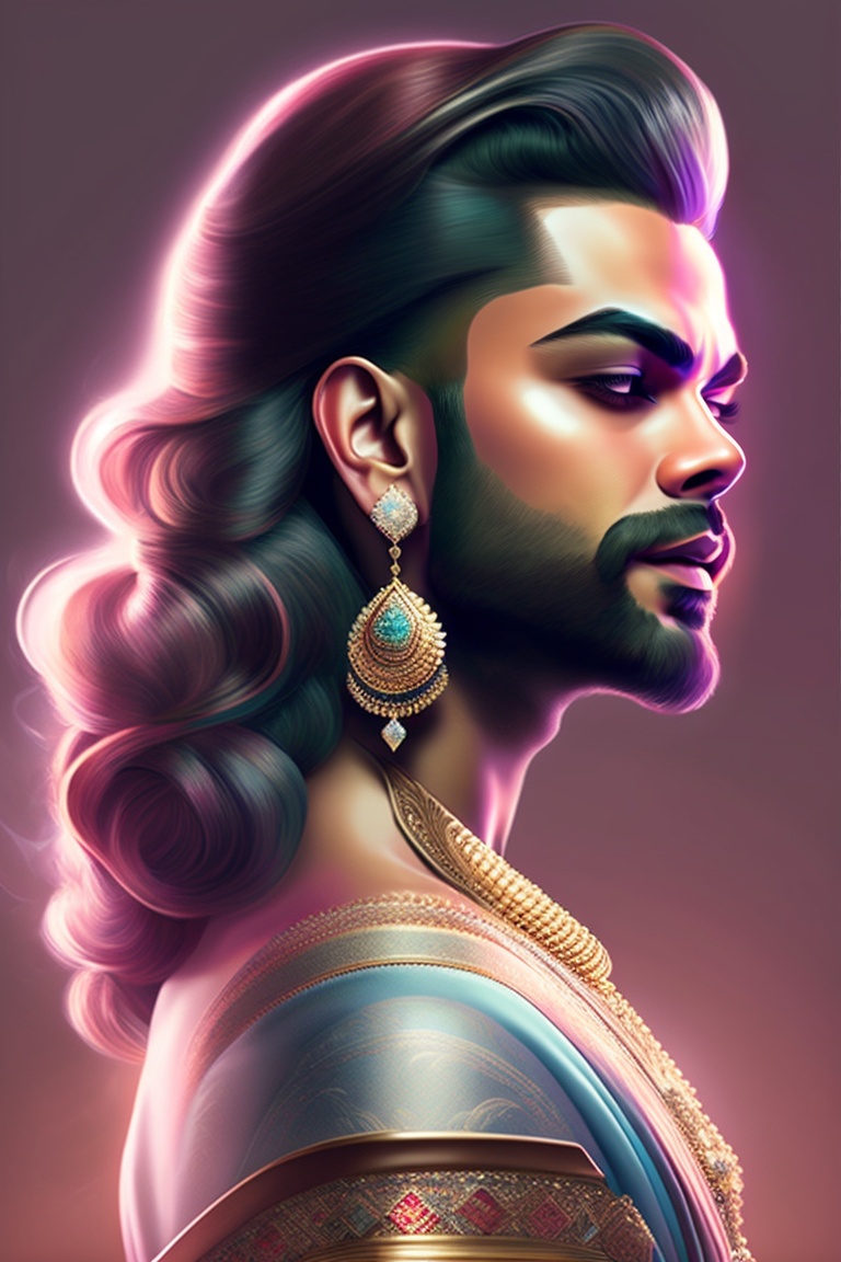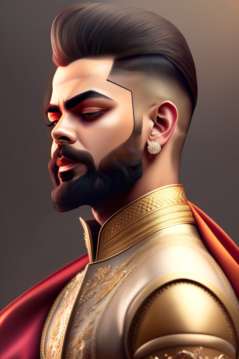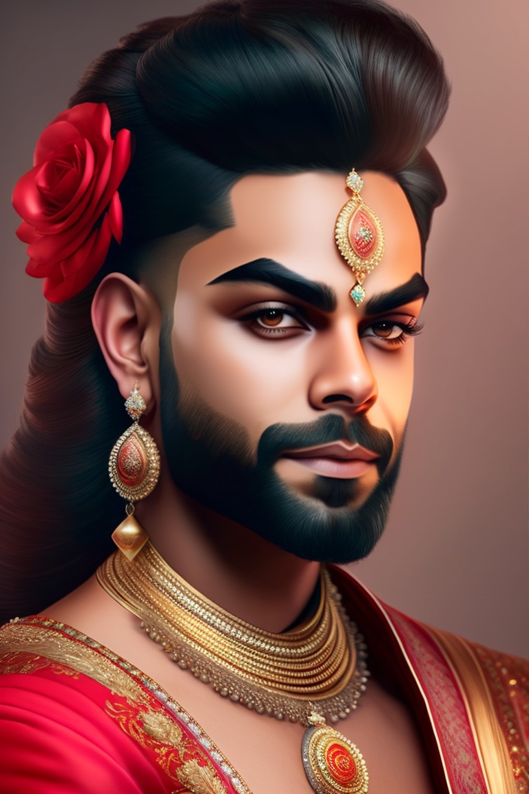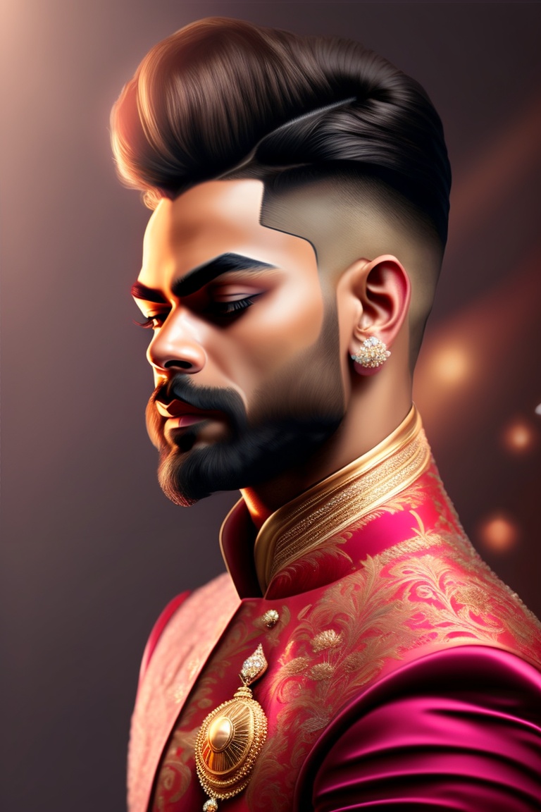 Incredibly virat kohli, a king with lush hair and beautiful earrings in a luxurious dress with many details made of satin and silk