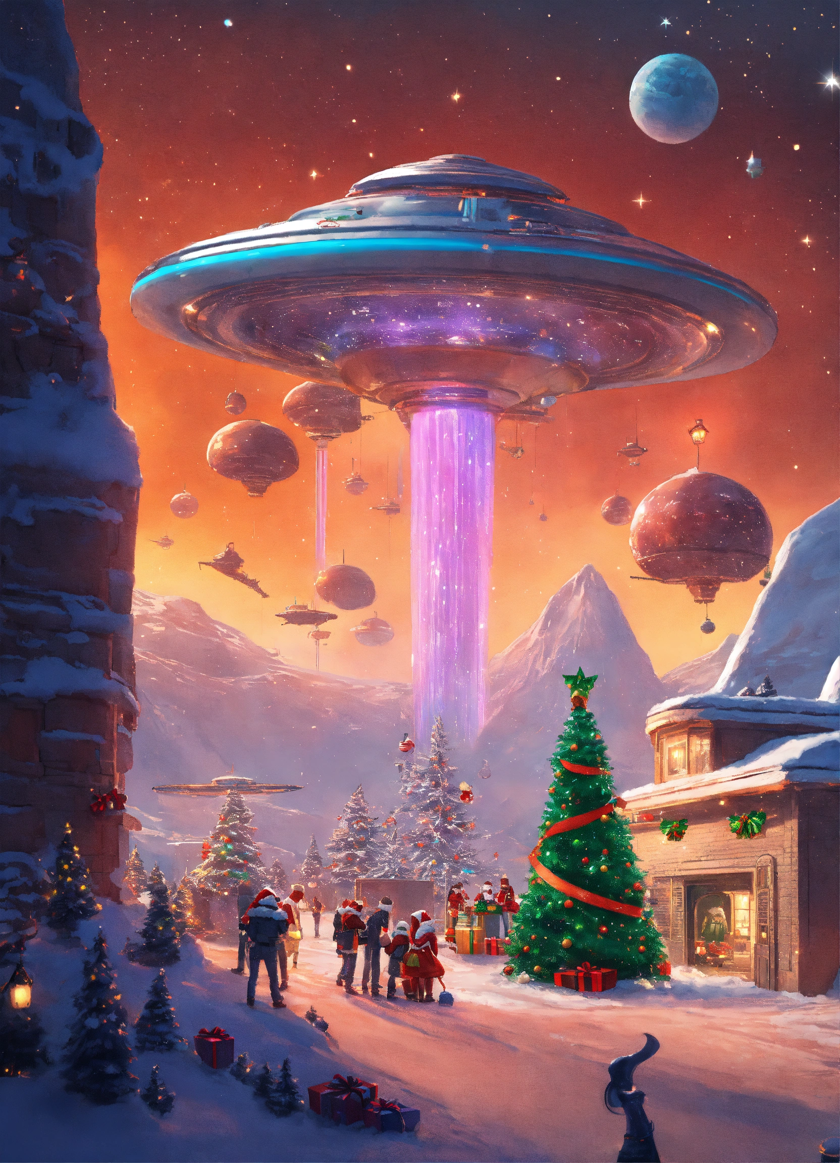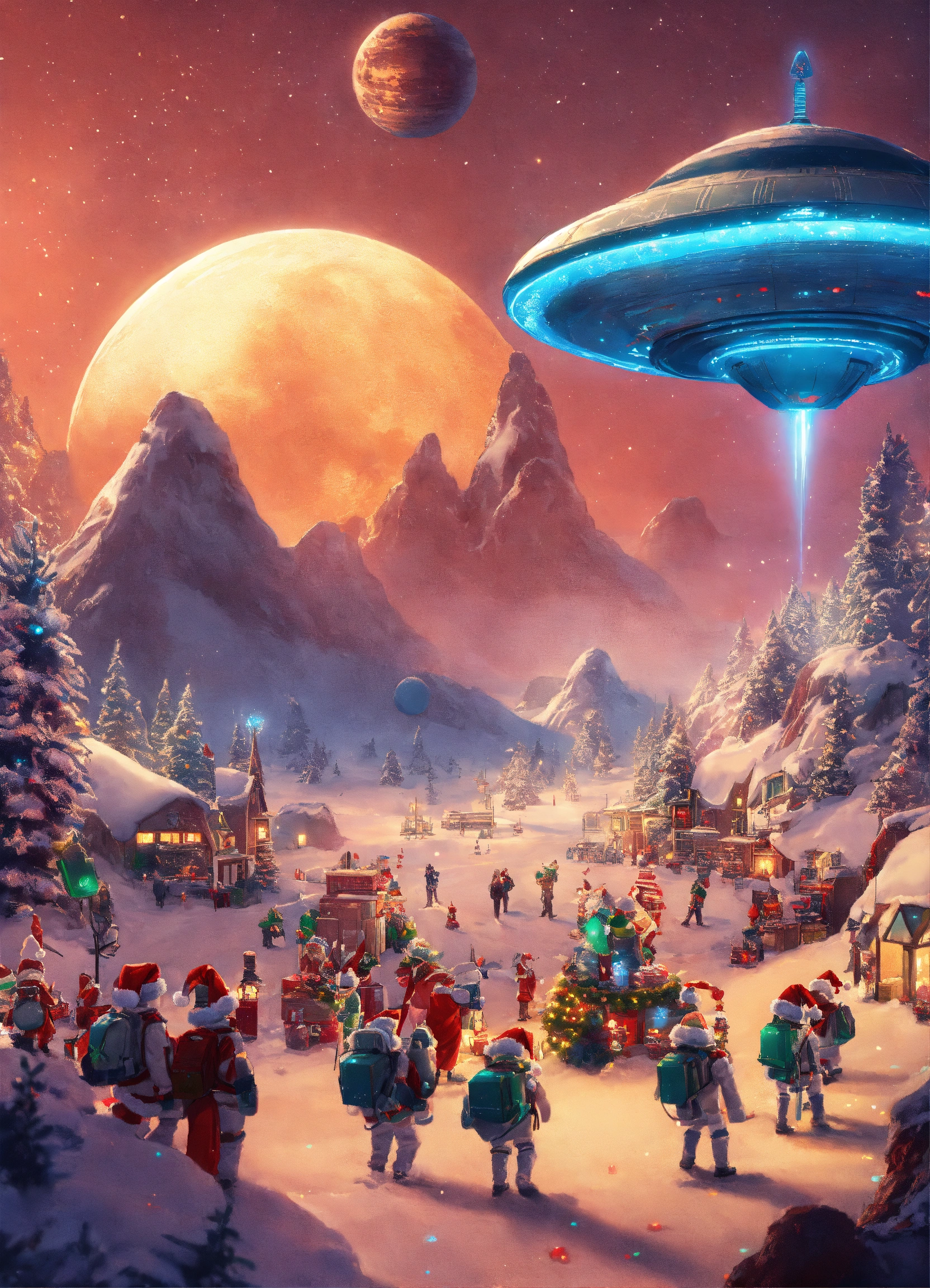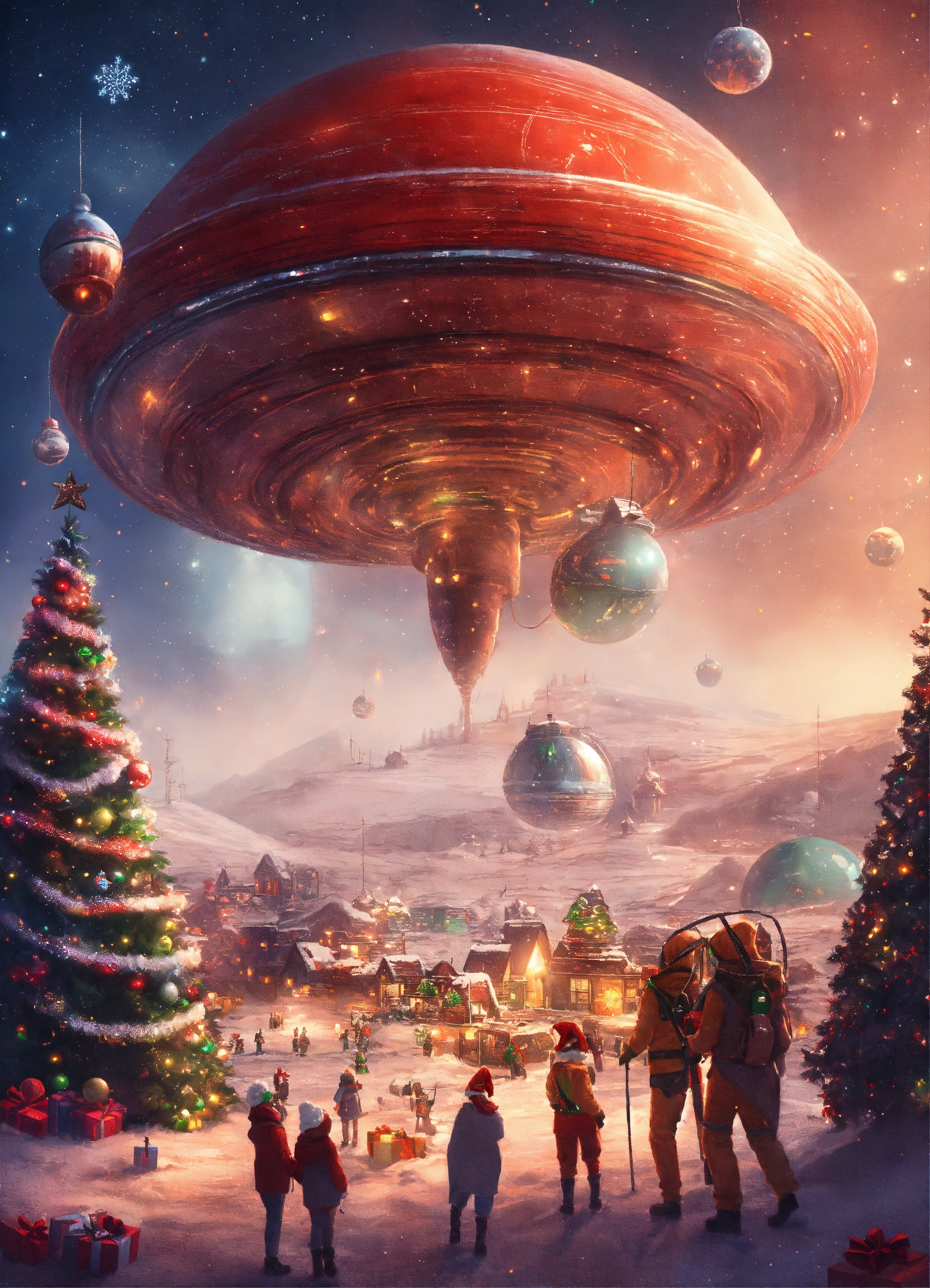 Festive scene on another planet, with aliens celebrating christmas and a spaceship with a giant bow as a gift.