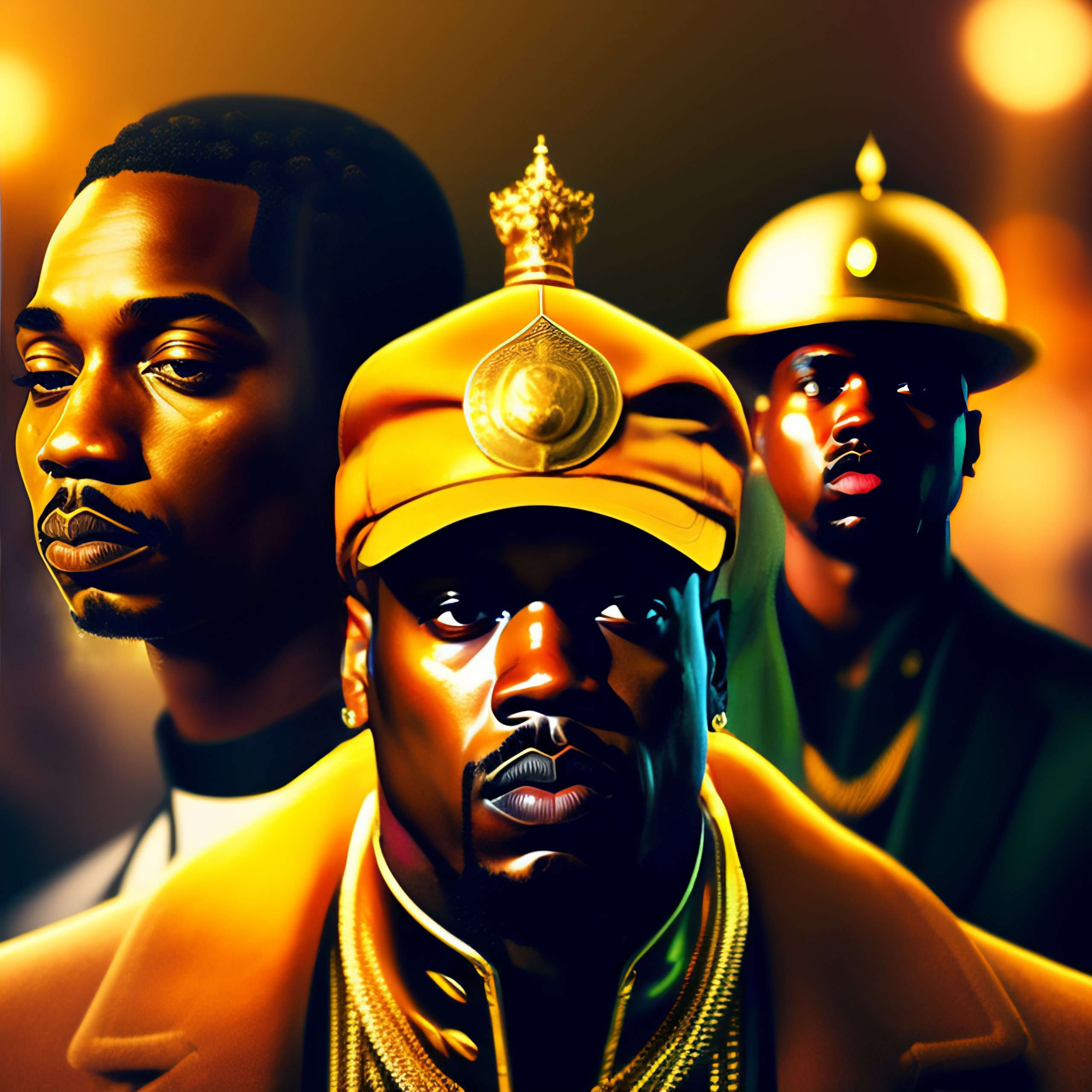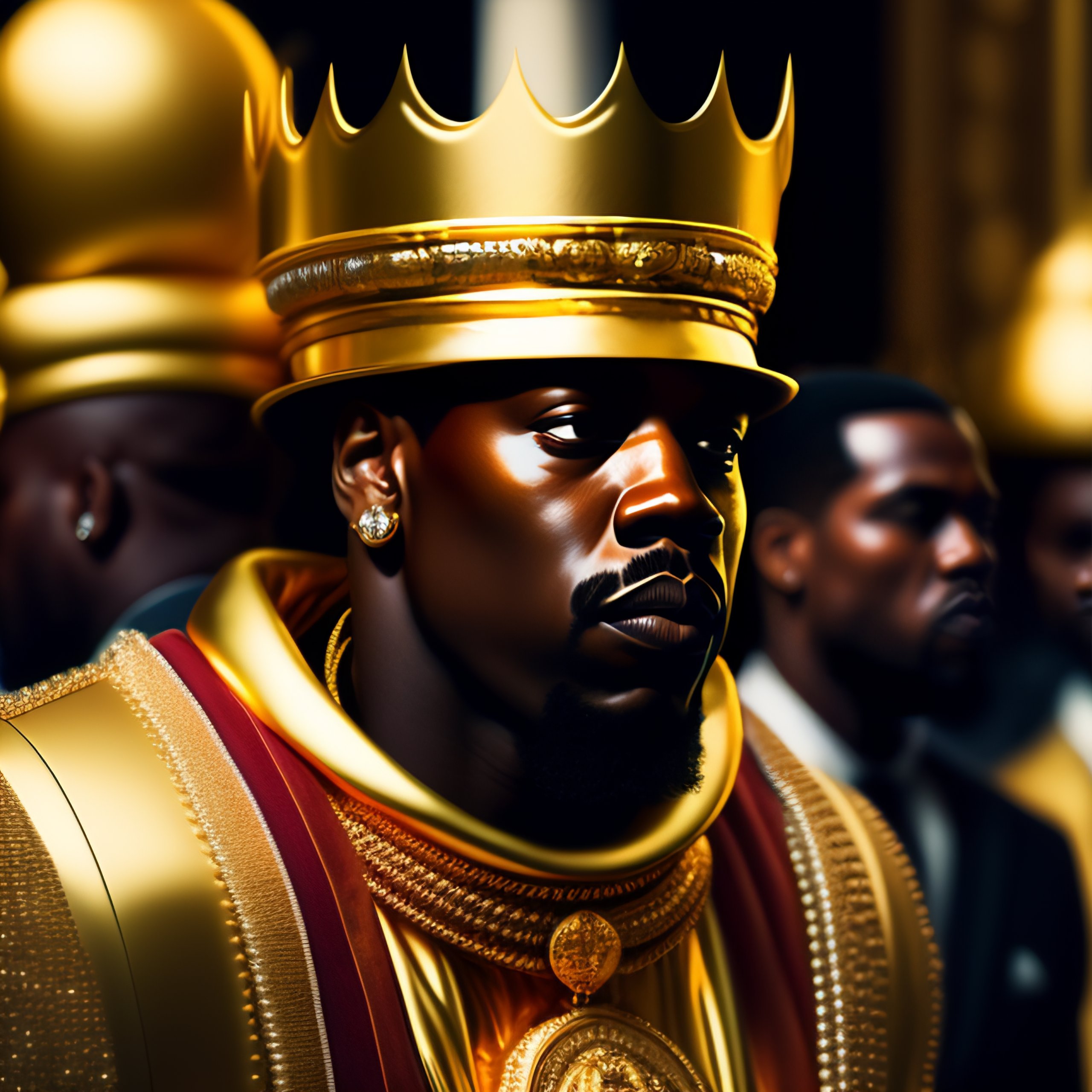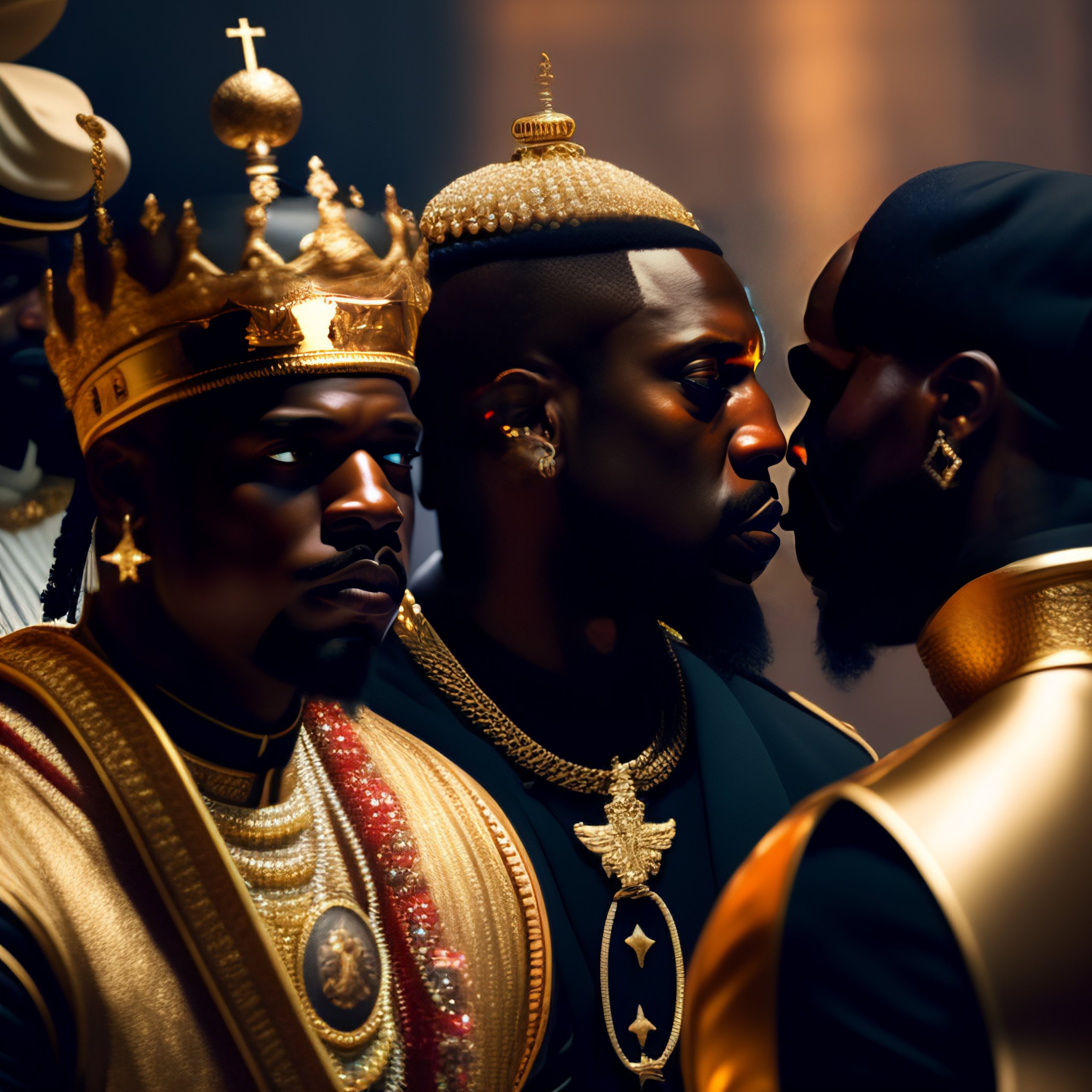 Illustration of the lyrics "human beings in a mob what's a mob to a king? what's a king to a god? what's a god to a non-believer who don't believe in anything?" from no church in the wild by jay-z and kanye west. high resolution, 8k, gold theme, high details