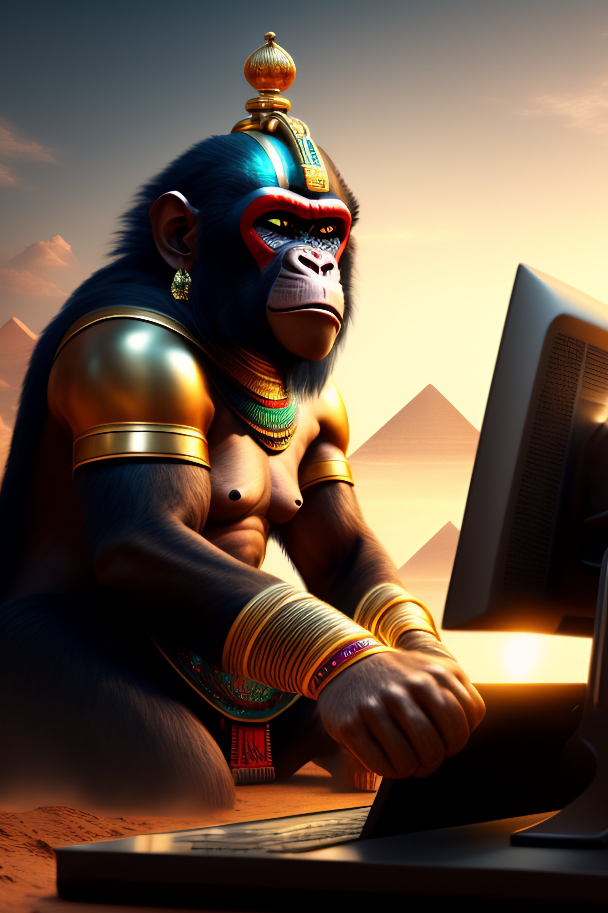 Monkey headed egyptian god getting angry on a computer