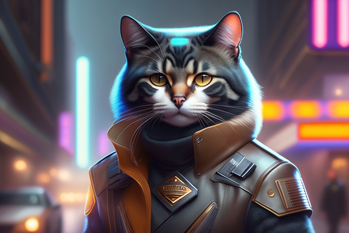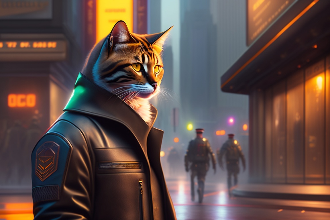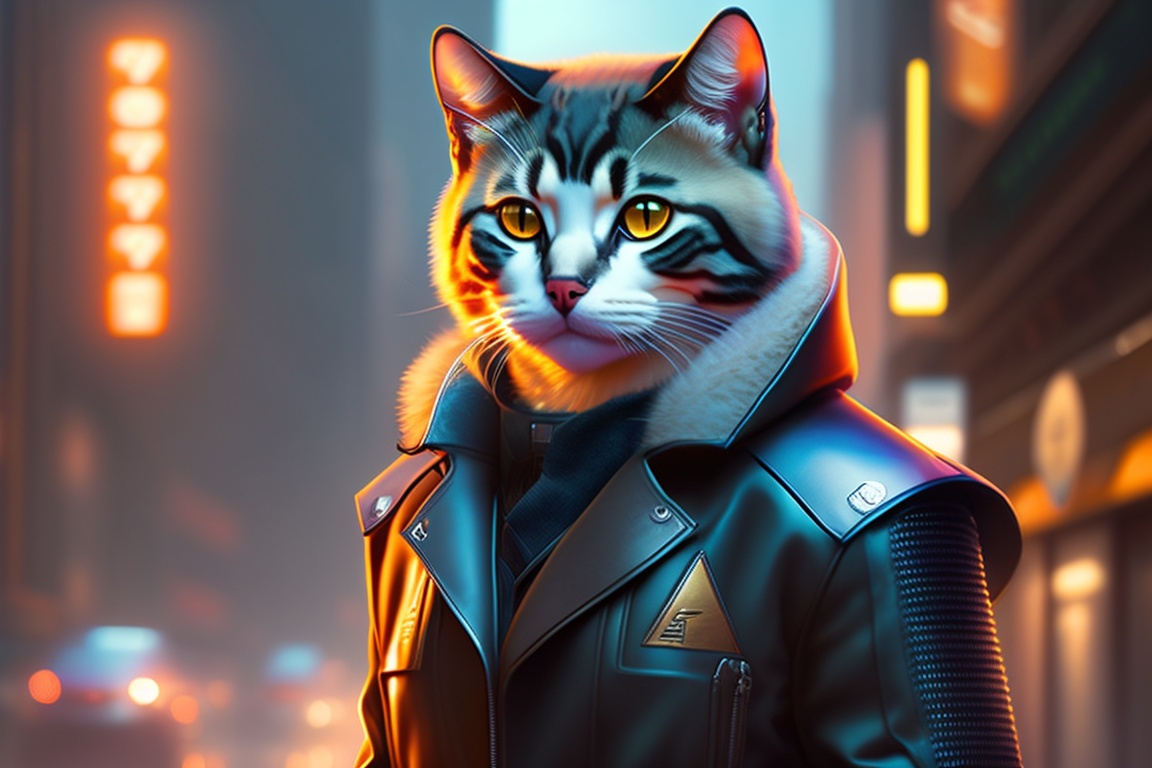 Anthro cat furry in blade runner: 2049, wearing a leather uniform, city streets, fursona, anthropomorphic, furry fandom, film still