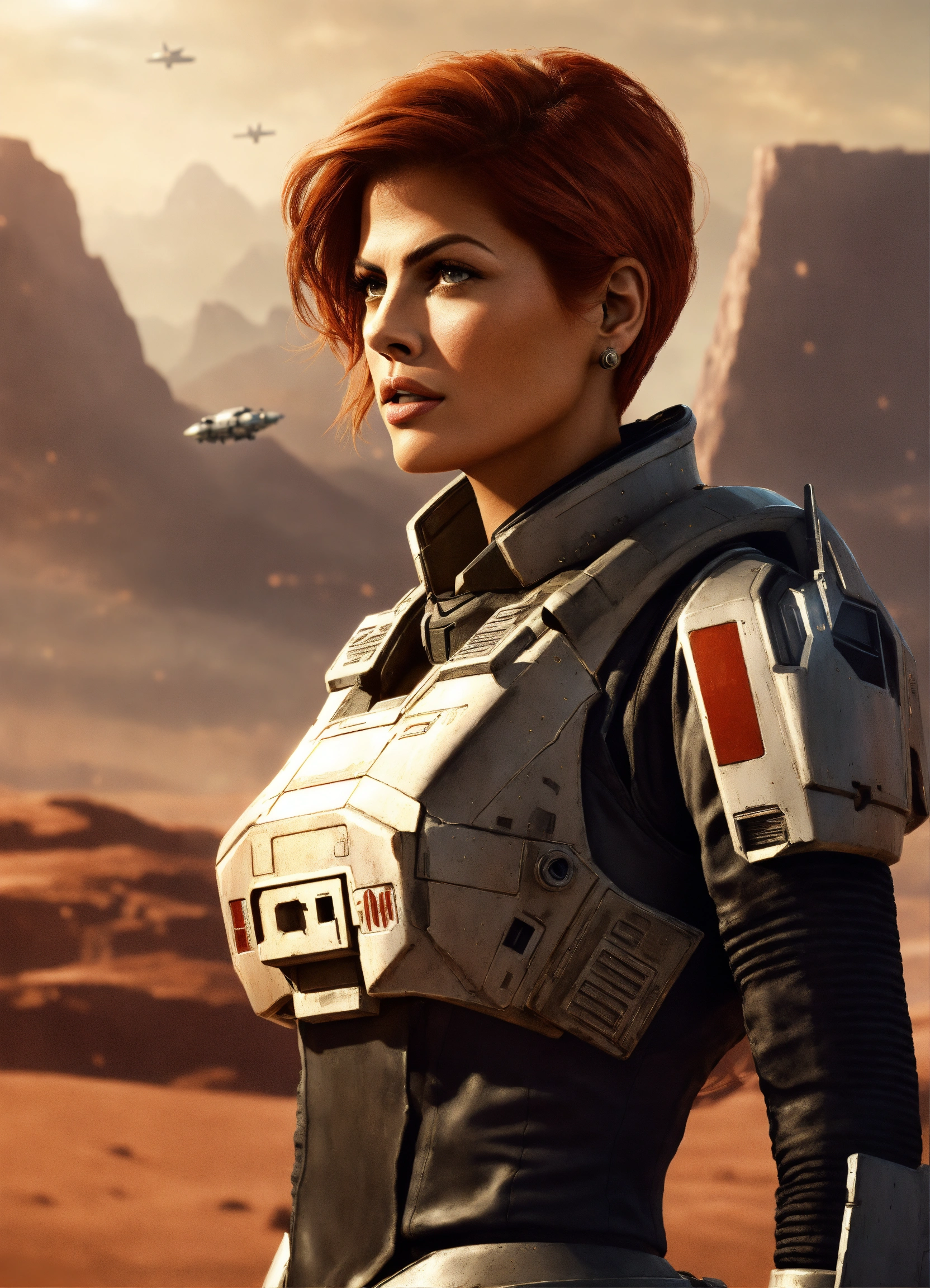 Eva mendes as a defiant hero scifi trooper on an alien planet surface, short red hair, front view, medium shot, star treck command deck background, epic poster art by greg rutkowsky, scifi, fantasy, action, breathtaking, digital painting, highly detailed, pinterest, artstation, eve online, starfield.