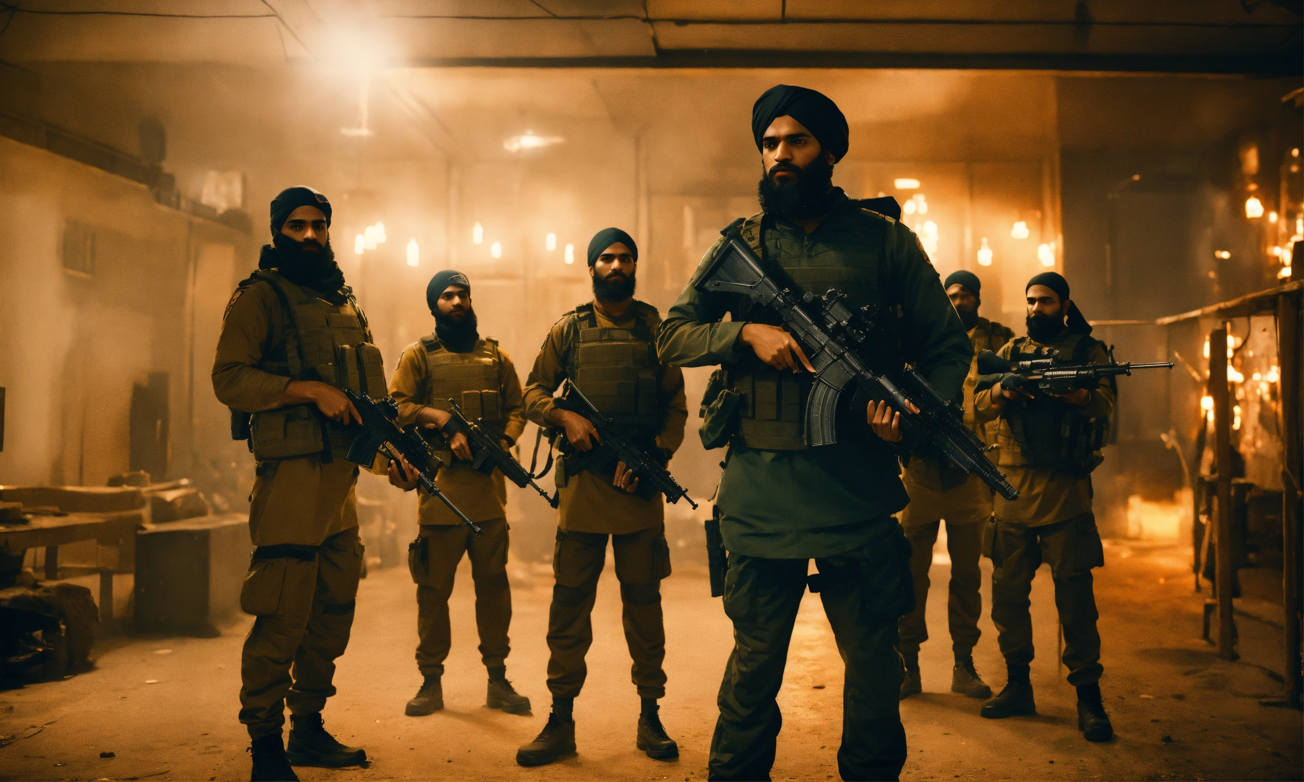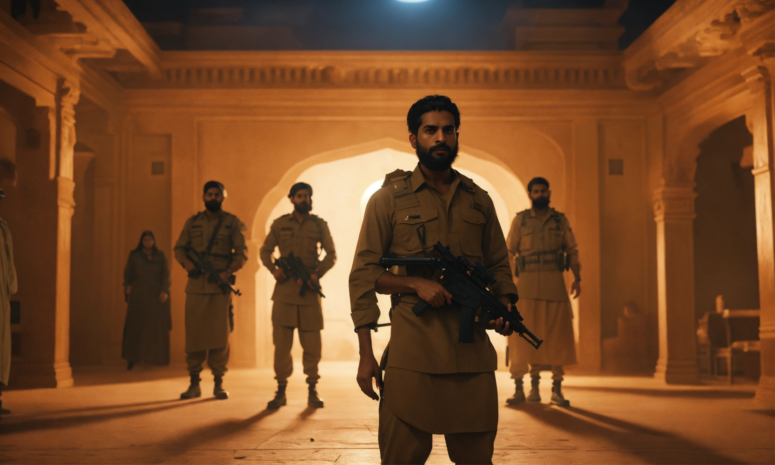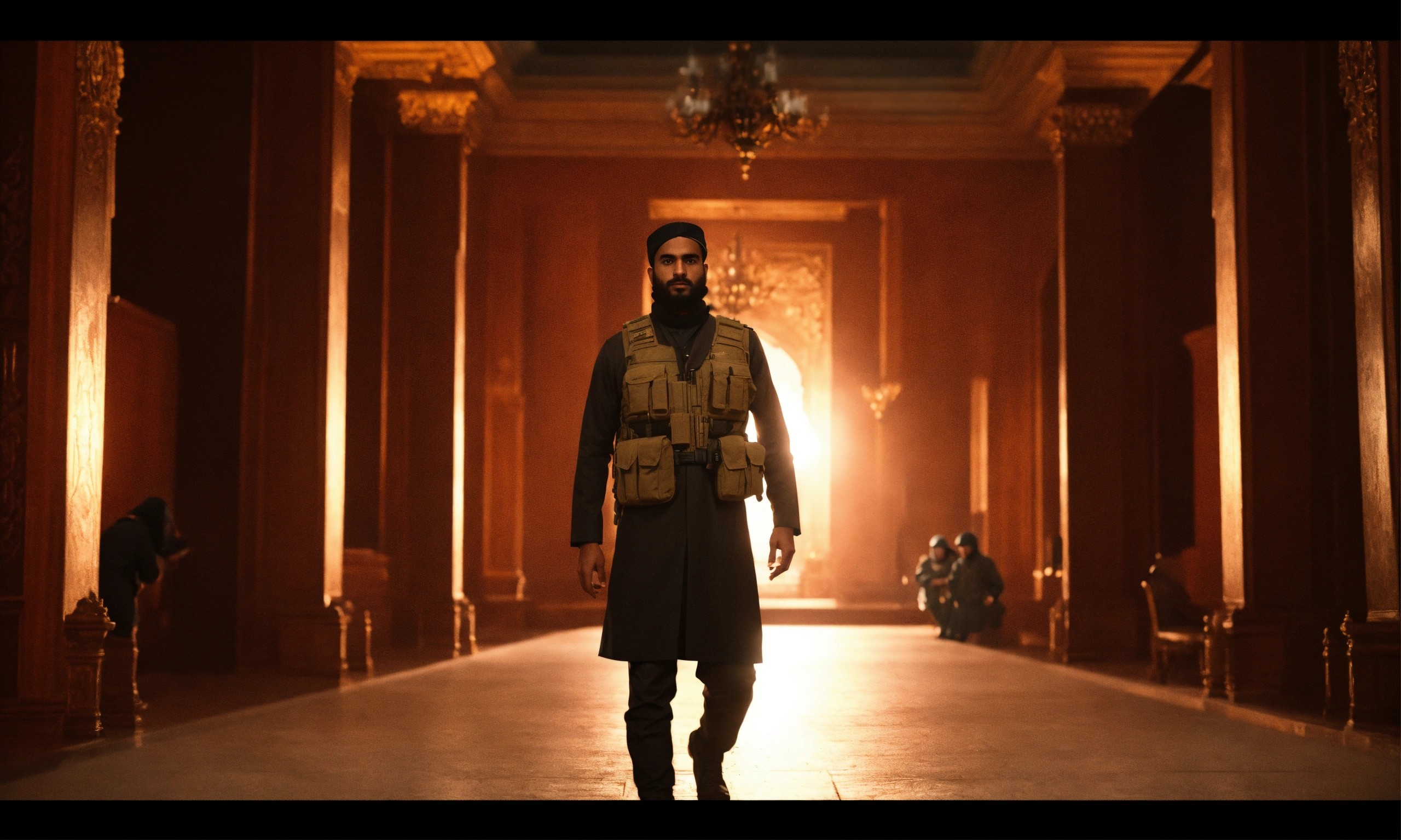 10 pathani male terrorists standing in front a 10 ladies, wide front shot, interior night time, 8k, luxcorerender, earthly colour, cinematic photography, real humans, real images, matte finish, shot on arri anamorphic, extreme wide shot, smooth, sharp focus, ornate, highly dynamic, particulate, hyperreal, wide shot.
