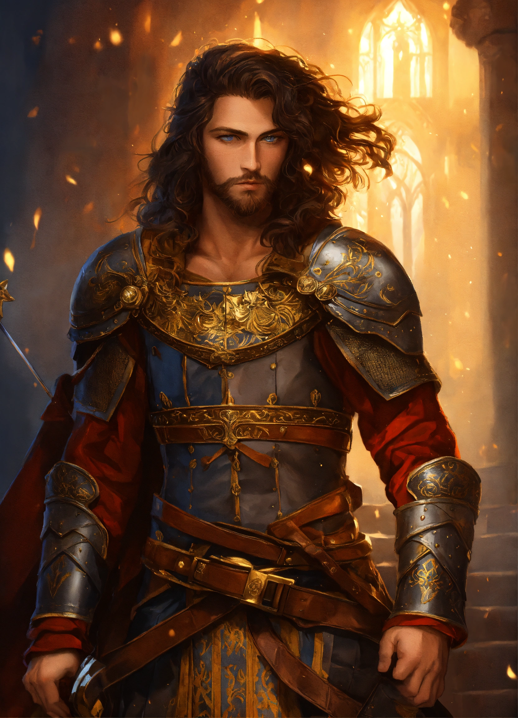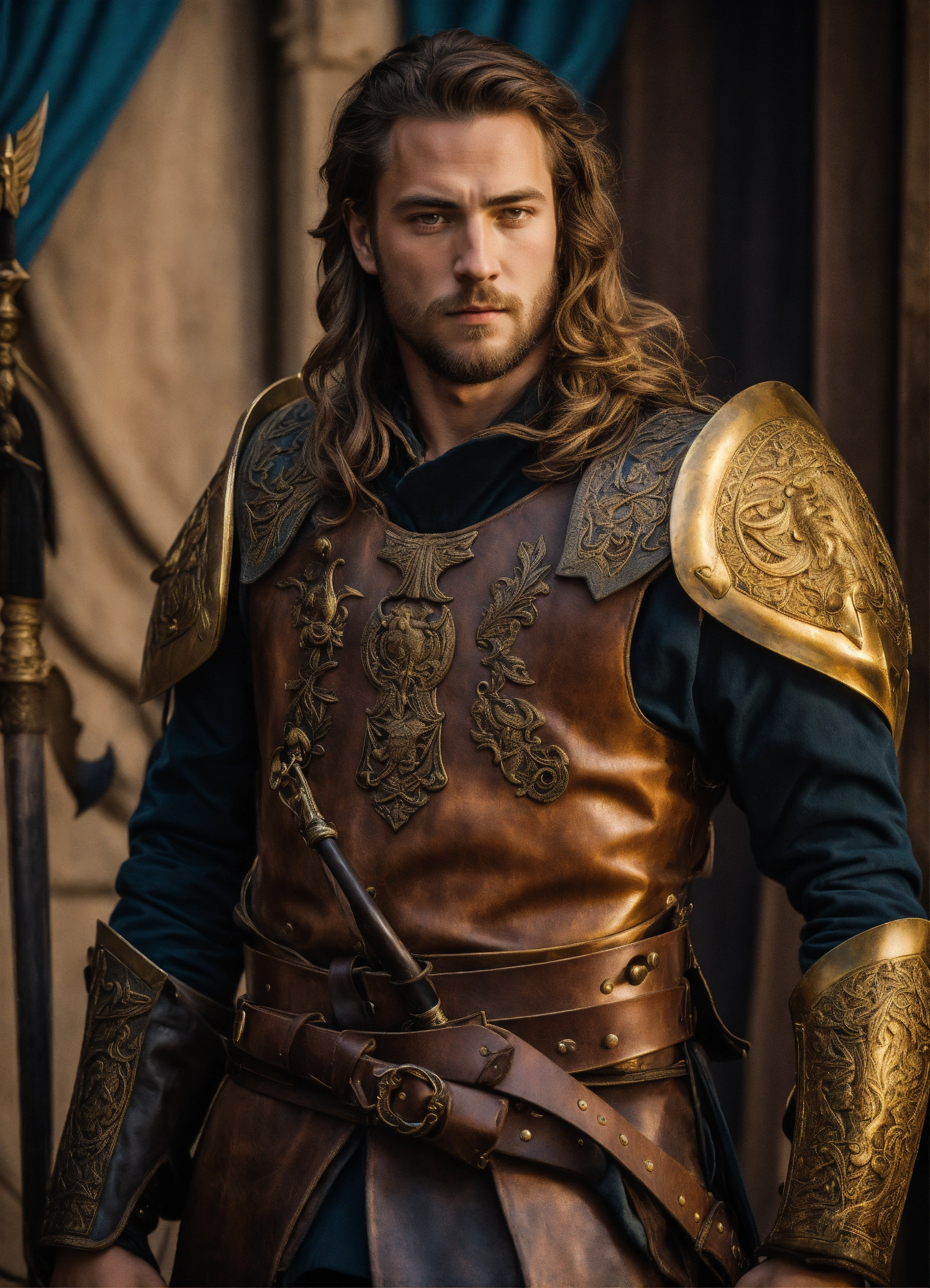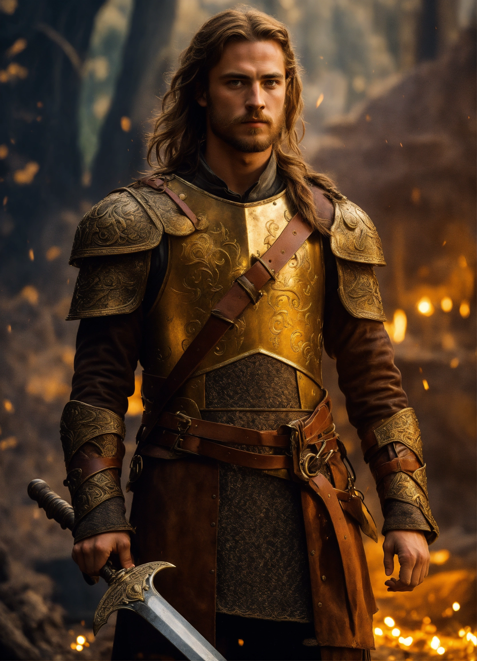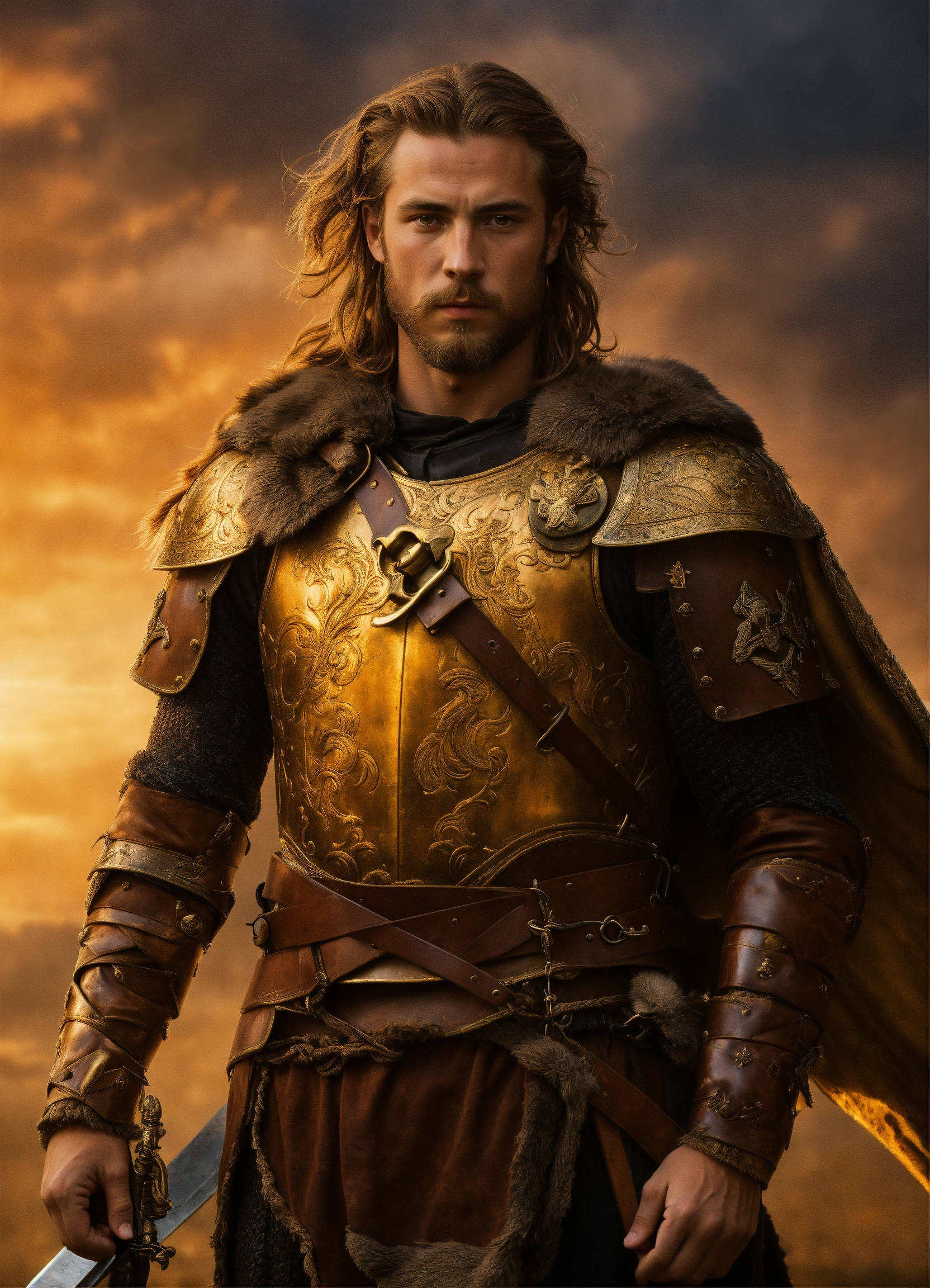 Chevalier du roi arthur et guerrière elle aux cheveux brun doré et aux yeux dorés porte un corset de cuir marron et une jupe, viking et valkyrie beau guerrier cheveux noirs.