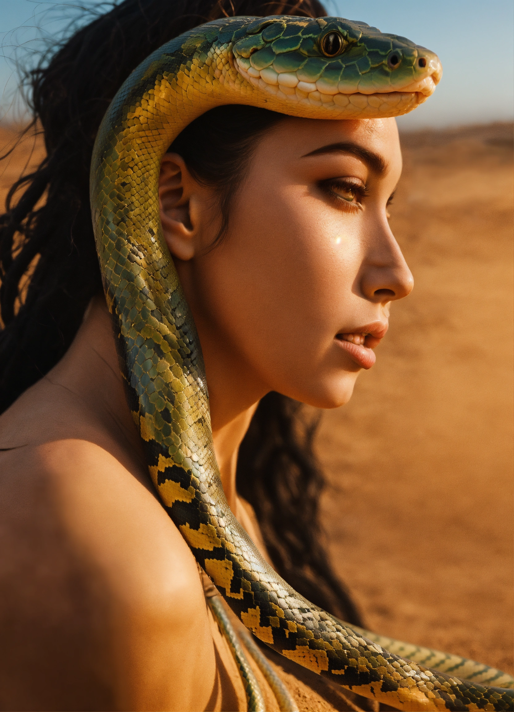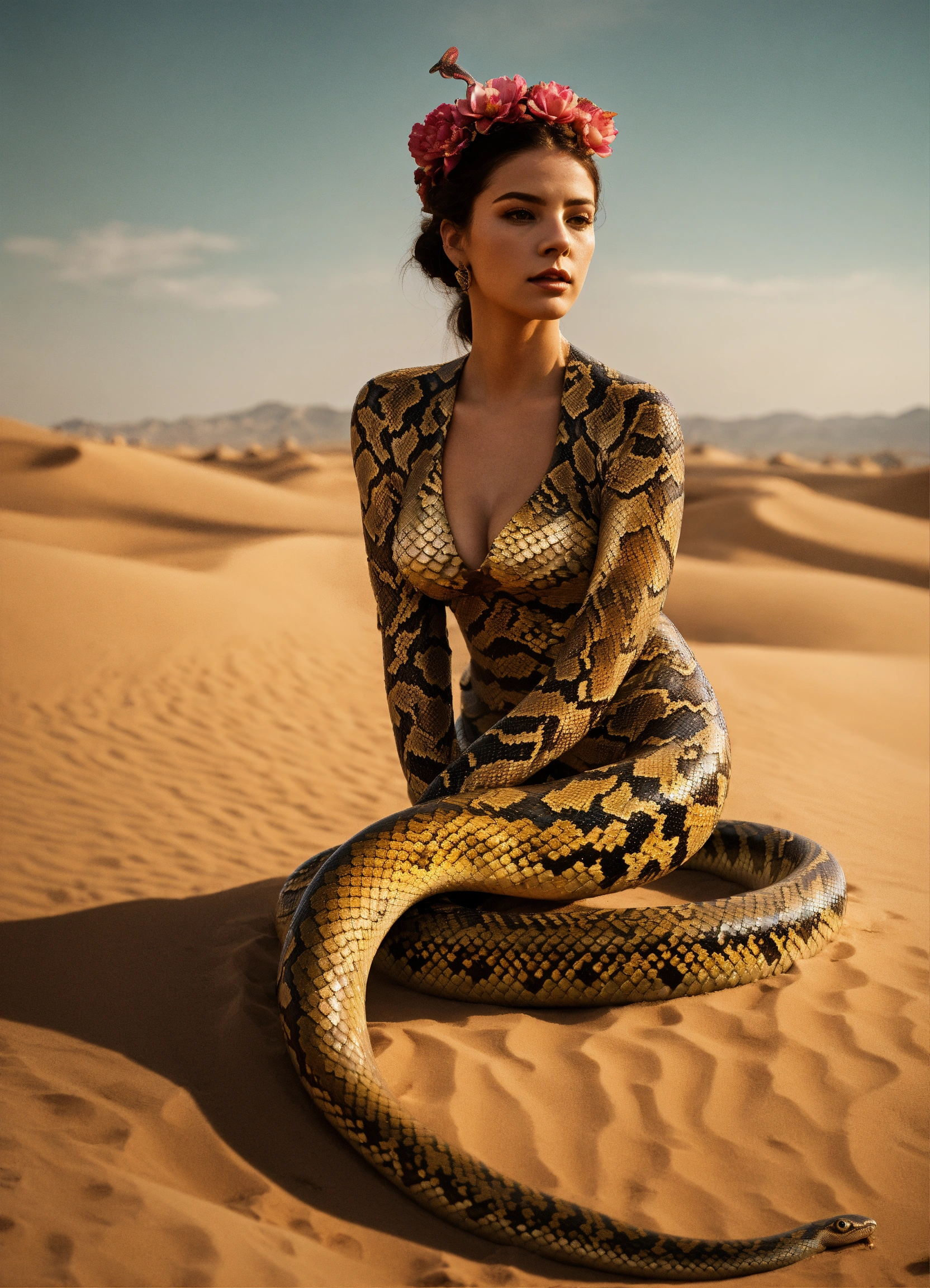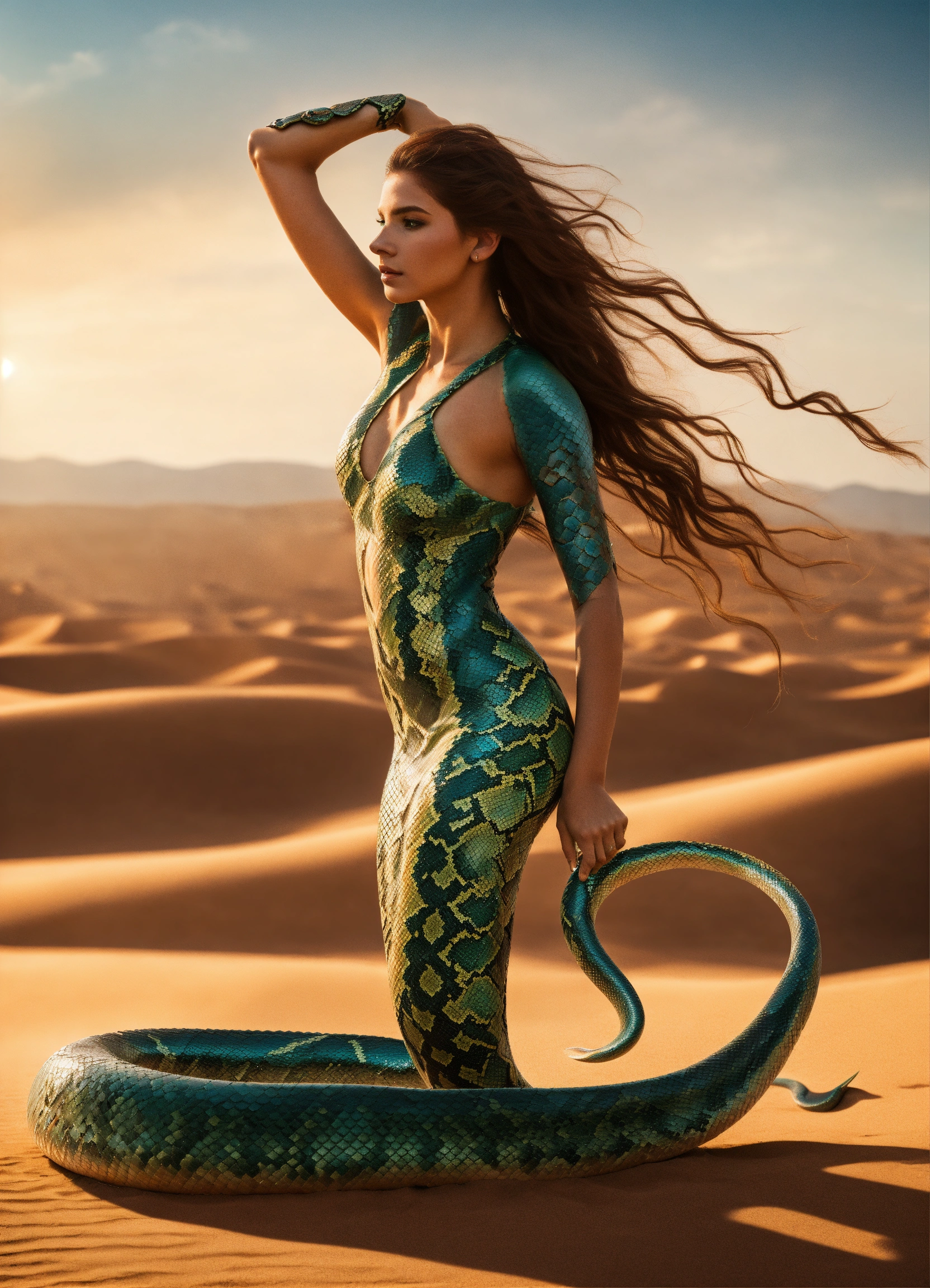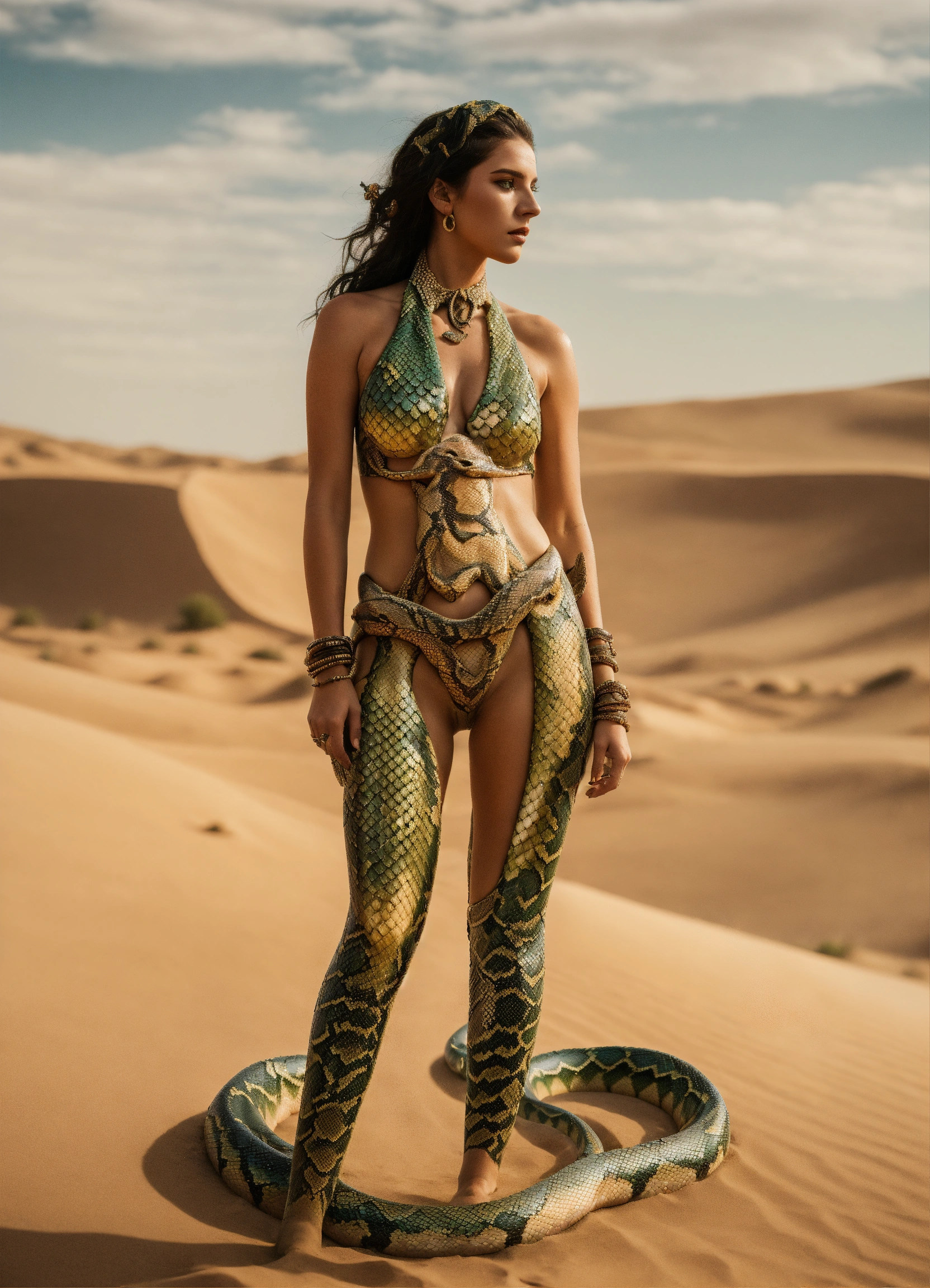 Detailed 4k photo full body portrait of a snakemaid slithering through the desert a snakemaid is like a mermaid, but instead of half fish, she is half snake.