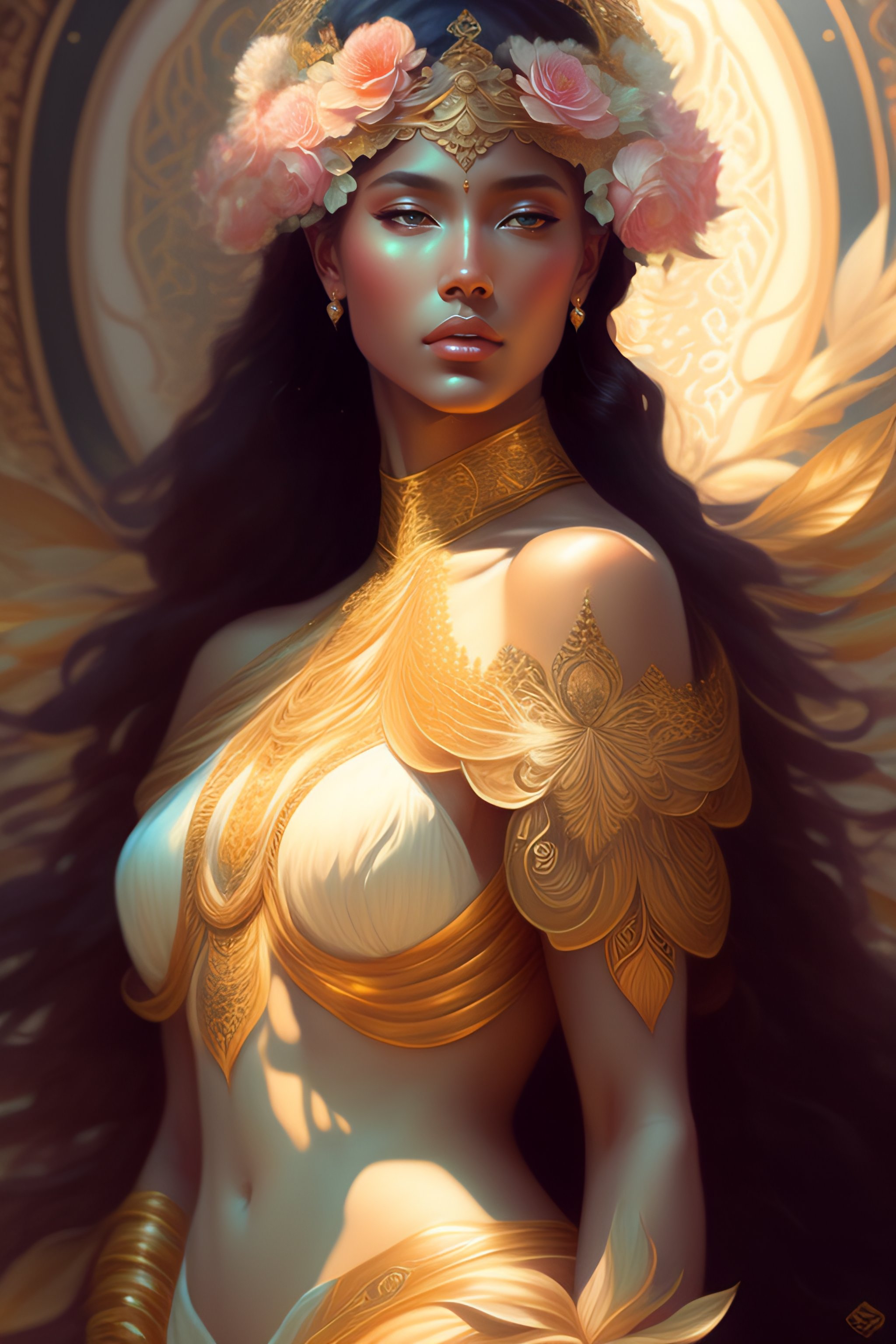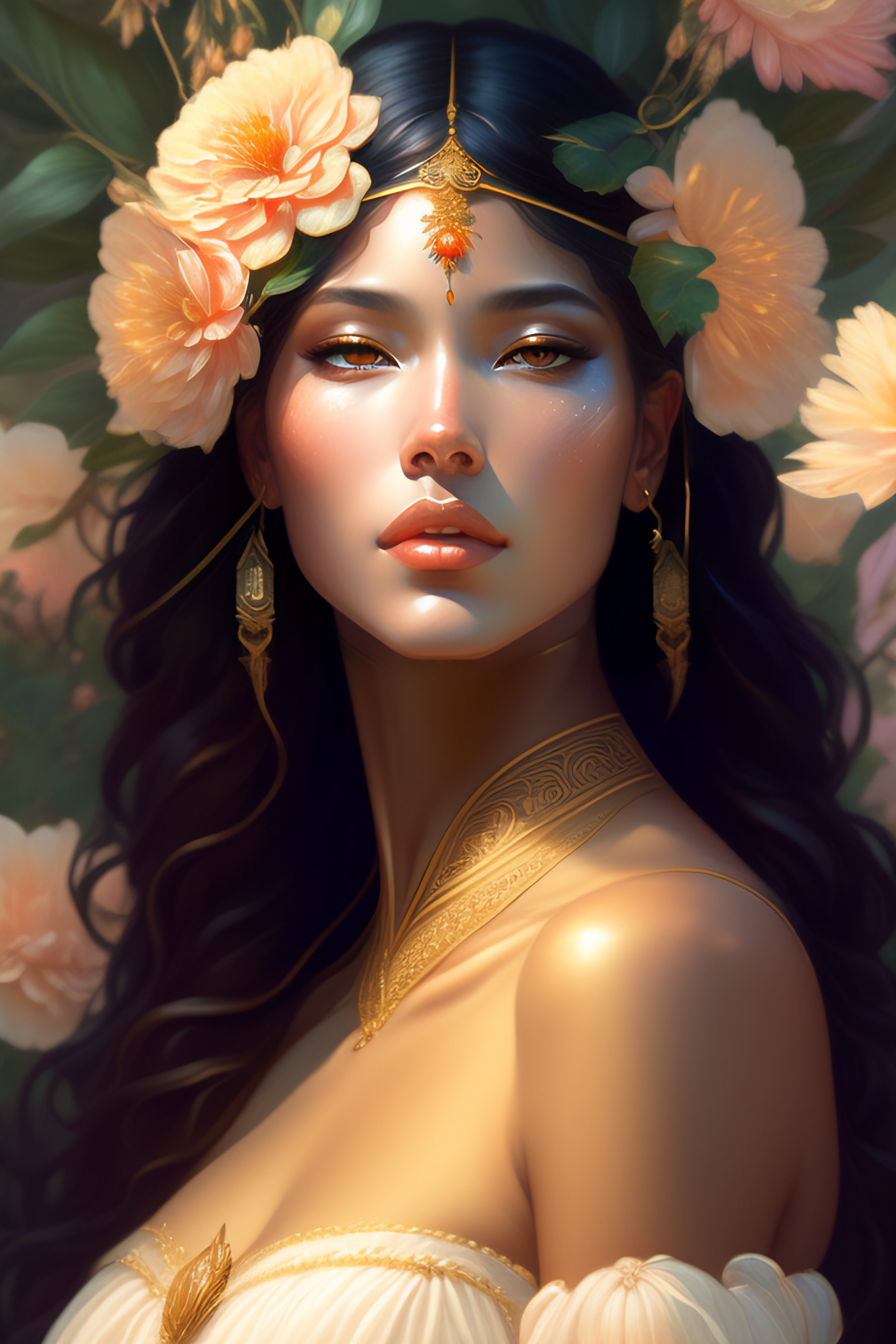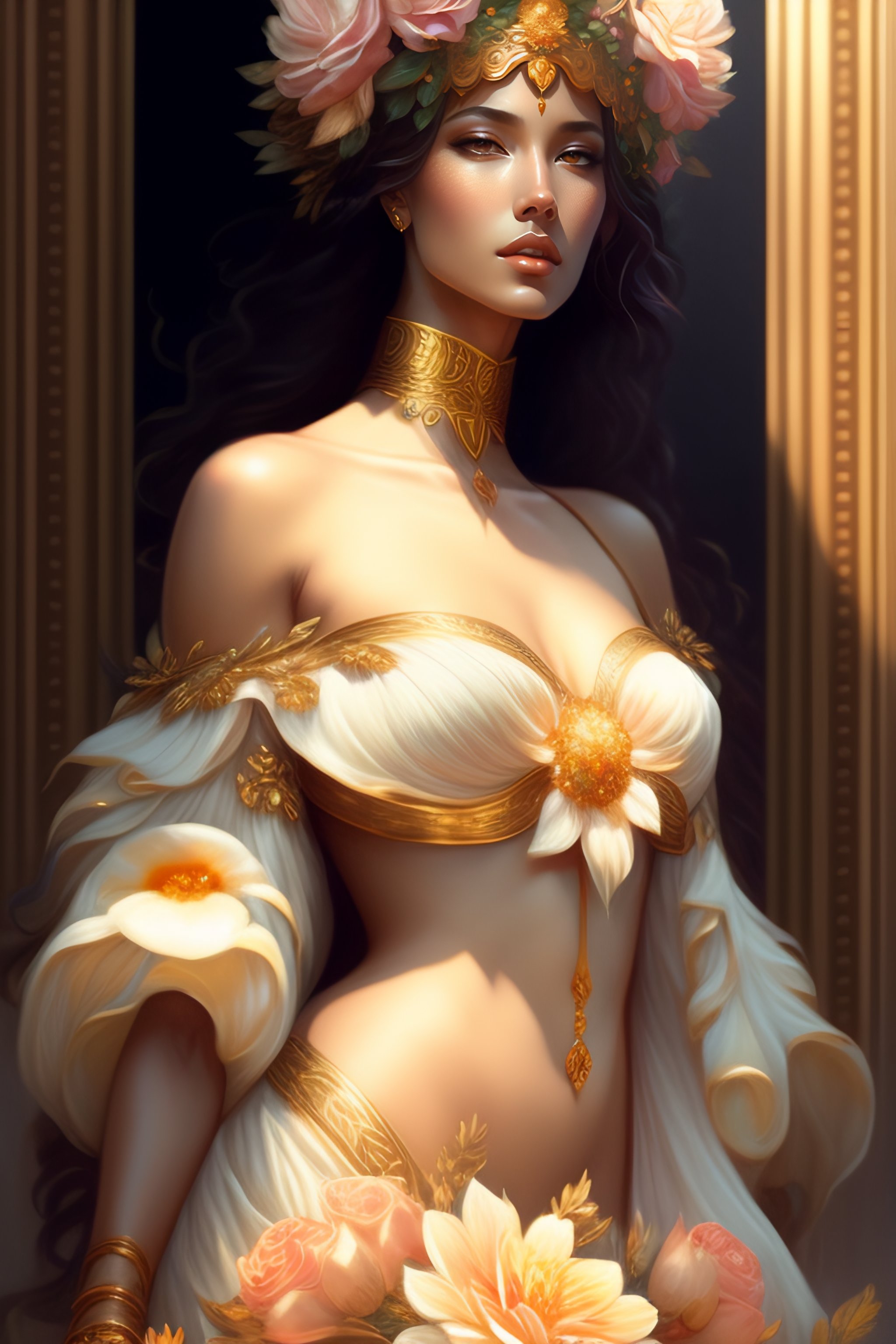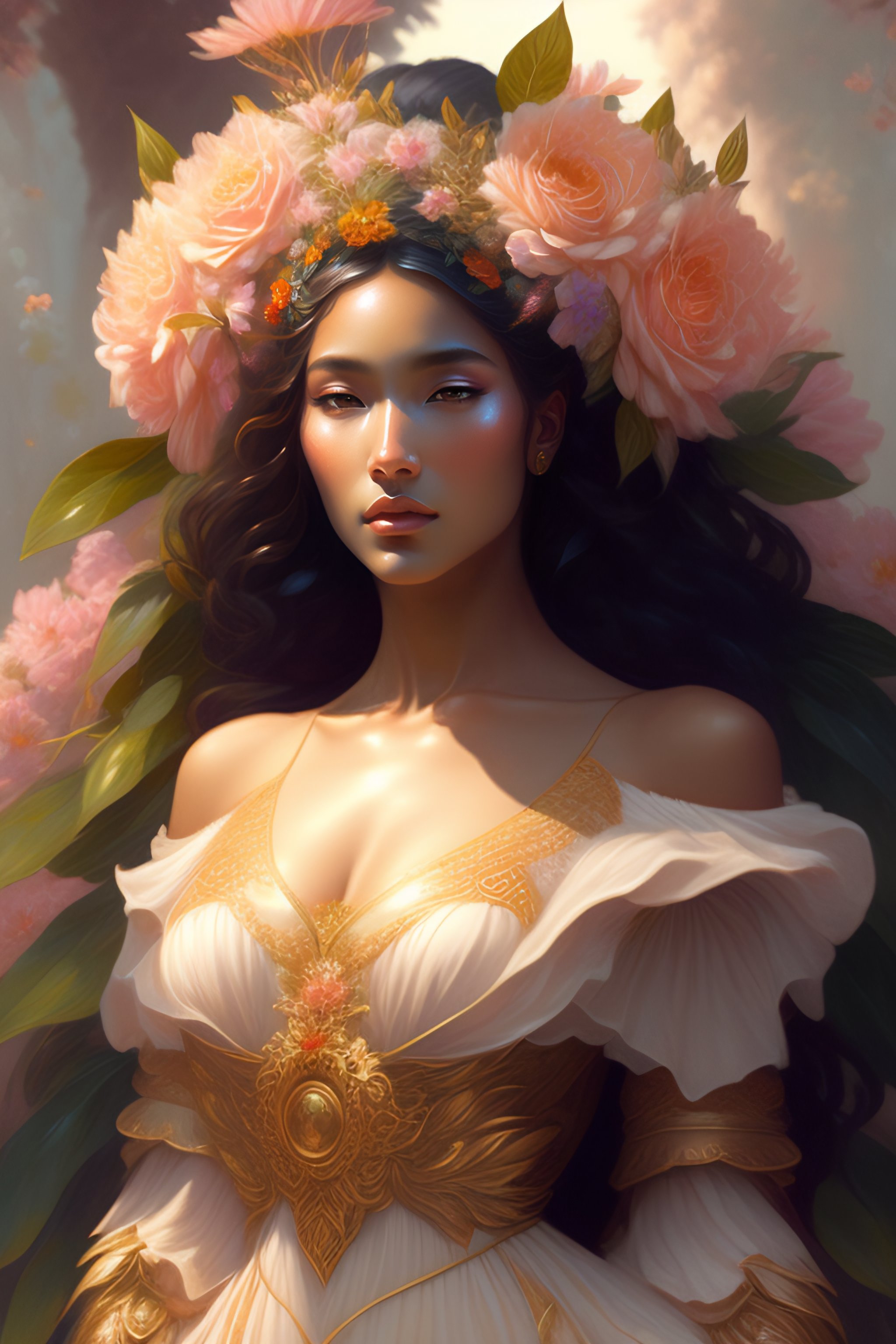Flower goddess, full body, intricate, elegant, highly detailed, digital painting, artstation, concept art, smooth, sharp focus, illustration, art by artgerm and greg rutkowski and alphonse mucha and william - adolphe bouguereau and stephanie law