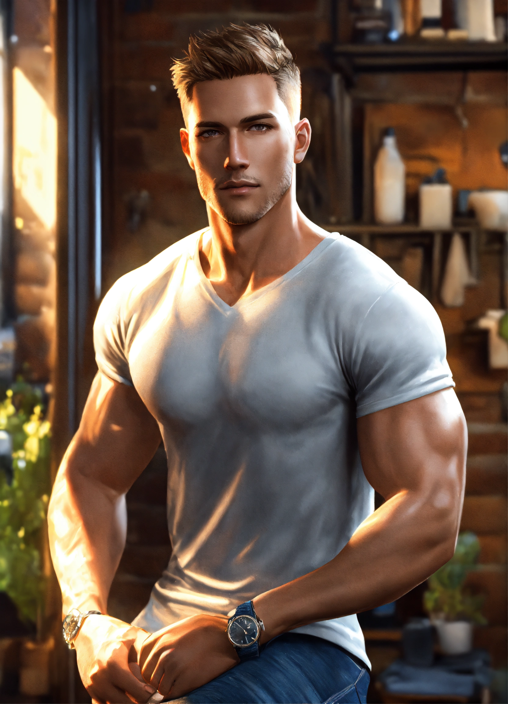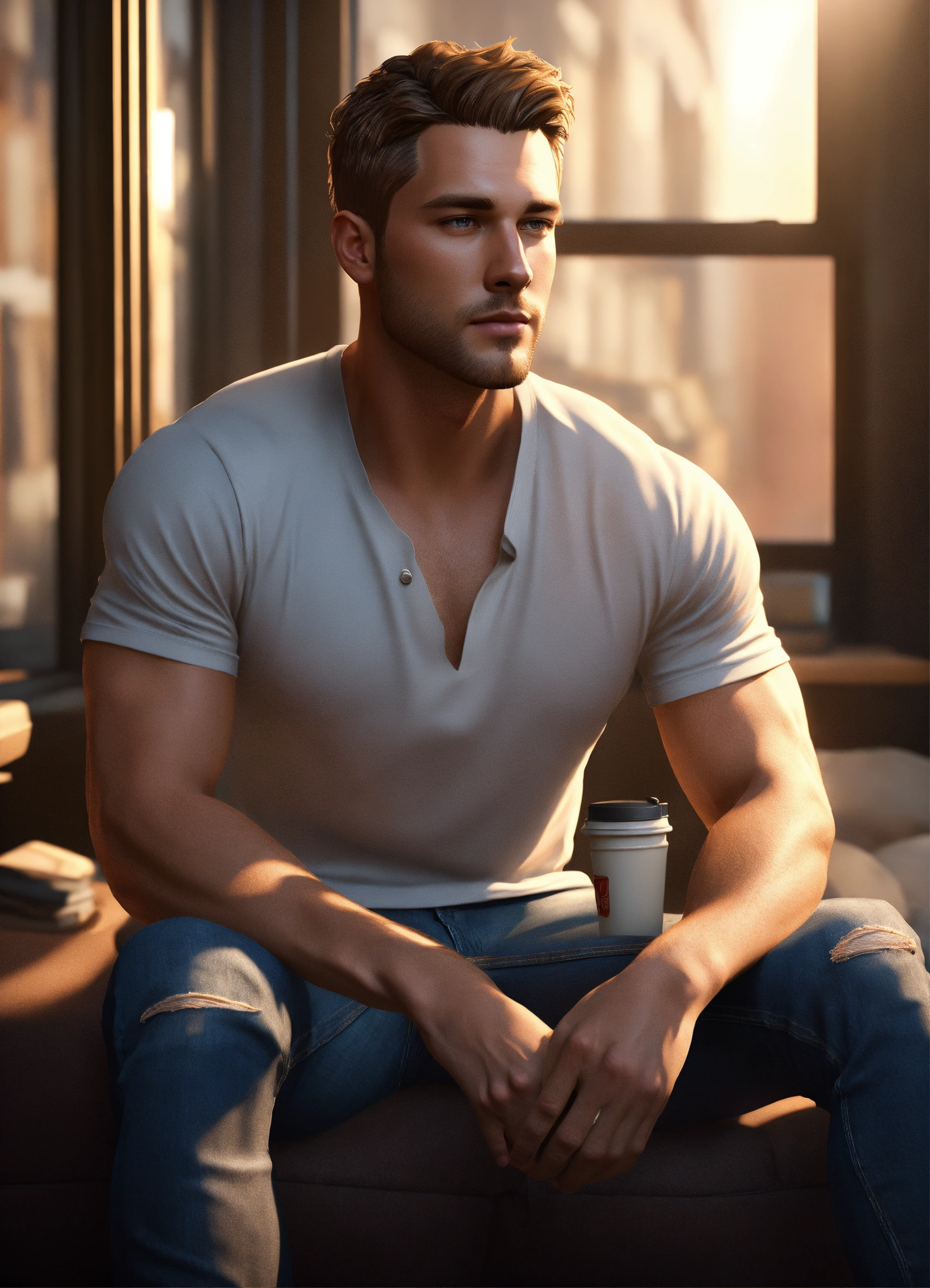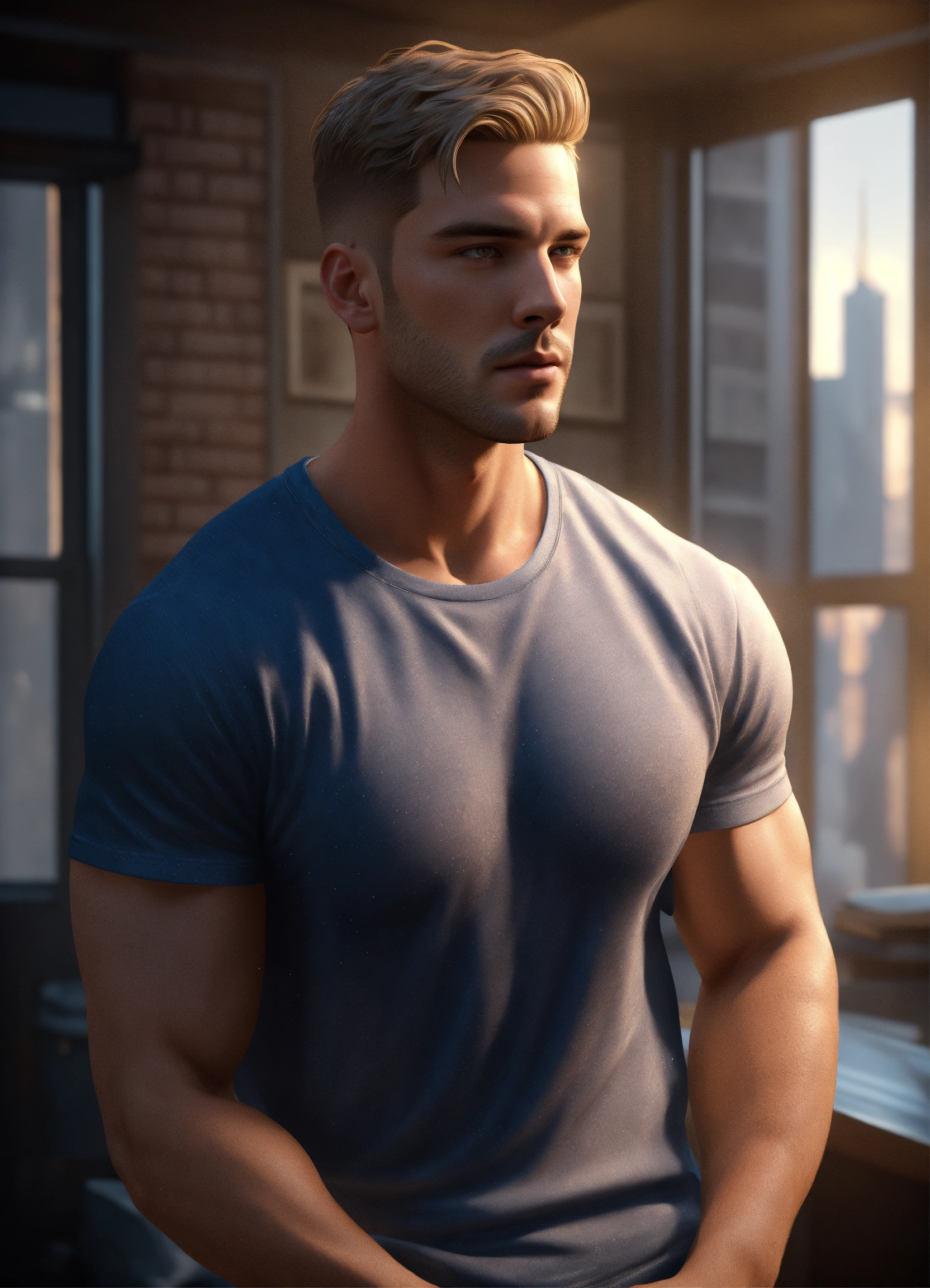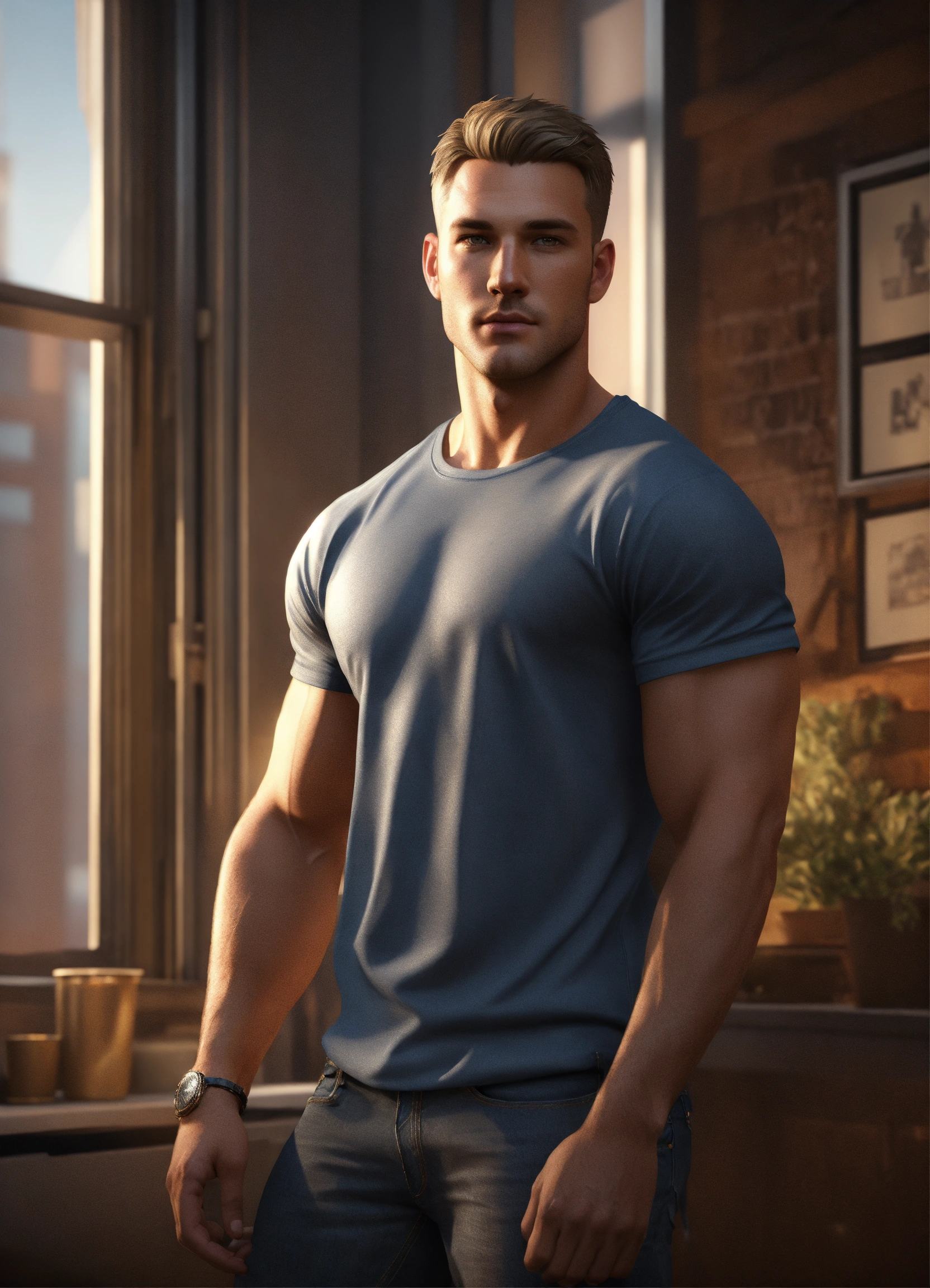 Full body of a handsome, athletic white male, with short hair, perfect face clean shaven, a very handsome athletic man, a hero wearing a t-shirt and jeans, inside a new york city apartment, full body, 8k resolution concept art portrait dynamic lighting hyperdetailed intricately detailed splash art trending on artstation unreal engine 5 volumetric lighting