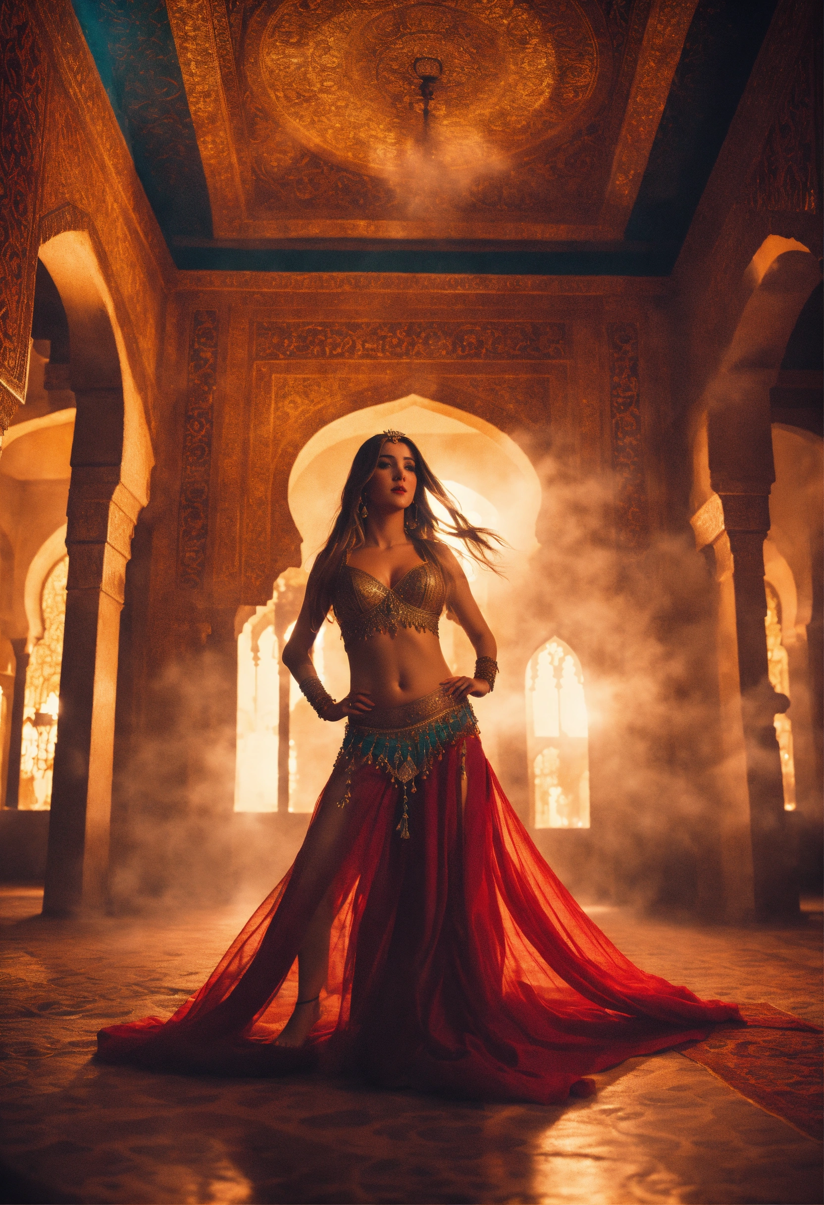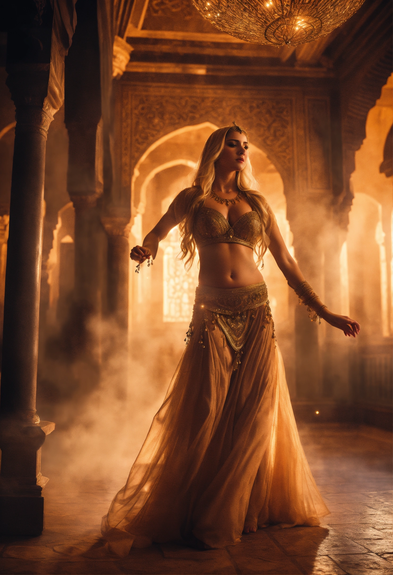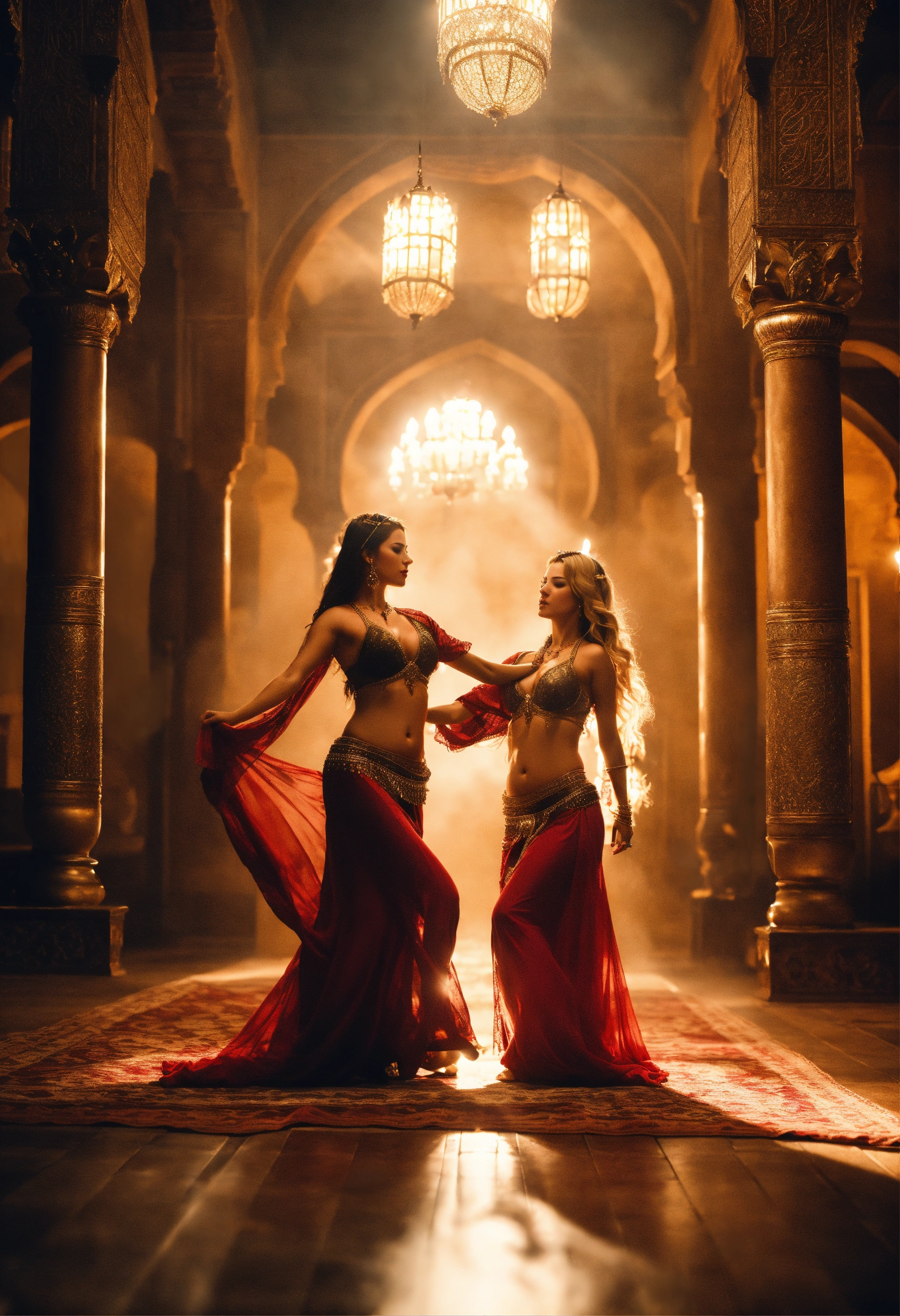 An epic fantasy scene full of motion featuring a gorgeous beautiful blonde and brunette female twins as attractive belly dancers dancing with motion and passion in medieval morroco palace. ghost light and misty atmosphere. cinematic view, sharp detail.