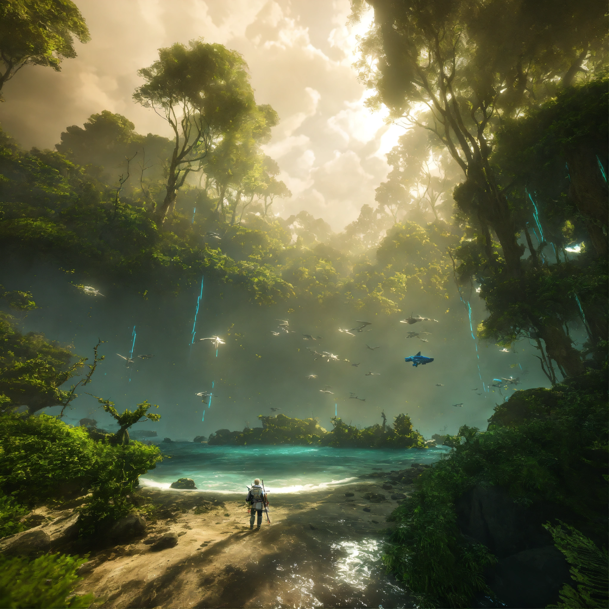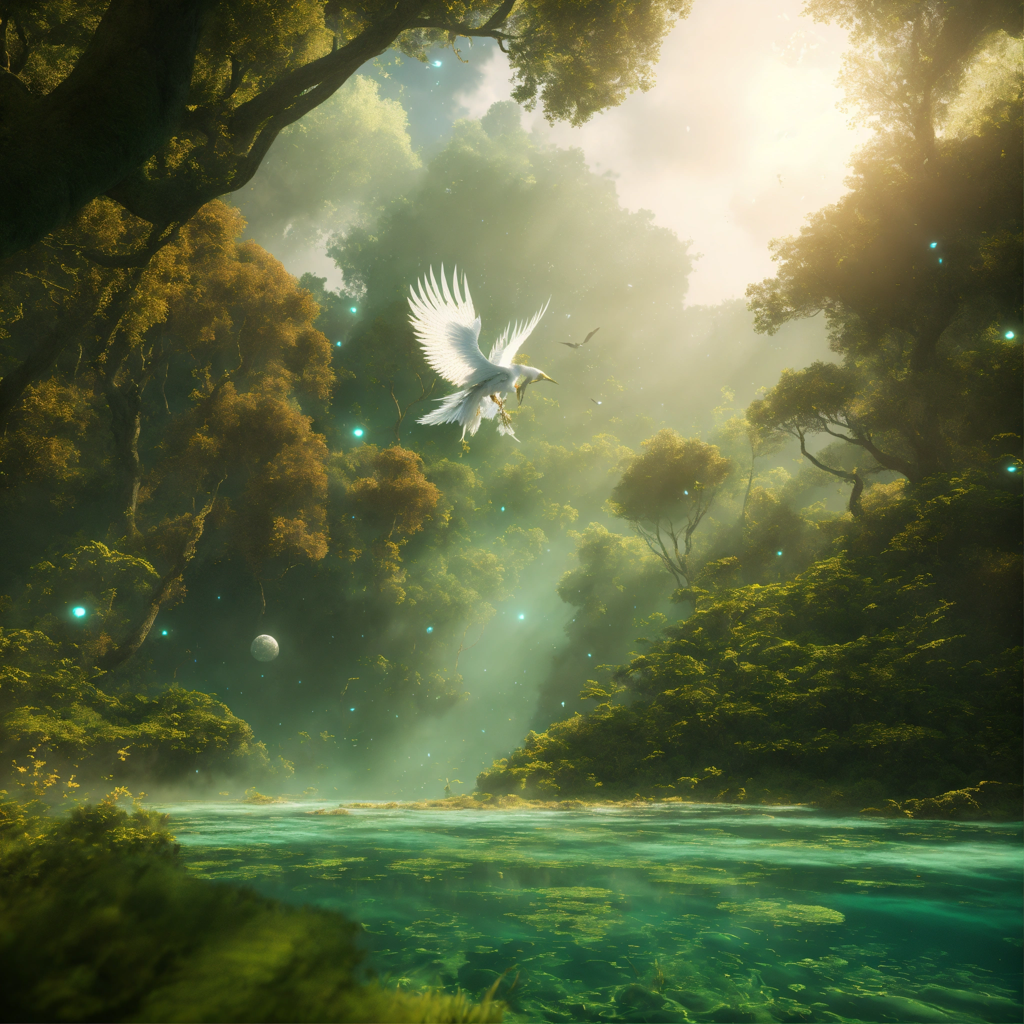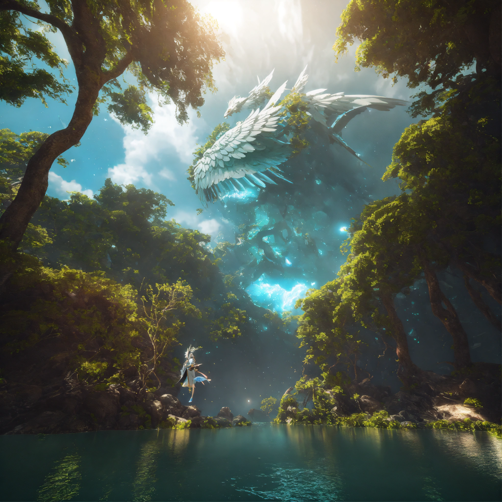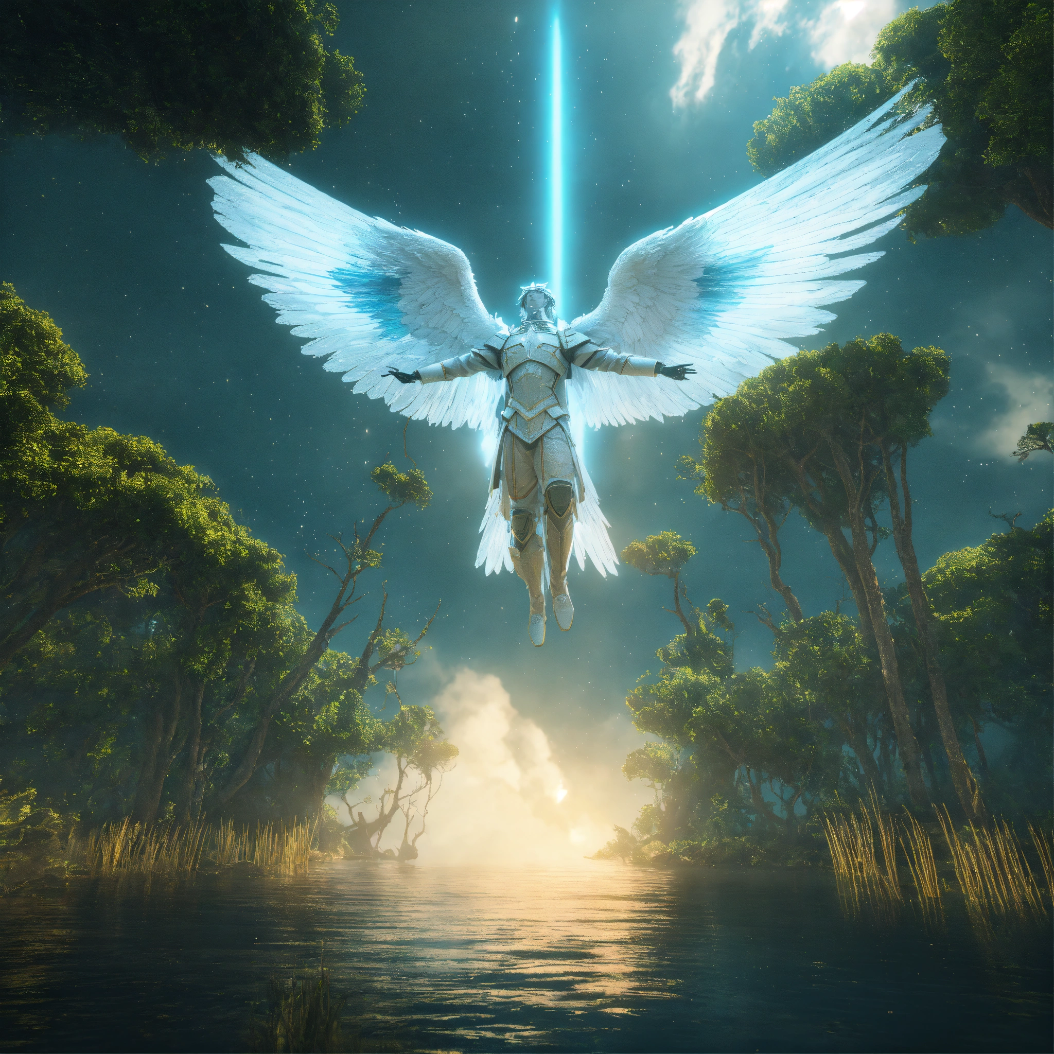 White archangel michael war, reptile in the forest, being reincarnated into a ocean world, sky nebula, artstation scifi 3d scene of a showing forest, maximalism, ambient occlusion, atmospheric haze, unreal engine, hyper realism, realistic shading, cinematic composition, realistic render, octane render, detailed textures, photorealistic, wide shot