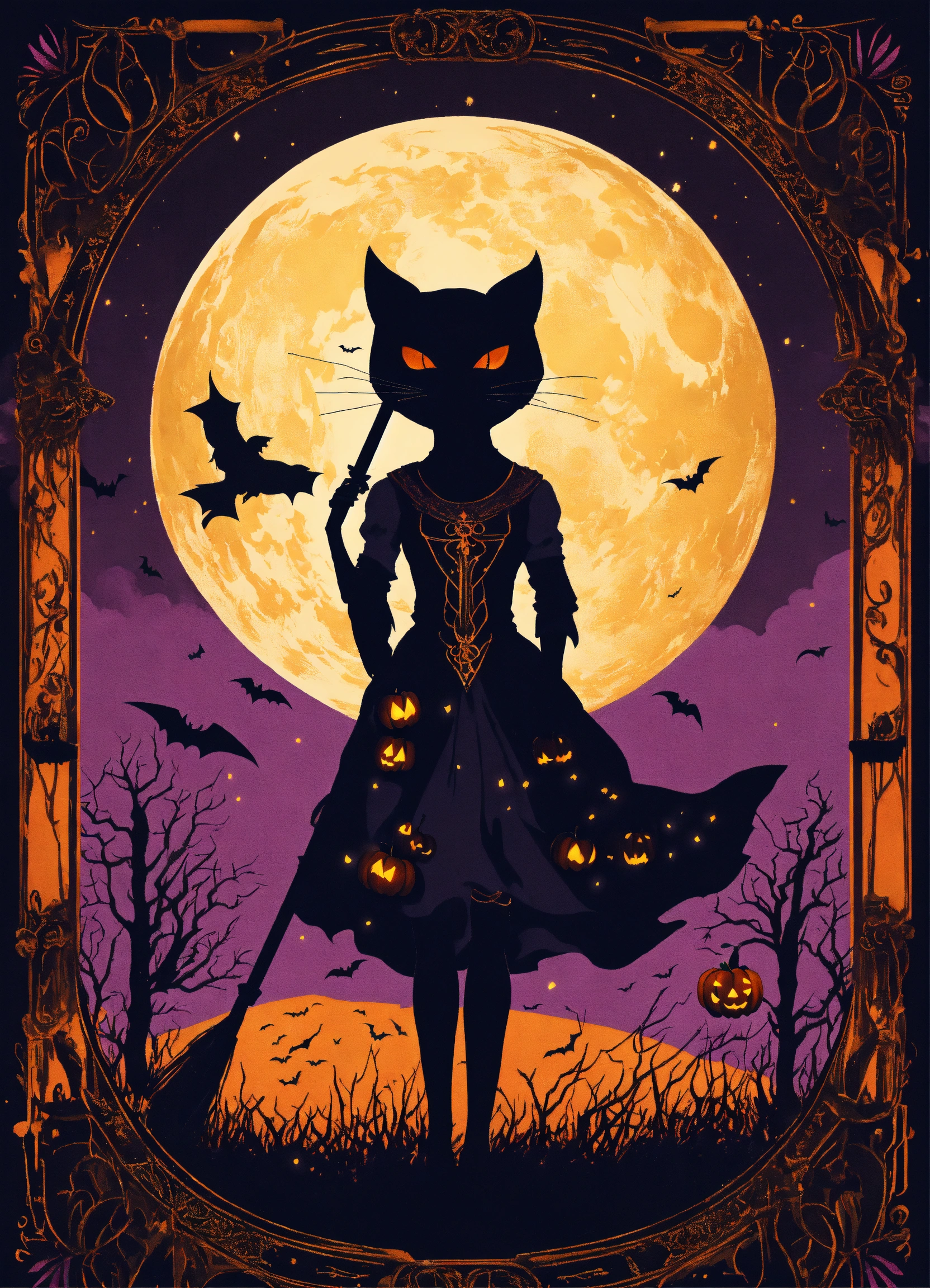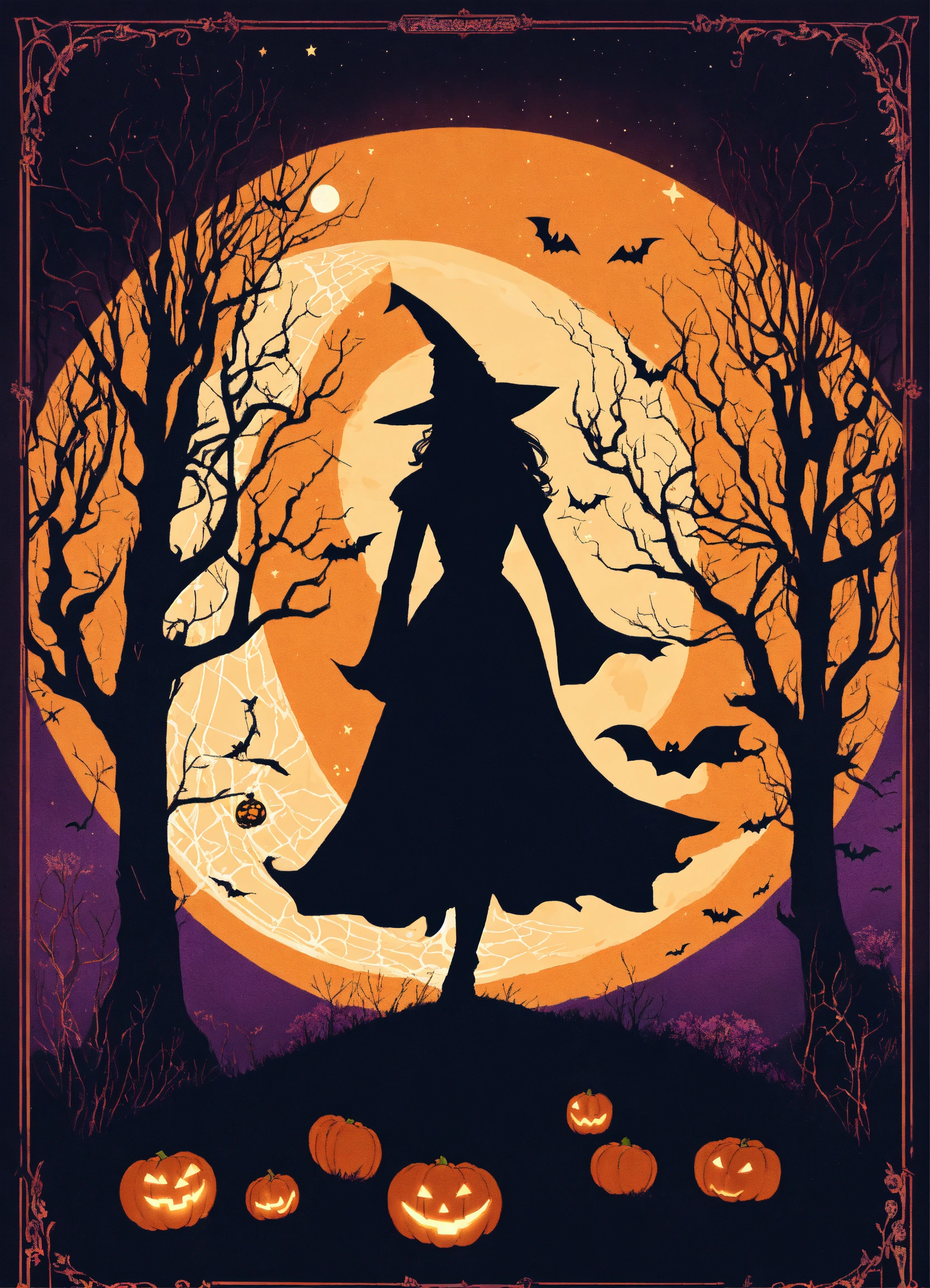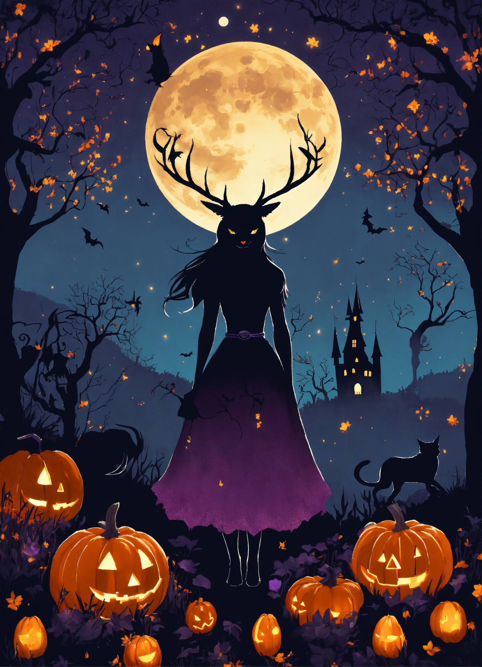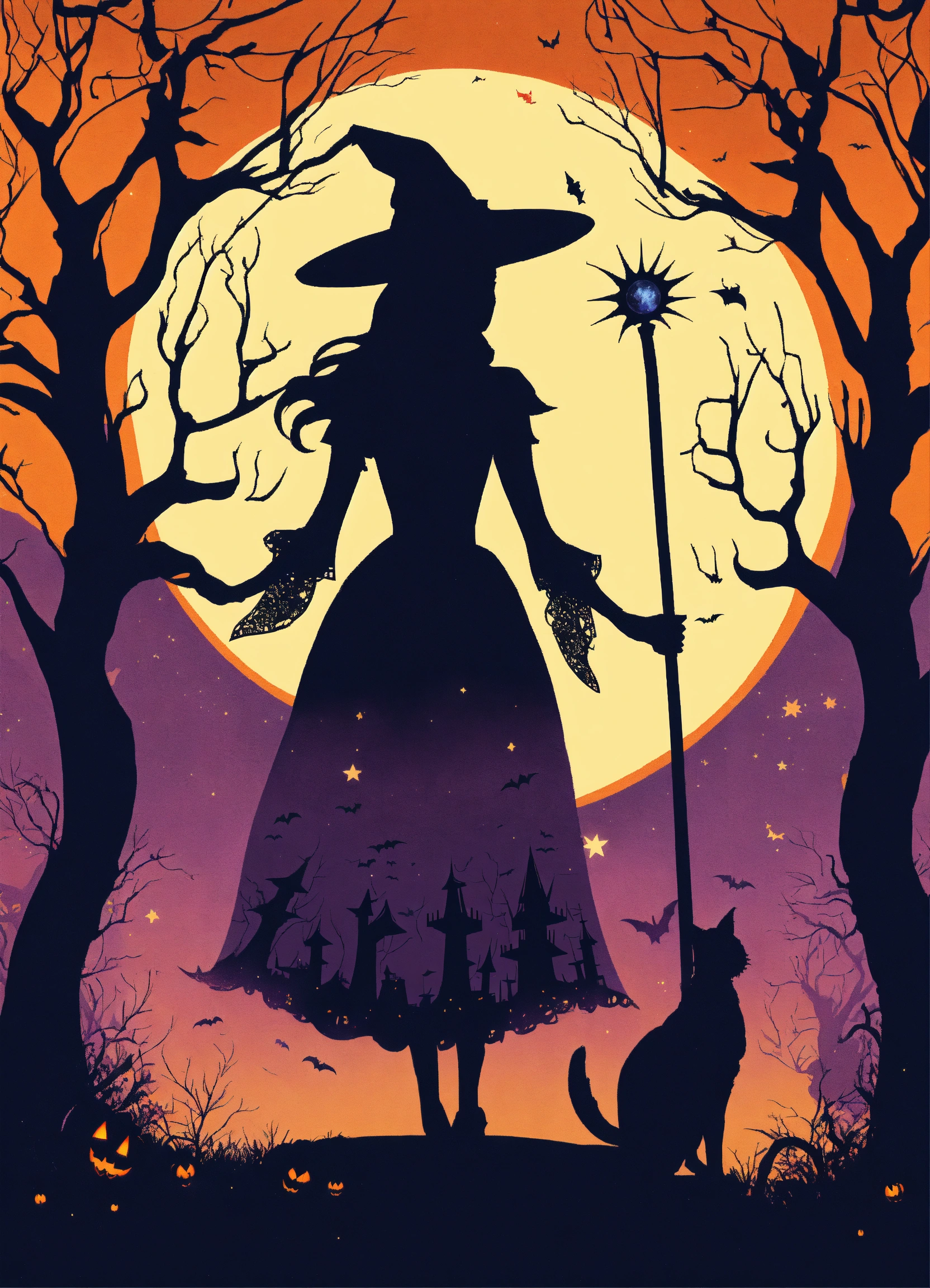 Design an intriguing t-shirt graphic that captures the essence of "enchanted halloween night." imagine a moonlit scene set against a starry sky, where eerie shadows dance amid ancient trees. depict a captivating fusion of spooky and magical elements, seamlessly blending the spirit of halloween with a touch of enchantment.incorporate a central figure, perhaps a mischievous witch riding a broomstick across the moon's silhouette. surround her with mythical creatures like whimsical black cats, mysterious owls, and ghostly spirits. add playful details like glowing pumpkins and twinkling fairy lights suspended in mid-air.utilize a color palette that embraces the mystical atmosphere, using deep purples, velvety blacks, and glowing oranges. enhance the design with subtle glittering effects, evoking the enchanting aura of the night.intertwine elements of traditional halloween symbols with magical motifs. adorn the witch's attire with celestial patterns and include a spellbook