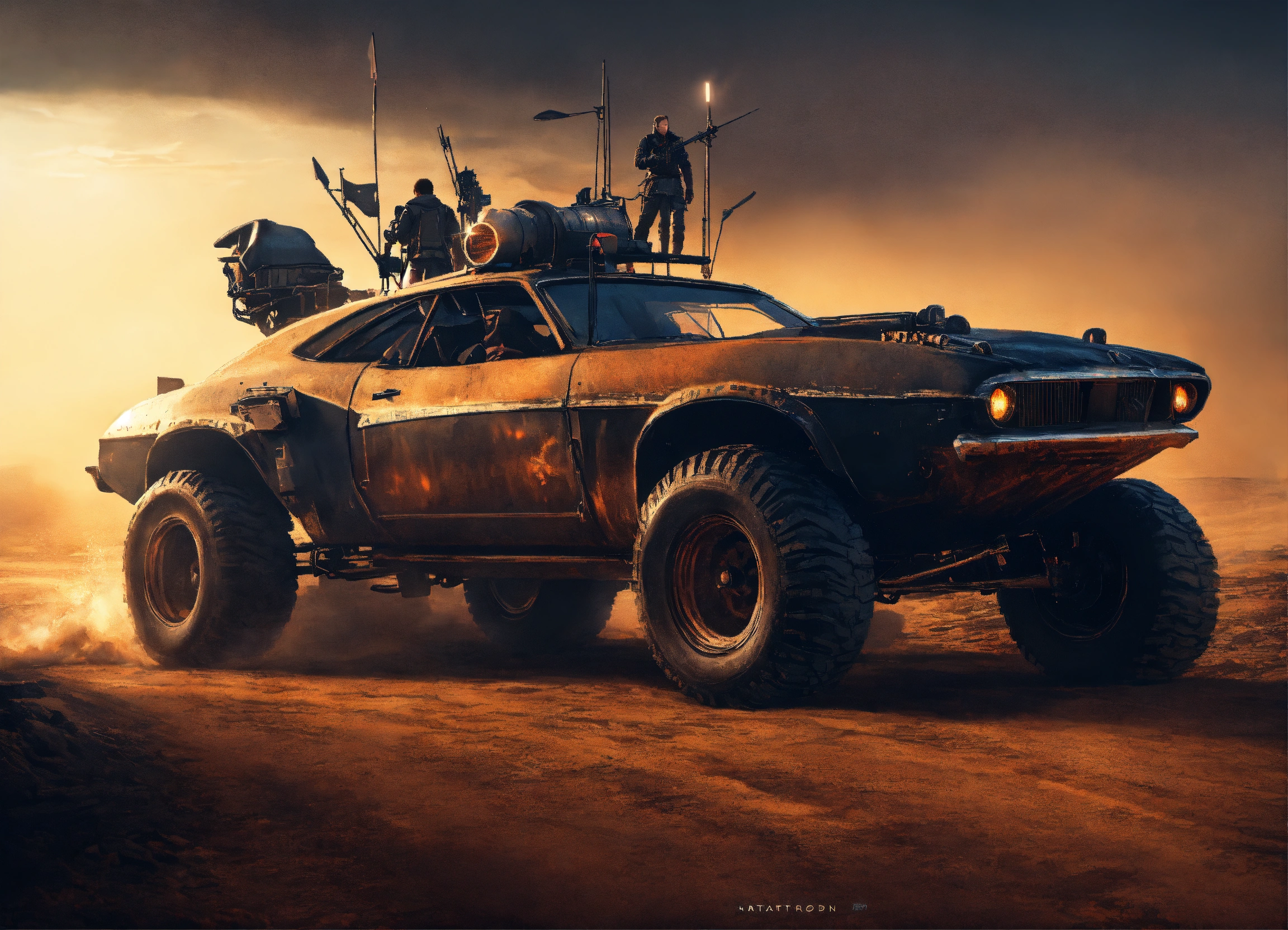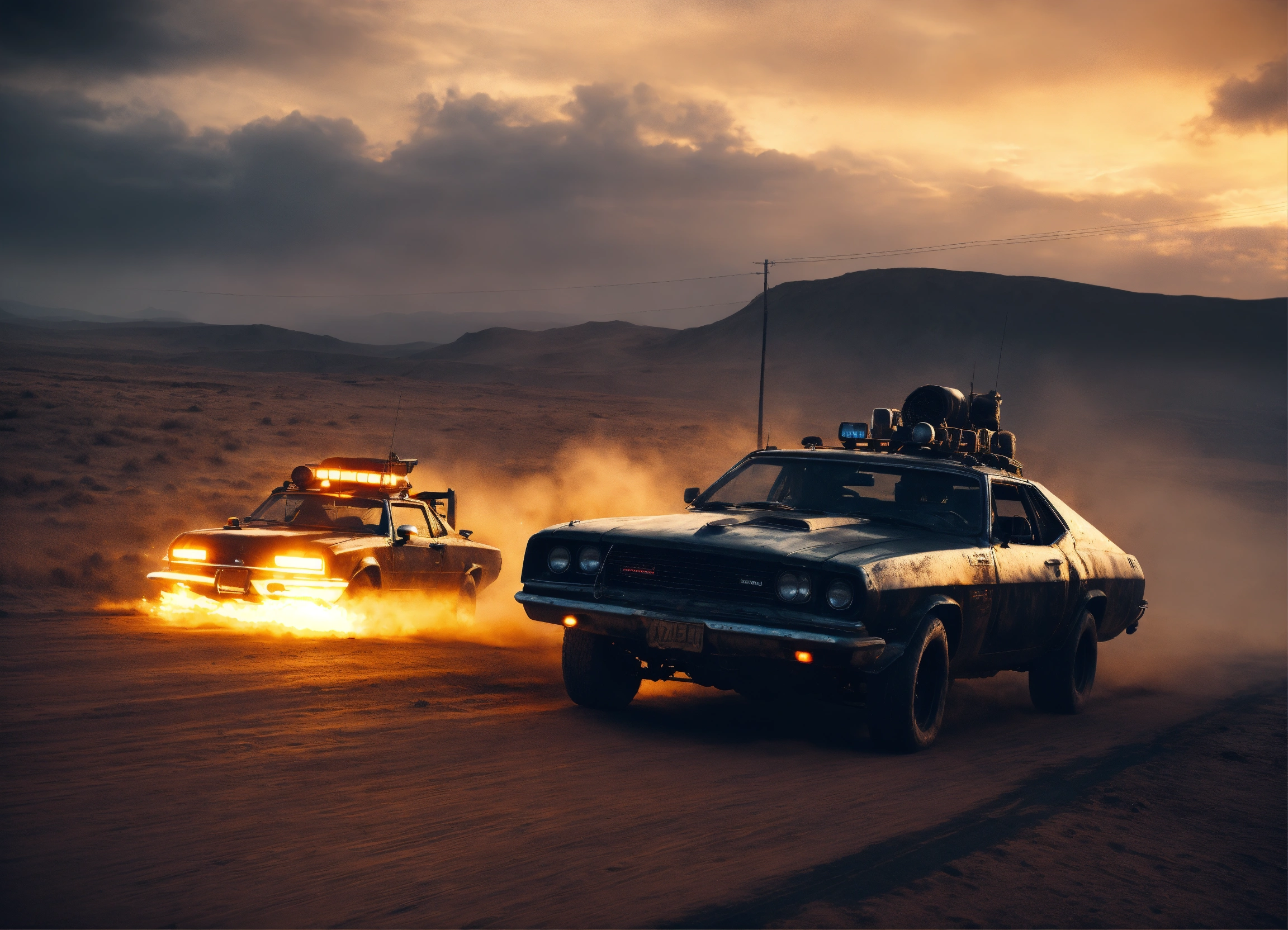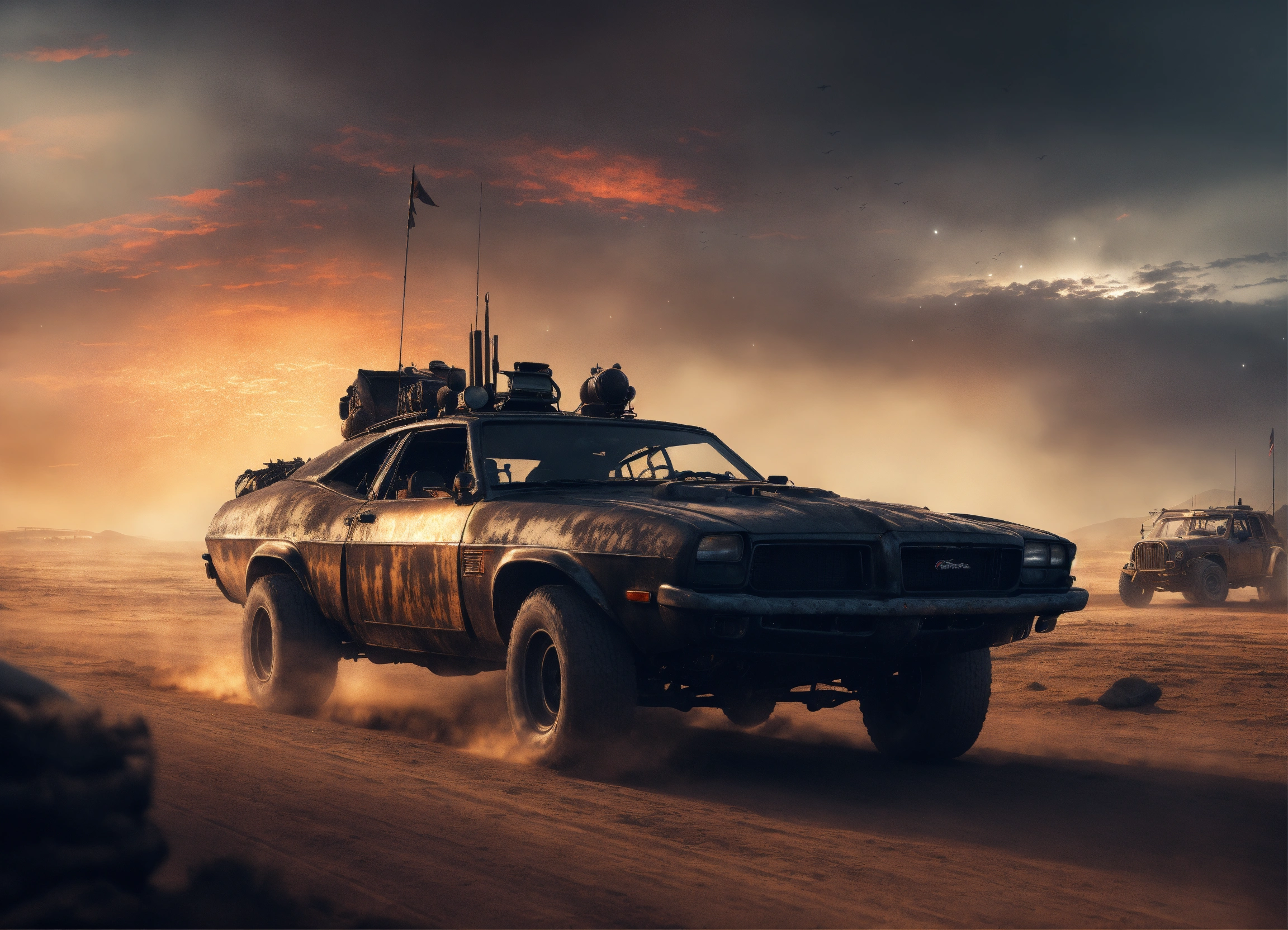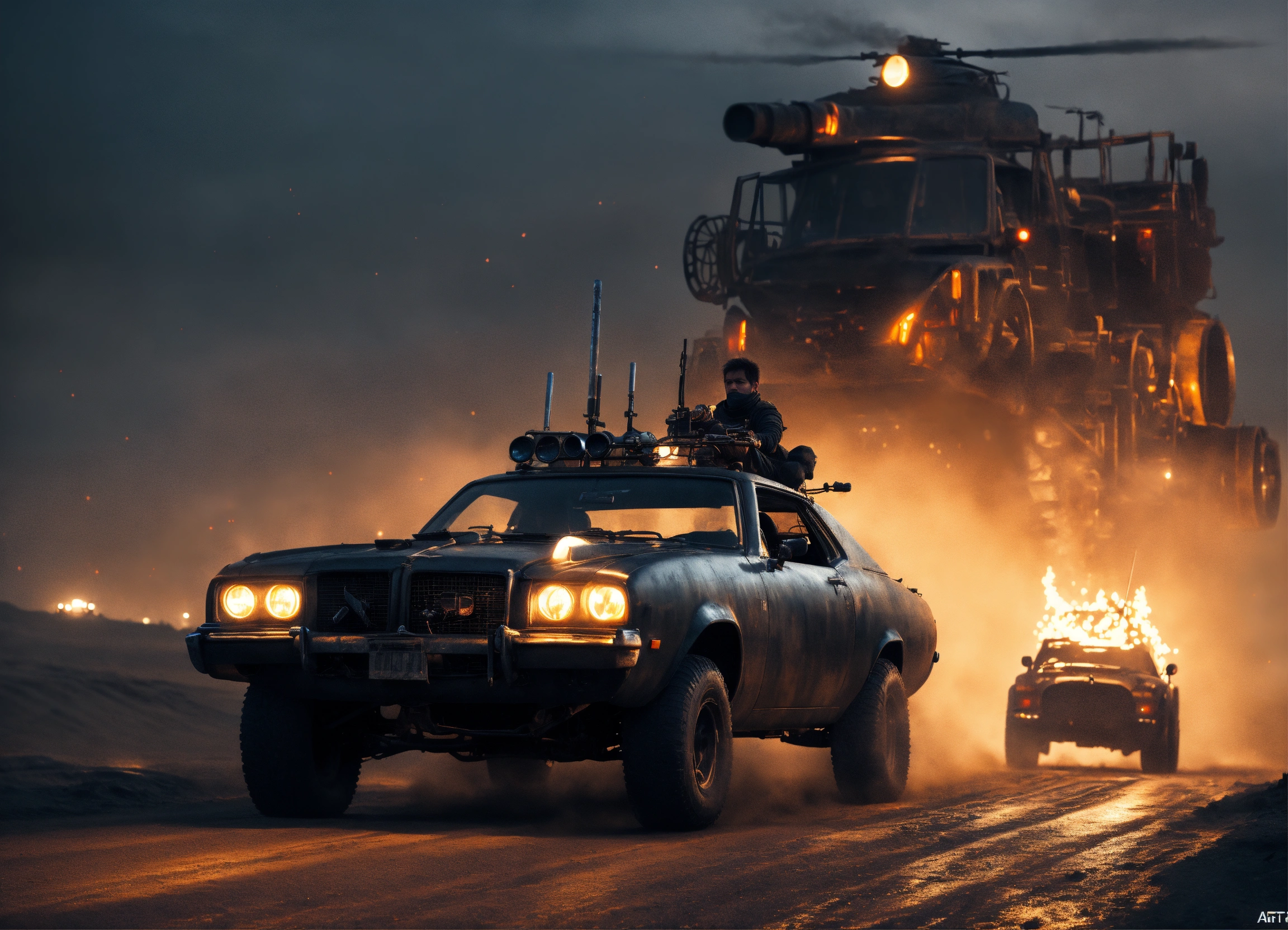 Mad max vehicles, road warrior, trending on artstation battle scene cinematic realism dark dusk moody glowing lights, rich black night, going home moonlight