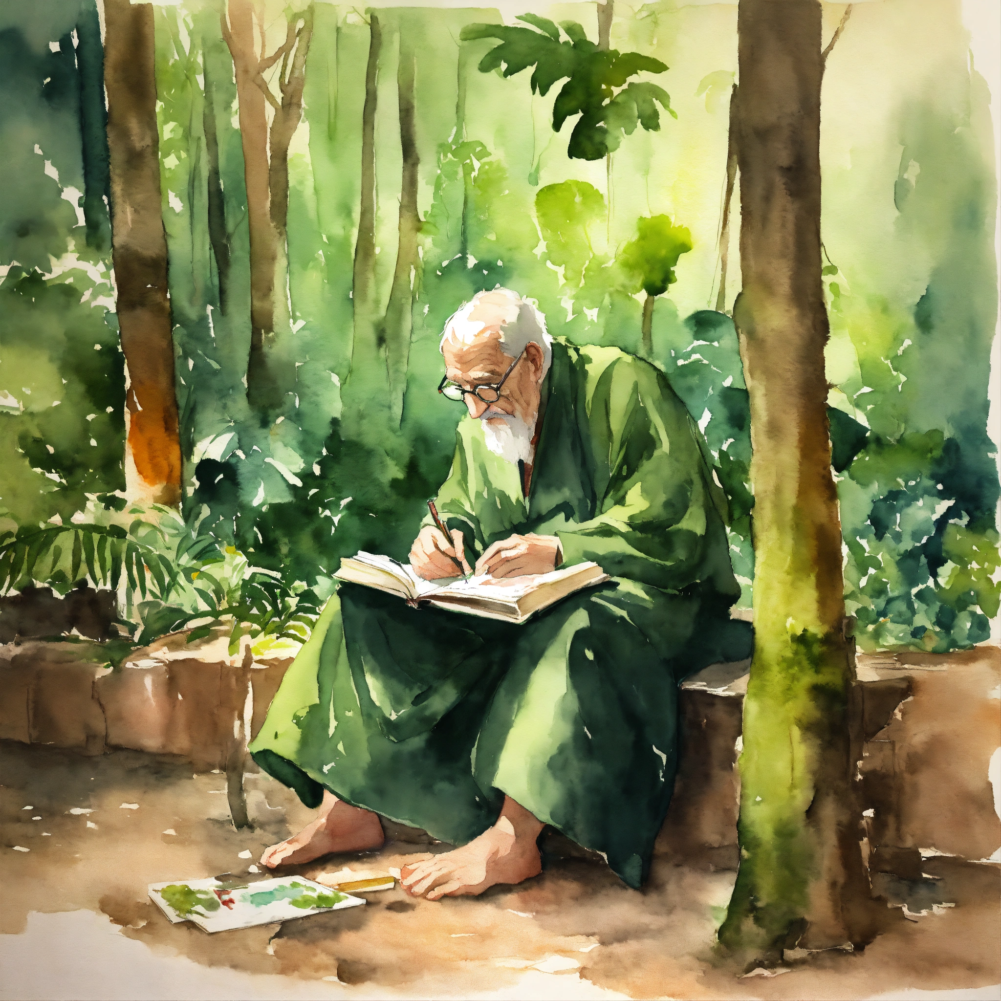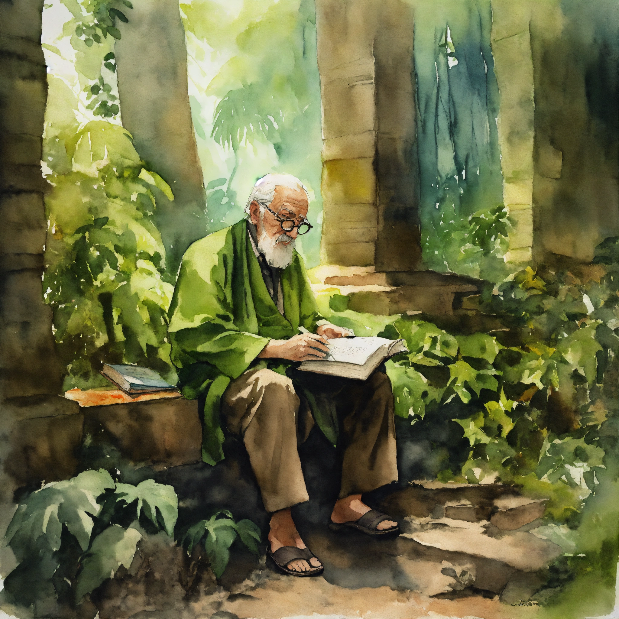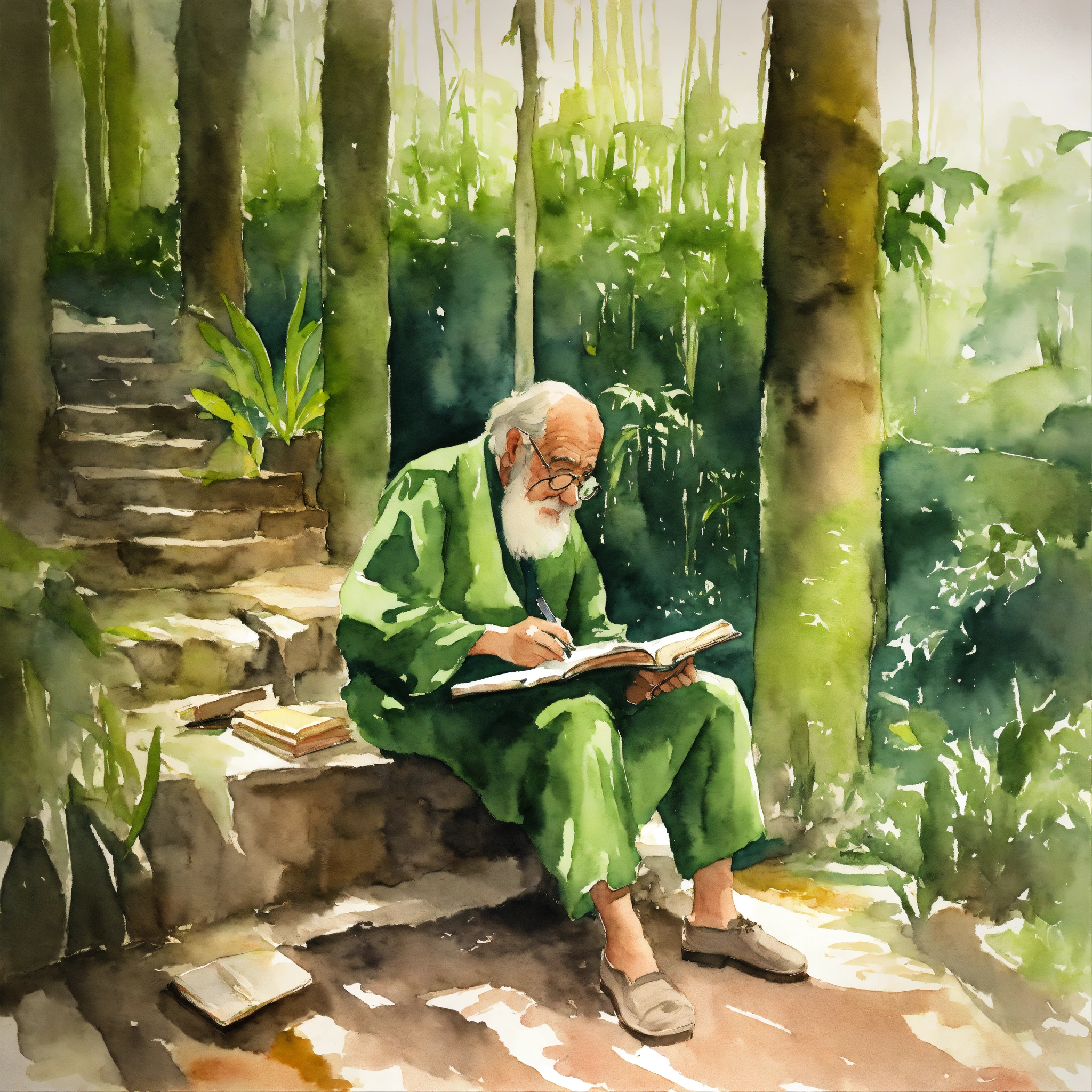 Amateur watercolor painting on paper, simple watercolor, basic art, rainforest, jungle, temple, castle, ruins, hunched over very old russian man wearing green glasses and green robes, square jaw, sagging skin, liver spots, elderly, great grandpa, old polish man, hunched, hunchback, small wrinkly old russian man sitting, holding a text book, surrounded by piles of books, stacks of text books, piles of books, inside of the jungle, overgrown rainforest, trees and stream