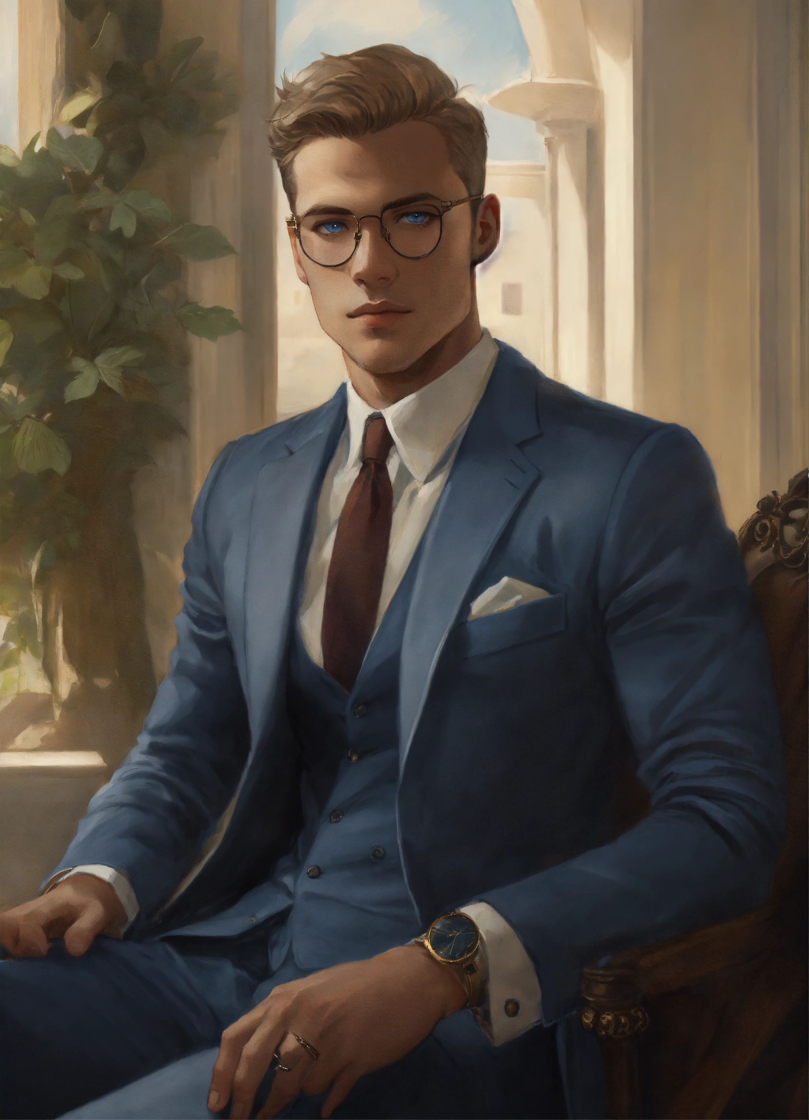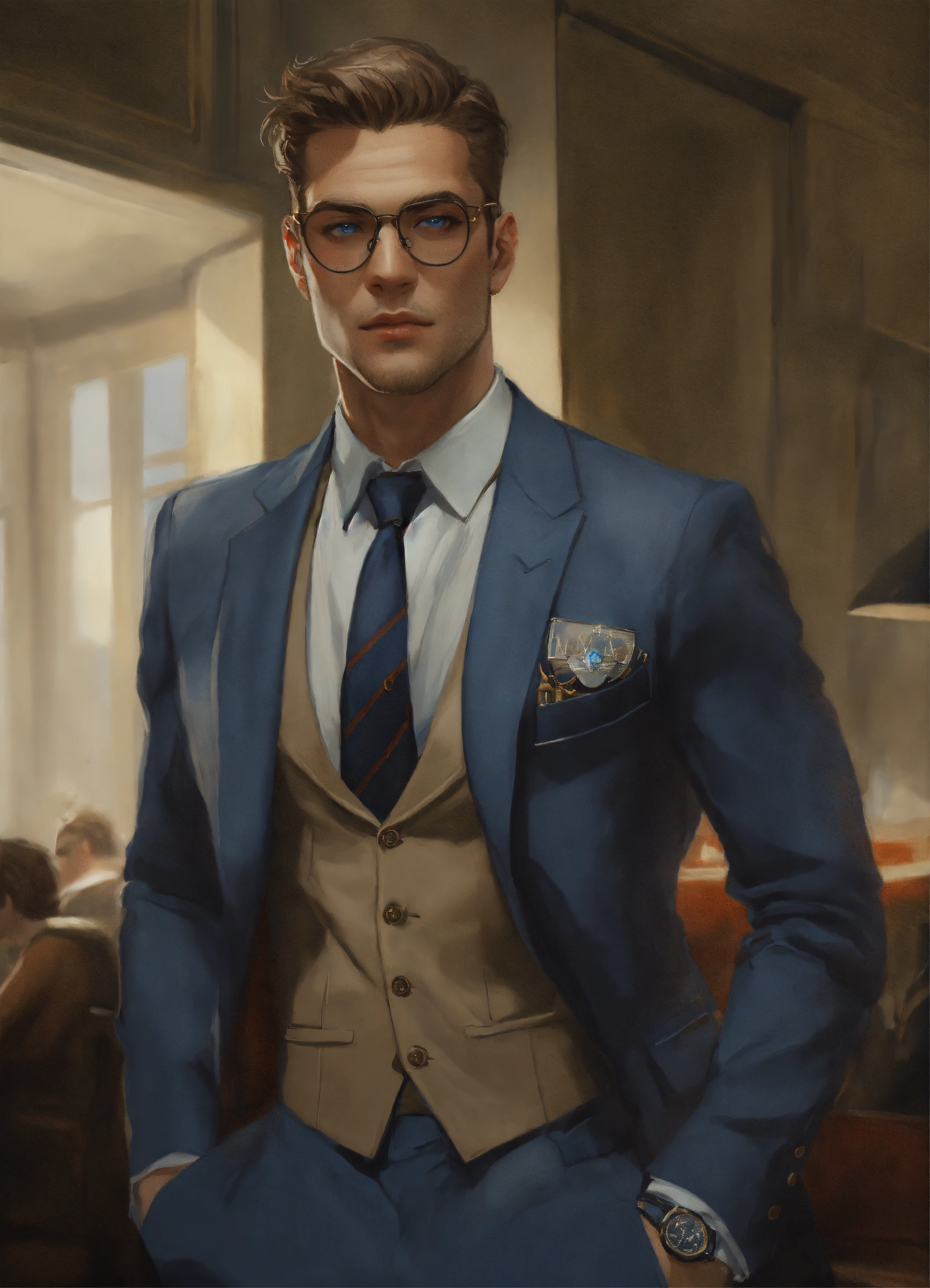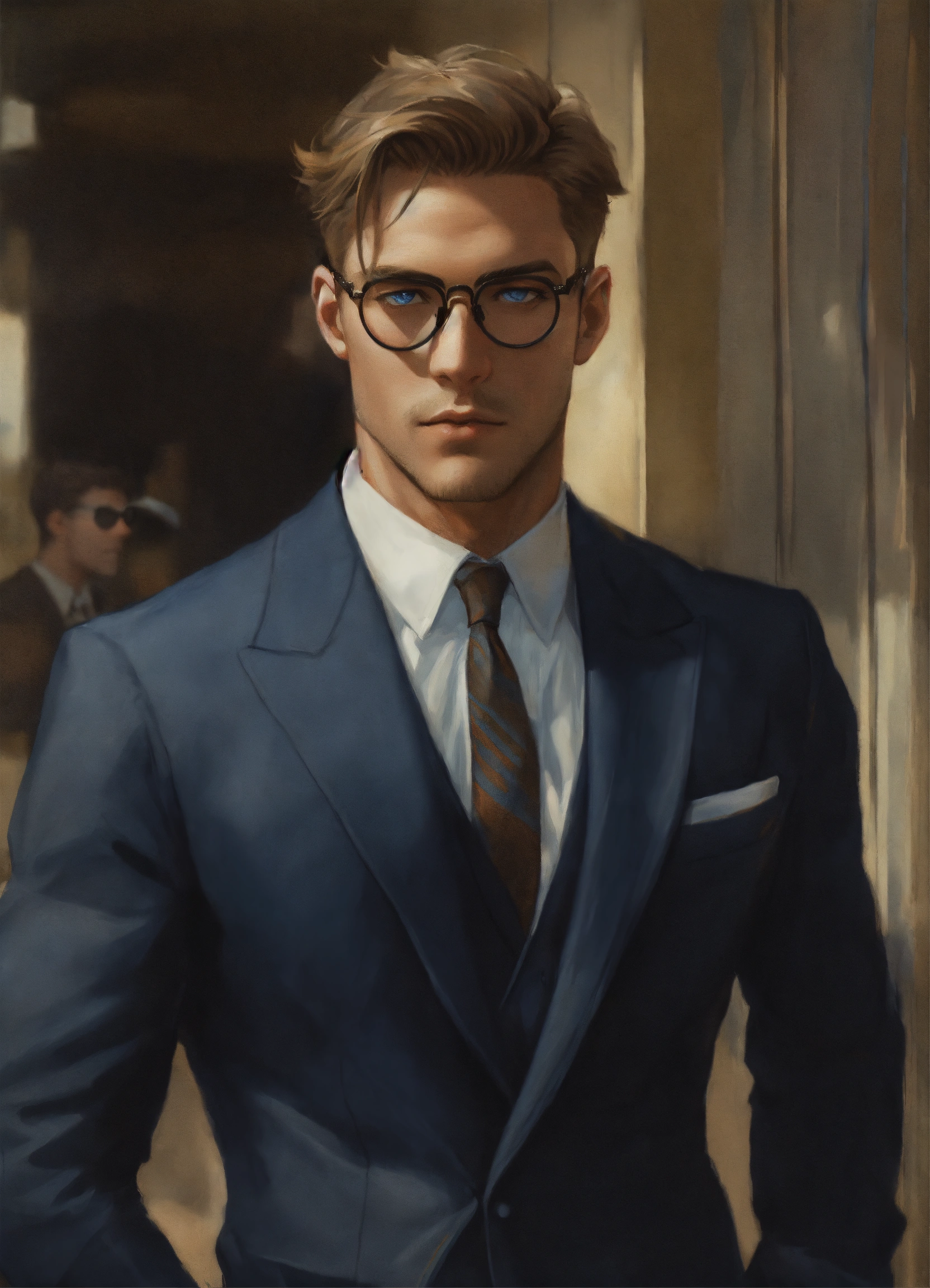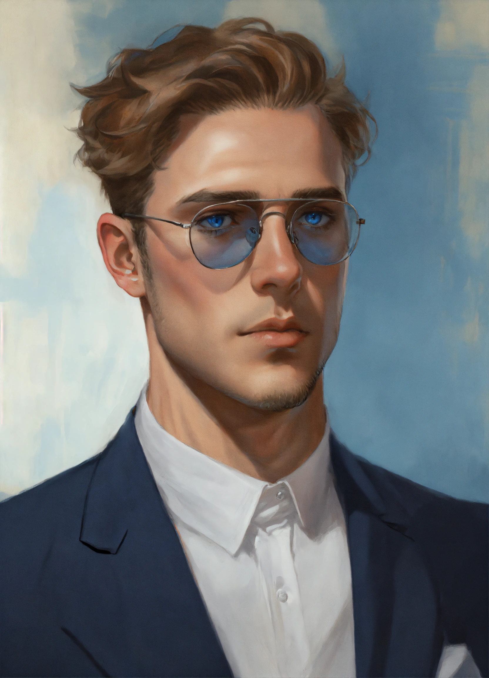 A handsome caucasian male with aviator glasses with blue eyes and side-parted hair, drawn in nick alm style, wearing a two-piece suit.
