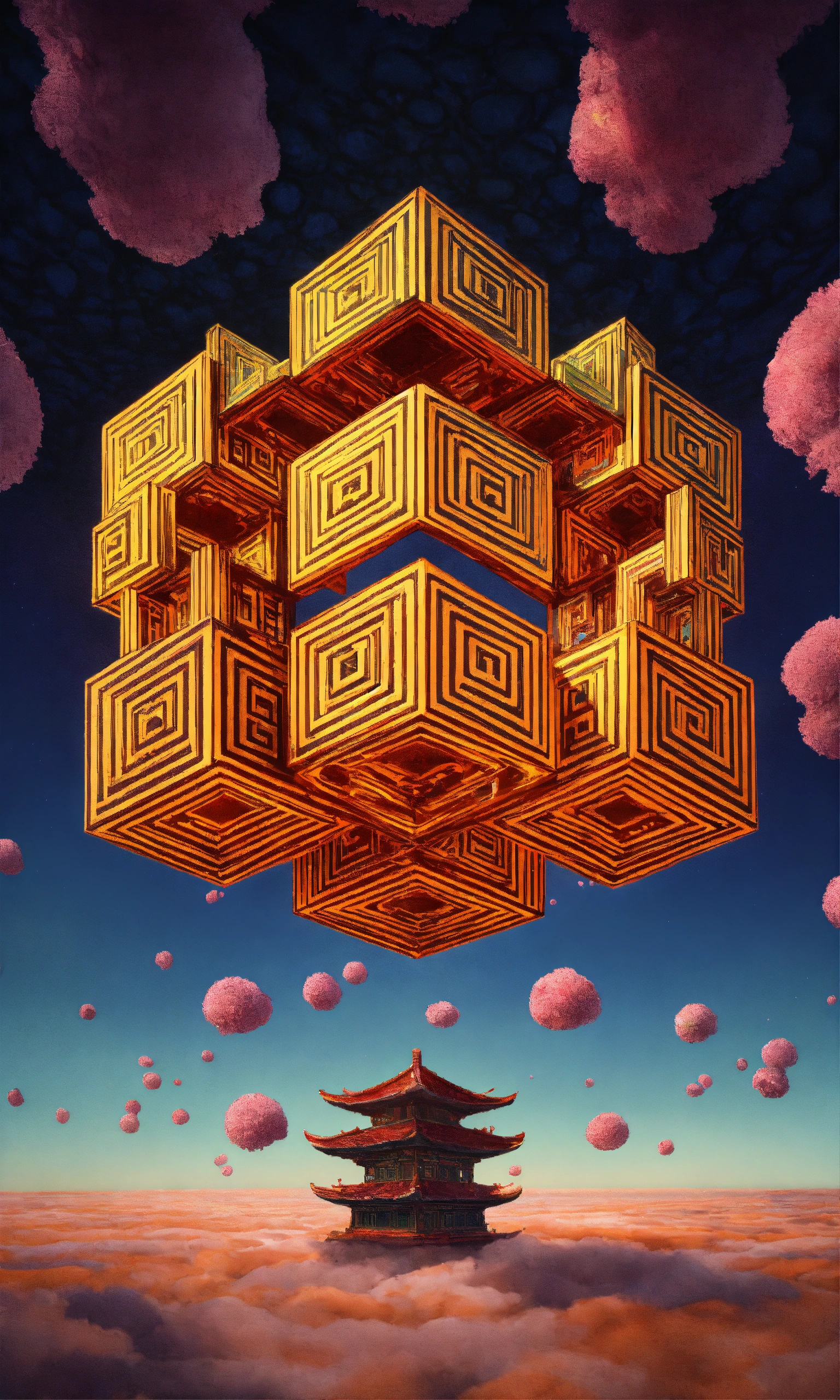 Taoist monk octopus tesseract body fractal three point perspective hypercube melting in each other