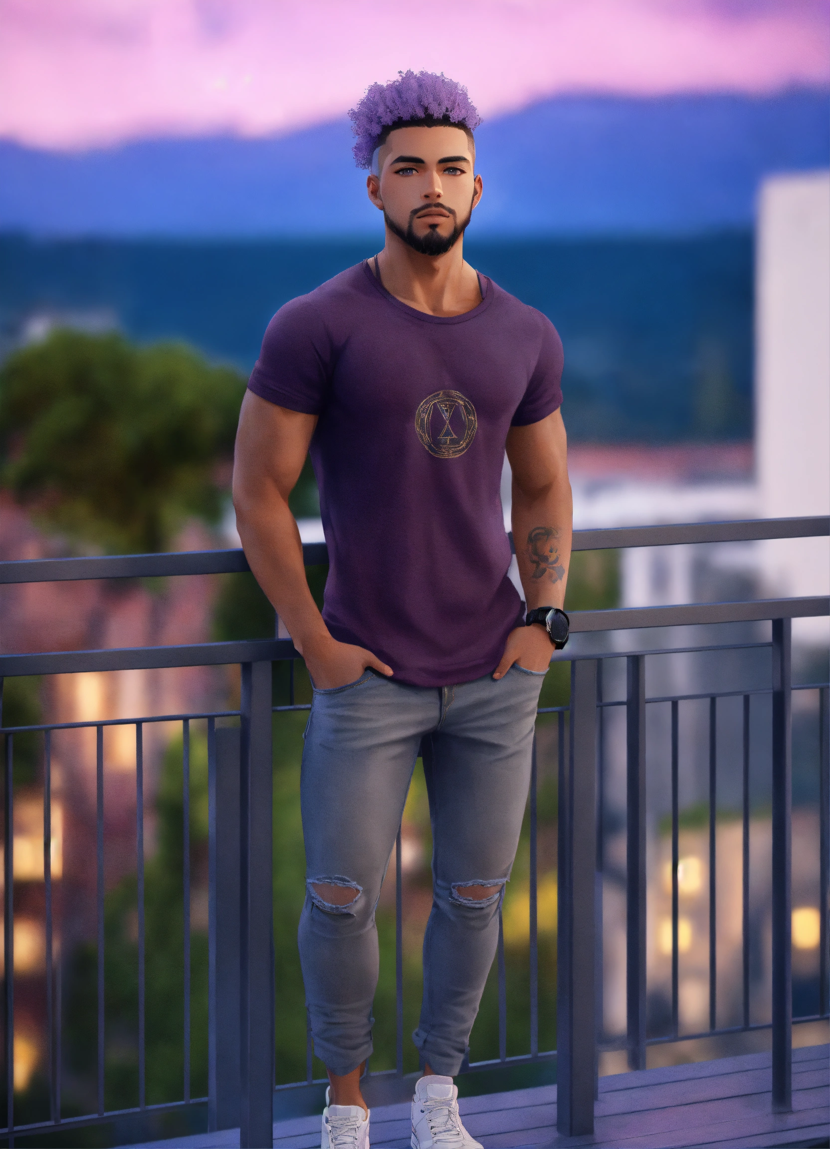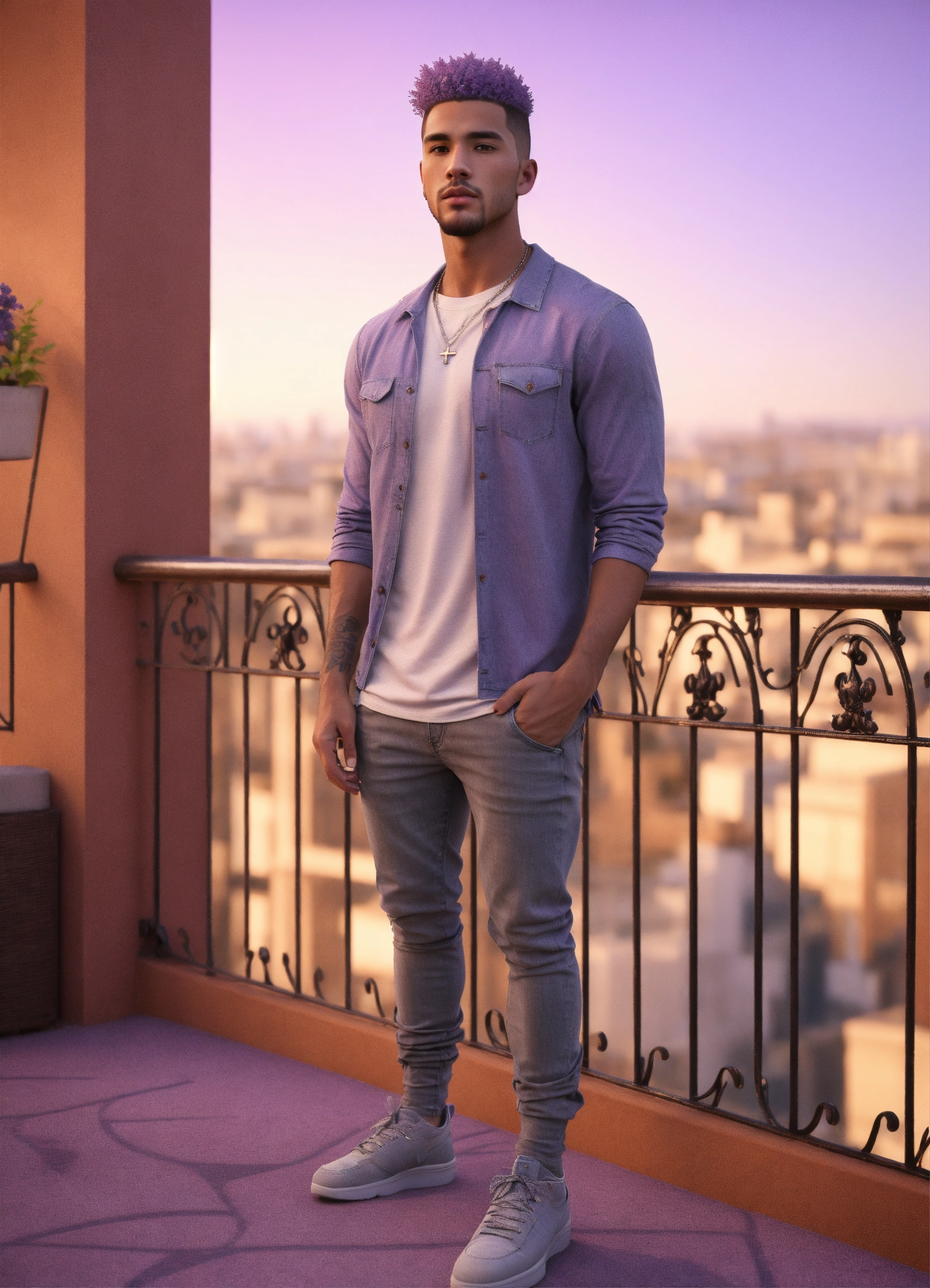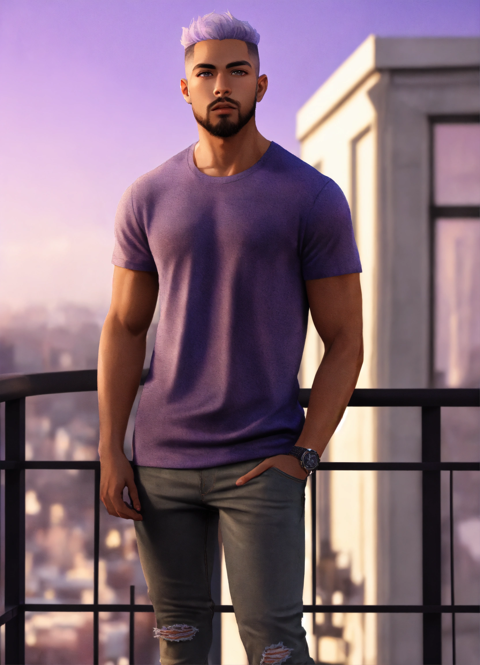 25-year-old, handsome mixed race male. grey eyes, lavender hair, tall athletic build, goatee, in haute couture tee-shirt and jeans, and shoes, standing on balcony, serious demeanor, 8k, unreal engine.