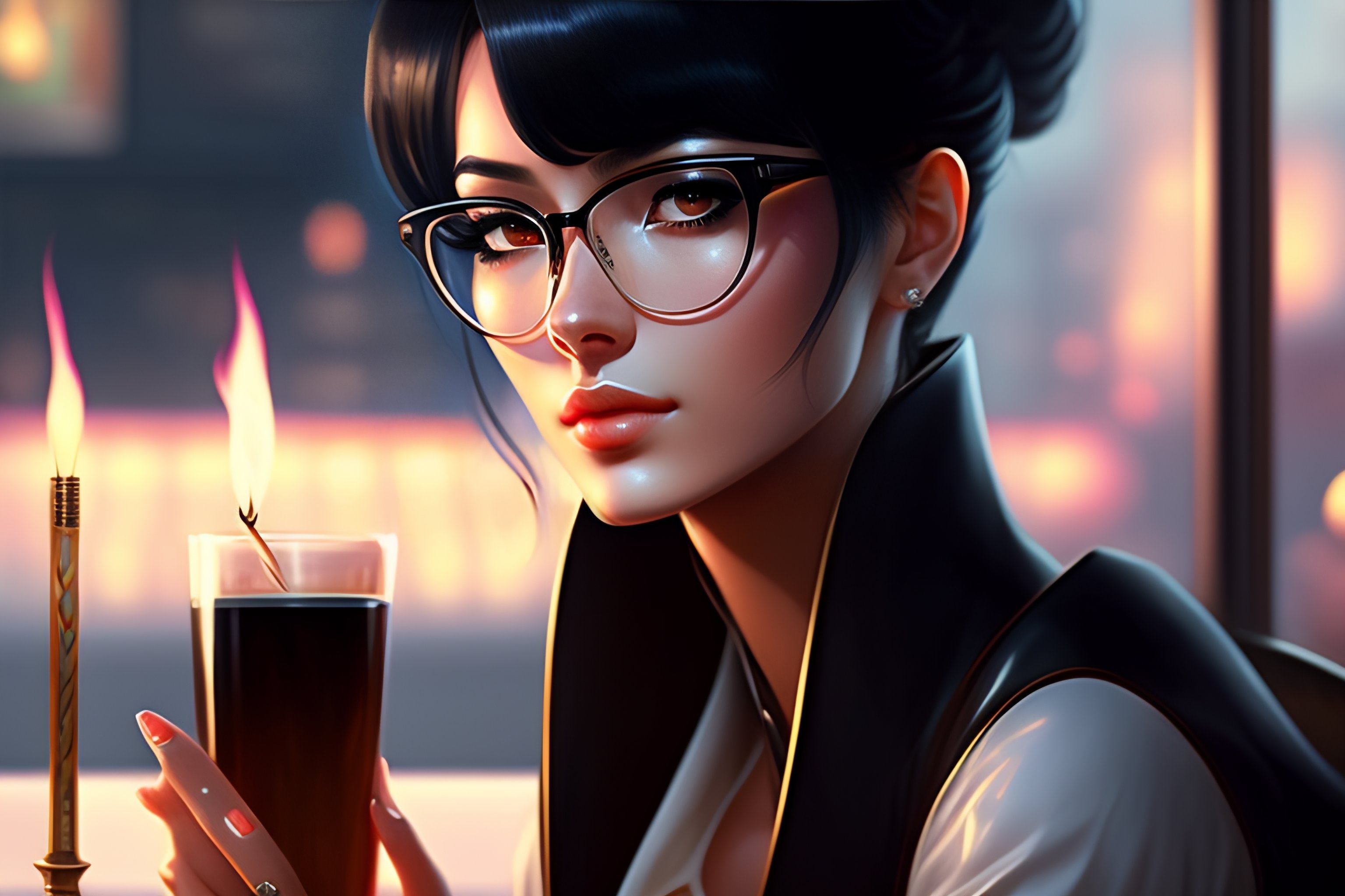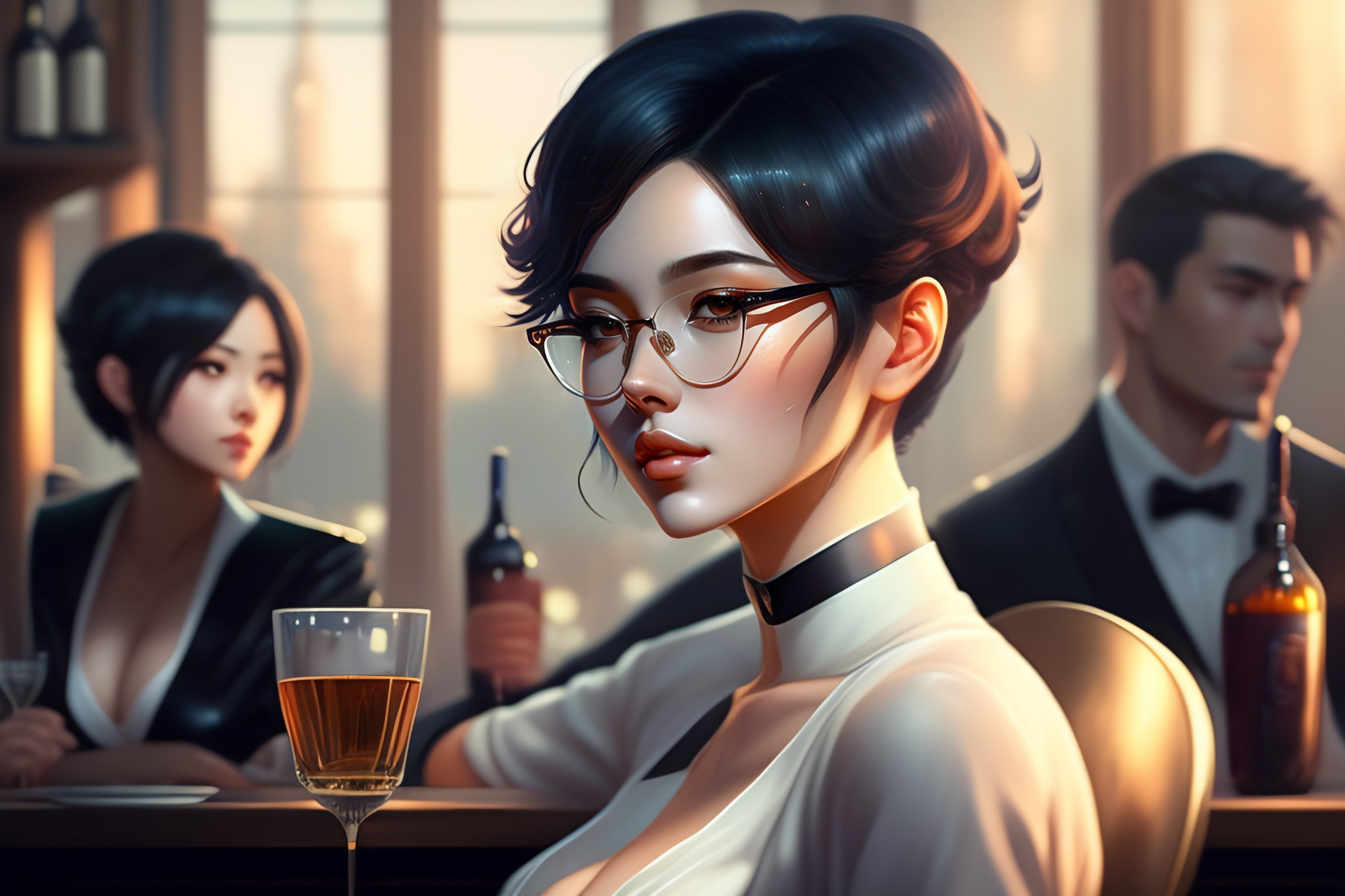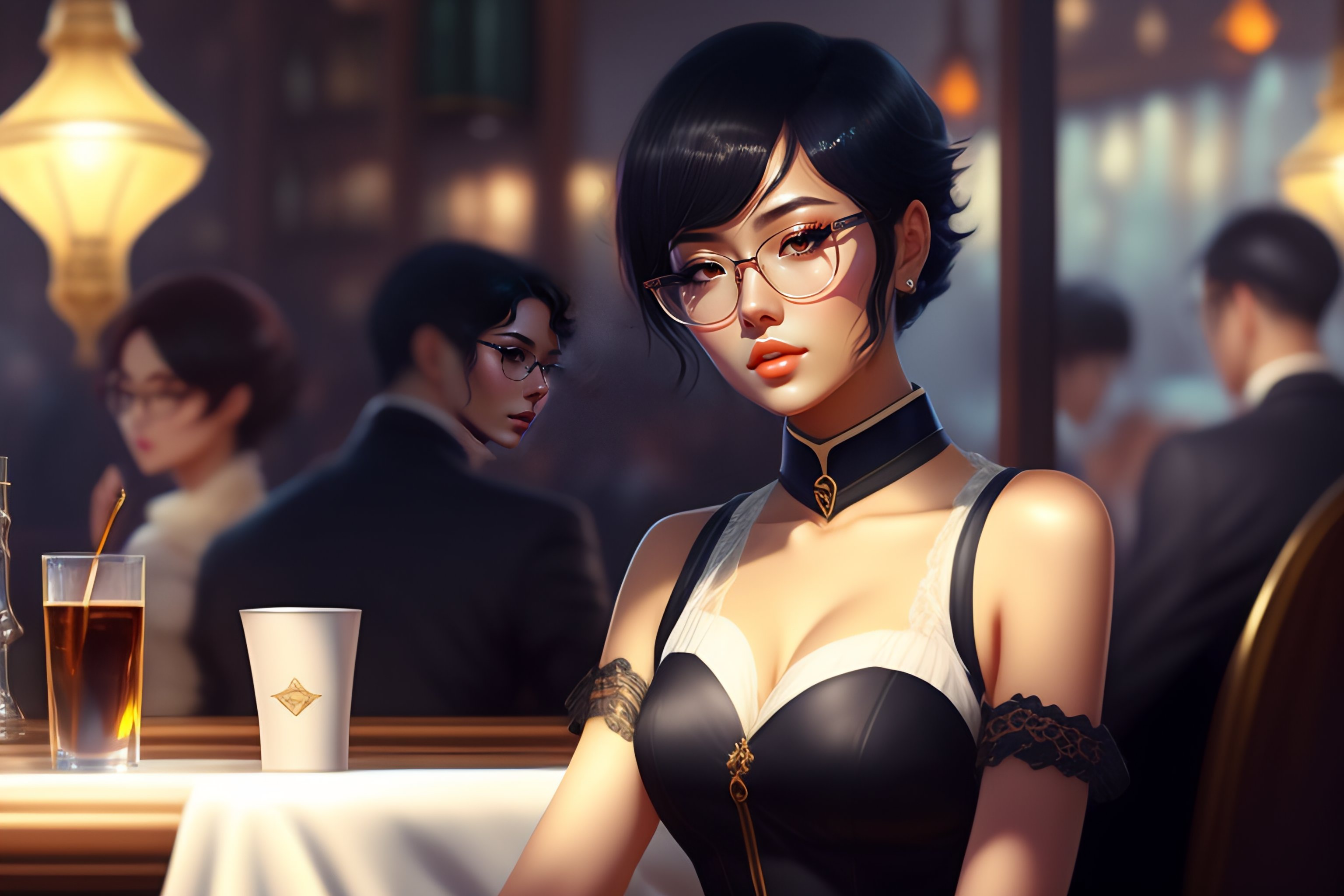 Beautiful anime girl with short black hair, glasses, bar, sitting at the table, cigarette smoke, twilight neckline, short dress, general view of the character, 1 9 6 0 s, intricate, elegant, very detailed, digital painting, art station, concept art, smooth, sharp focus, illustration, art by wlop, charlie bowater and alexandra fomina