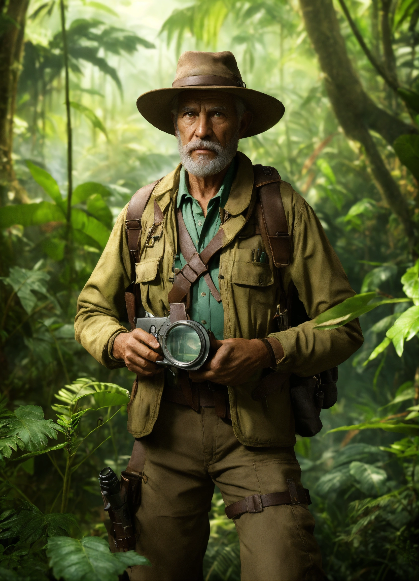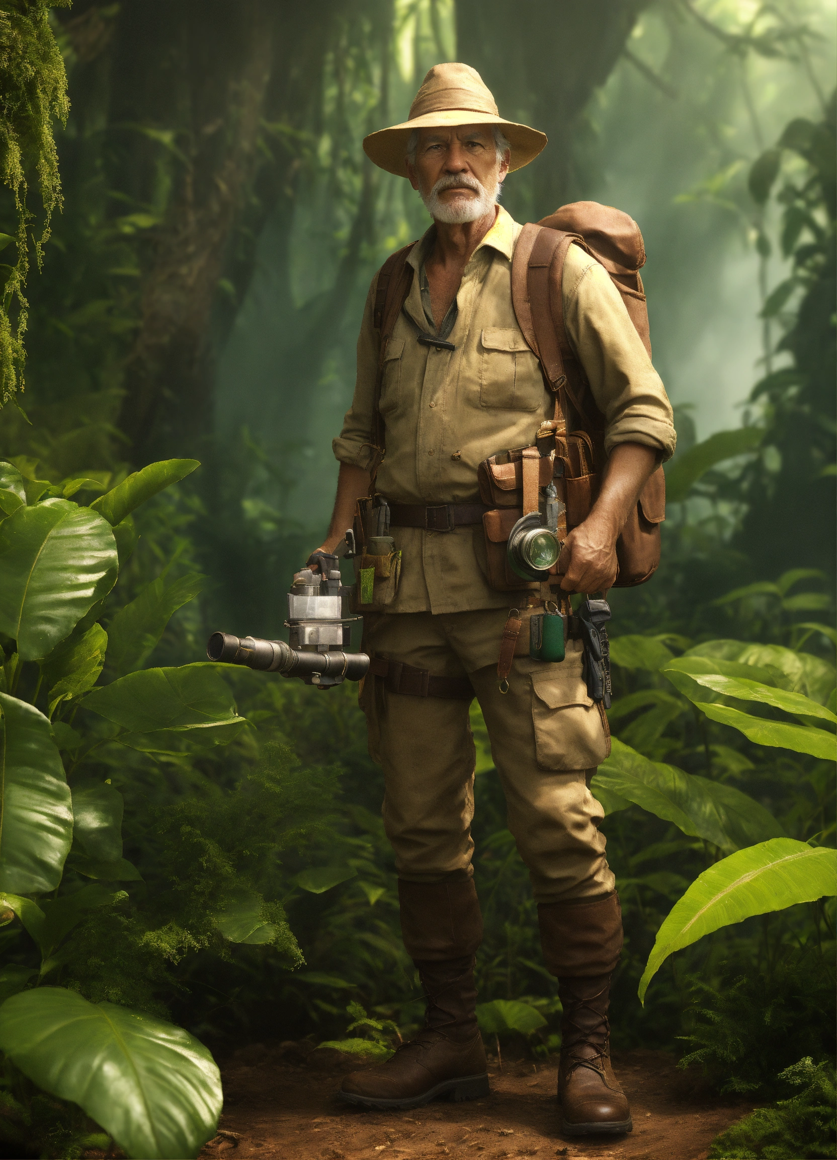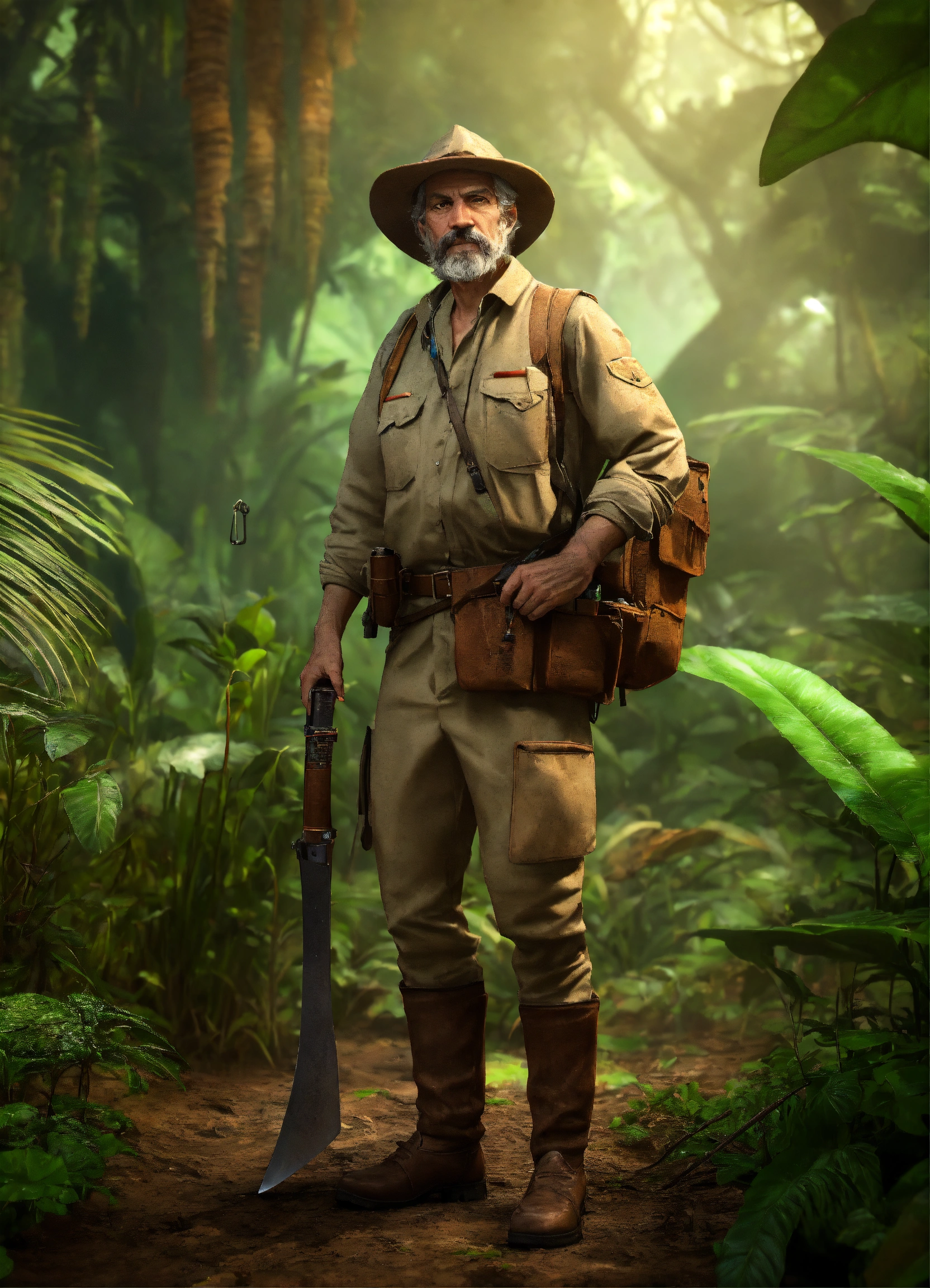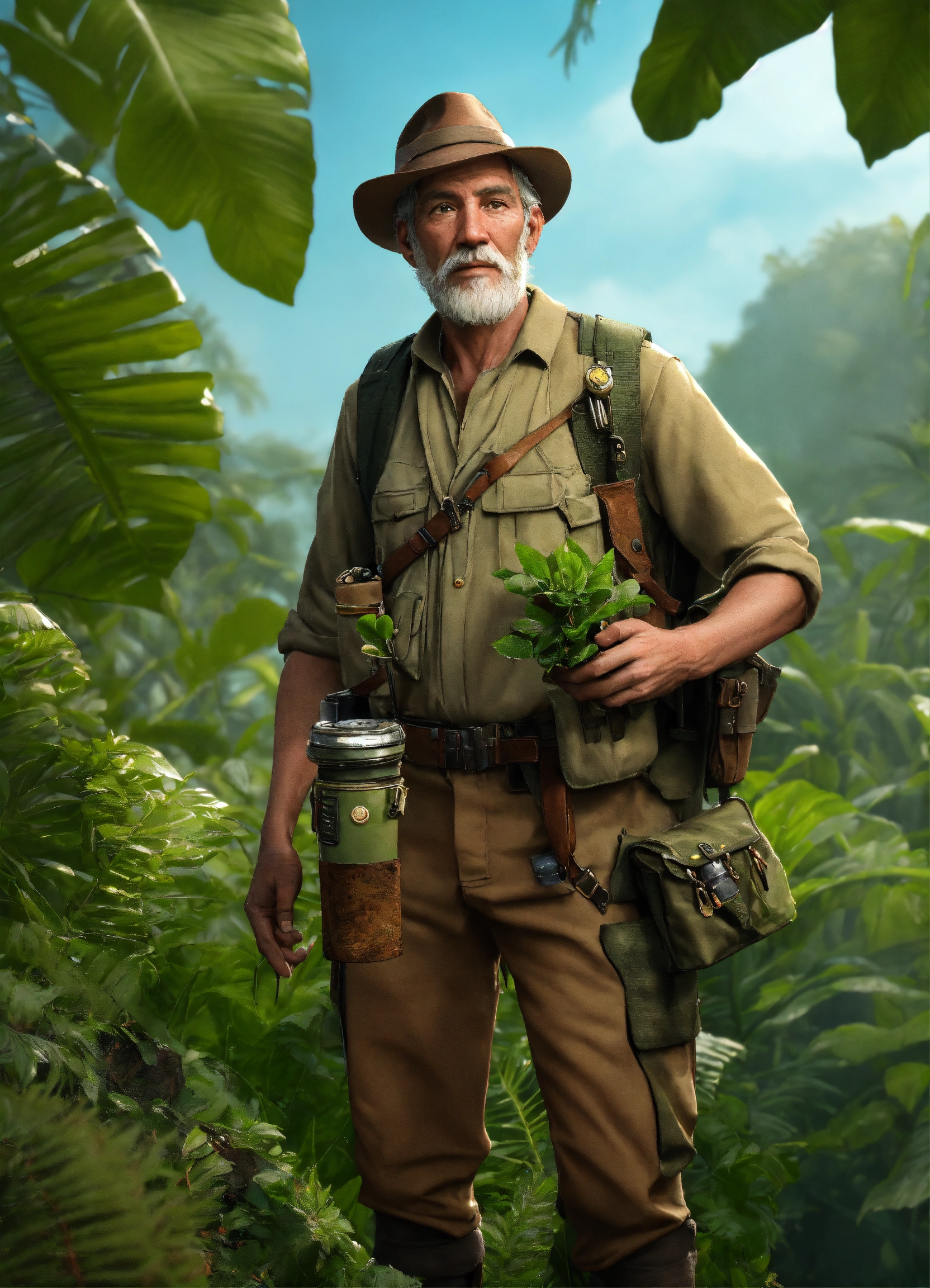 Establishing shot of a front view of a 60 year old botanist, who discovers a rare plant, in a humid jungle.detailed tenue and objets, with in expedition clothing, with a jumanji video game look, with an old hand magnifier in this hand, with a machete stored in its holster attached to his belt. detailed image with vintage 3d adventure video game animation style, with natural lighting at dawn ans high humidity atmosphere. detailed posture of the character, he is standing, he is holding his old magnifier in this right hand. detailed a rare plant discover, she is in the foreground of this image, in front of the character.