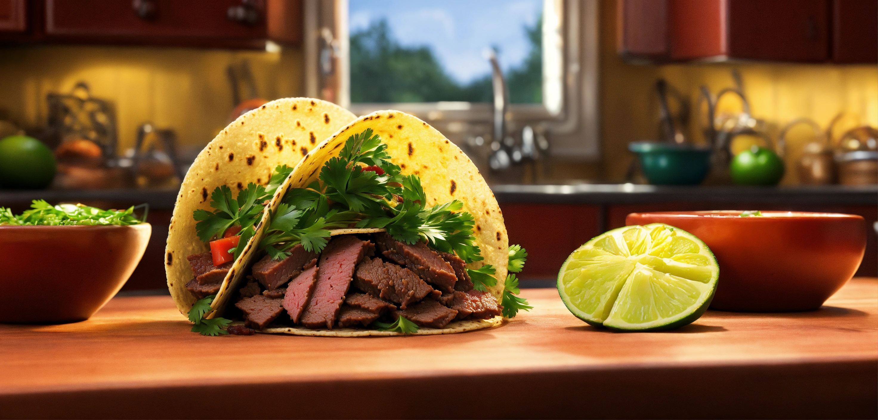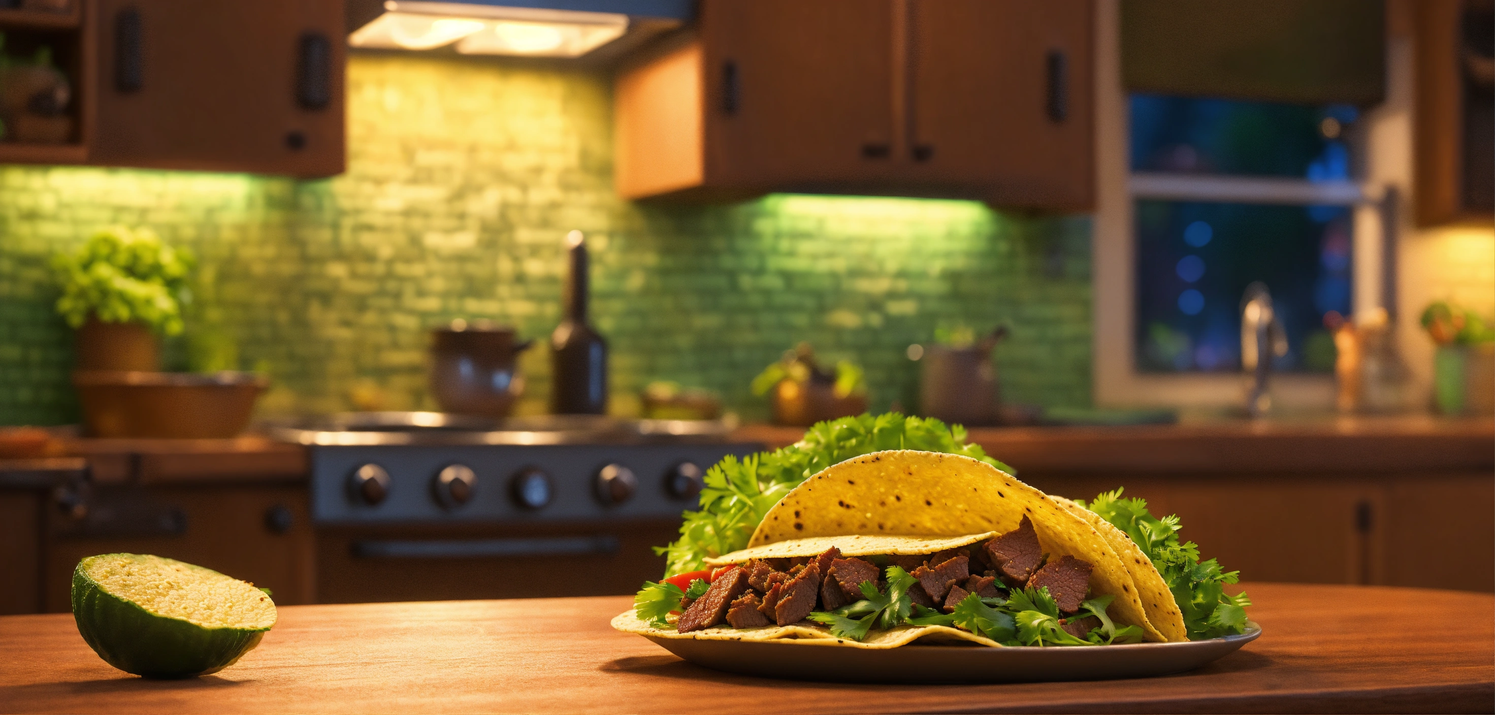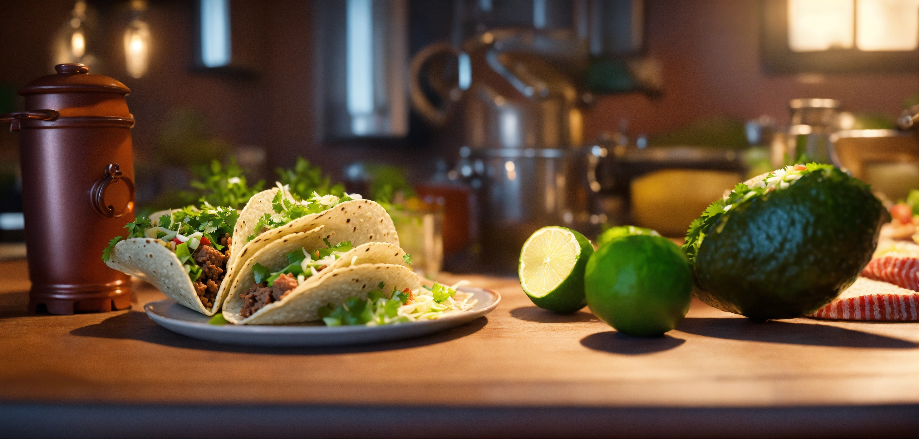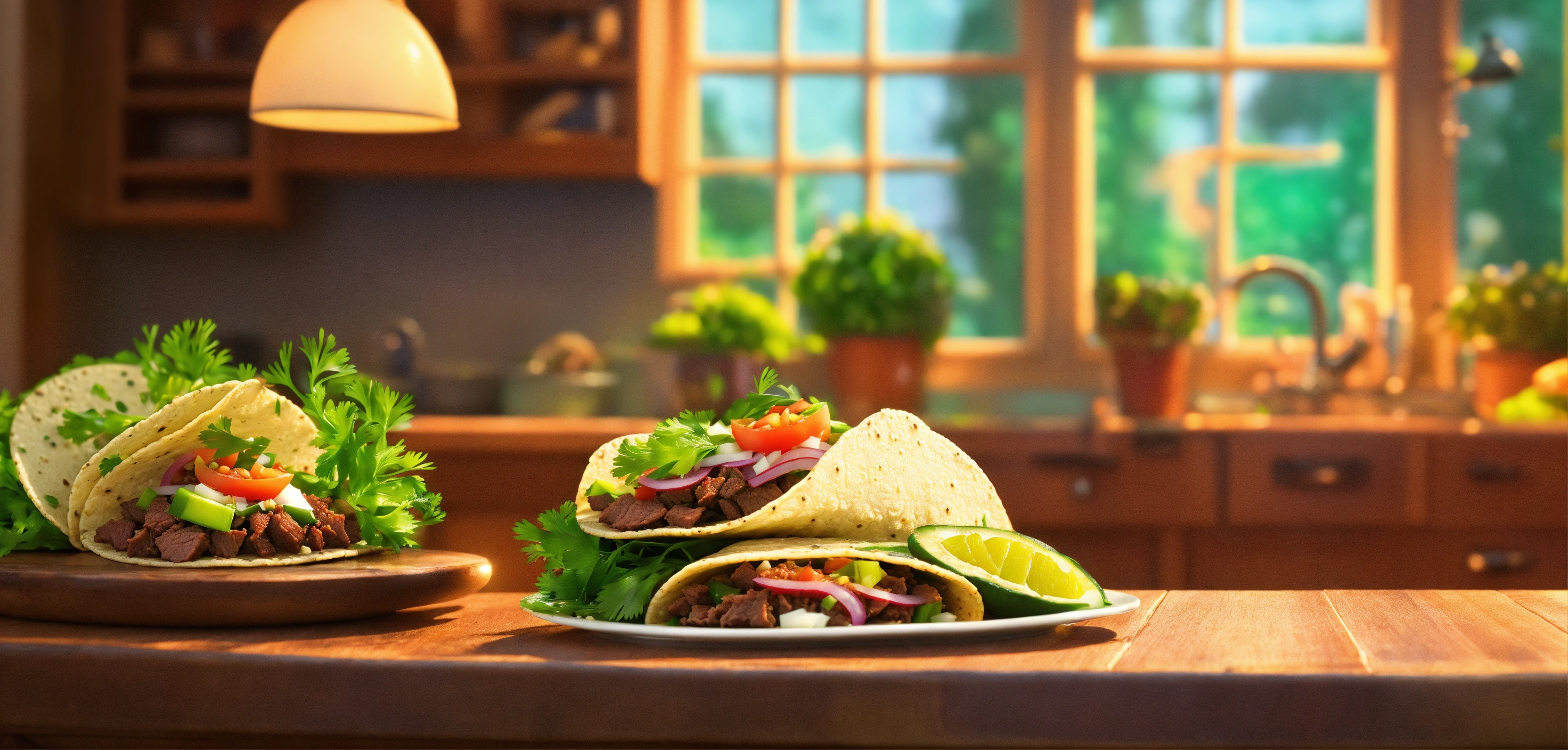Stock photo of dill next to carne asada tacos in a warm cozy kitchen, in the art style of hayao miyazaki-like, quaint ambient lighting highly detailed, high resolution, scene from disney or pixar movie high resolution 3d ai detailsimilar to product from midjourney ai