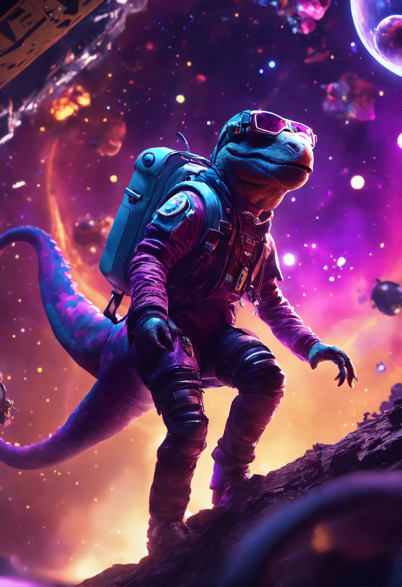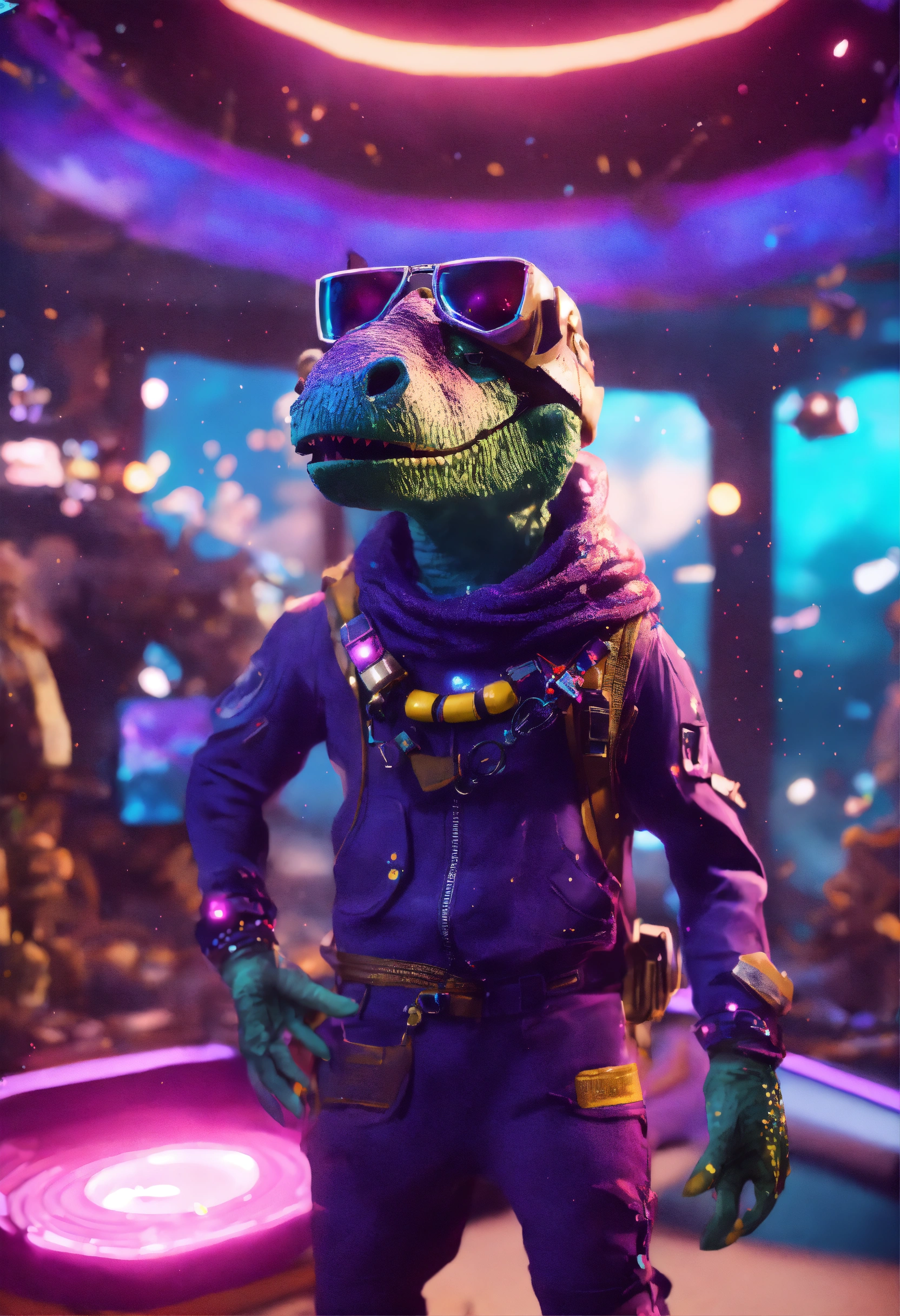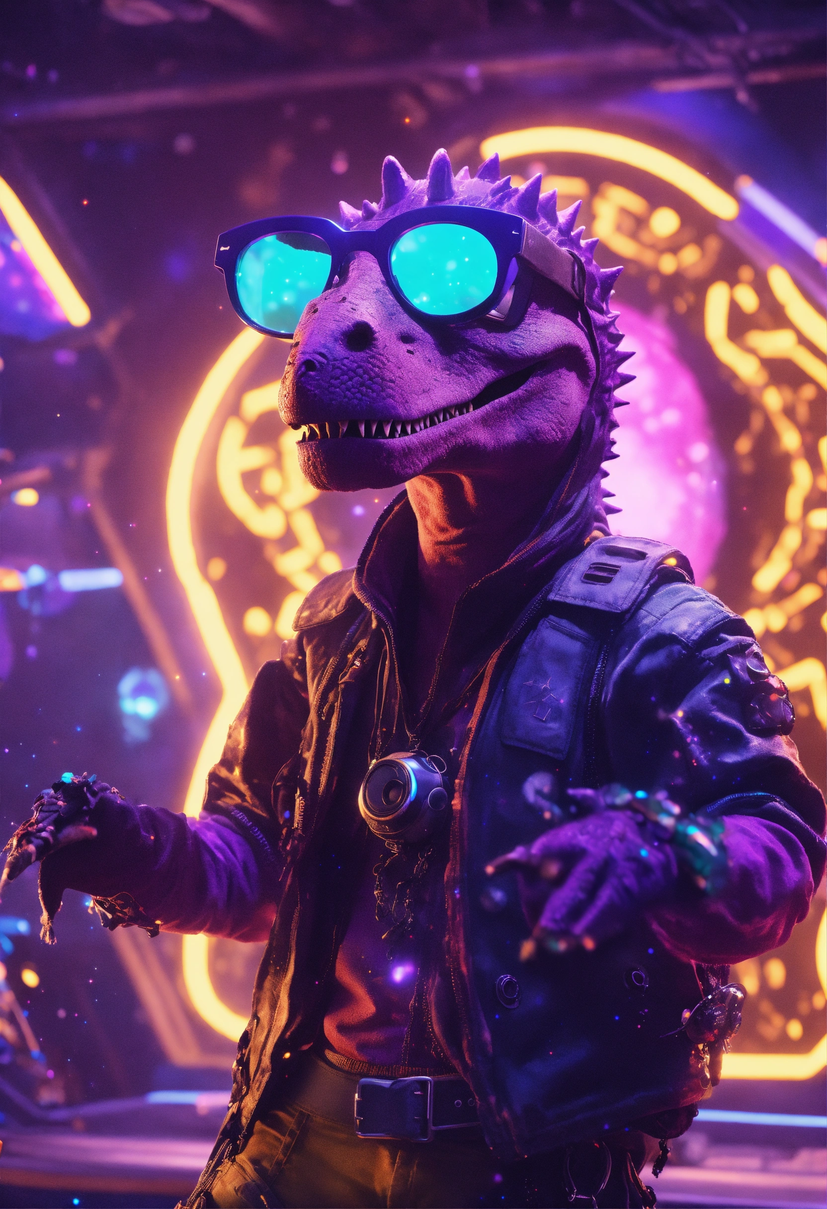 Zoom out on tall funky big purple spotted dino rockstar wearing cool space clothes and jewelry with oversize nebula glasses, dancing in a wrecked spacecraft, people from different galaxies dancing and enjoying the music, pixar, unreal engine, 8k.