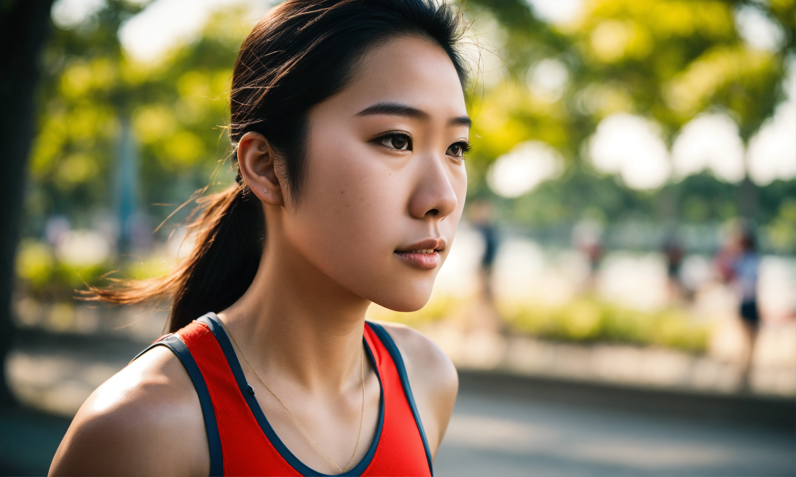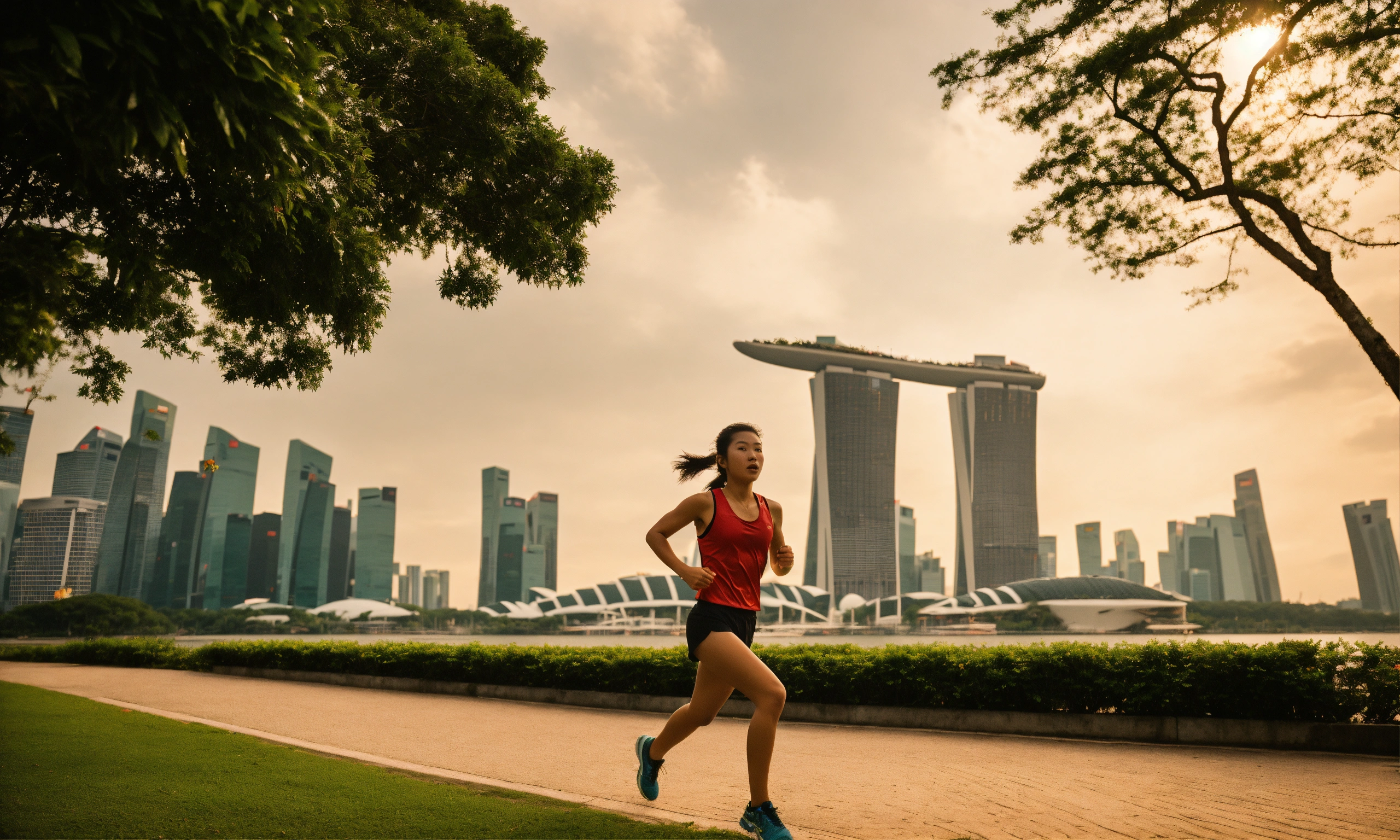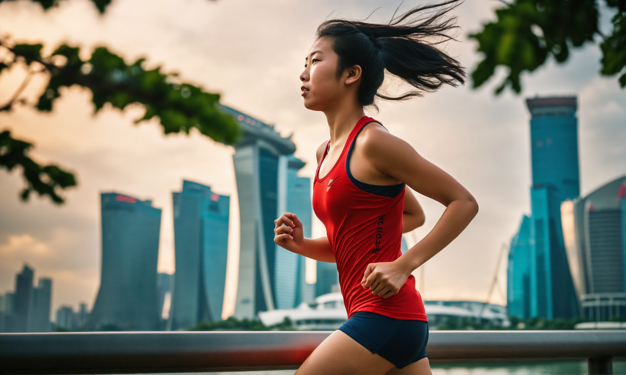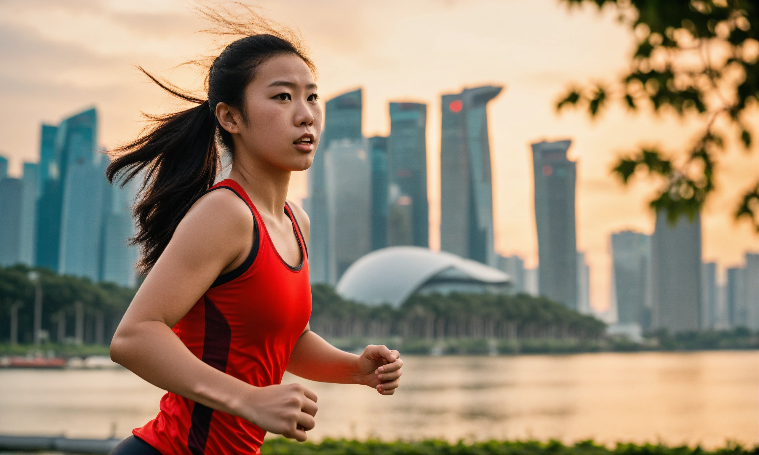 Close up shot of an athletic 18-year-old asian girl running in singapore's east coast park, a sleeveless plain red singlet, closed mouth, determined expression, towering trees, backdrop is the iconic singapore cityscape rises with modern skyscrapers and marina barrage, and vibrant attire symbolize the energy of this unique urban park, a leica summicron 35mm f2.0 lens to enhance the colors, shooting with kodak portra 400 film to add cinematic richness.