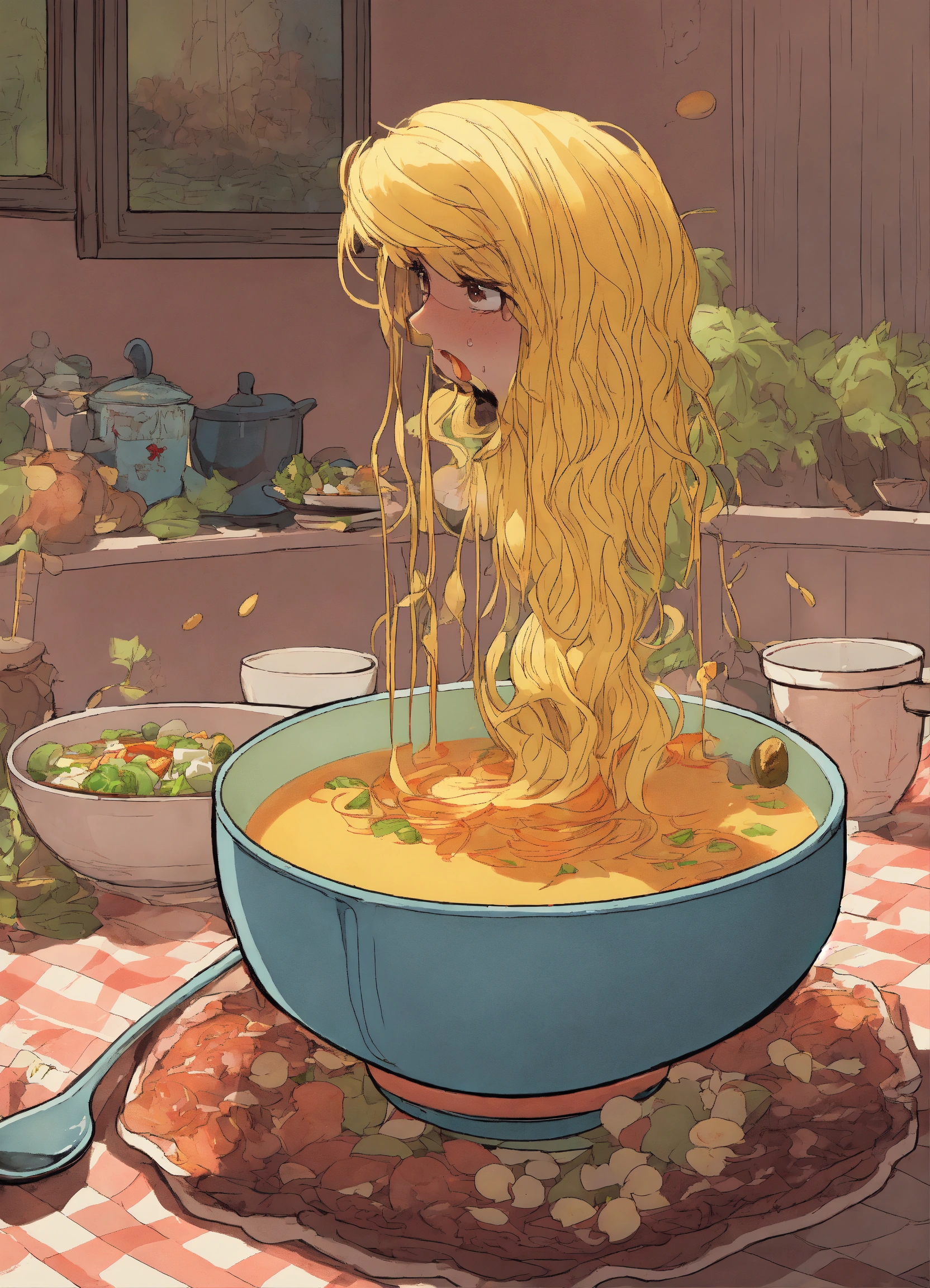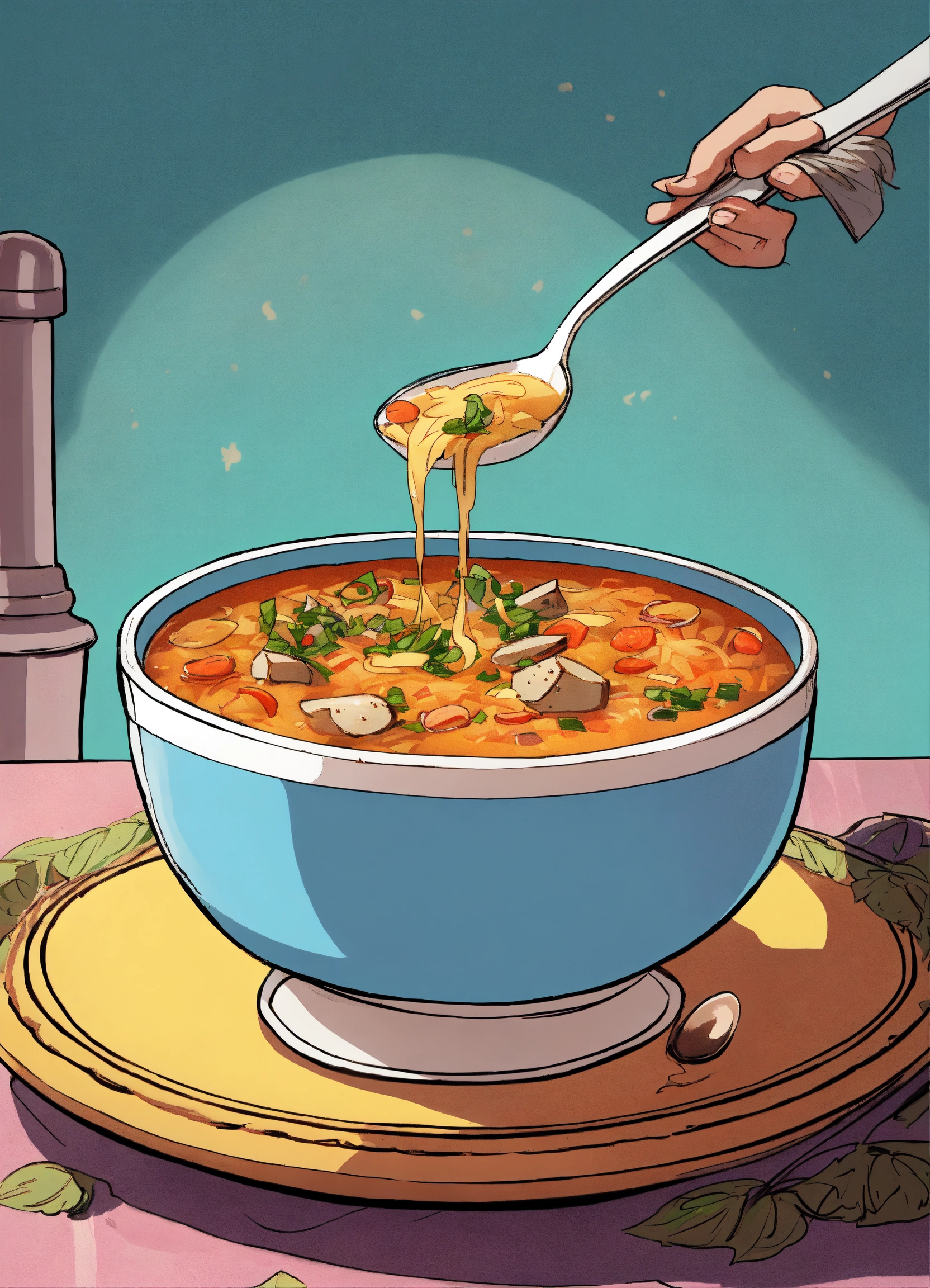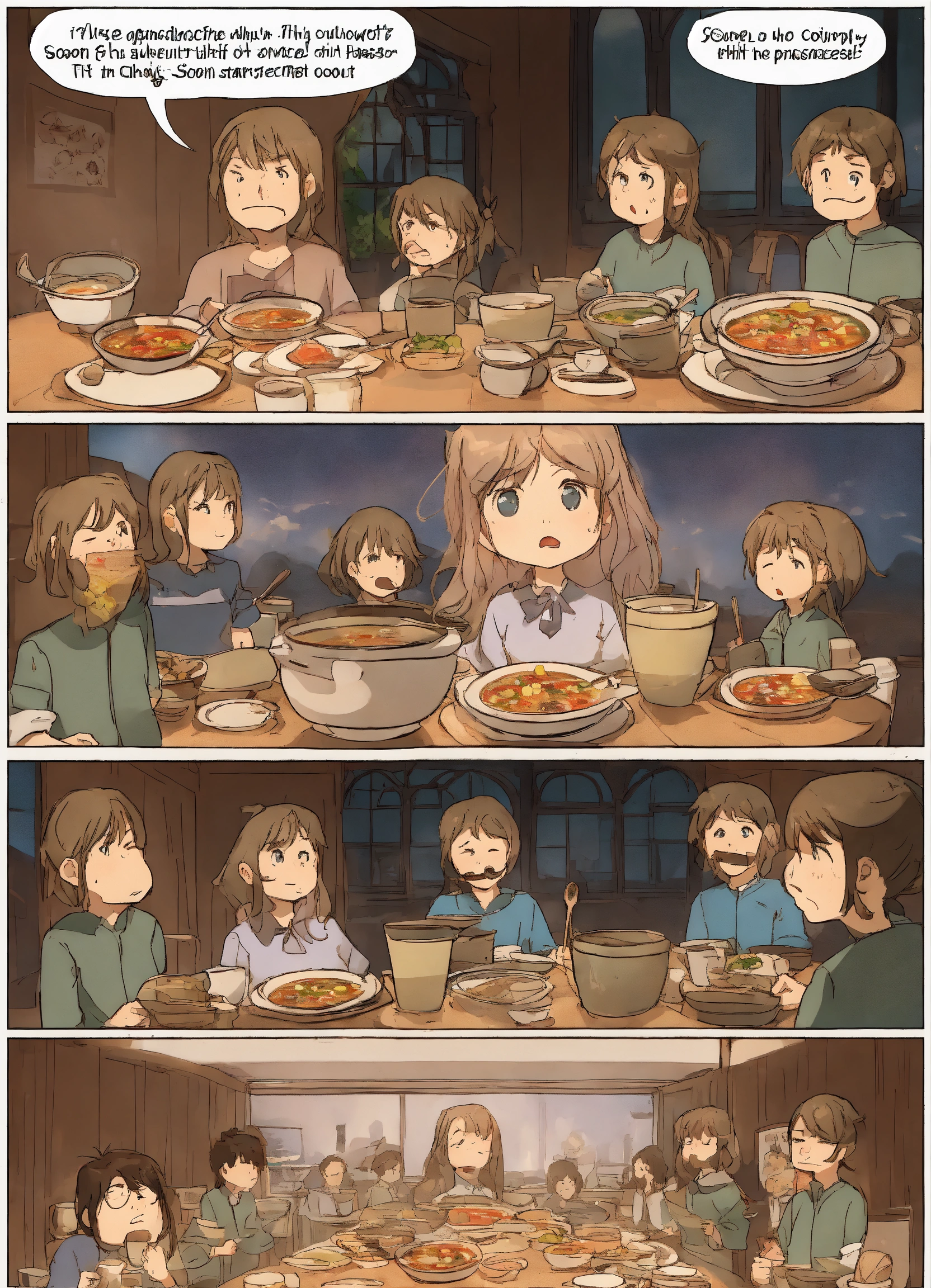 As one of the guests' spoon approaches the soup, it suddenly stops, suspended in the air. the surprised and disgusted looks of the guests focus on the bowl of soup, where a long hair has unintentionally found itself. the hair floats just above the soup, creating an atmosphere of embarrassment and surprise., comics