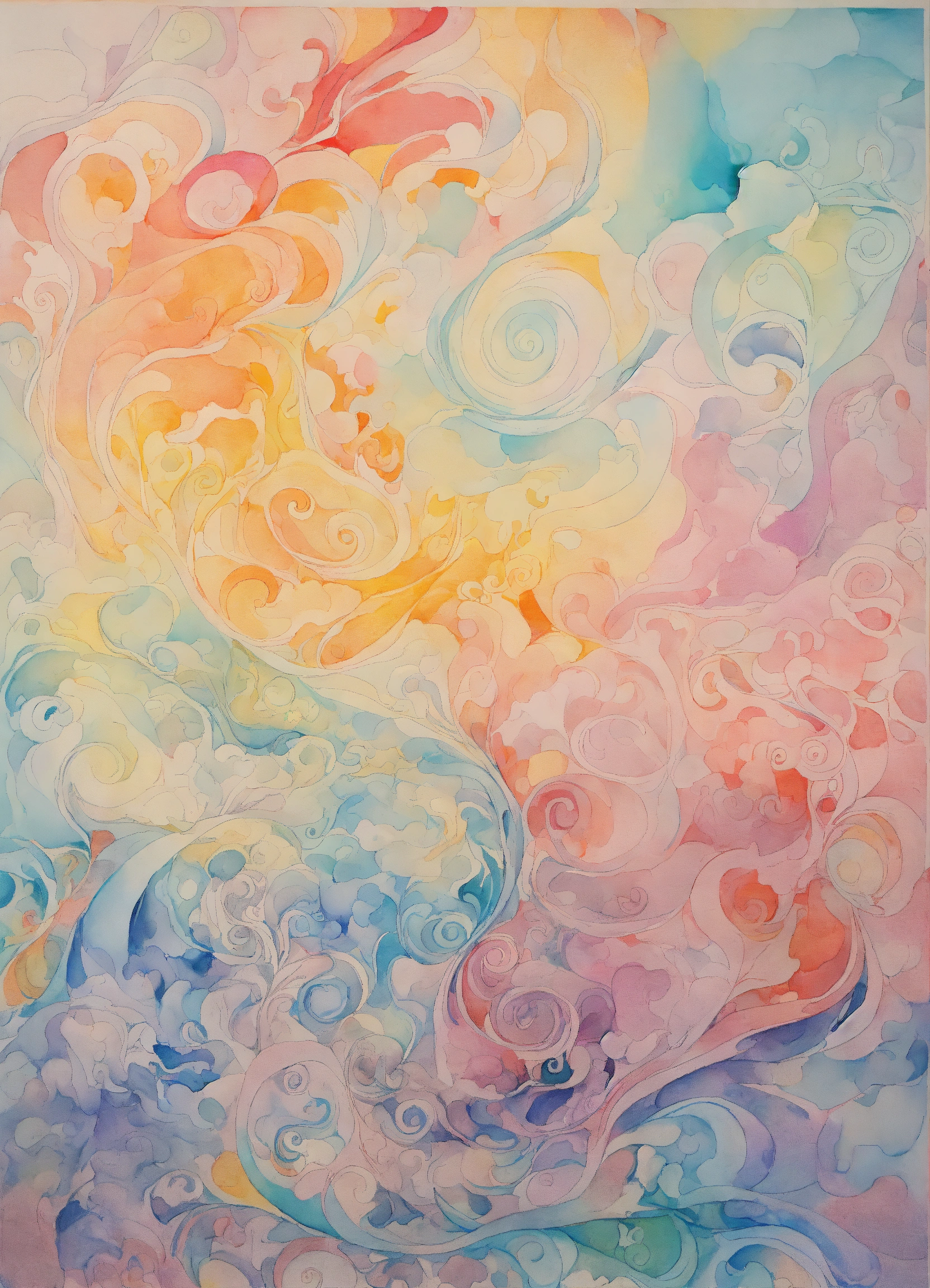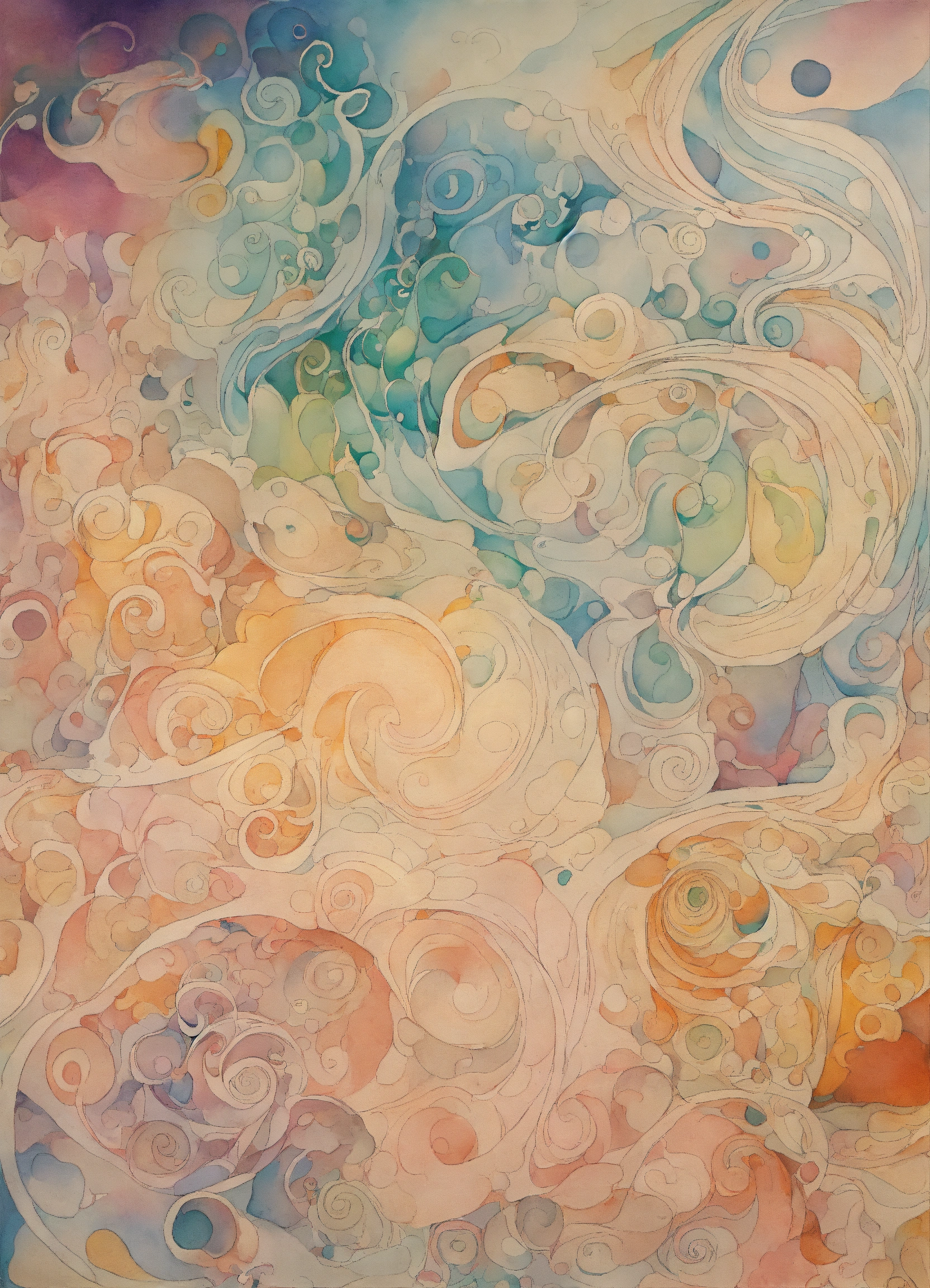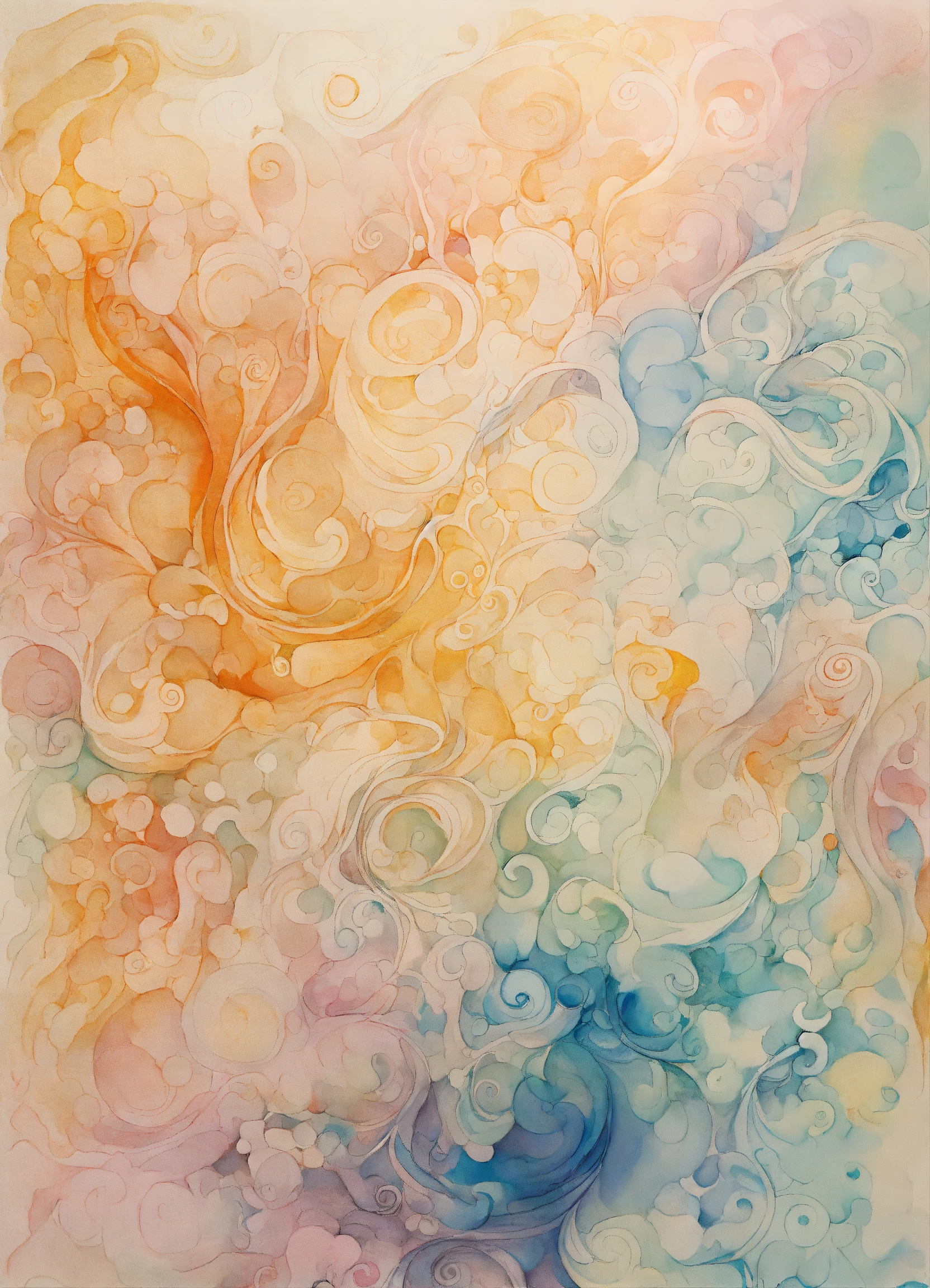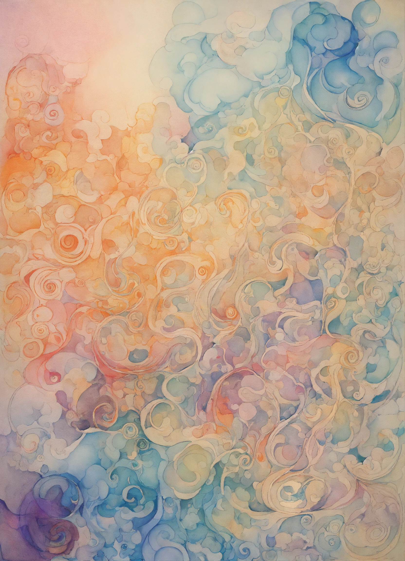 Ink drawing of background of pale swirls of pastal colours, all merging together with overlay of multiple translucent, clear, see through, transparent, mystical and spiritual creatures