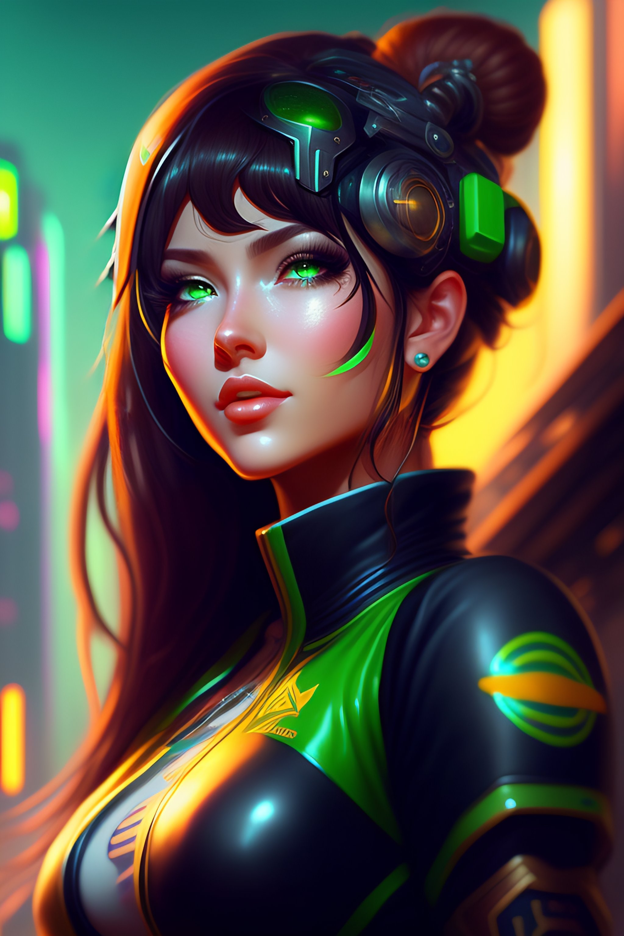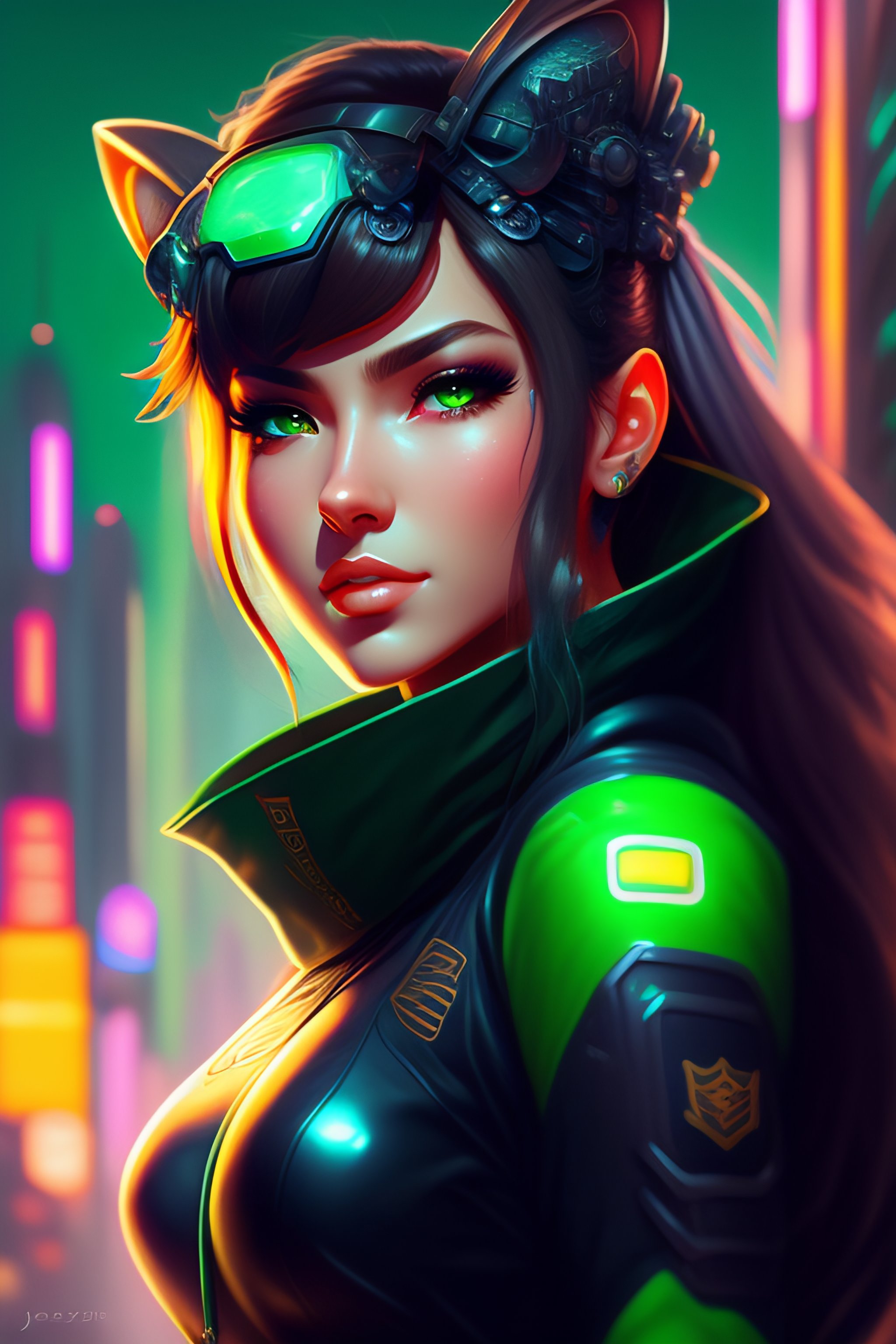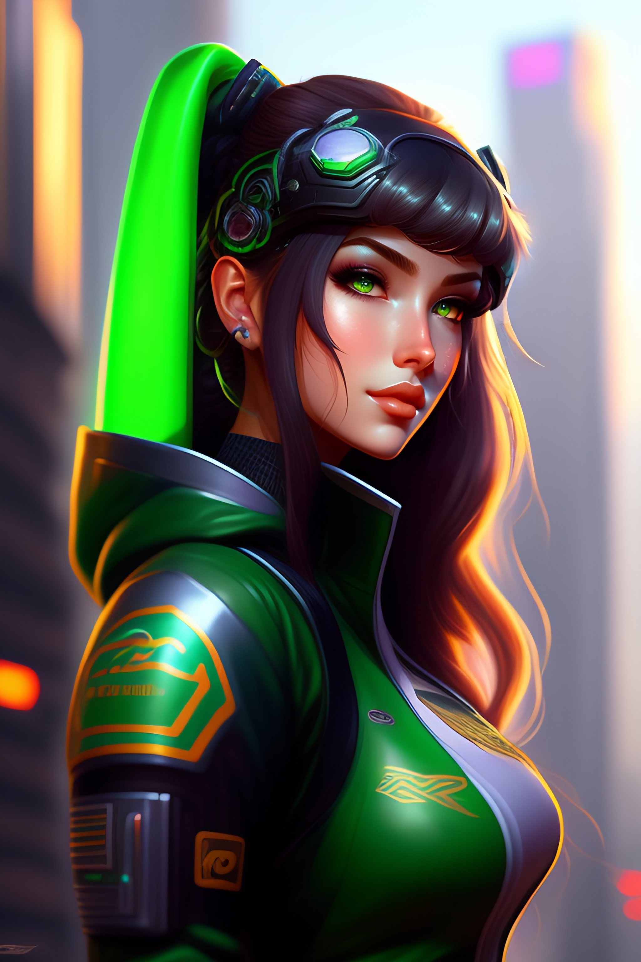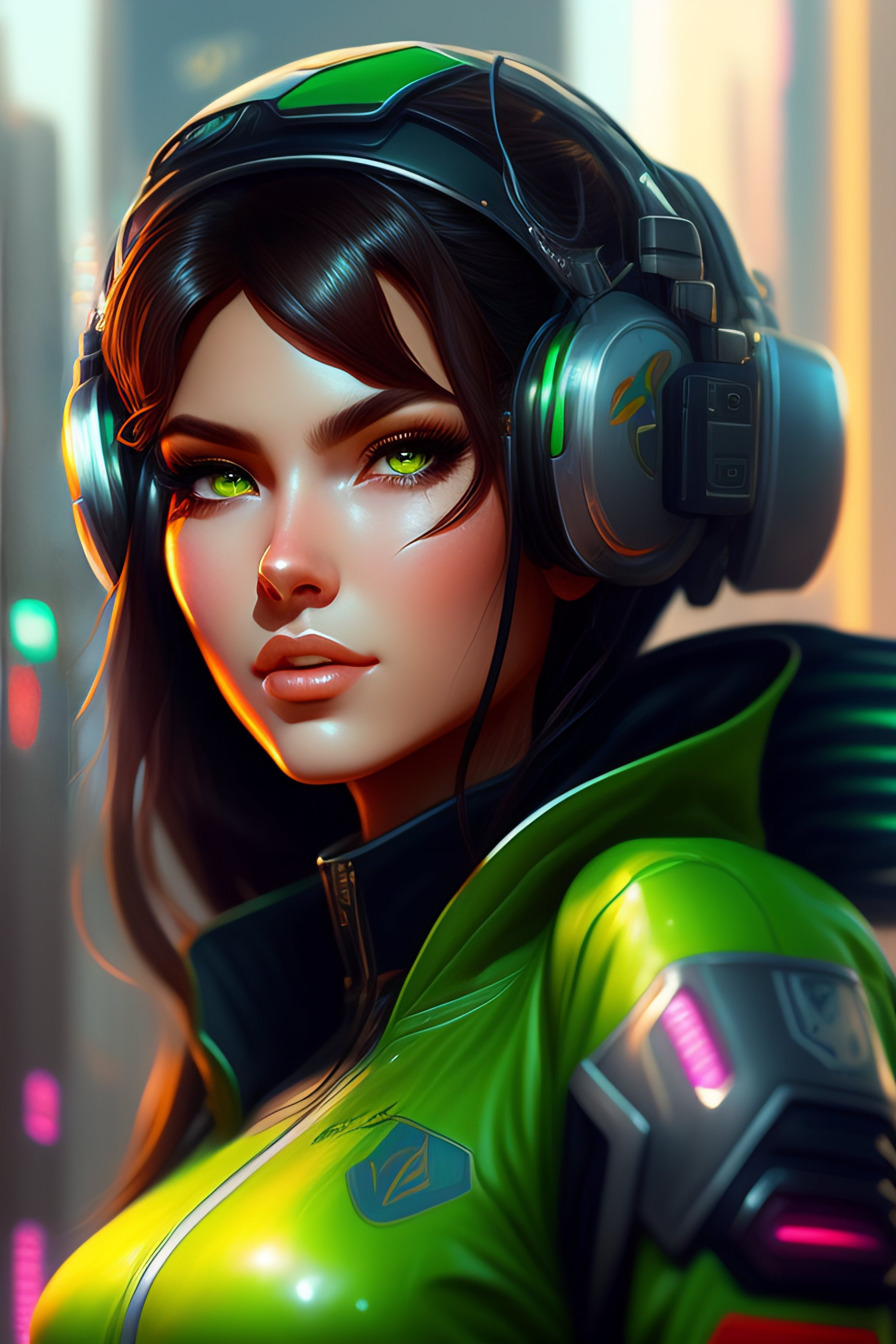 A detailed painting of a cute cyberpunk girl with green eyes, d.va, akali, dark city background, by justin gerard and (besinski), digital art, realistic painting, trending on artstation