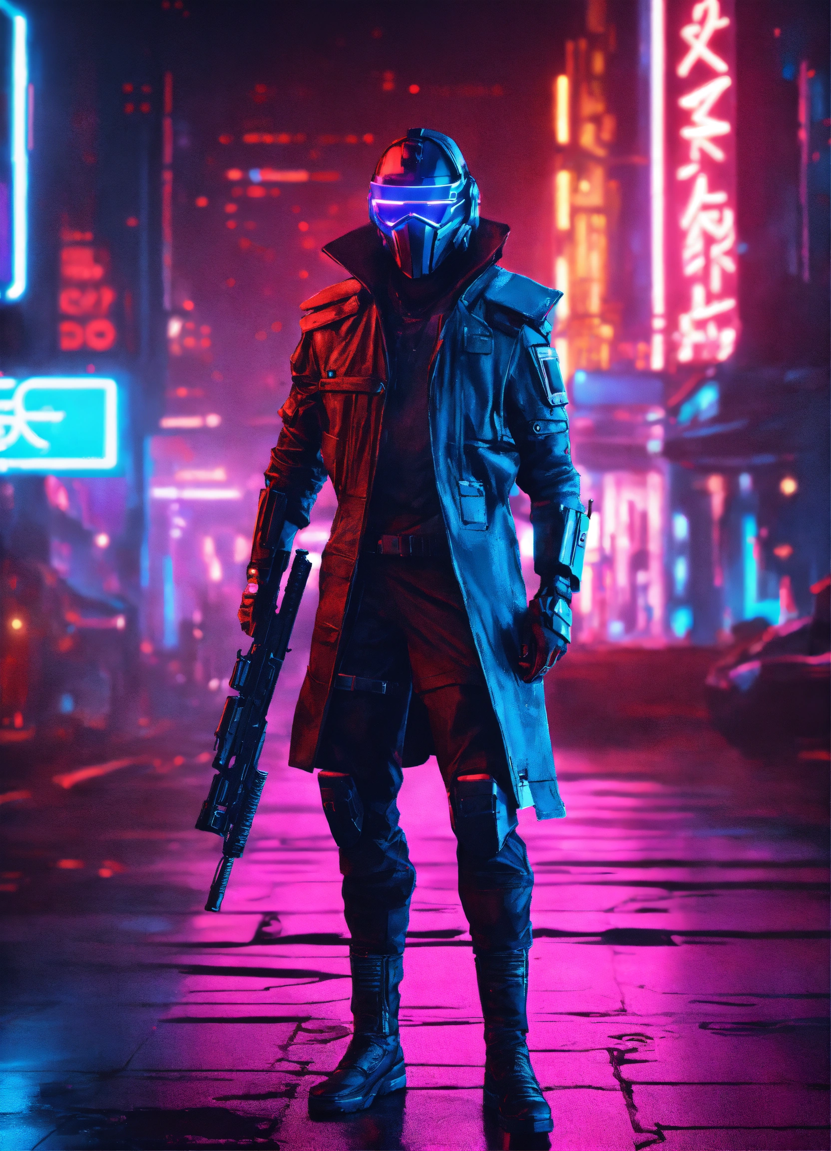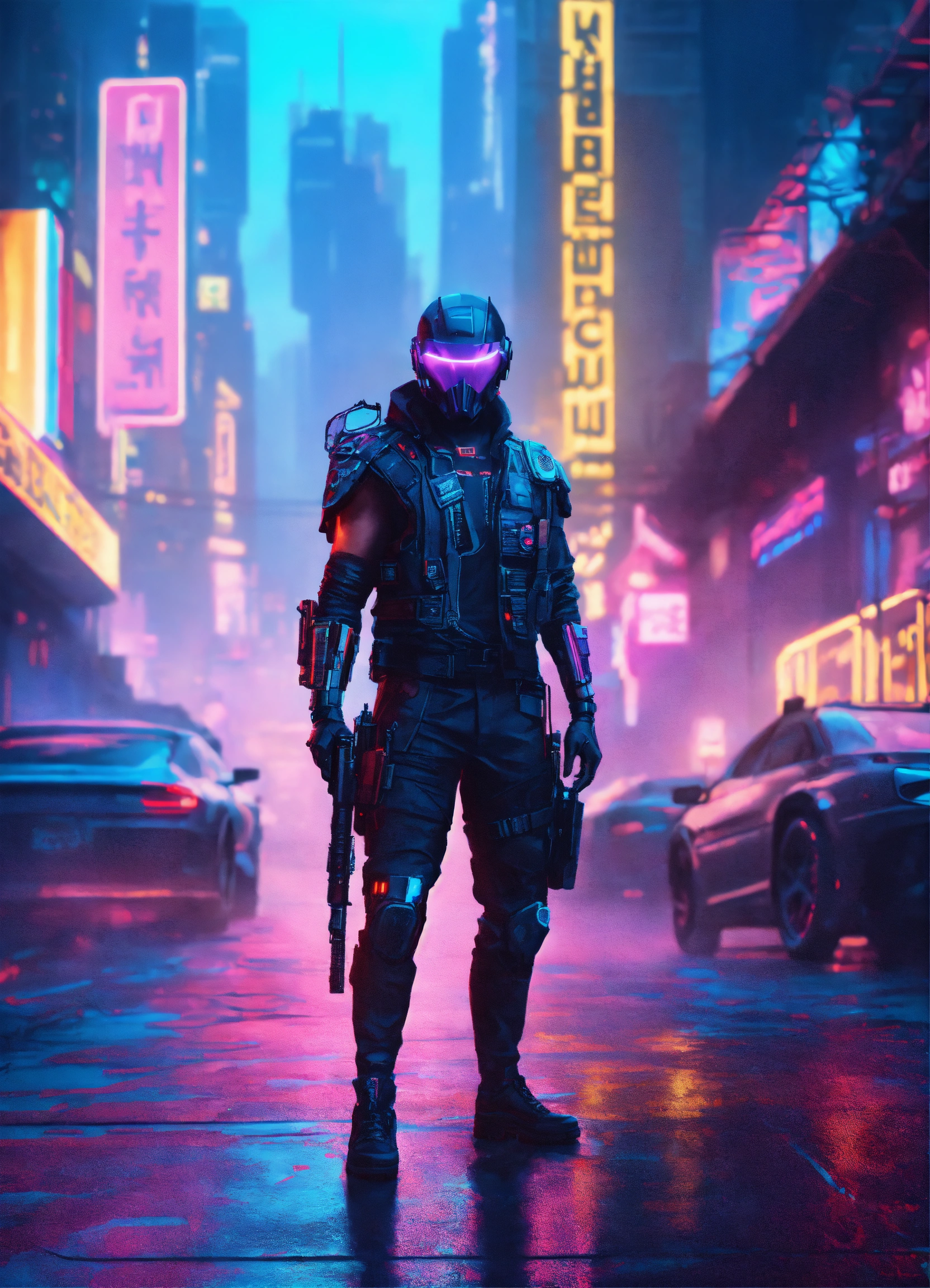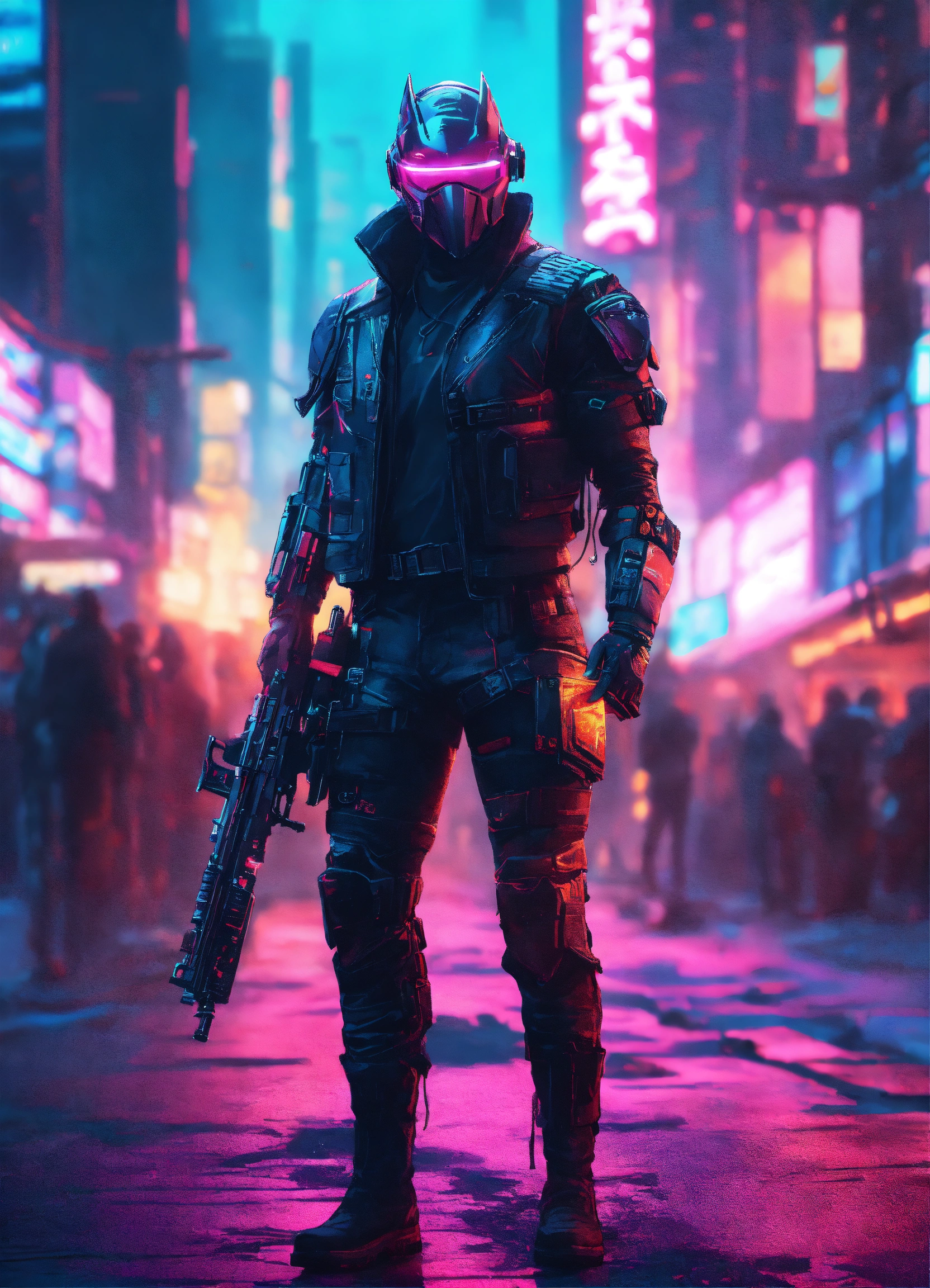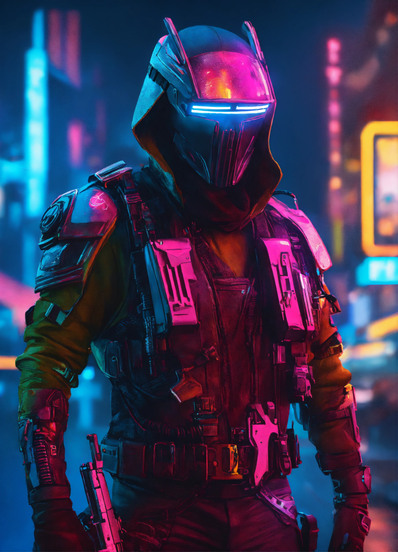 Futuristic cyberpunk masked bounty hunter, neon lights, cyberpunk city background, hyper realistic, without gun, protecting