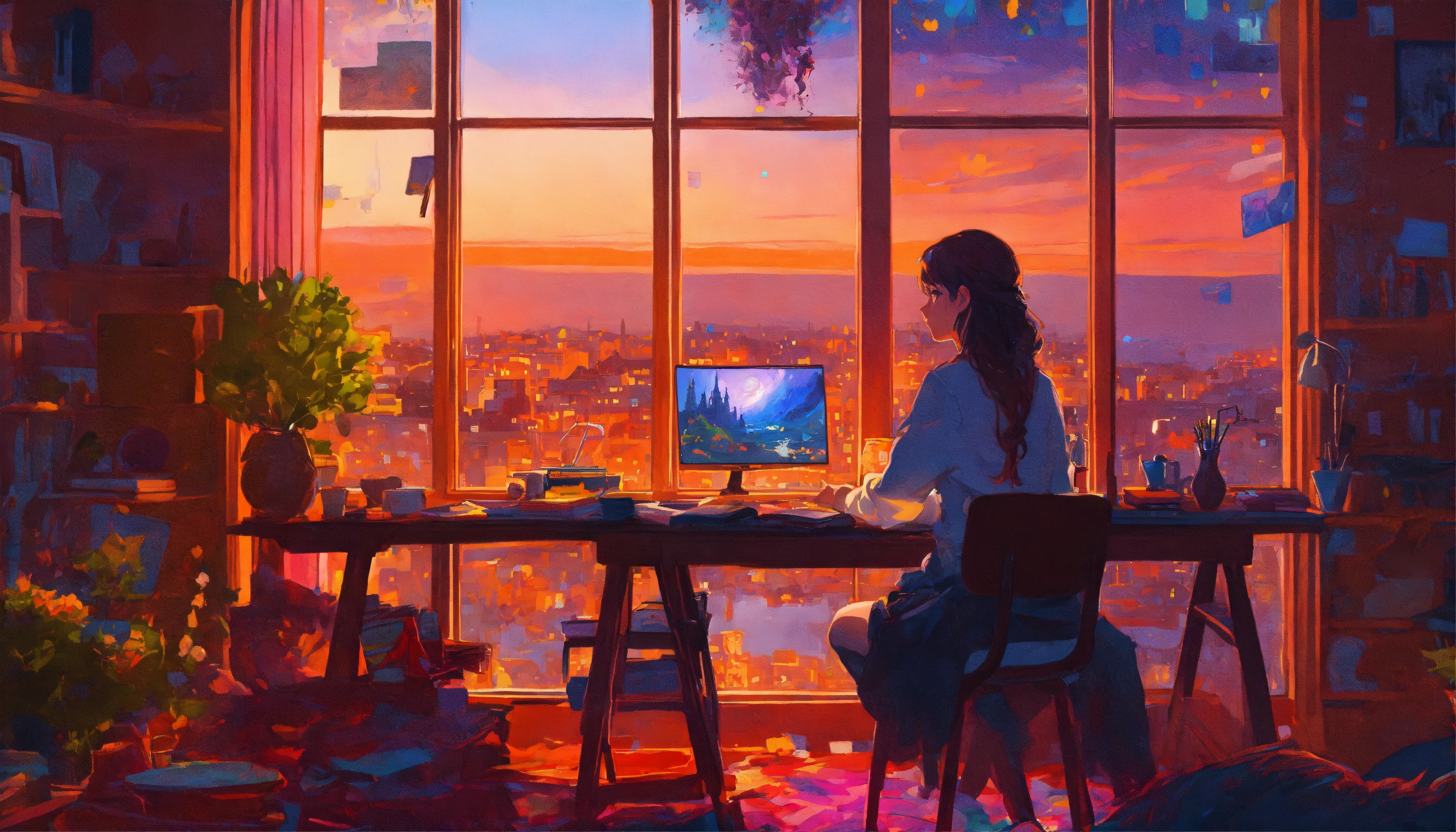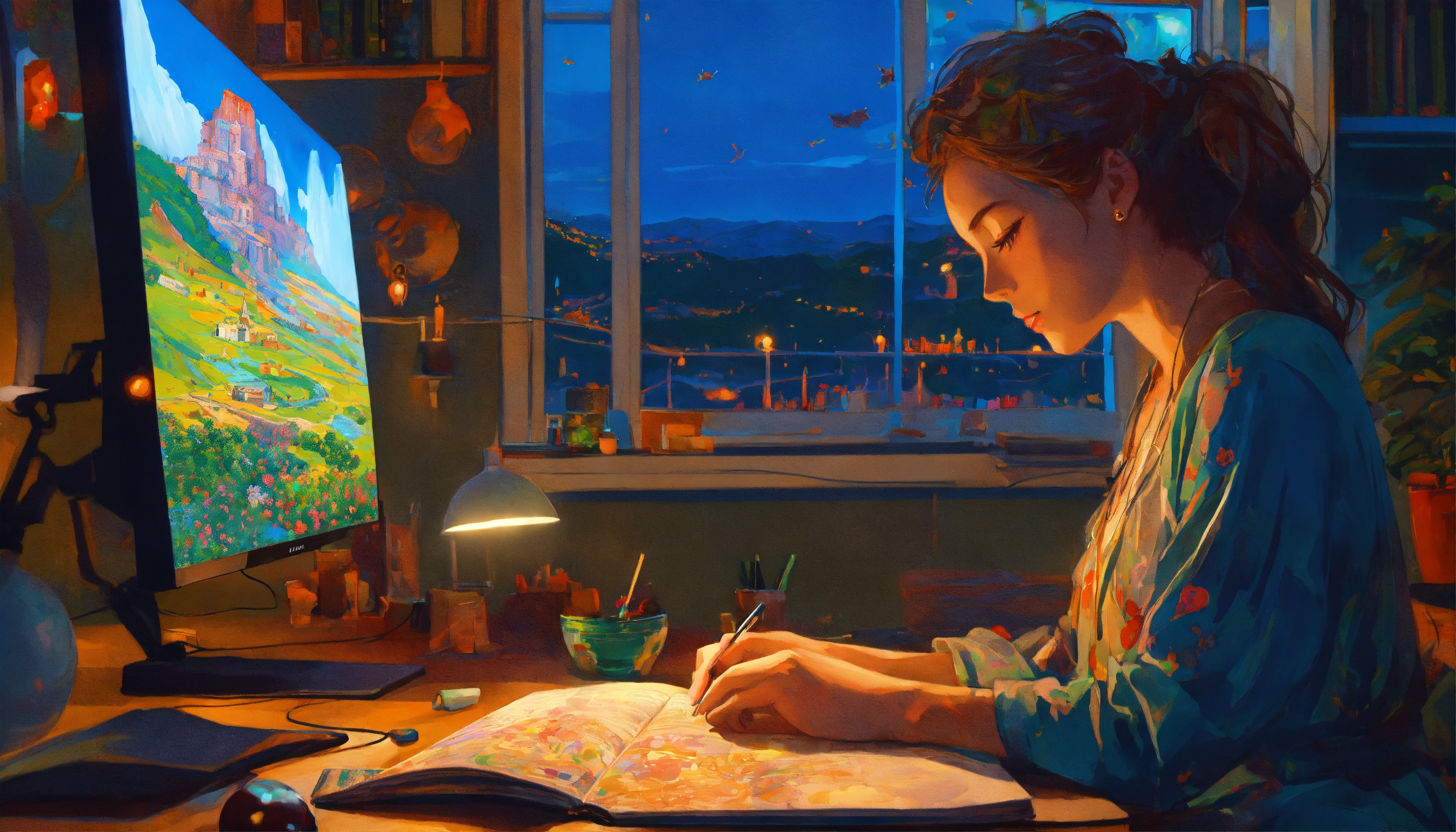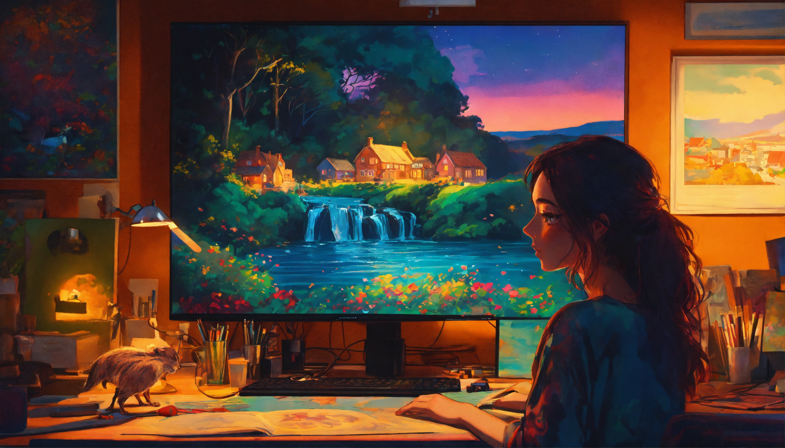 Young woman at her desk at midnight in front of her computer, candle lit, dreaming of a lush english english village landscape with a waterfall and wild animals, art by victor moscoso and bridget riley girl make it magical by carne griffiths fluid art, conrad roset ilya kuvshinov, mark fielding, tim burton, zwy studio high lights in eyes, salt, ultra detailed, cinematic