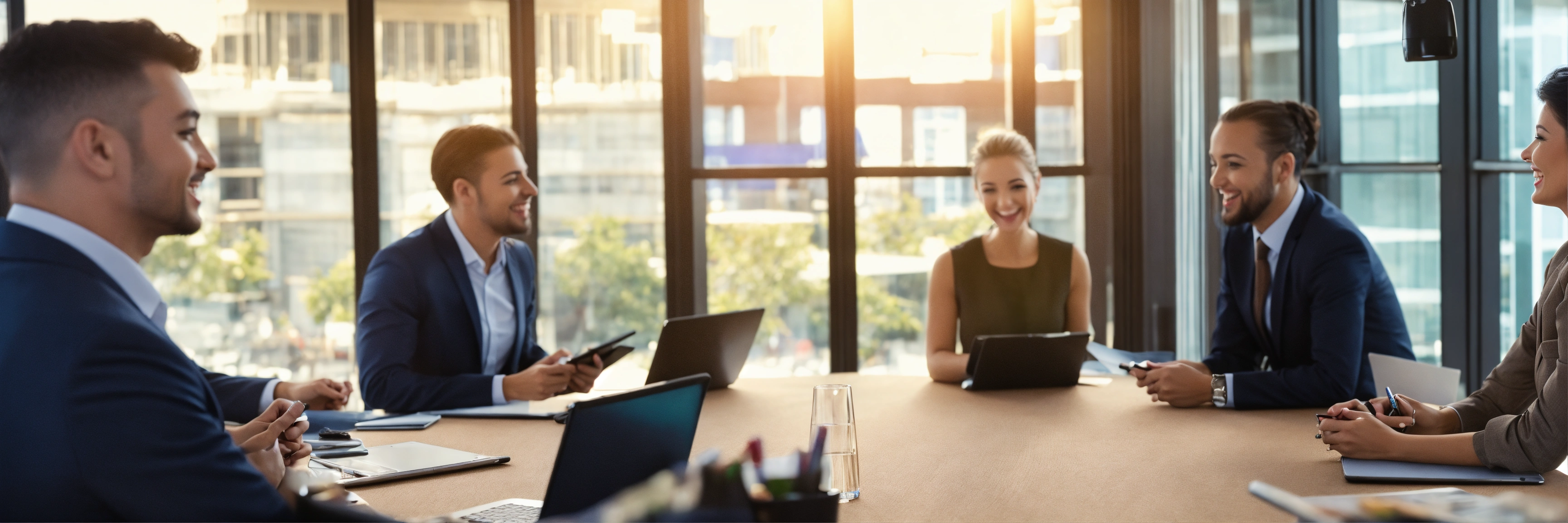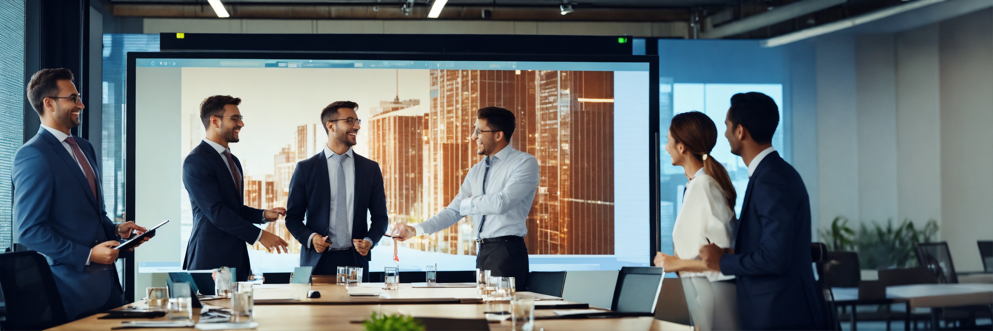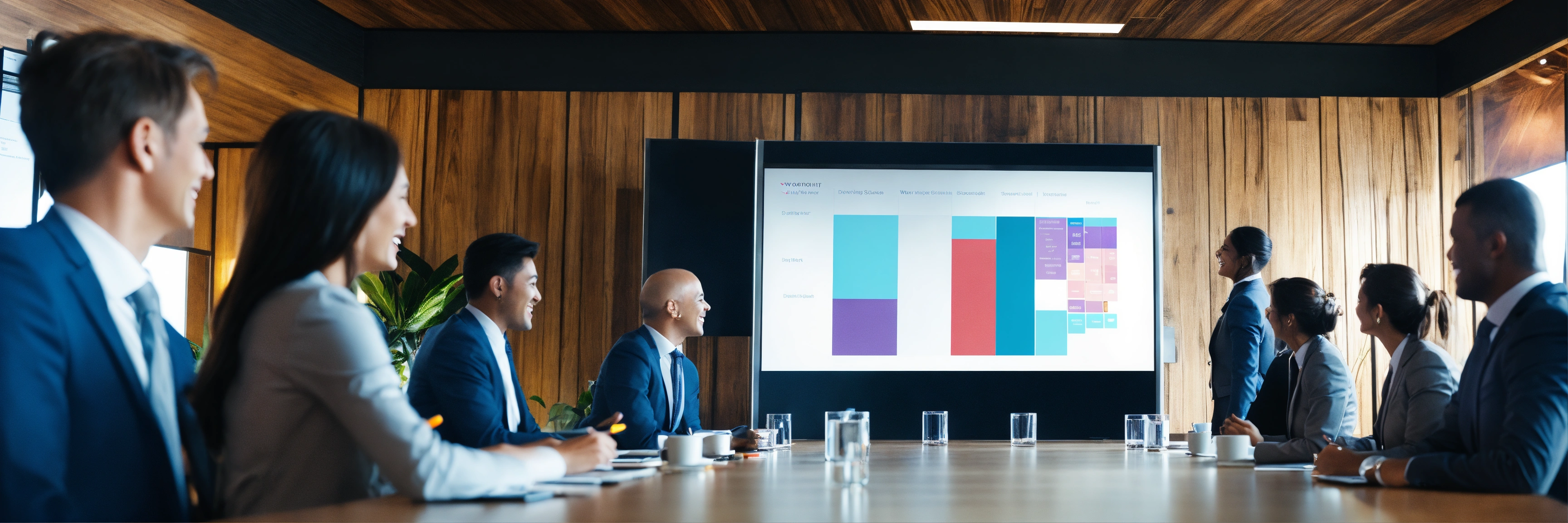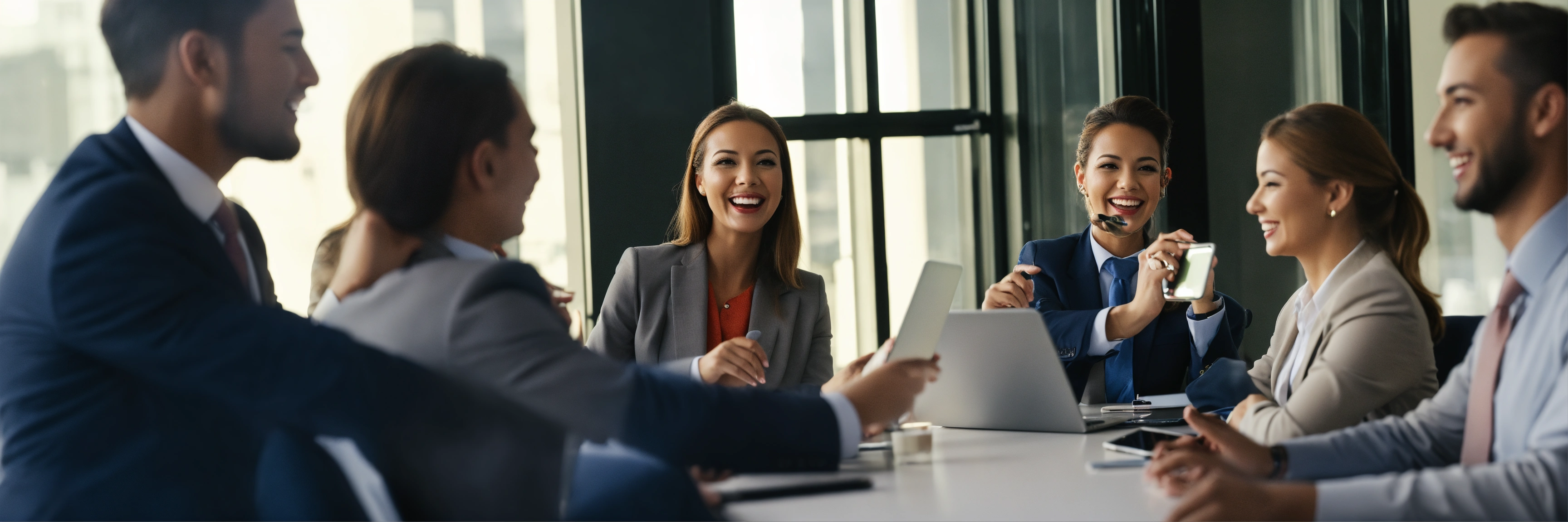 Woman leading meeting business people joyful digital screen