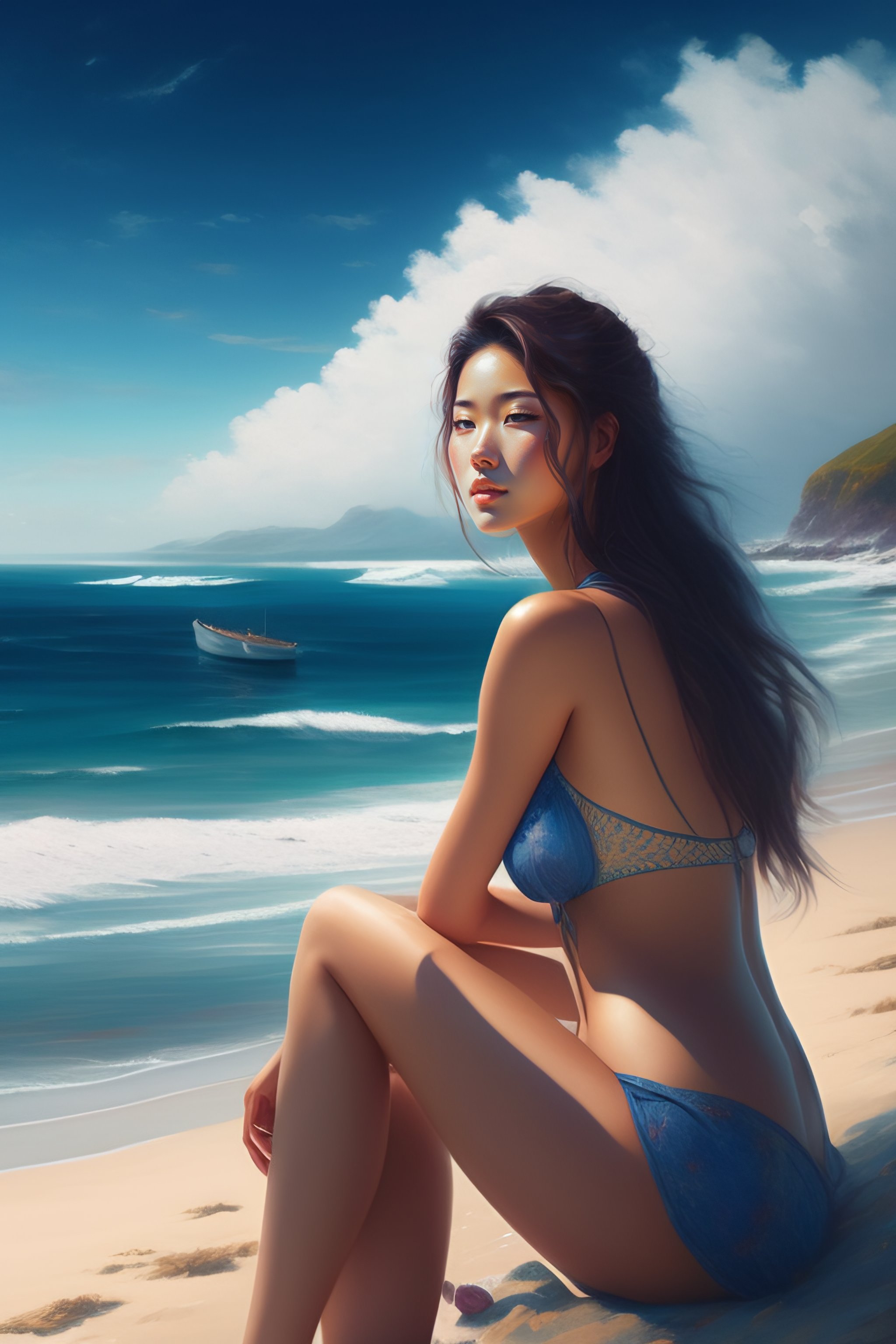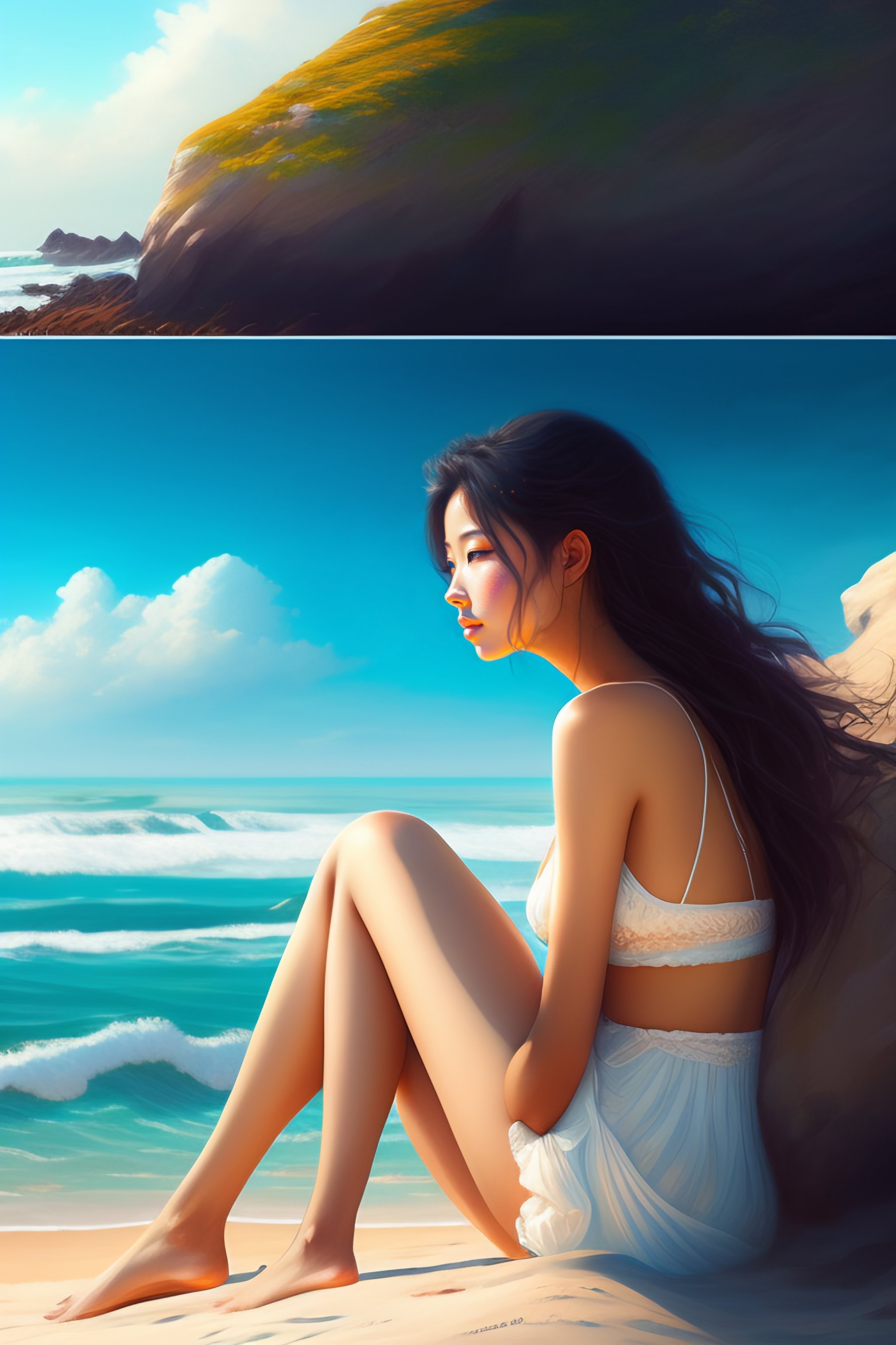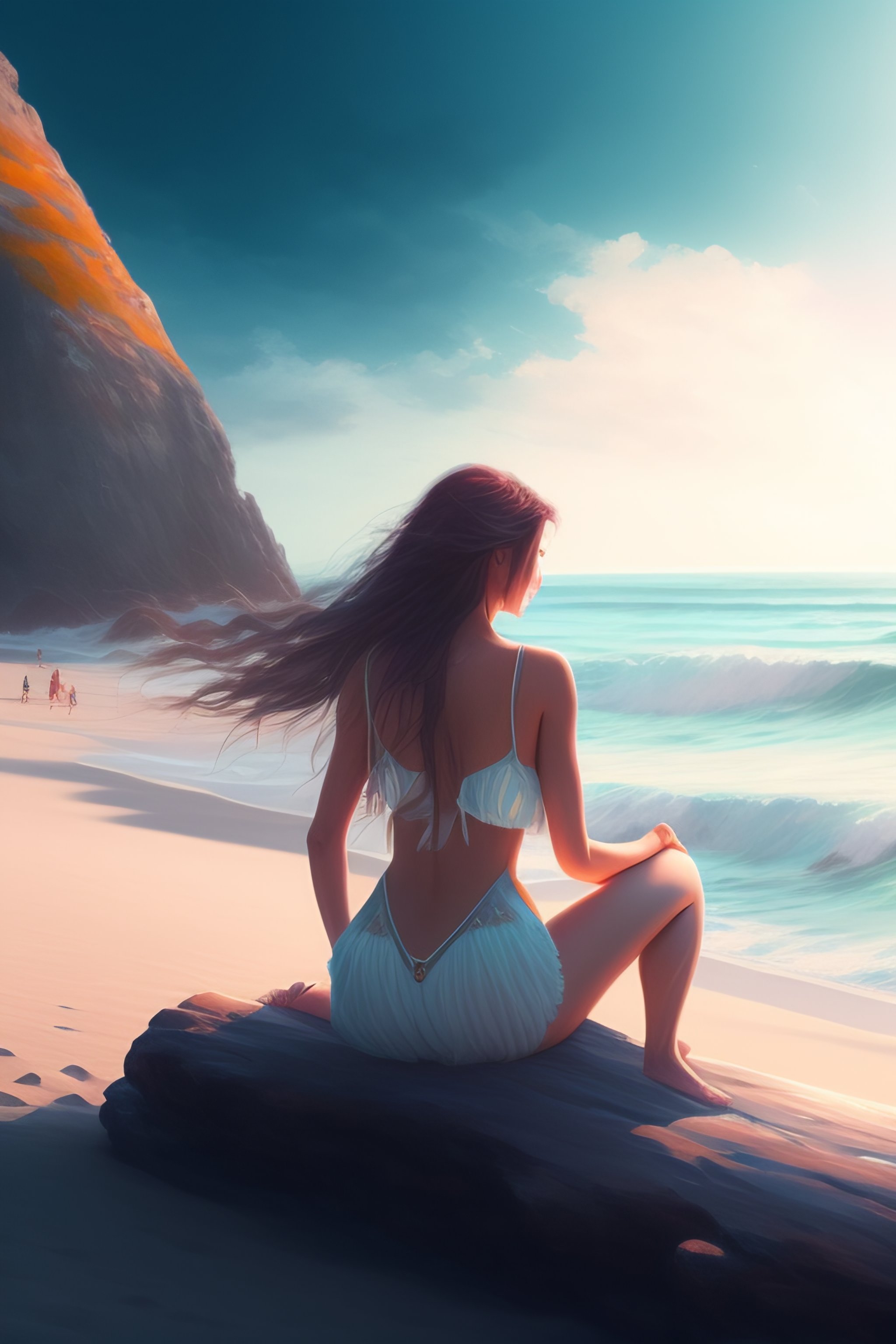 A woman sitting on top of a beach next to the ocean, a detailed painting by wlop, featured on pixiv, analytical art, detailed painting, 2d game art, official art
