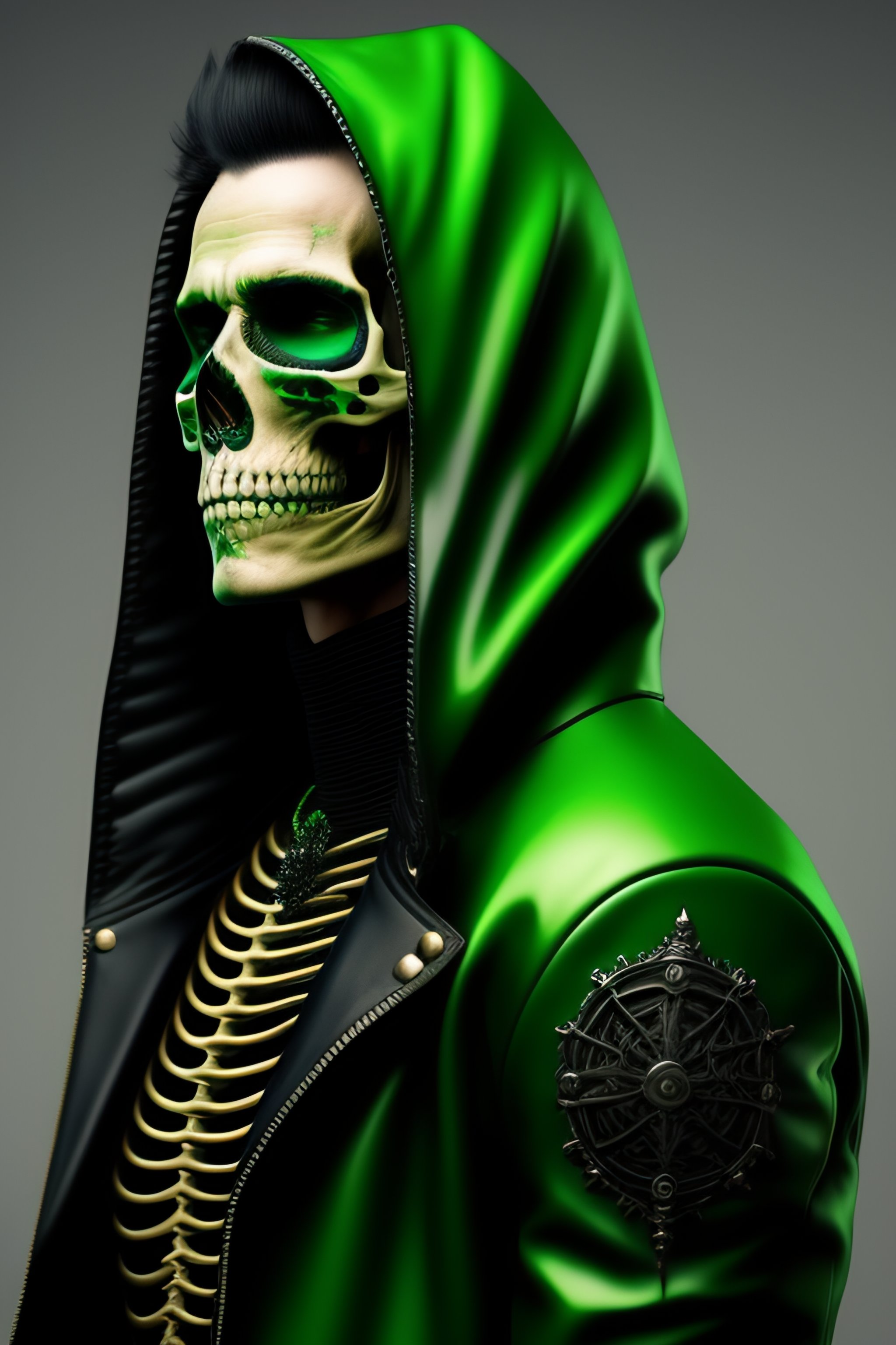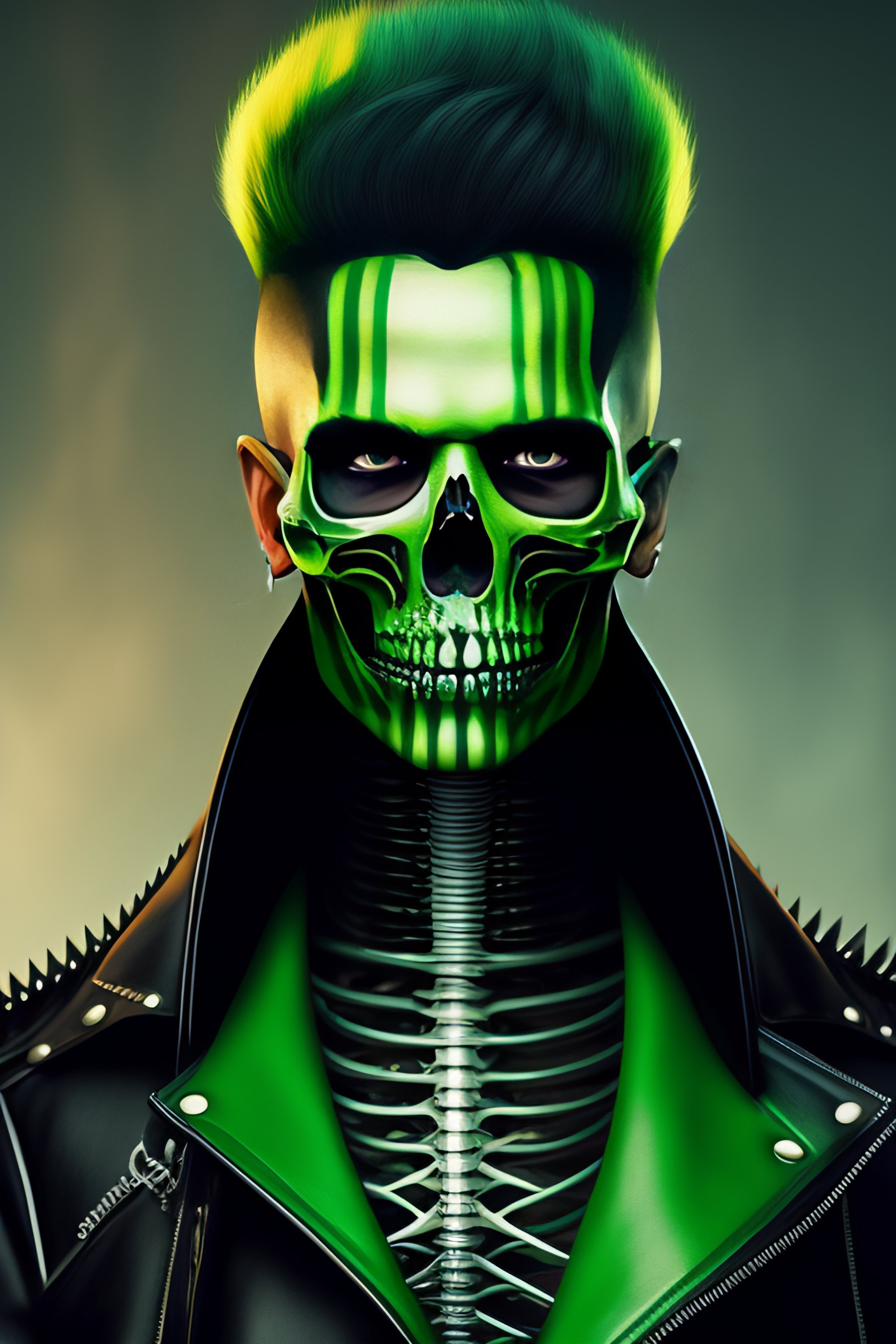 Hyper detailed fine art portrait of skeleton punk with green color haer, he wears a long black leather raincoat and anarchy symbol on his chest