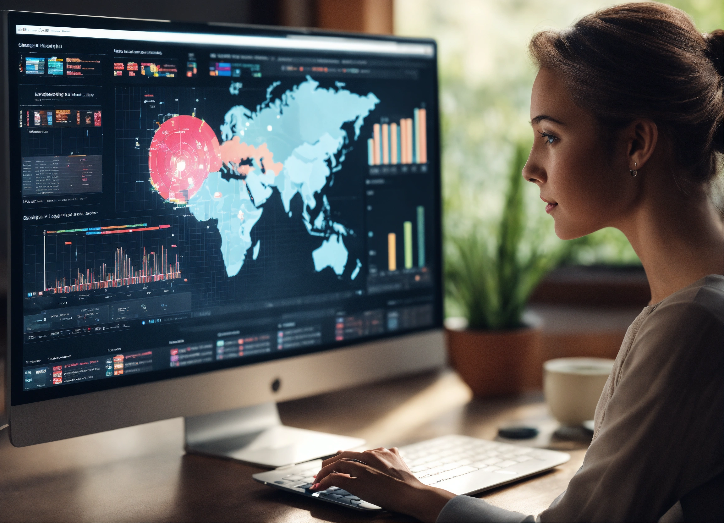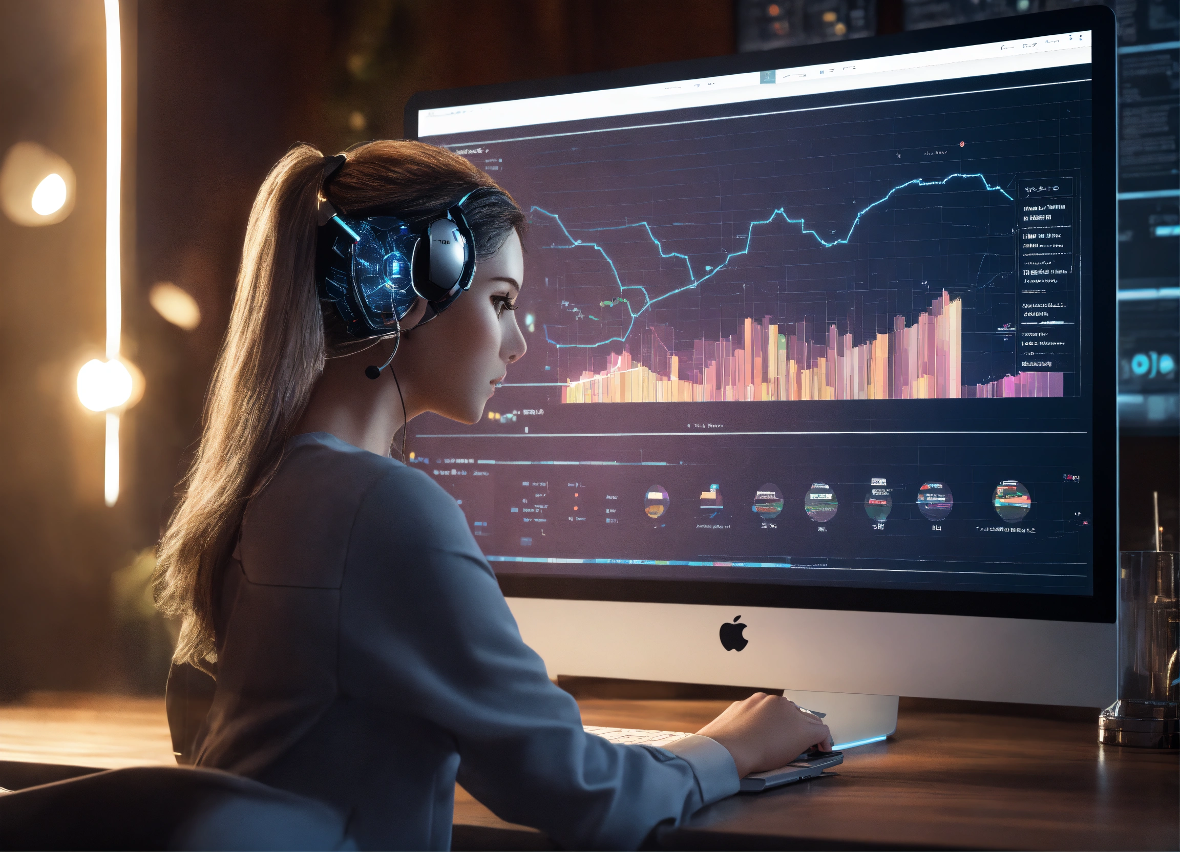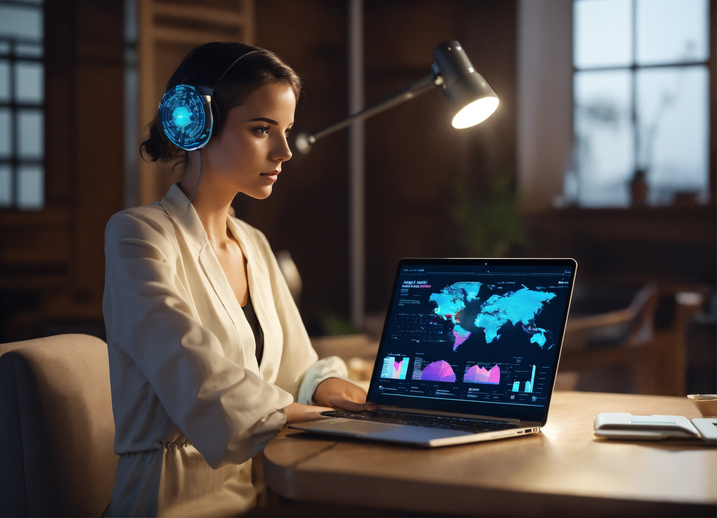 The image shows artificial intelligence integrated into a woman sitting at a table with a laptop. the laptop screen displays a chart showing the age distribution of the target audience. digital style, 3d