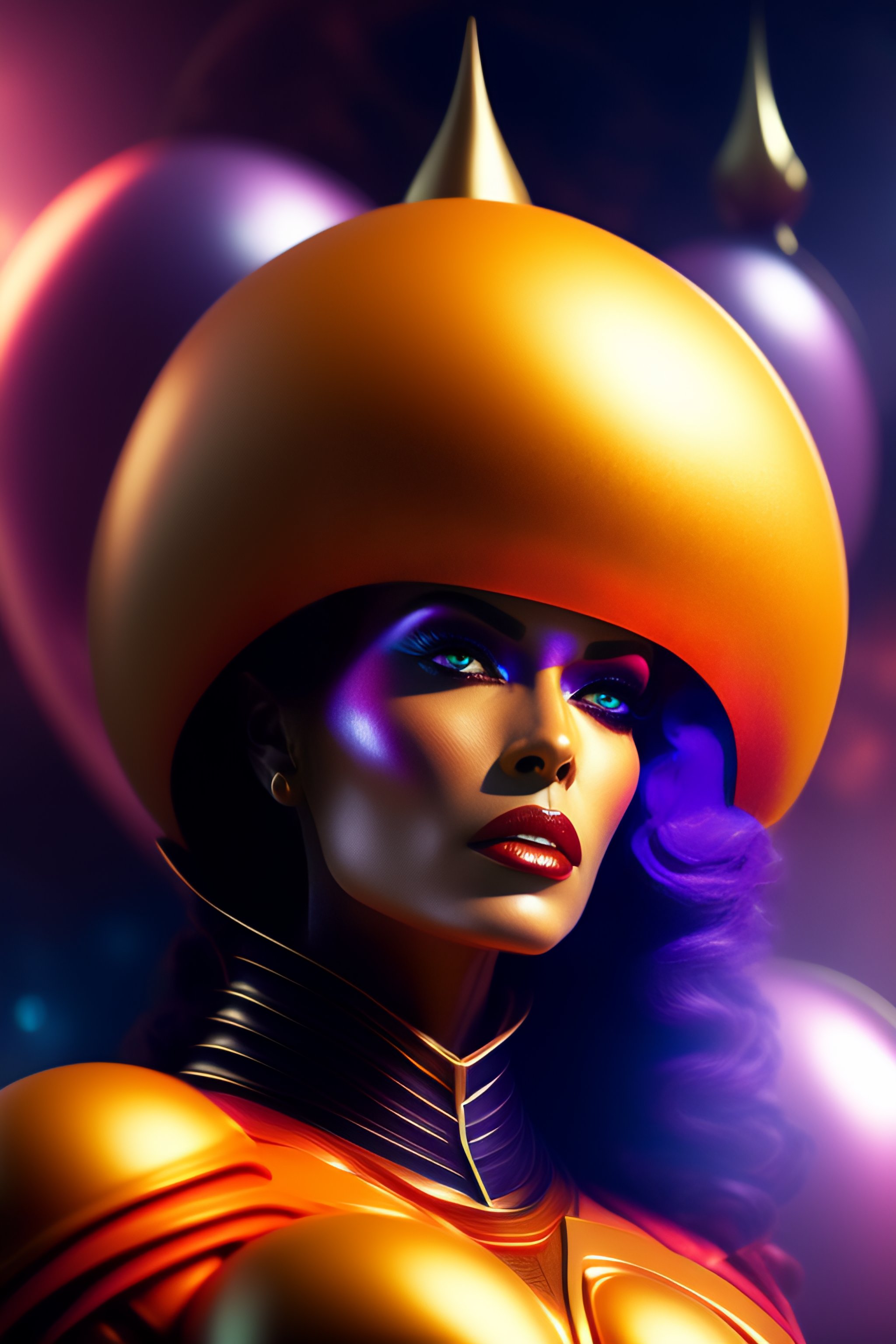 Close-up of a strange female alien supervillain with galaxy orbs as eyes, highly detailed matte painting