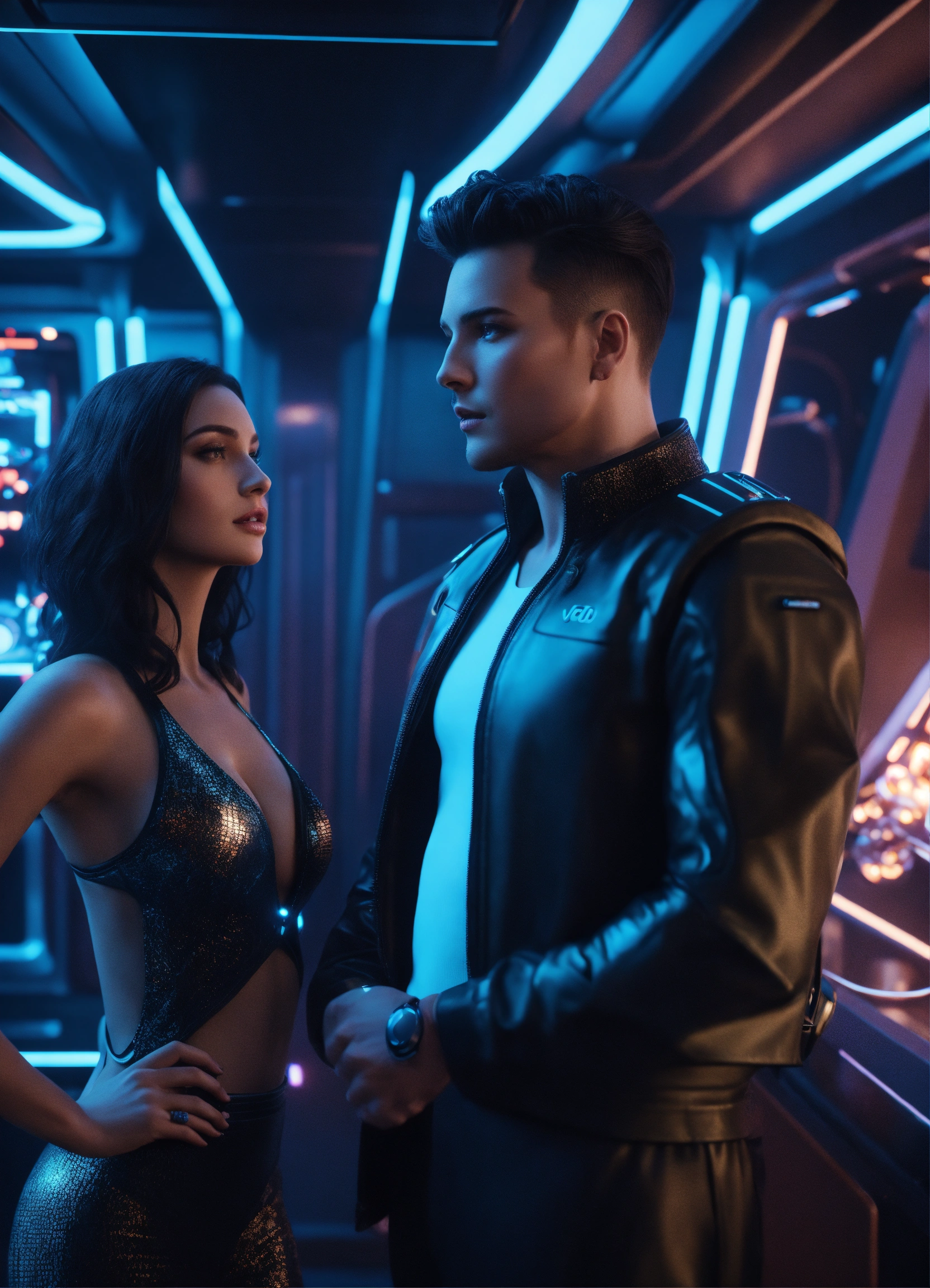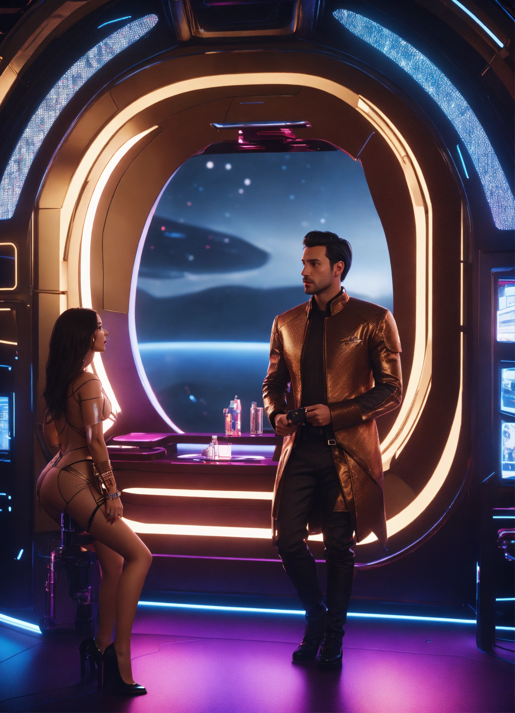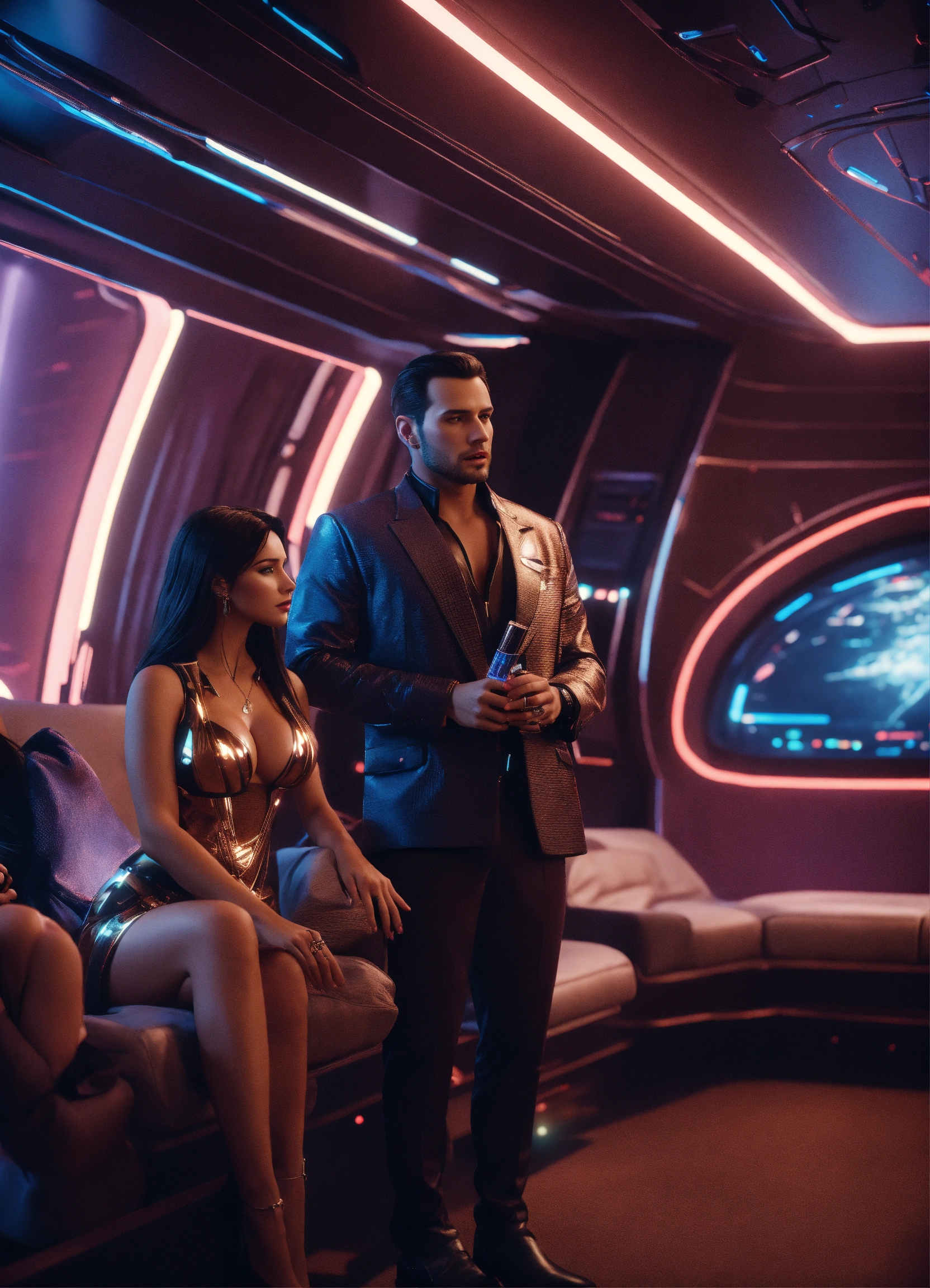 35 year old clean cut man with dark hair in futuristic clothing, talking to 2 beautiful cute girls with big bosoms in the dark lounge on a luxurious hi tech space space yacht, realistic, futuristic, sci-fi, 8k, unreal engine, pixar
