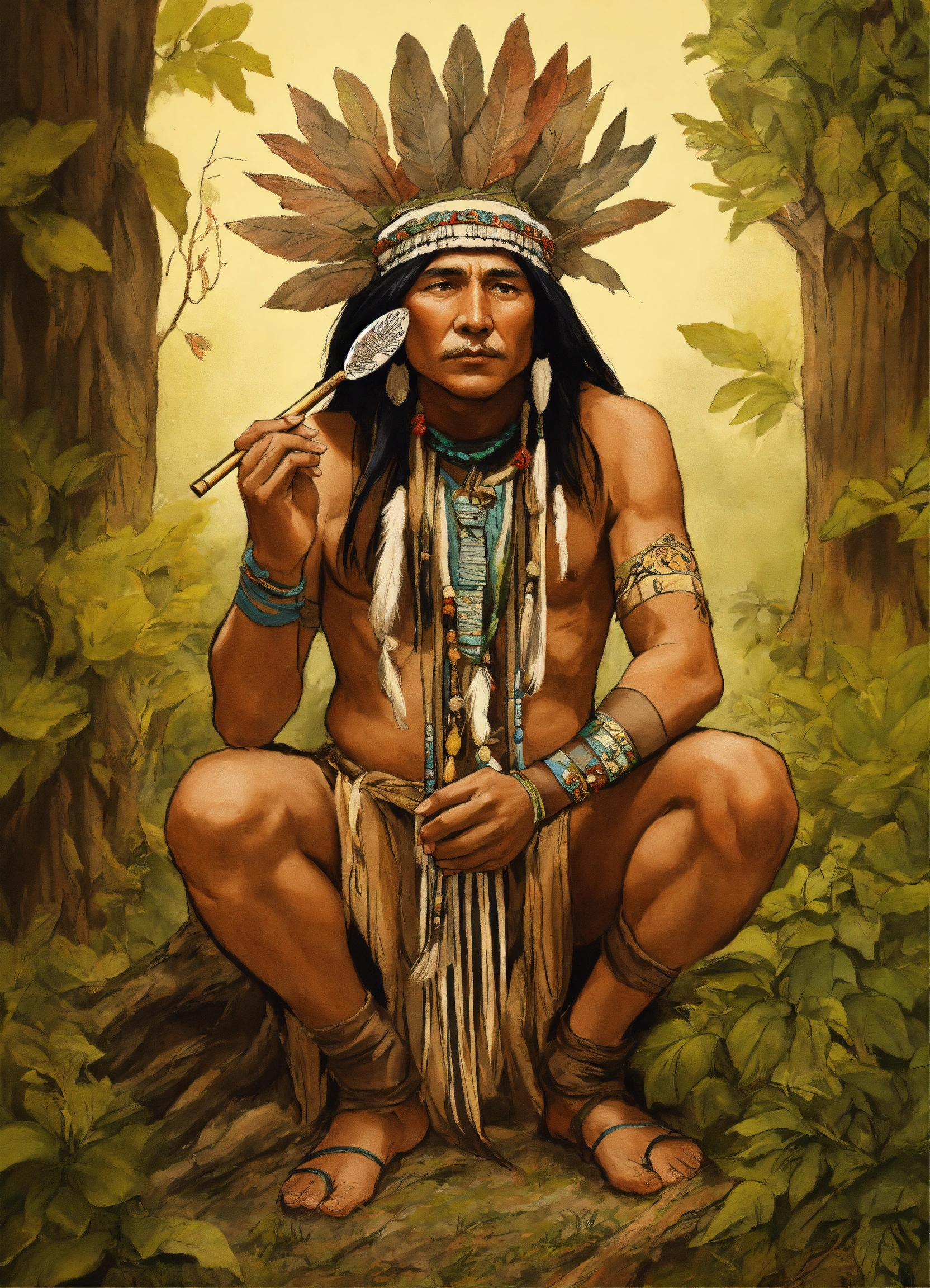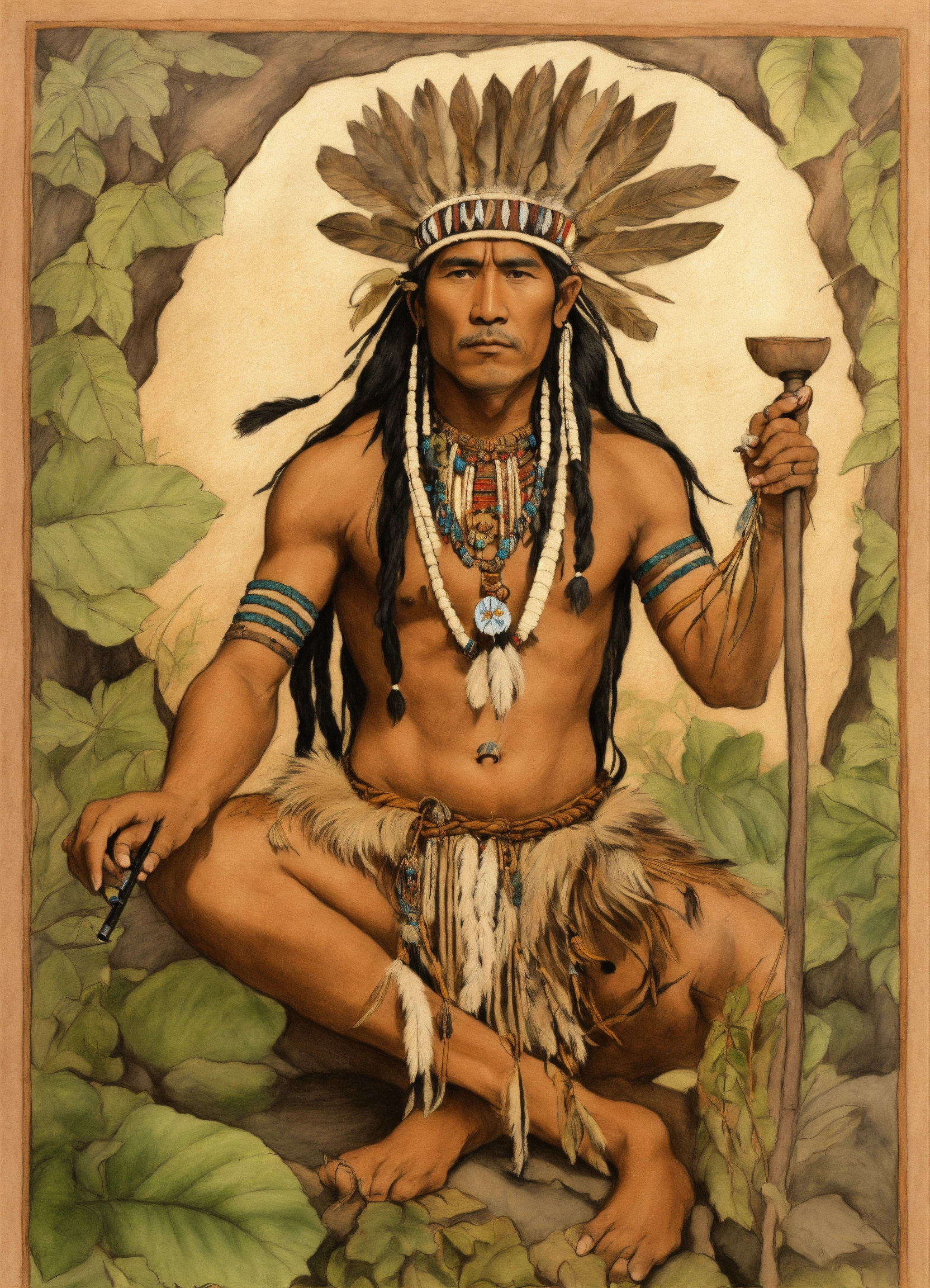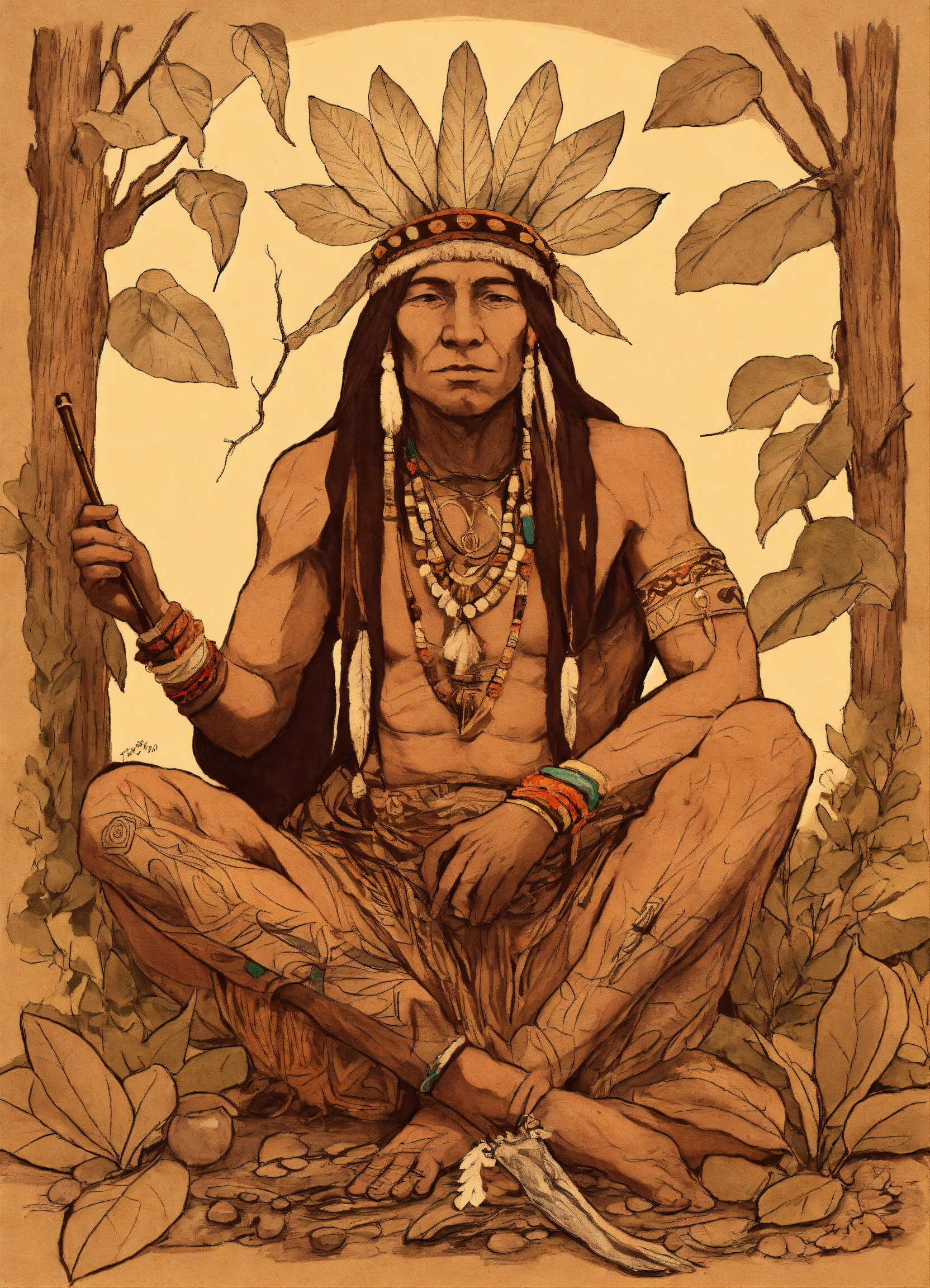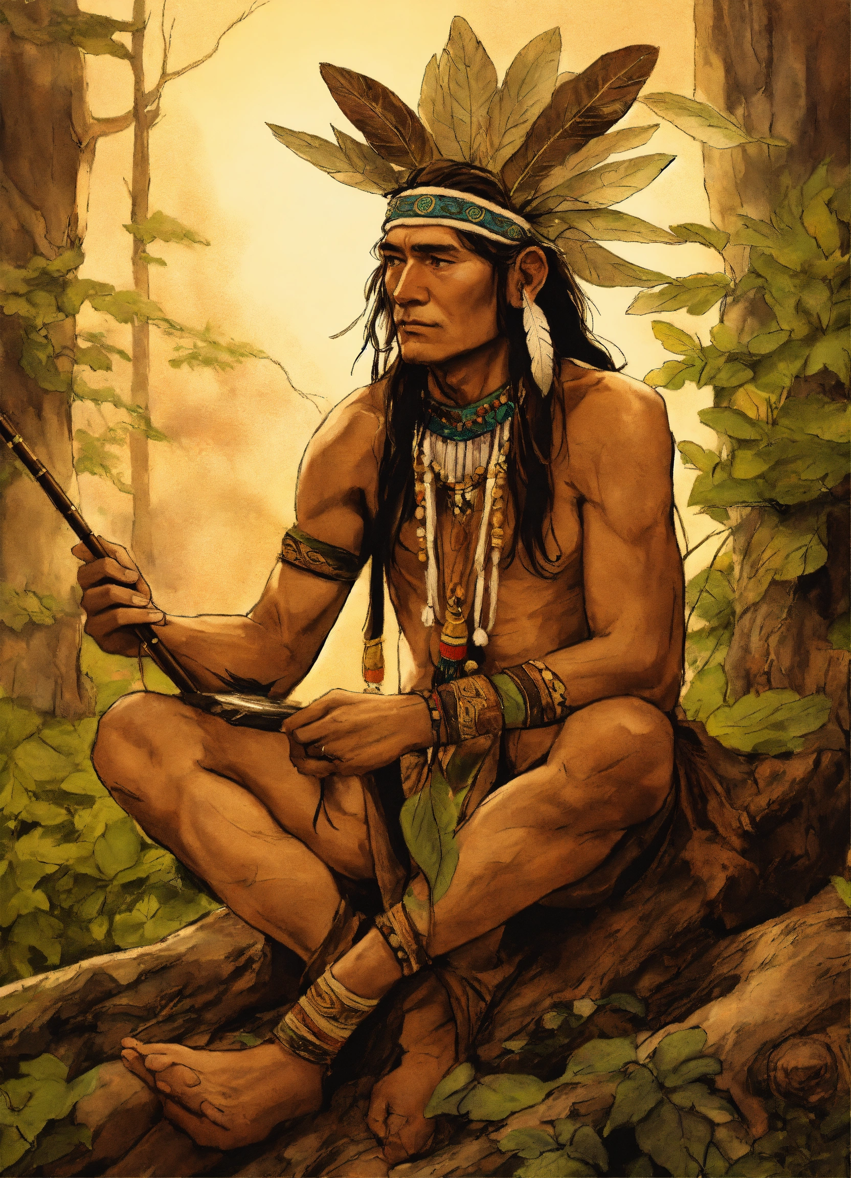 A male mandrake shaman, playing a flute, ancient forest, beautiful drawing, native american style drawing